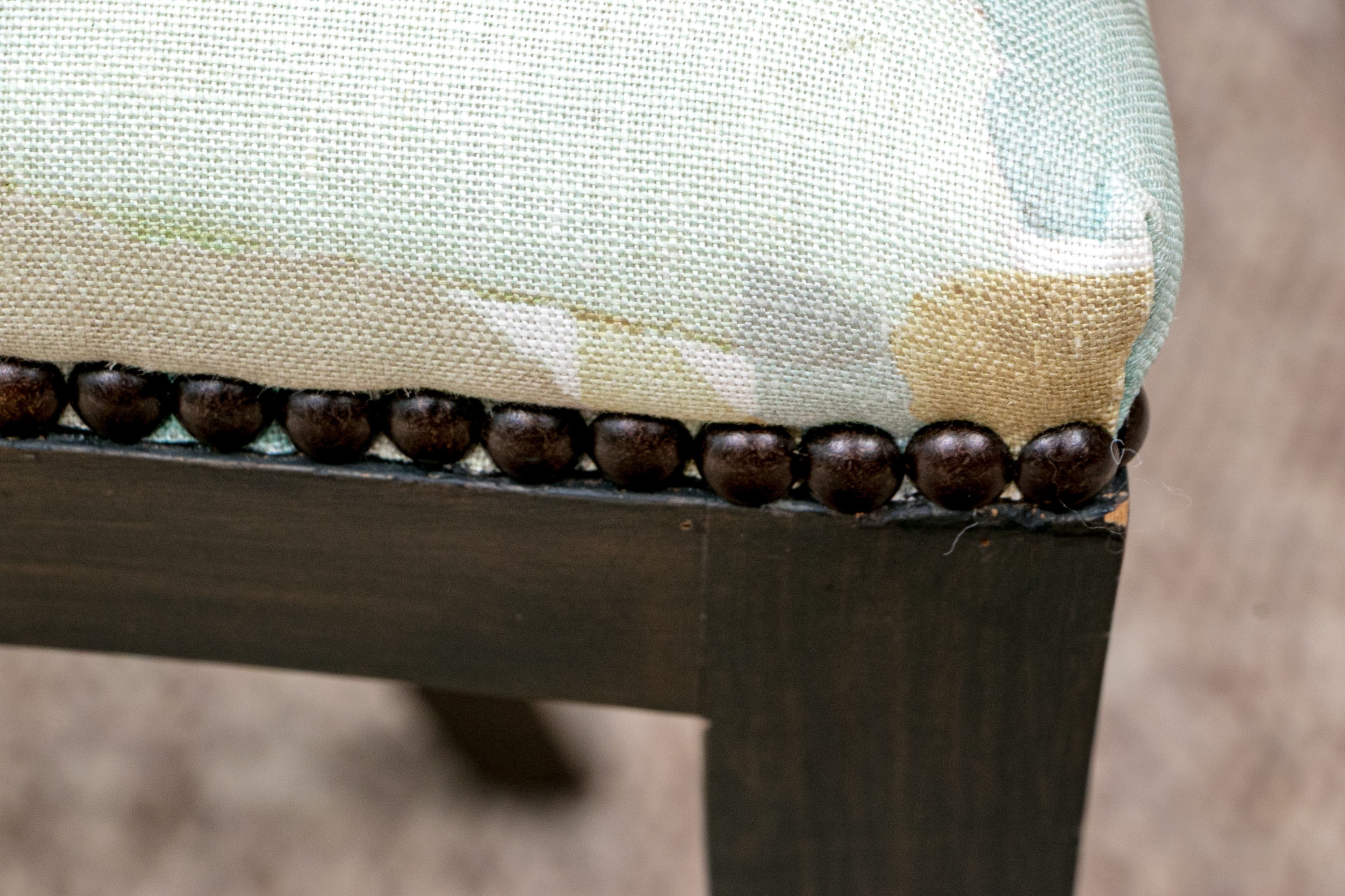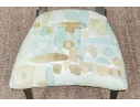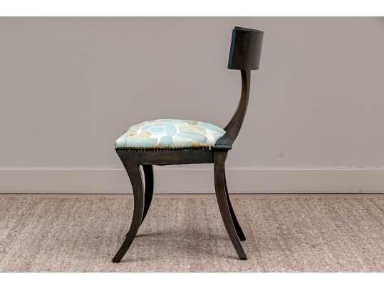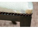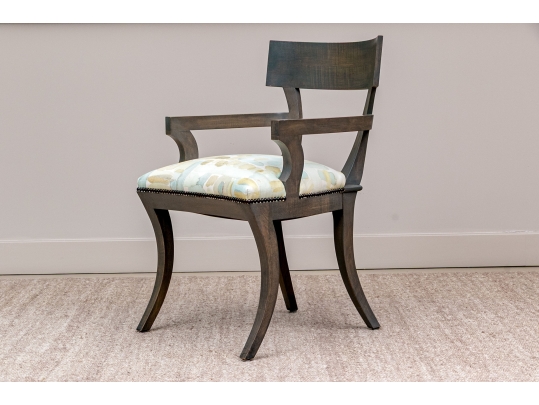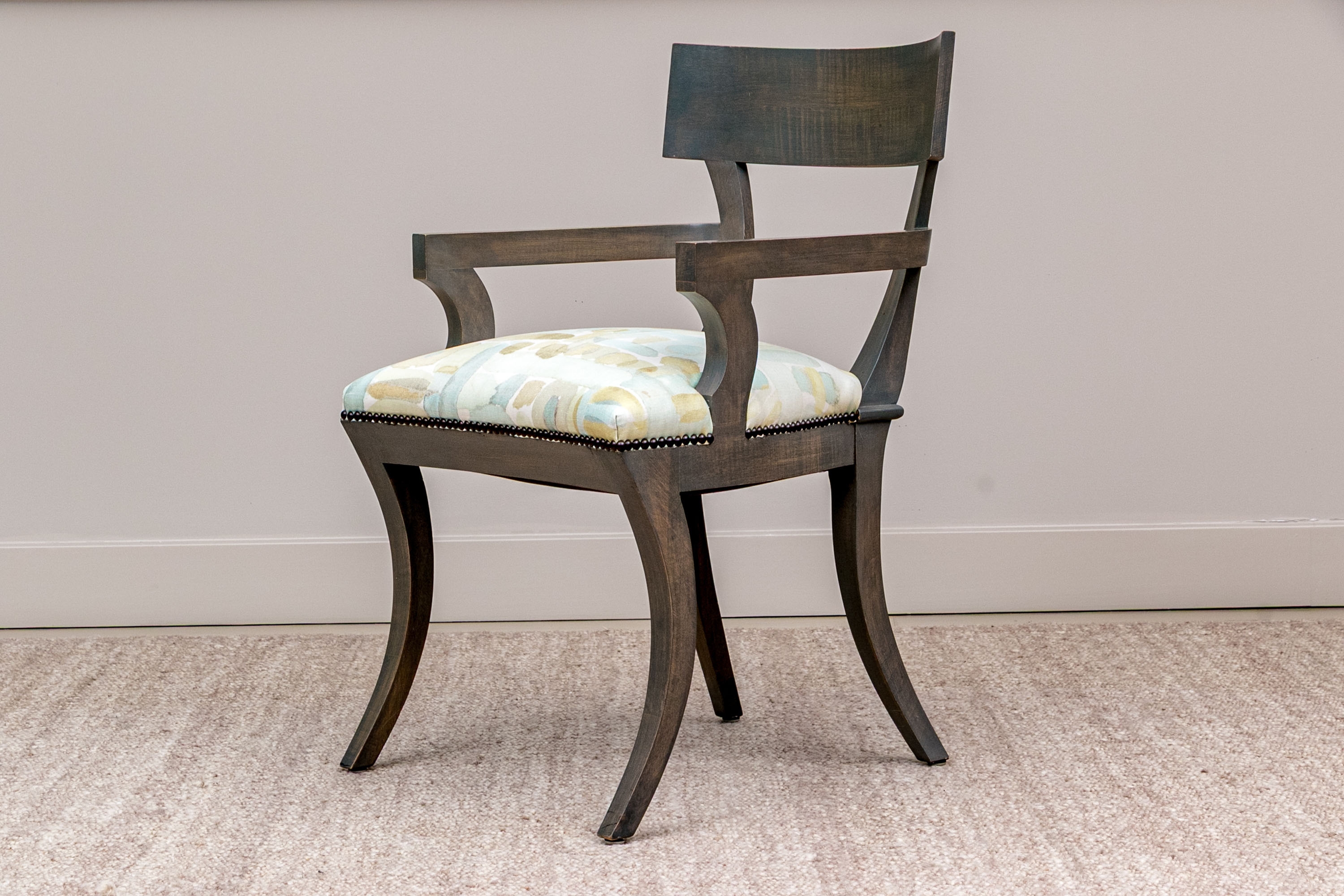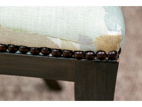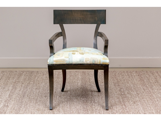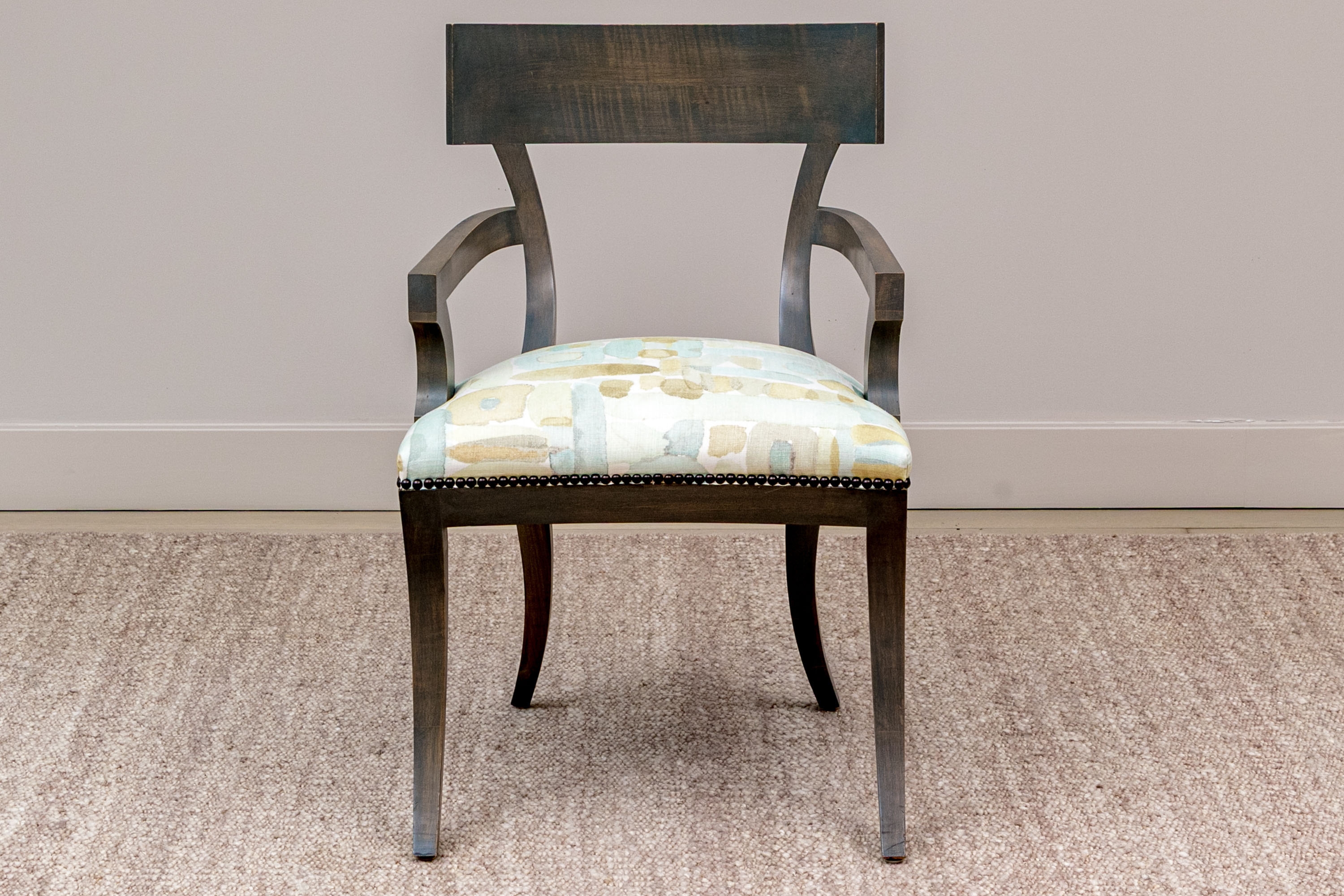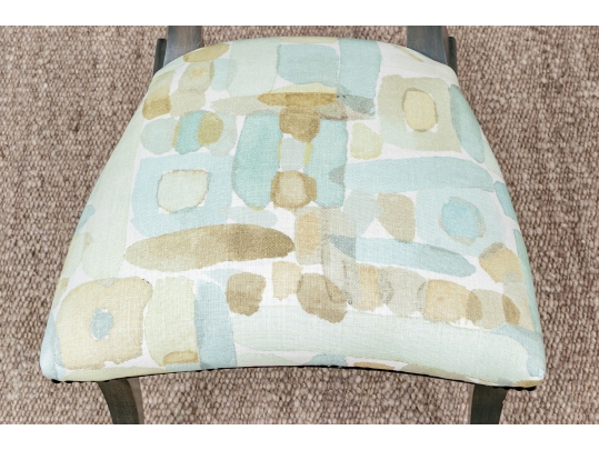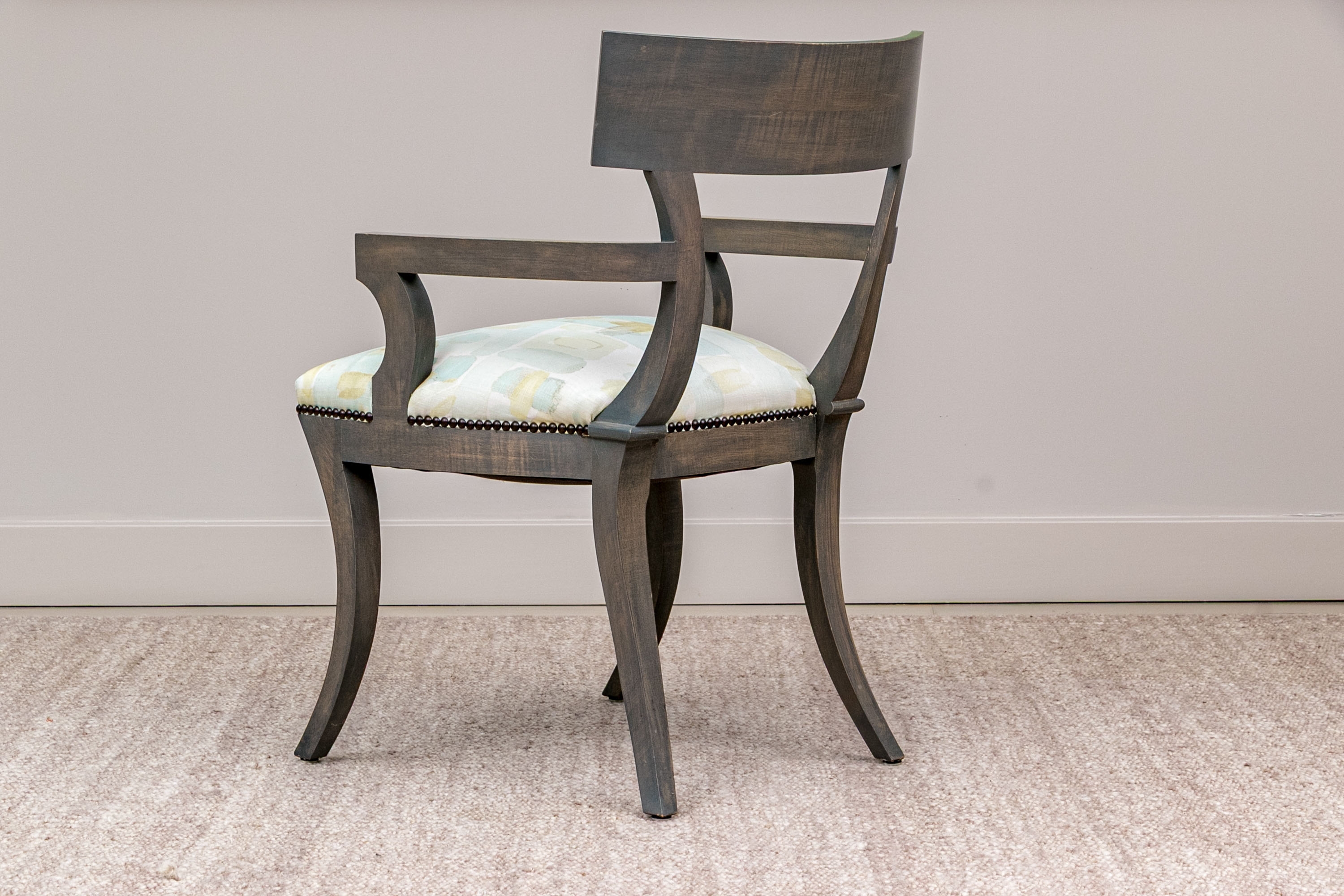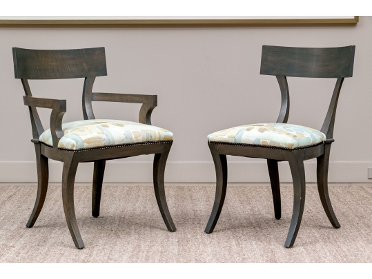 A very well made set of custom upholstered Klismos Style Dining Chairs in a soft Gray stain. Very sturdy and comfortable, the chairs have the Classic Klismos form as introduced to the design world by T.H Robsjohn Gibbings. The frames are stained in a wash type effect which allows the lighter wood below to show through. The seats are custom upholstered in a modern airy print reminiscent of watercolors in Blues, Sage, Tan and Cream and have full surround nail-head trim.