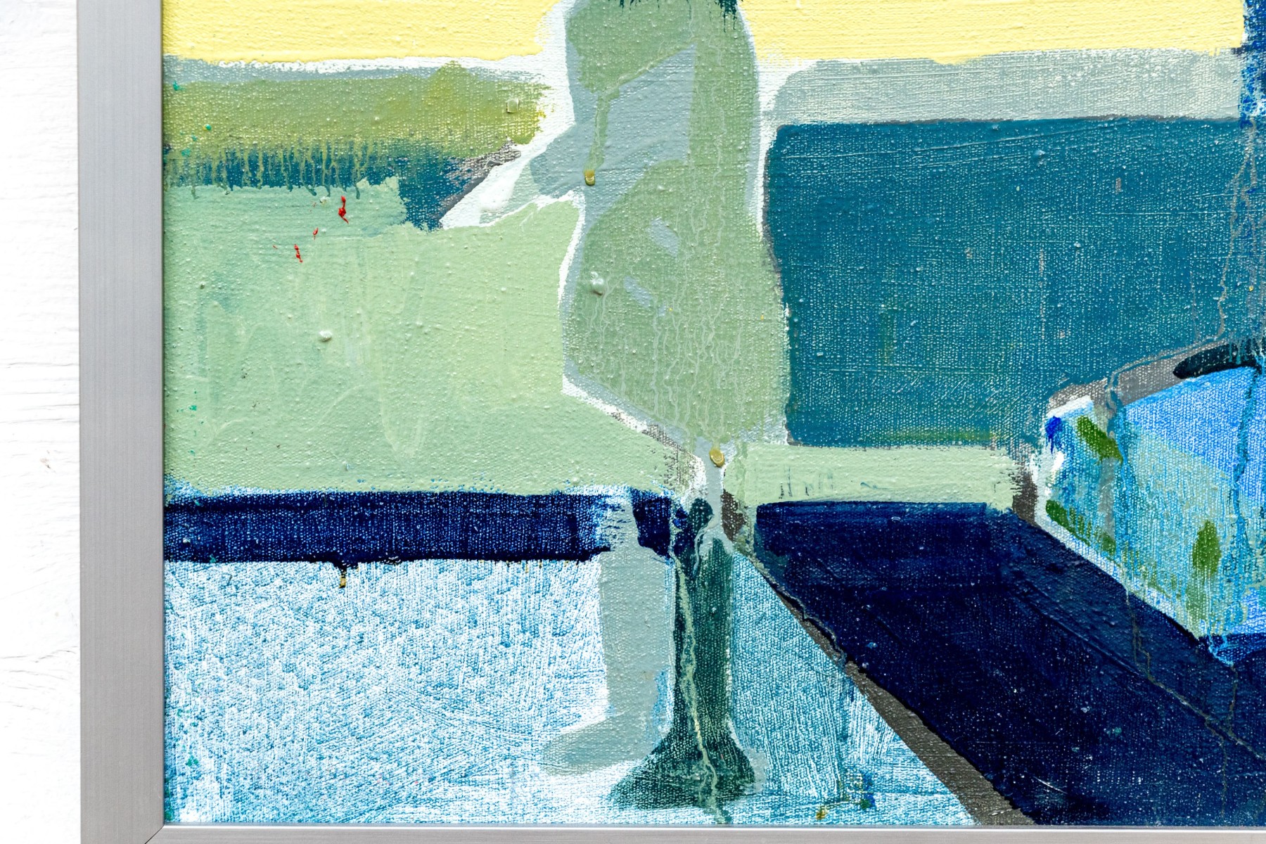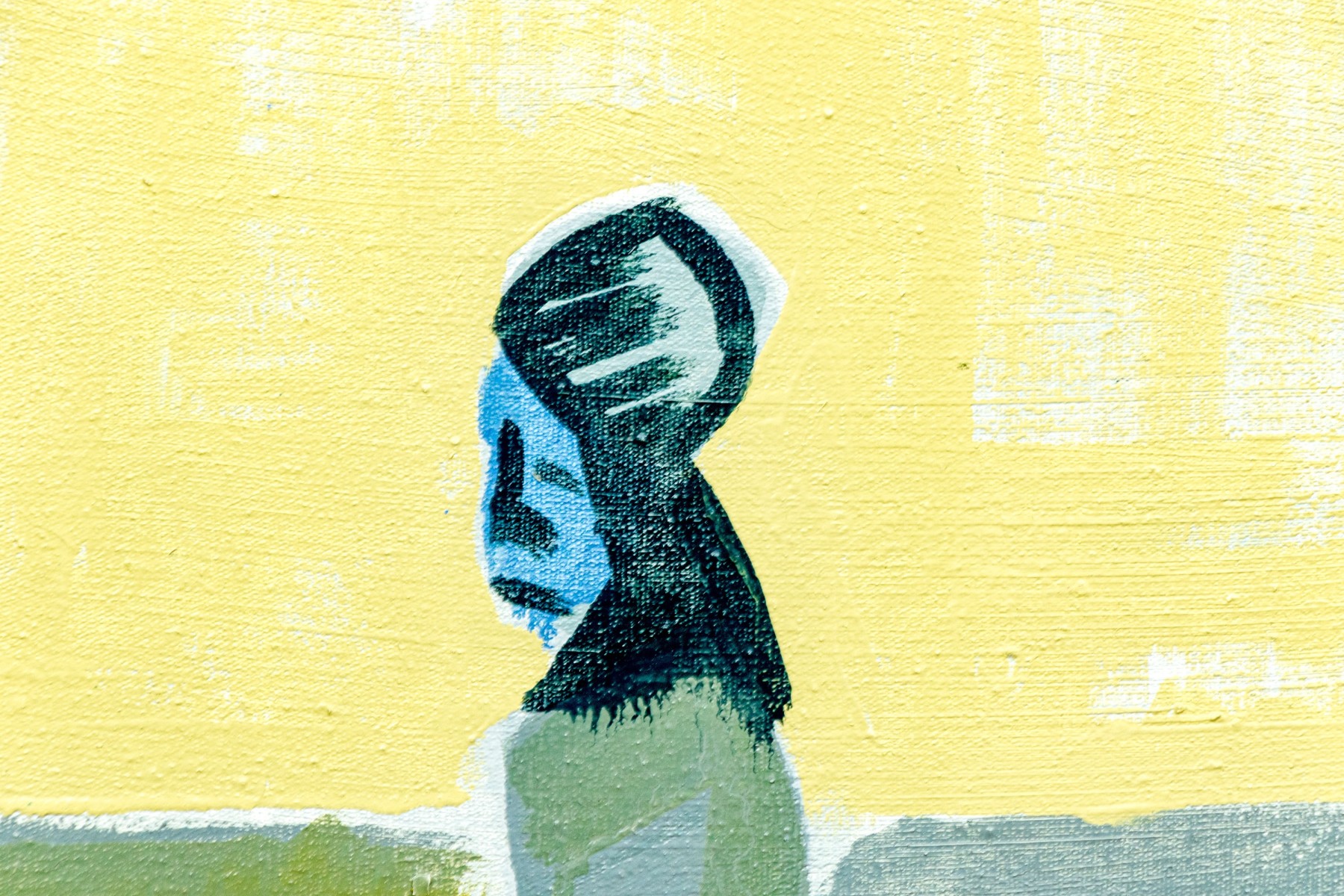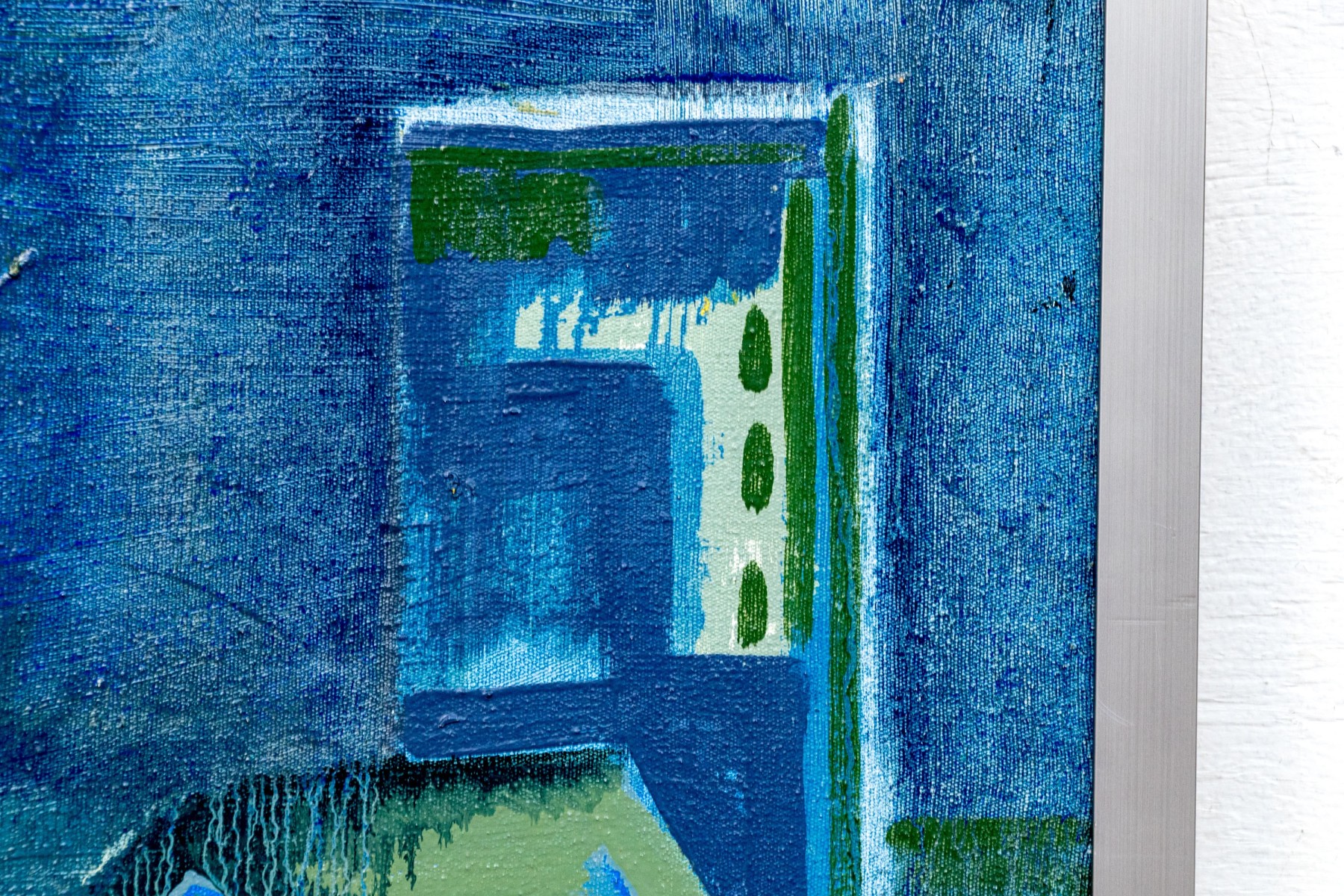 Apparently unsigned. The painting depicts an Expressionist style figural cityscape scene with a woman wearing a hat, walking outside of brightly painted building facades with a car in the nearground.
