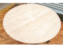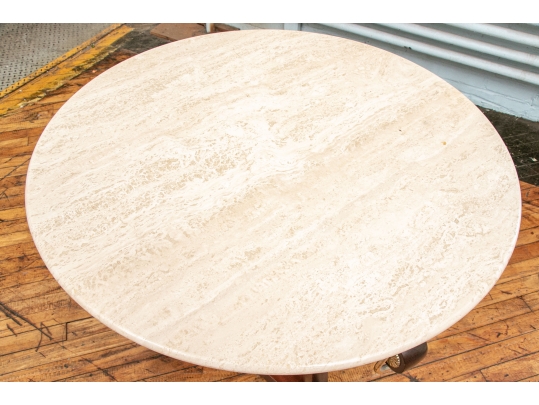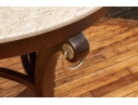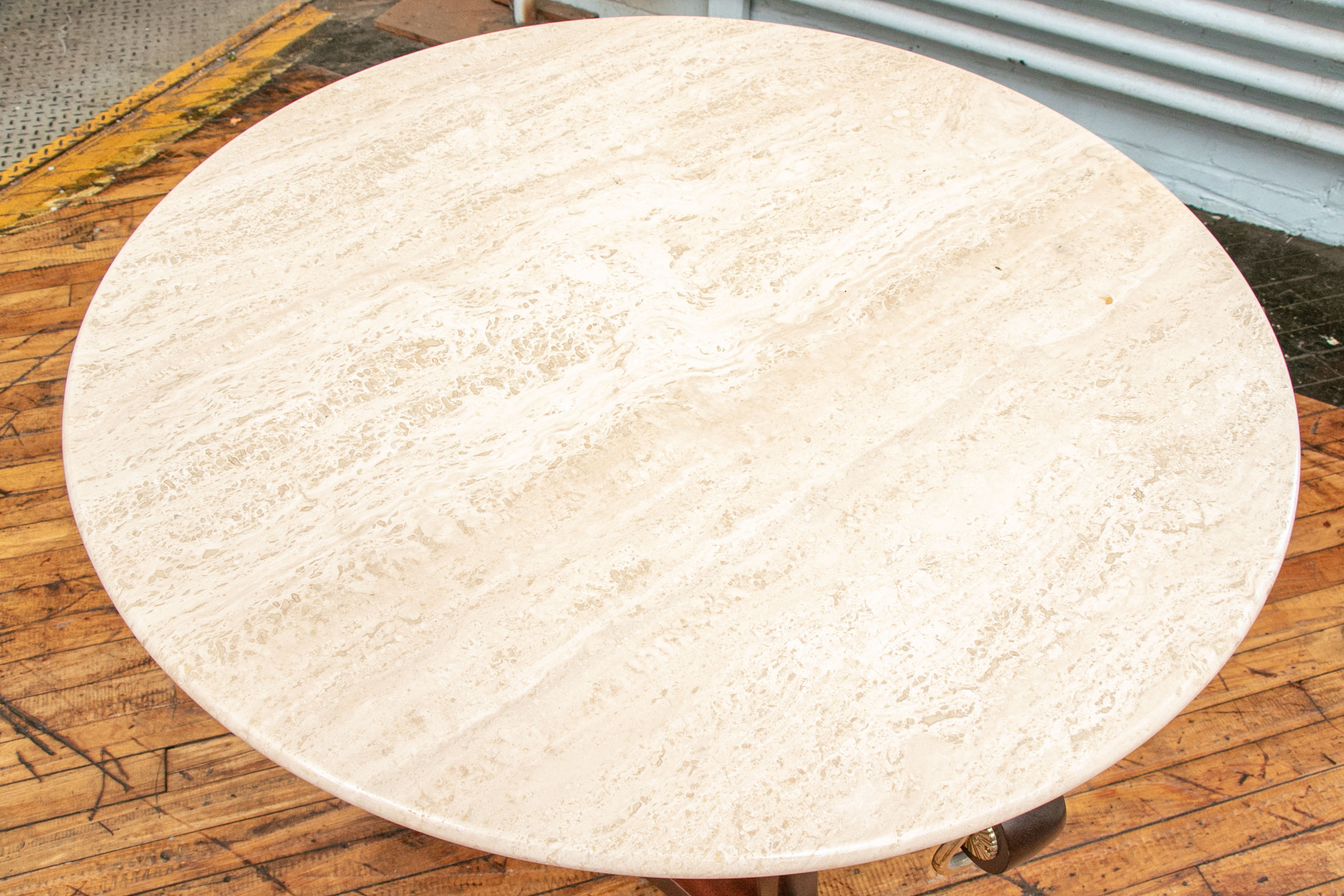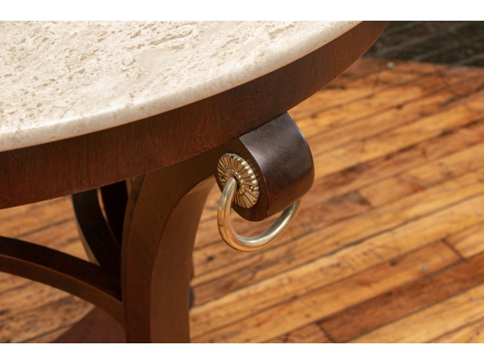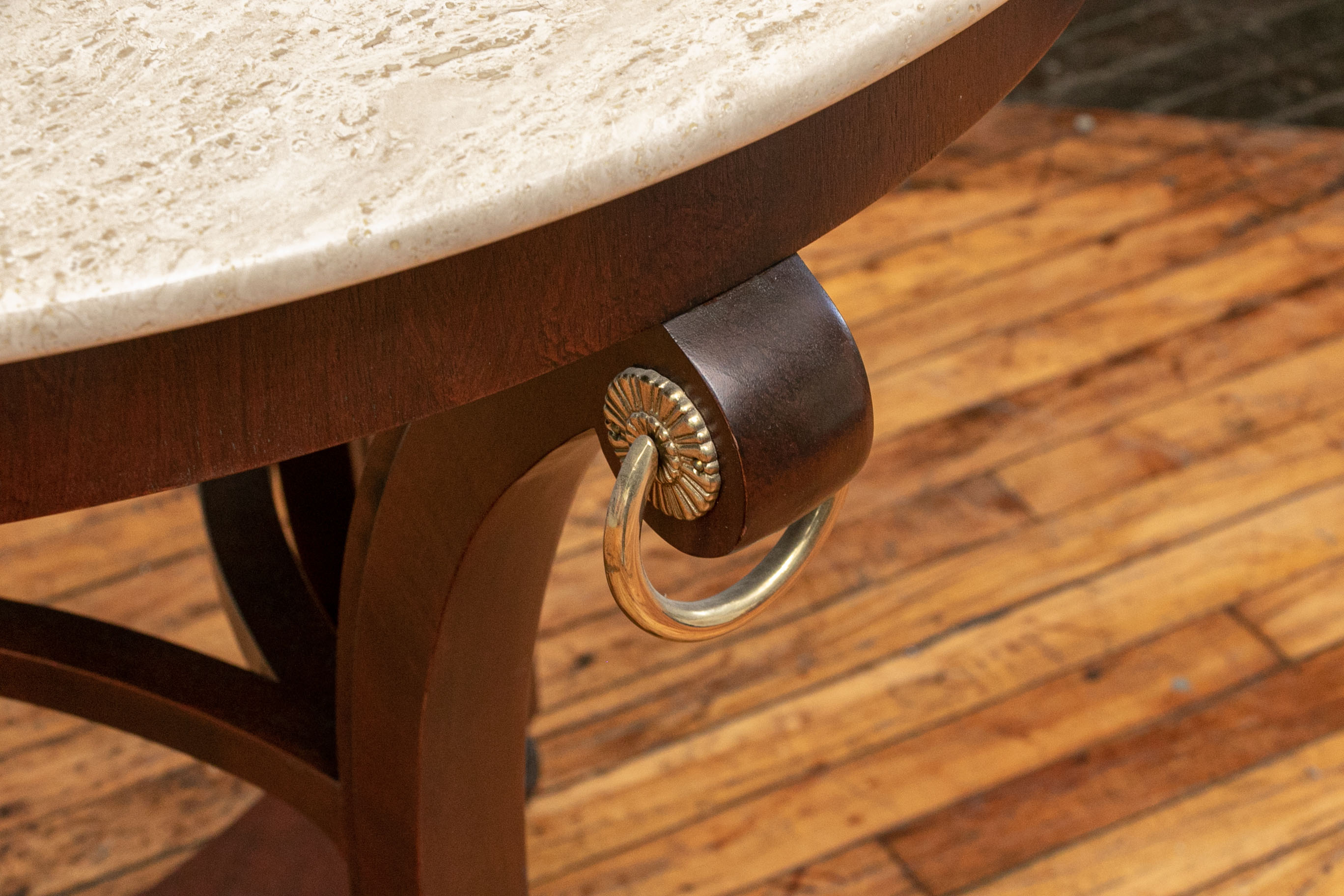 In outstanding condition, this stylish table has great proportions and may be used in any number of ways including as an intimate dining table. The frame is a fine satin mahogany with contrasting Chrome Rings and Rosettes. The top is a filled and polished Travertine with nicely rounded edge, good pattern and color.