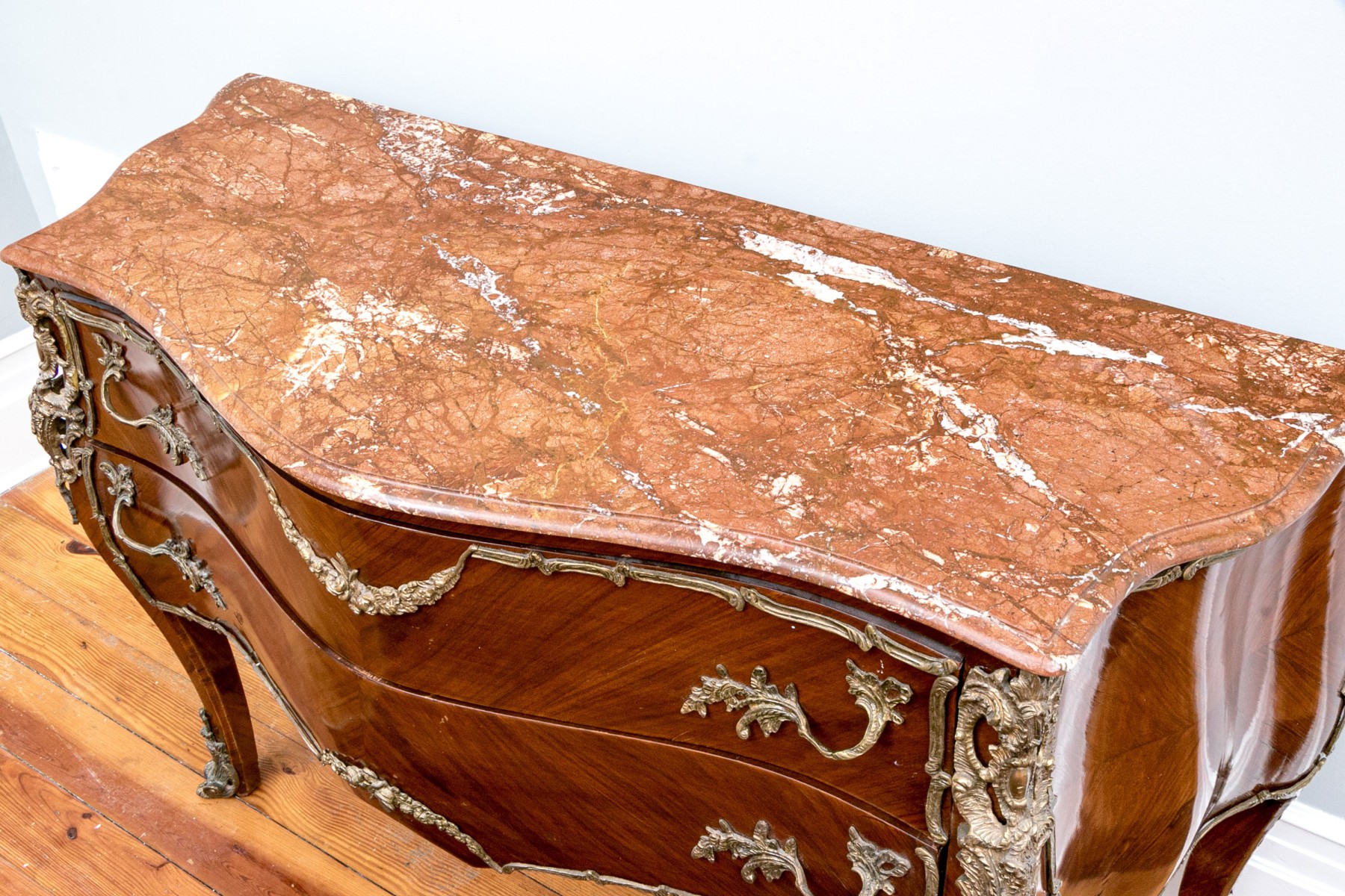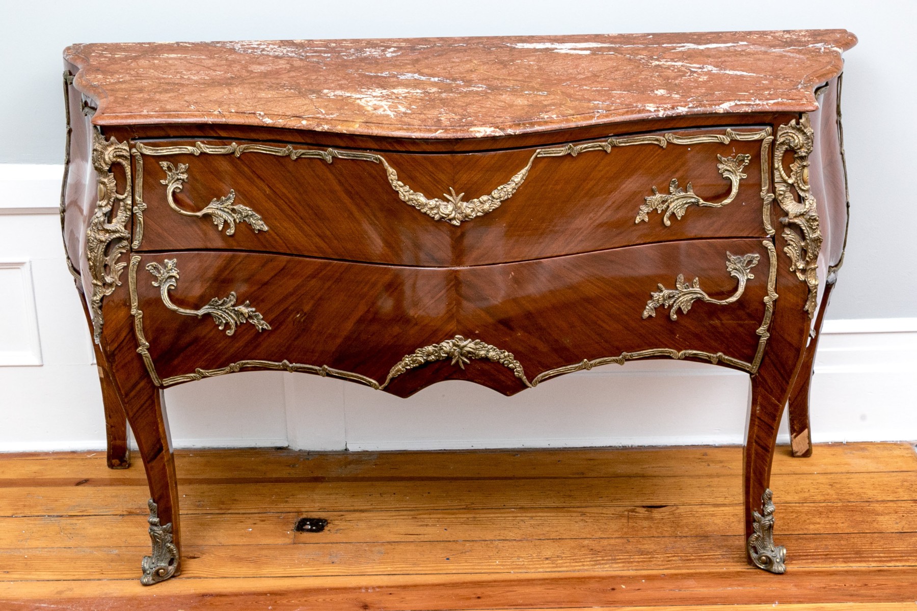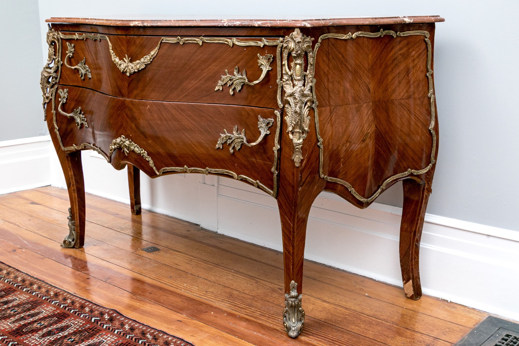An exquisite Louis XV style commode veneered in figured mahogany with a rich medium brown finish. The serpentine form is topped with gorgeous rouge marble with a beveled edge over two drawers heavily adorned with gilded metal borders ornately designed with foliate relief and scrolled flourishes, complimenting naturalistic handles. The curving posts lend a bombe profile to the piece, leading to front legs capped in scrolled metal at the feet.