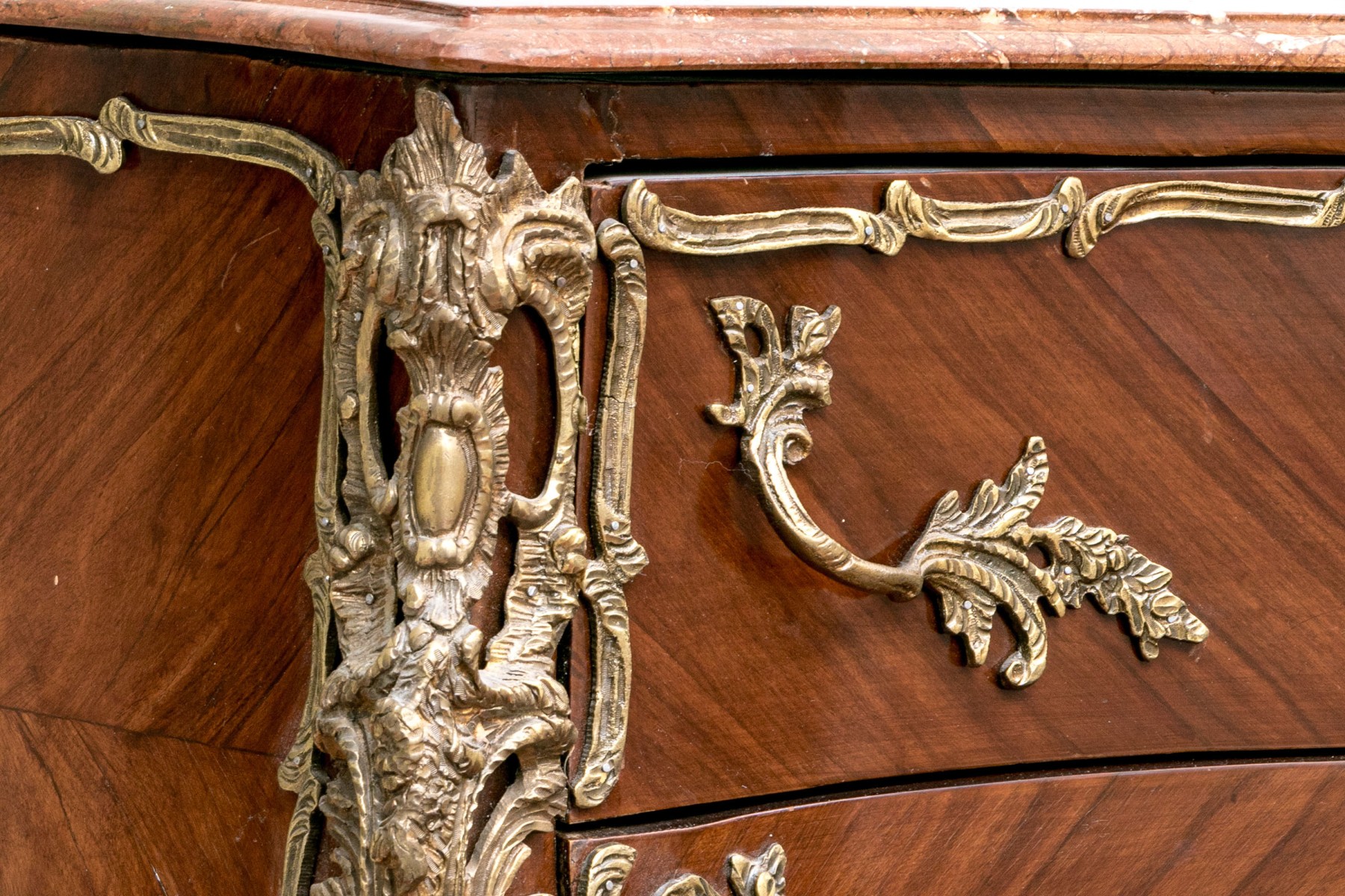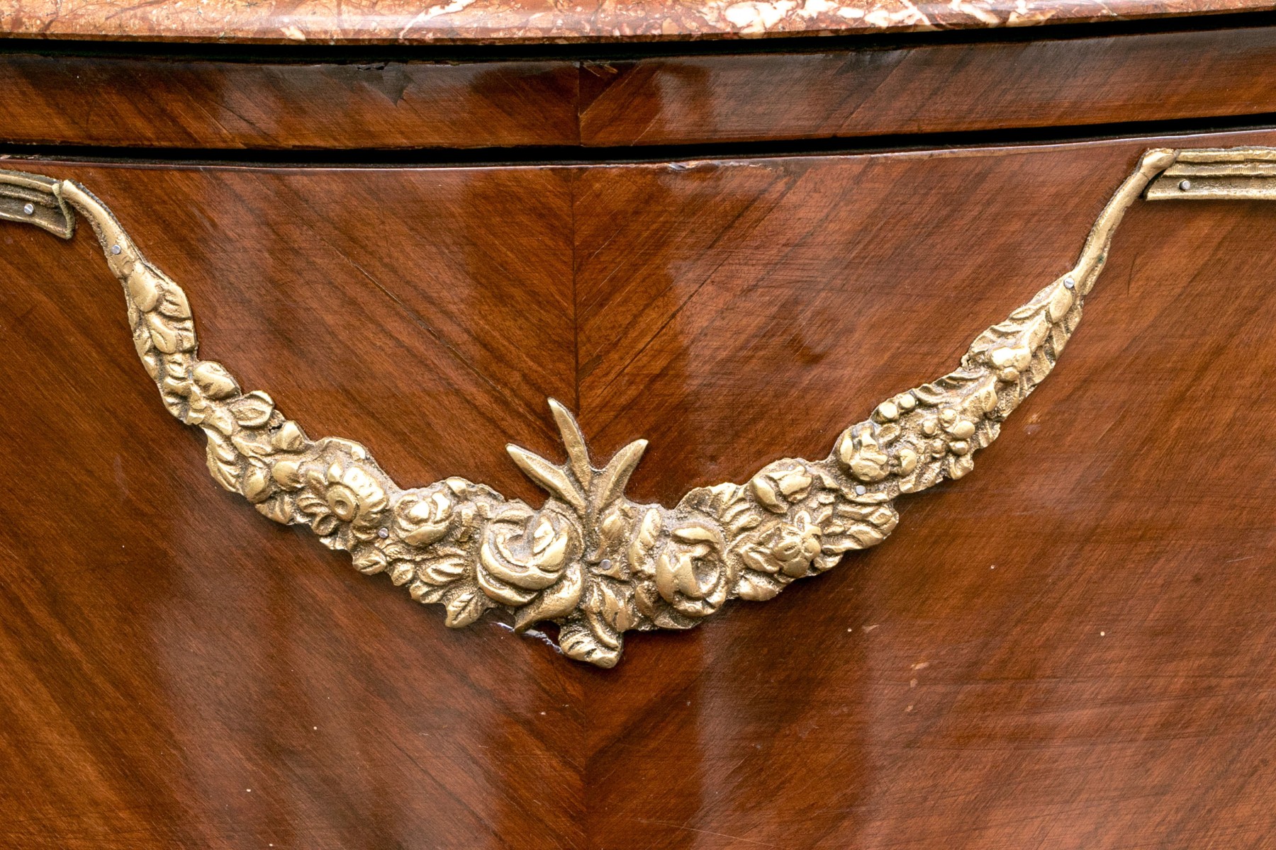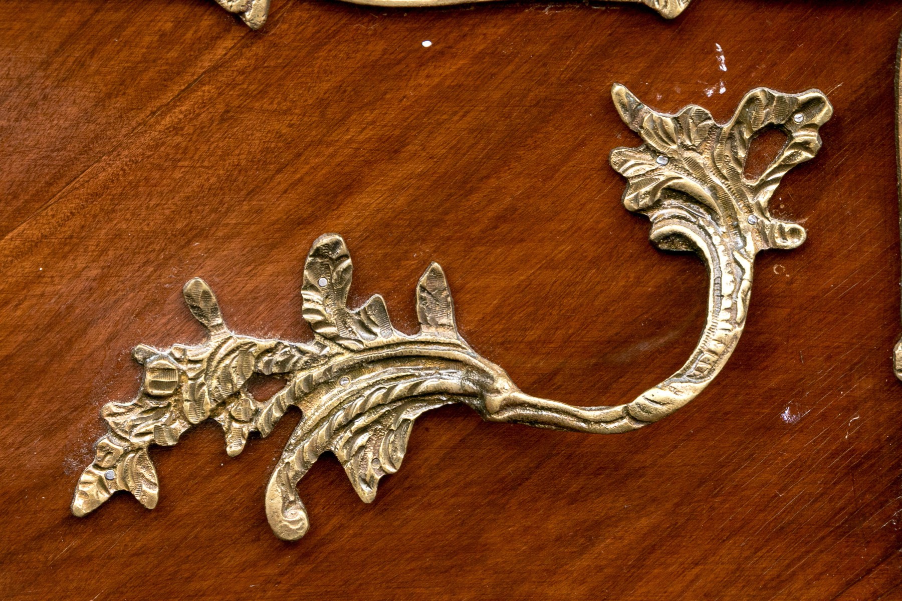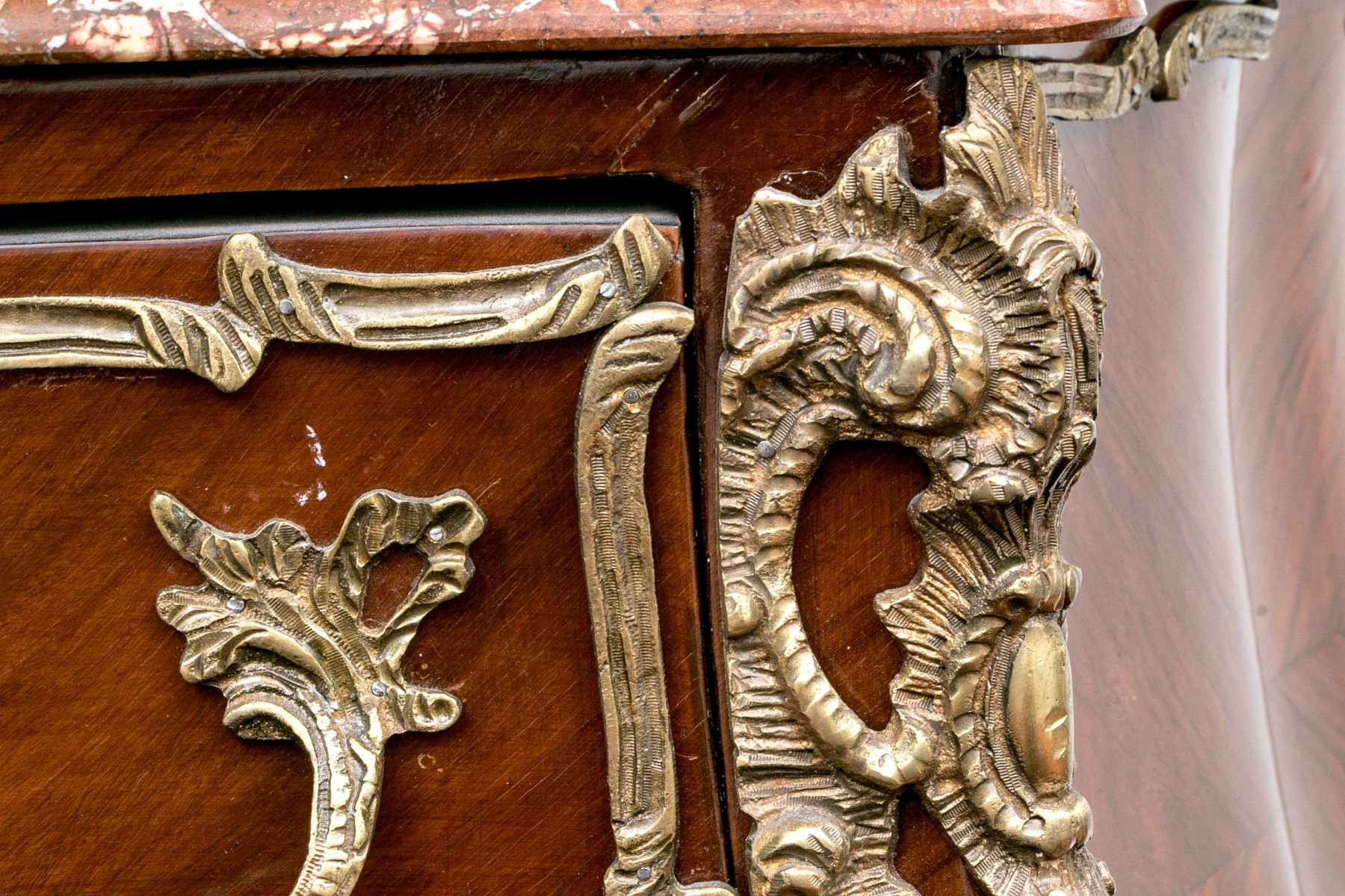 An exquisite Louis XV style commode veneered in figured mahogany with a rich medium brown finish. The serpentine form is topped with gorgeous rouge marble with a beveled edge over two drawers heavily adorned with gilded metal borders ornately designed with foliate relief and scrolled flourishes, complimenting naturalistic handles. The curving posts lend a bombe profile to the piece, leading to front legs capped in scrolled metal at the feet.