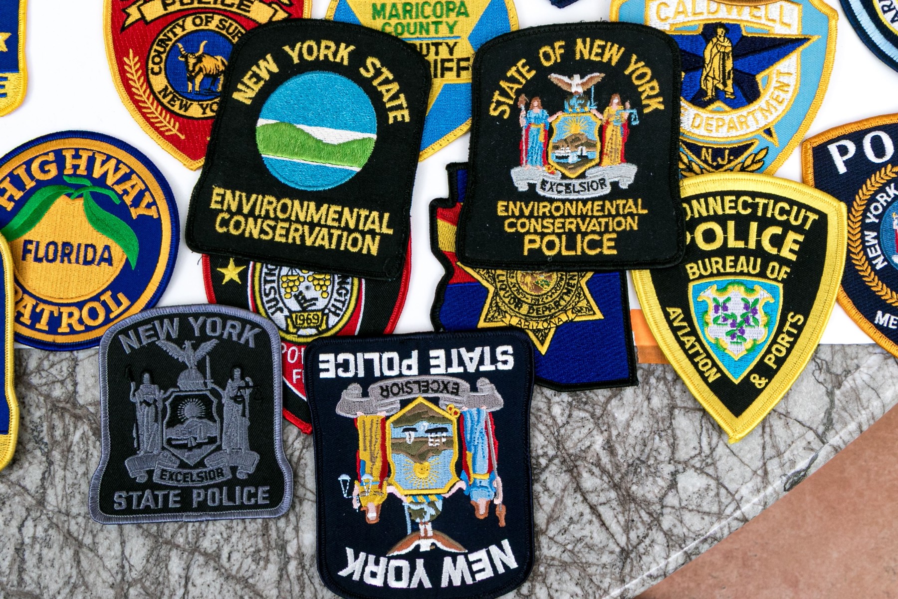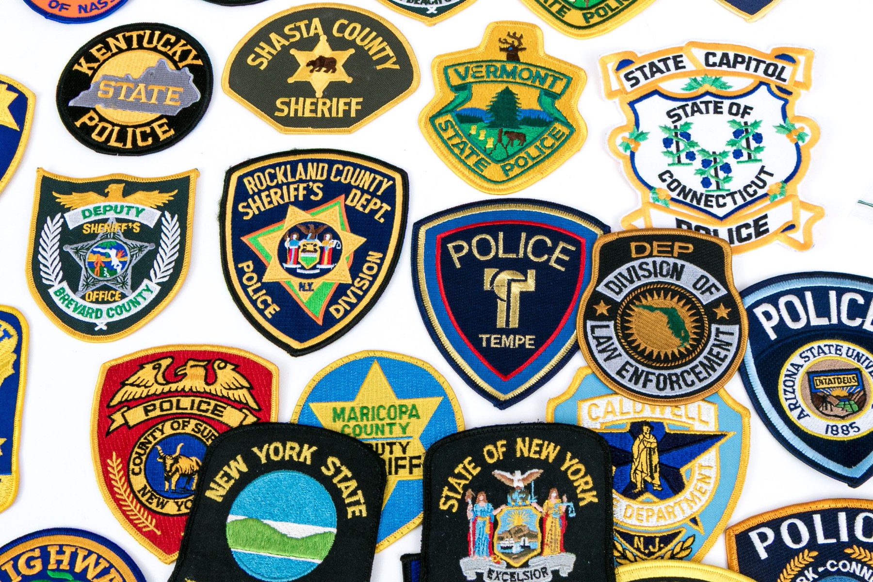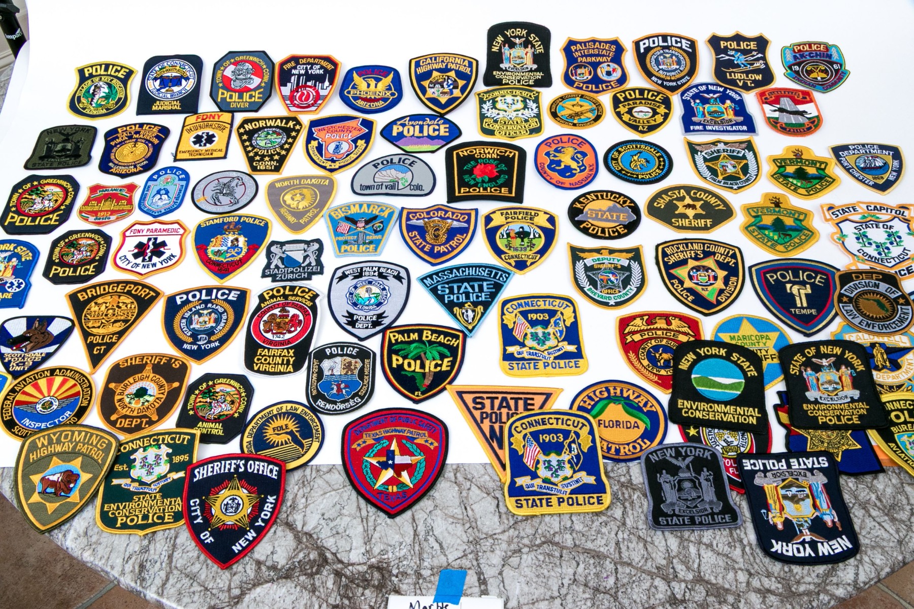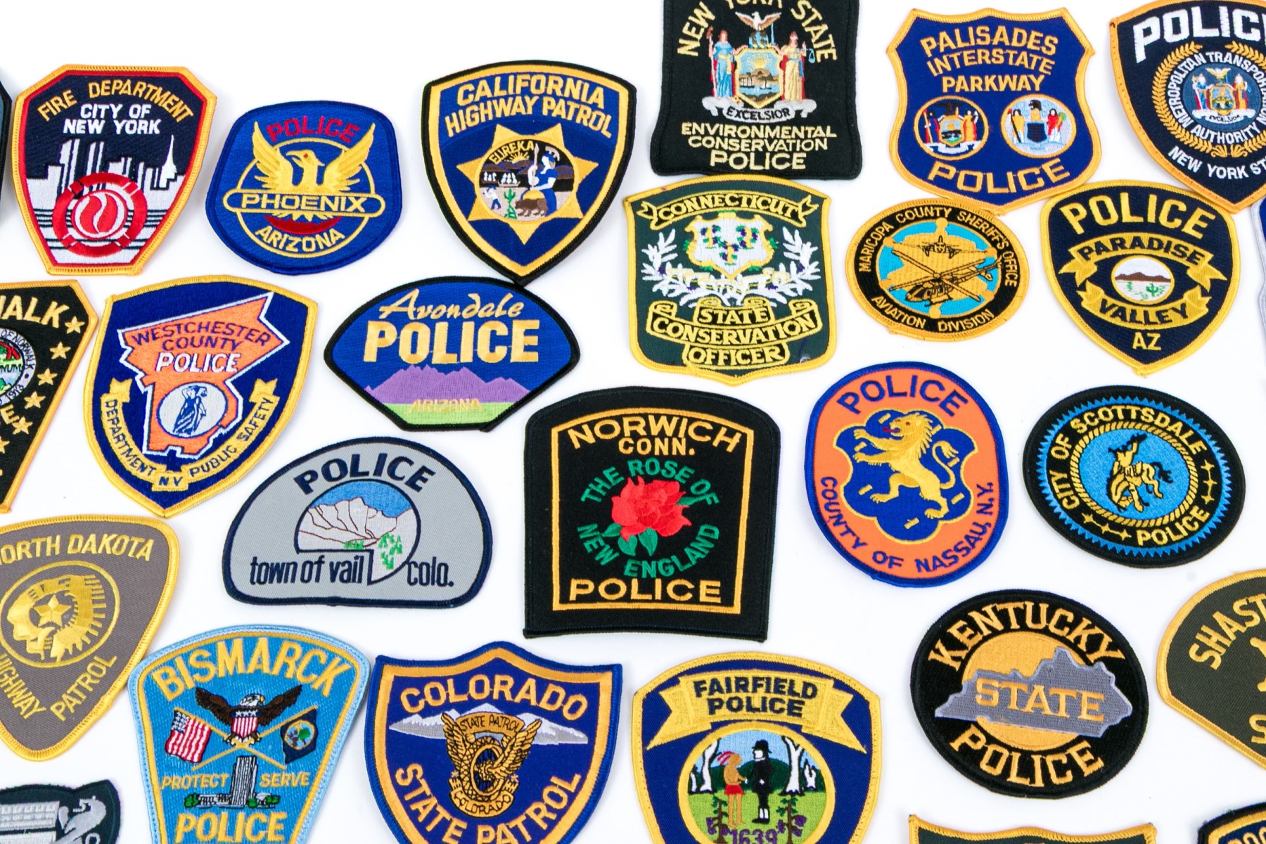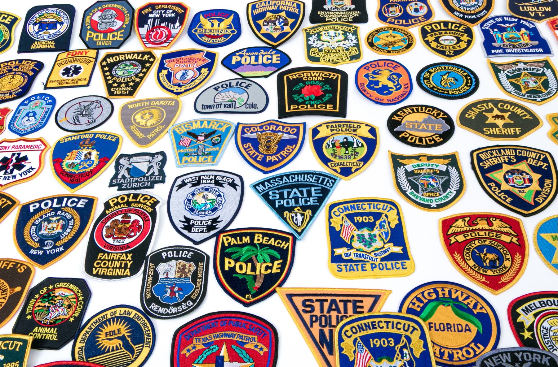 A sizable collection of approximately eighty-two patches for American police, highway patrol, environmental conversation, and more.