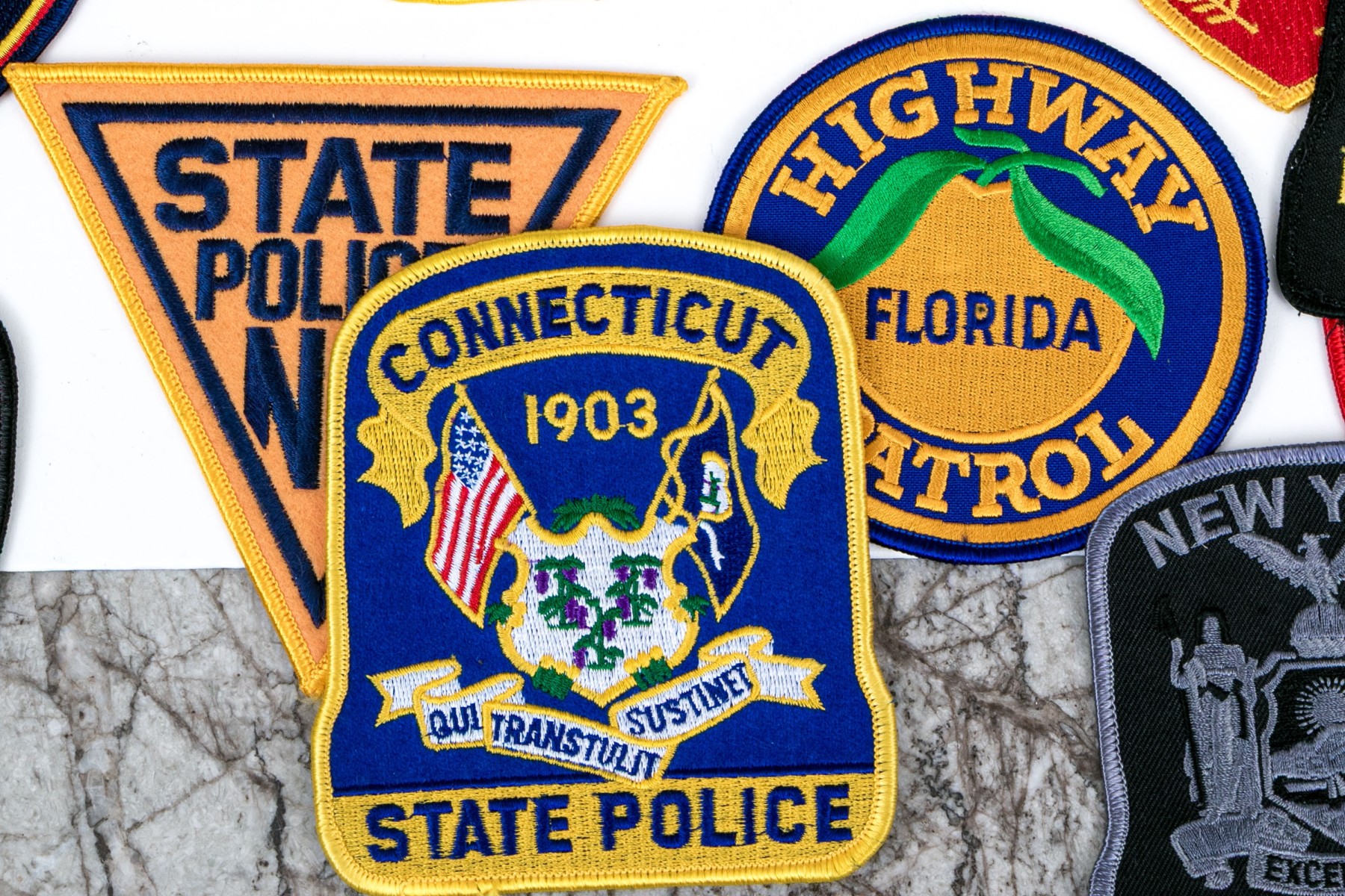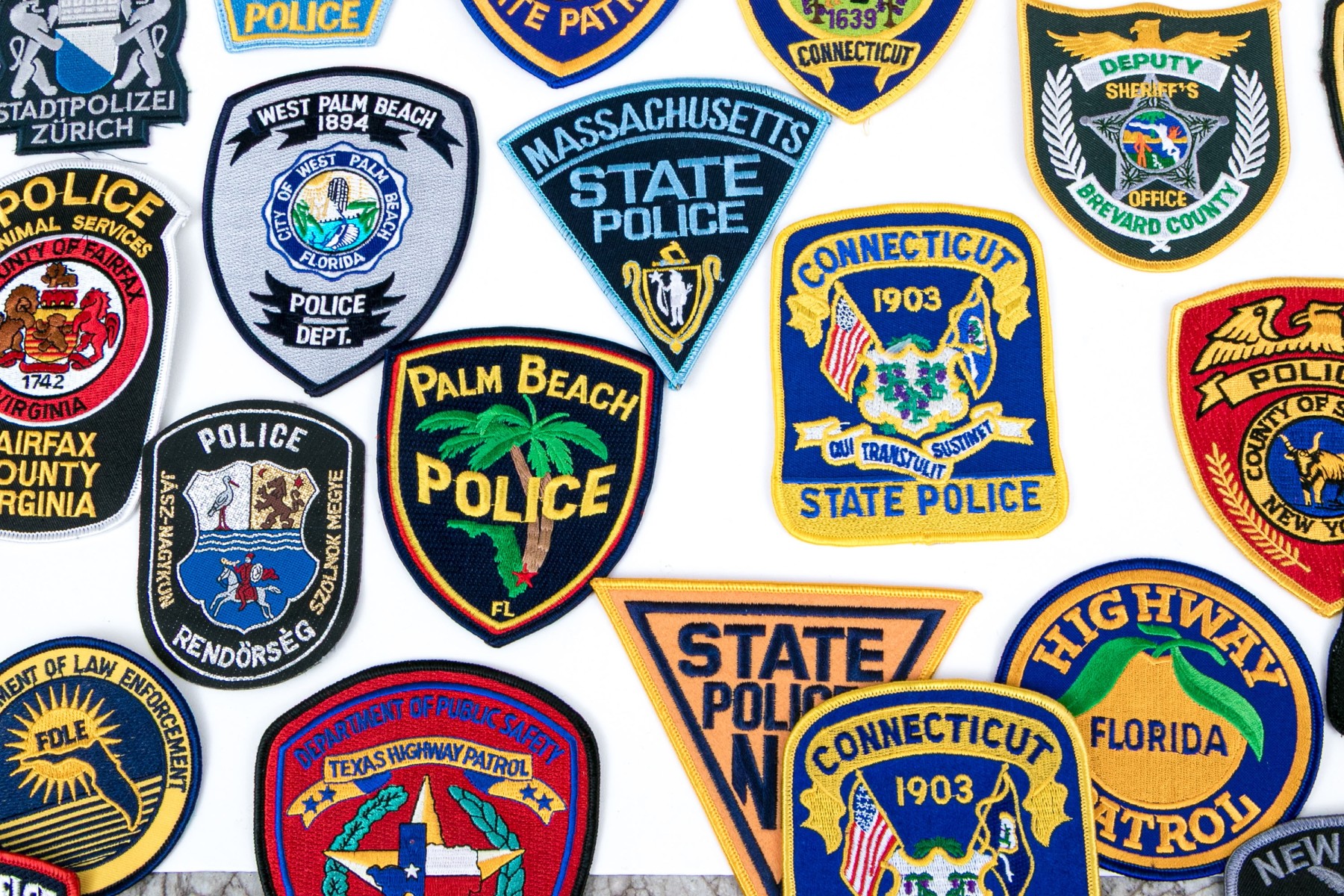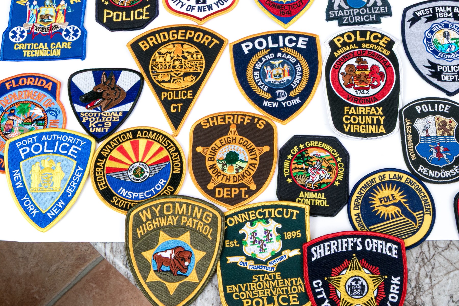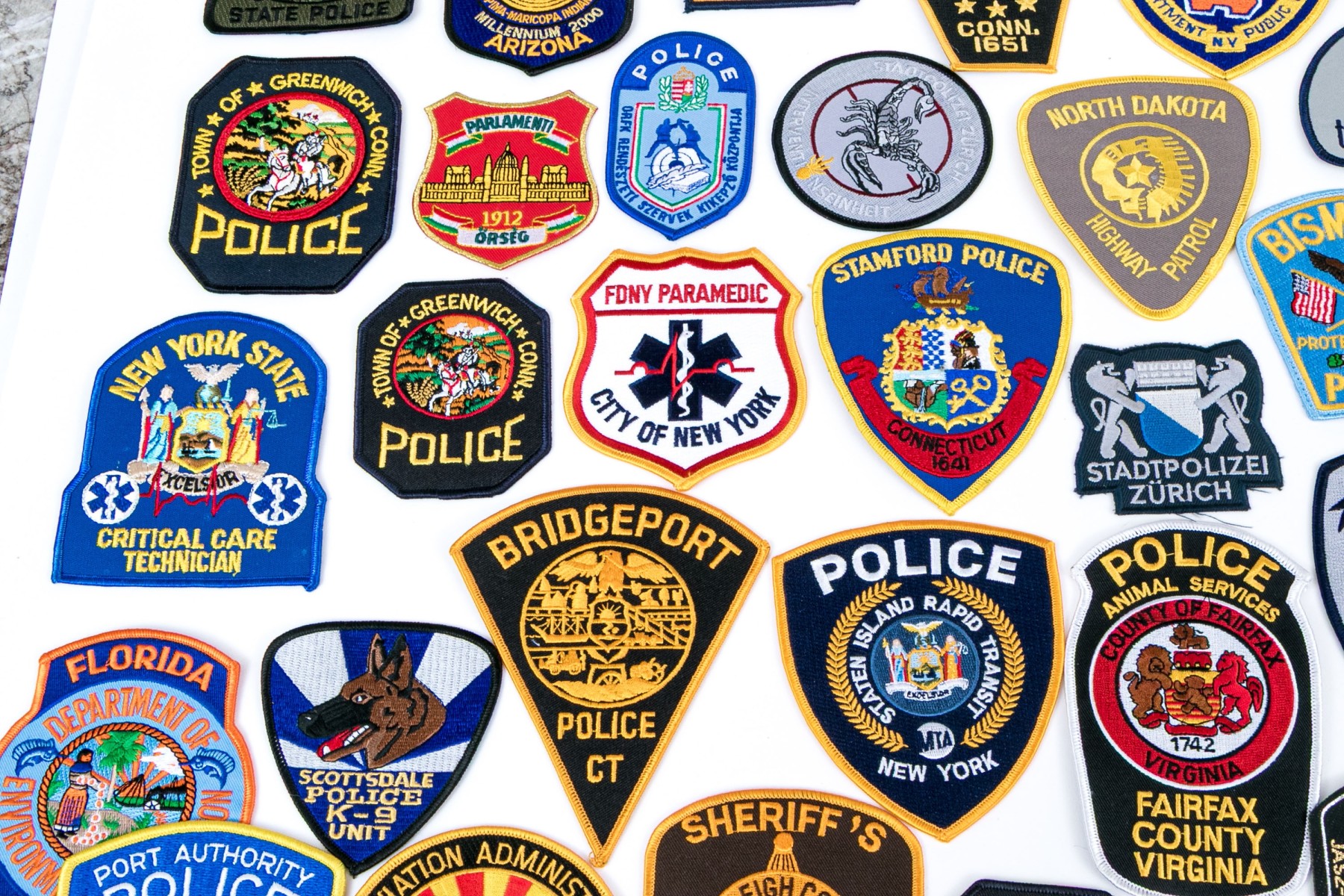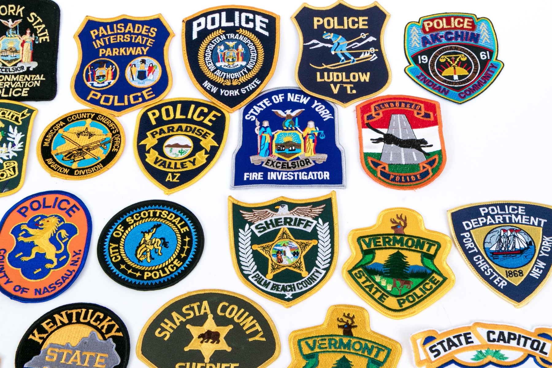 A sizable collection of approximately eighty-two patches for American police, highway patrol, environmental conversation, and more.