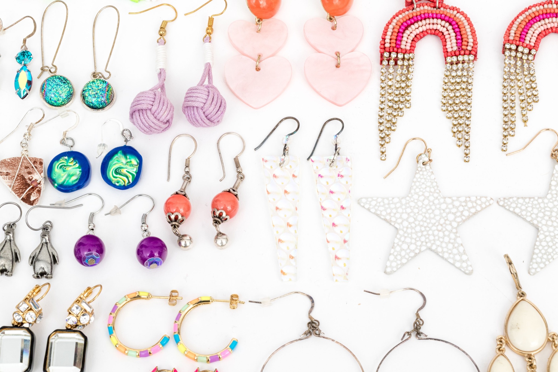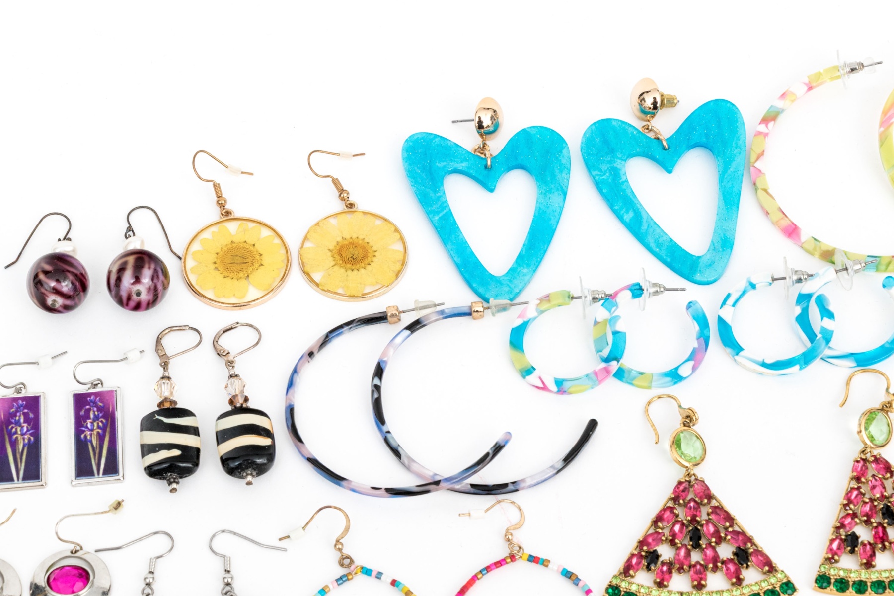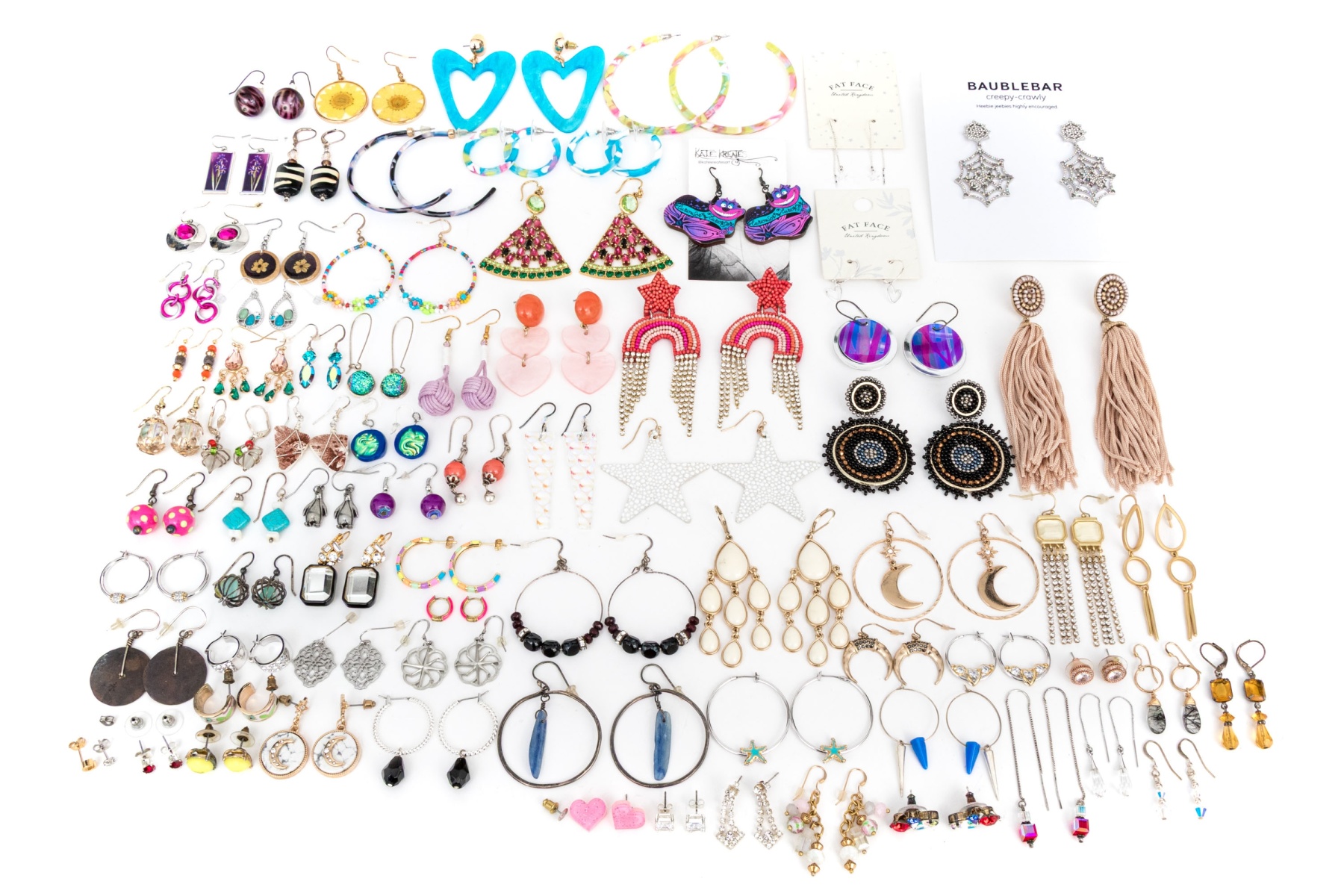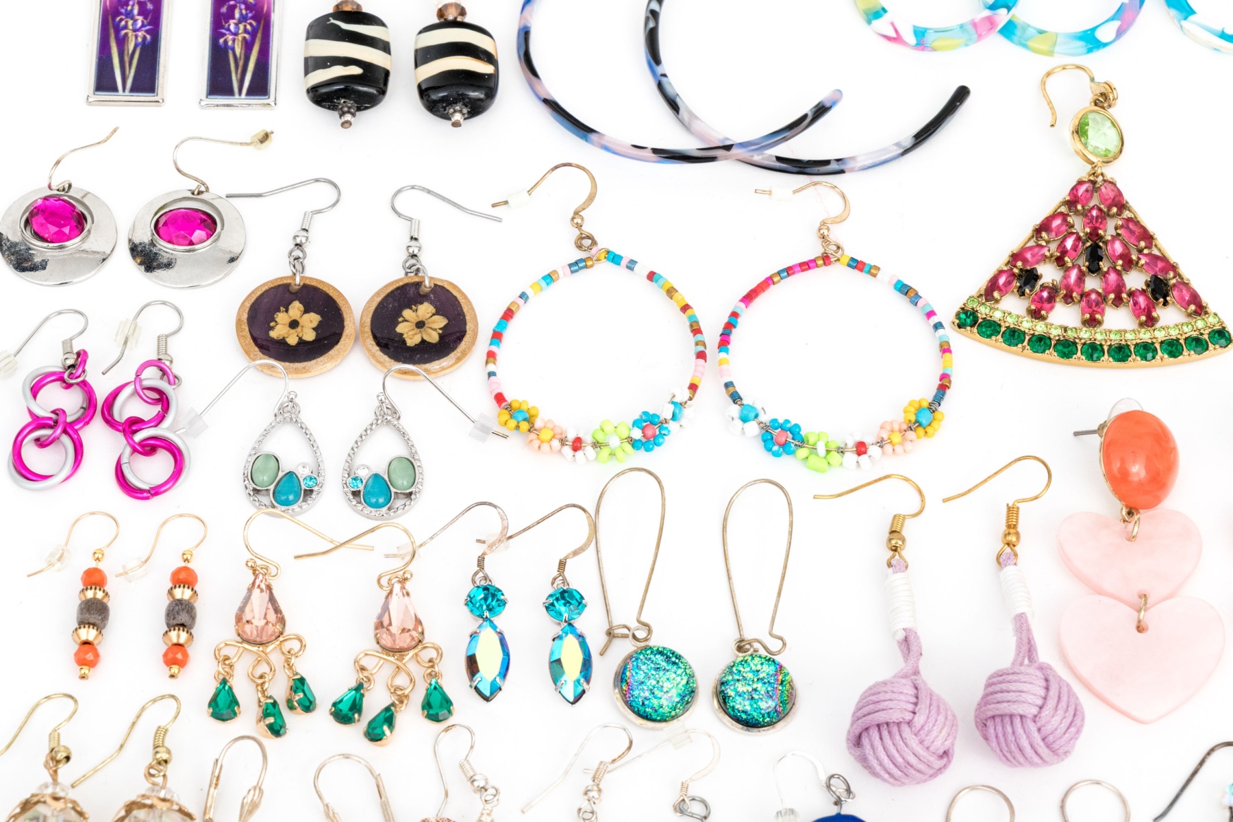 Collection of costume jewelry earrings, ranging from hoop style, drop pendant styles, studs, and button styles, some are new on cards