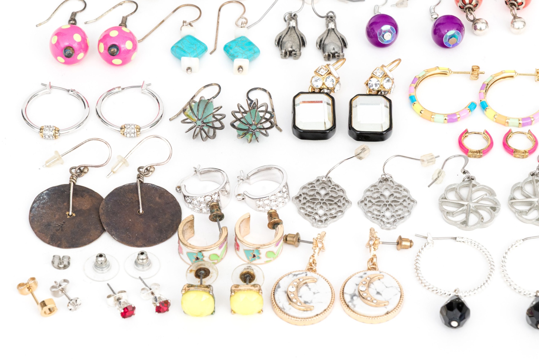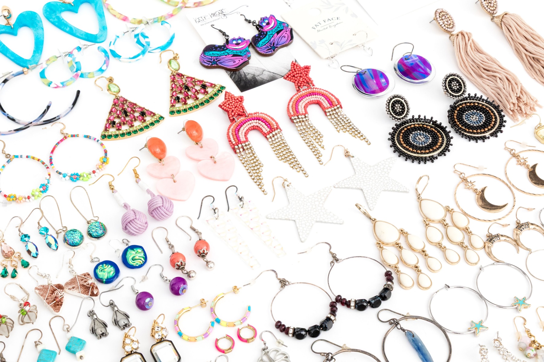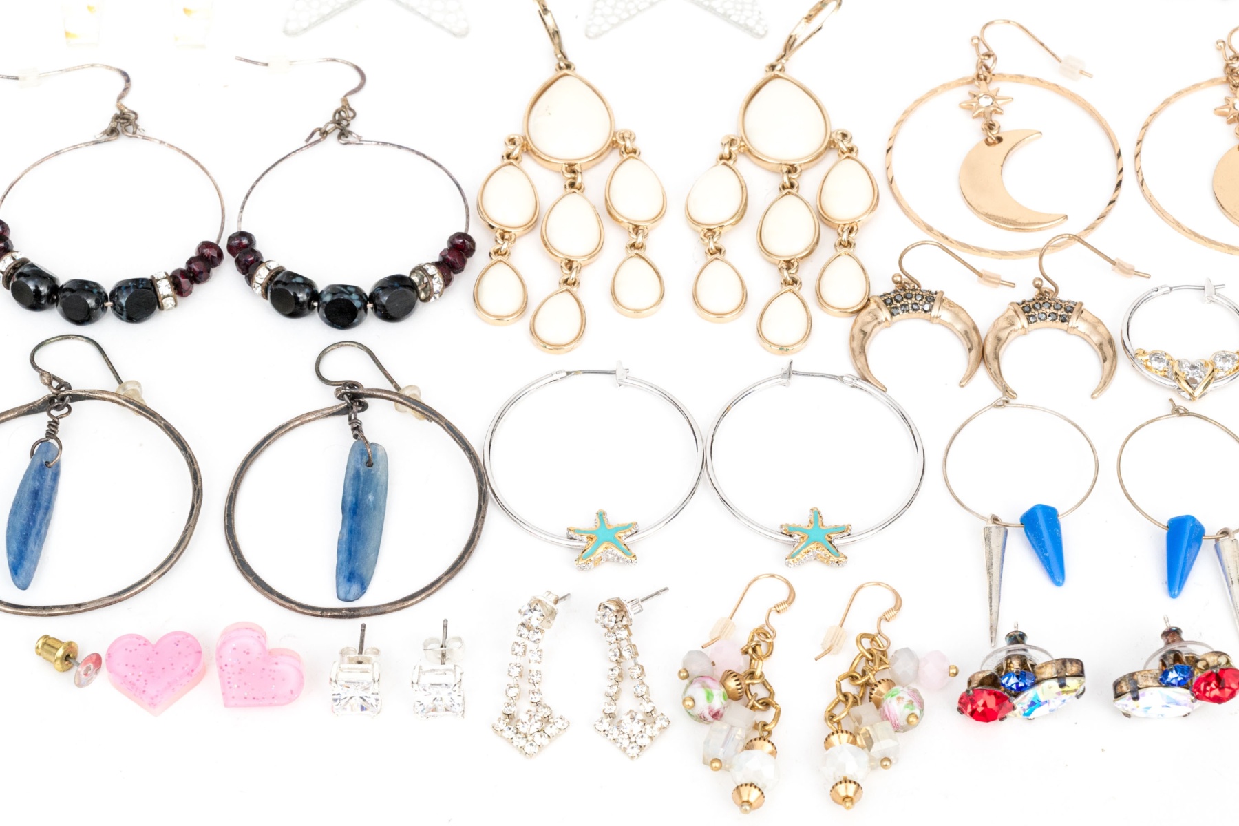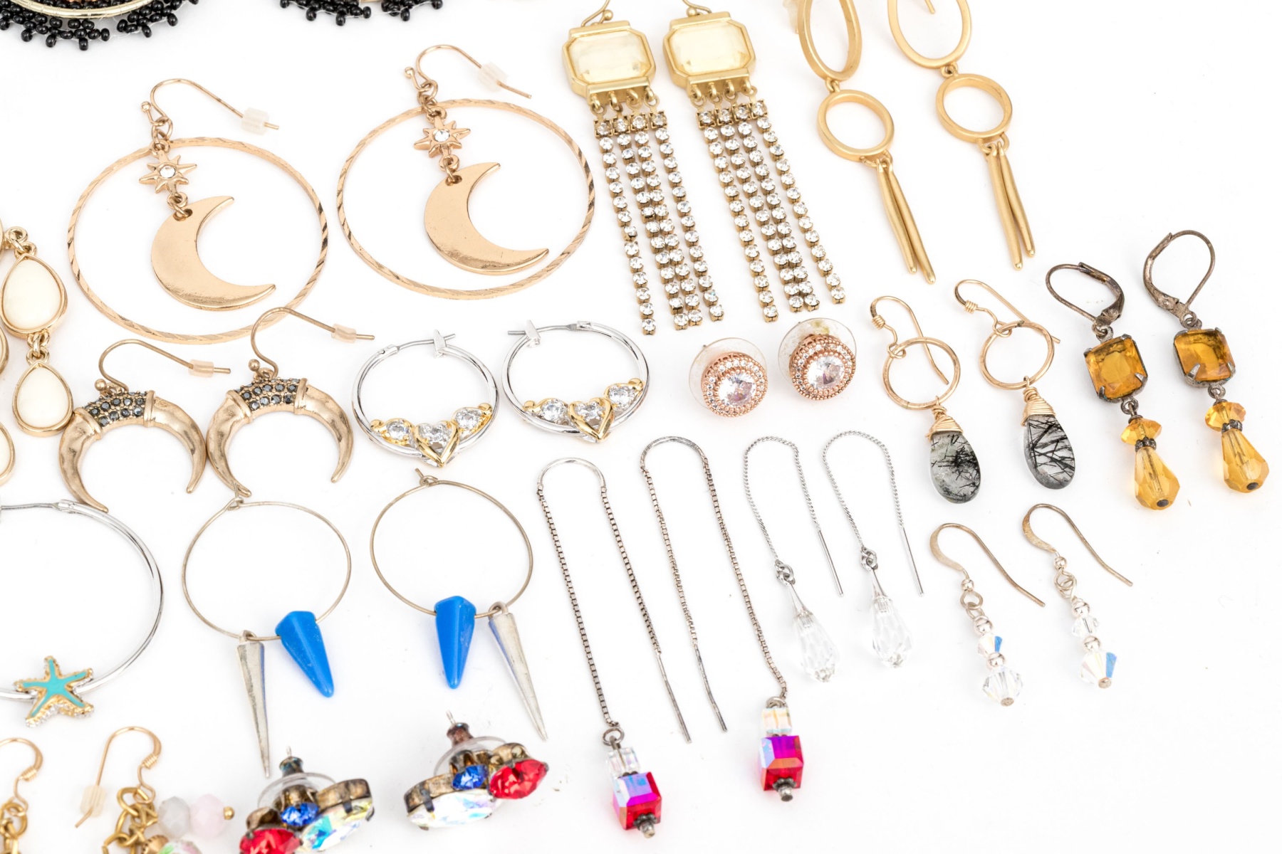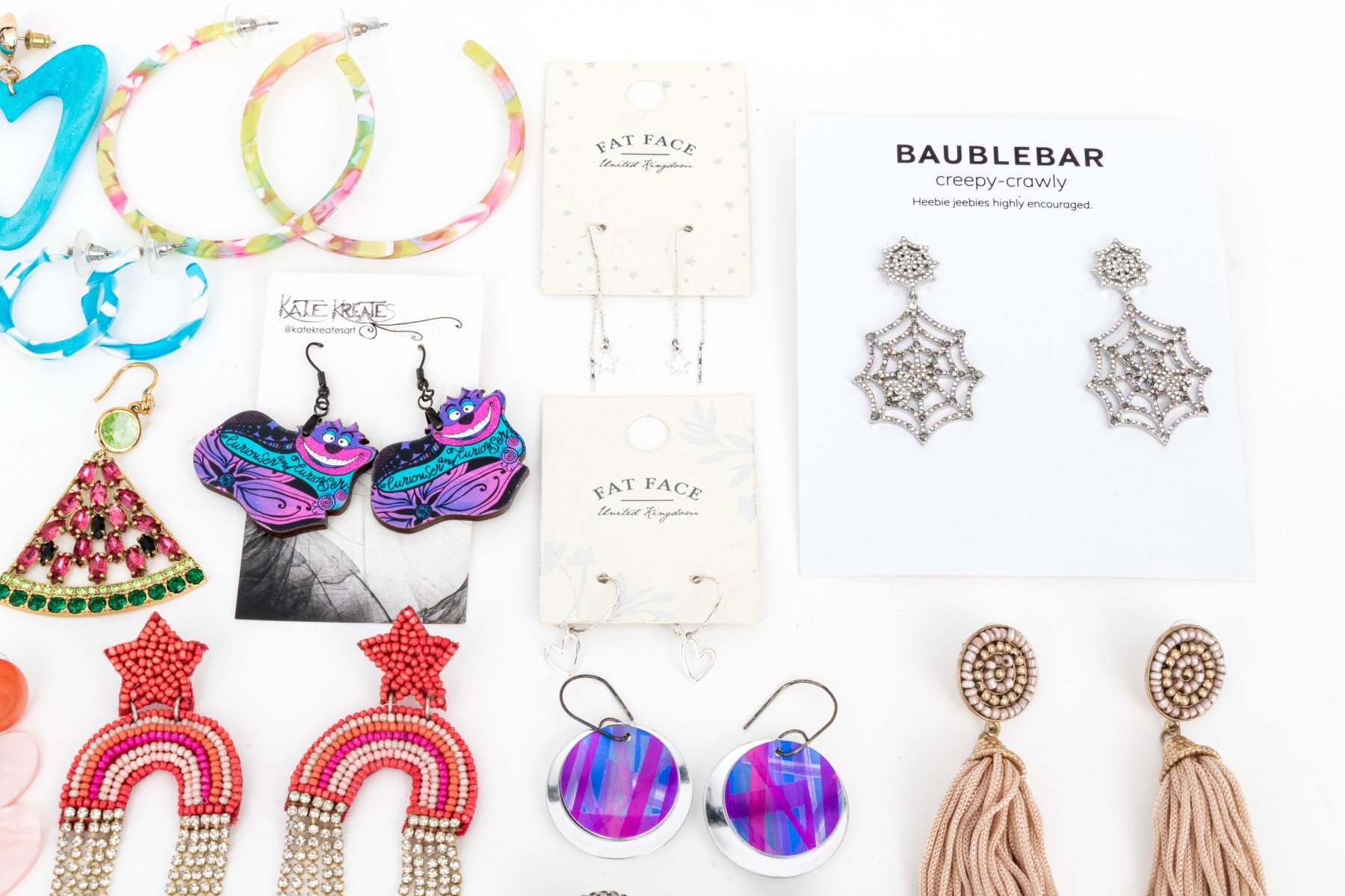 Collection of costume jewelry earrings, ranging from hoop style, drop pendant styles, studs, and button styles, some are new on cards
