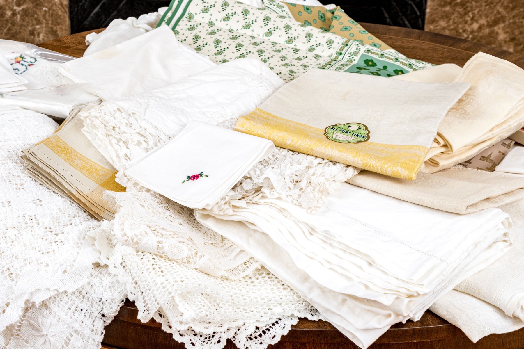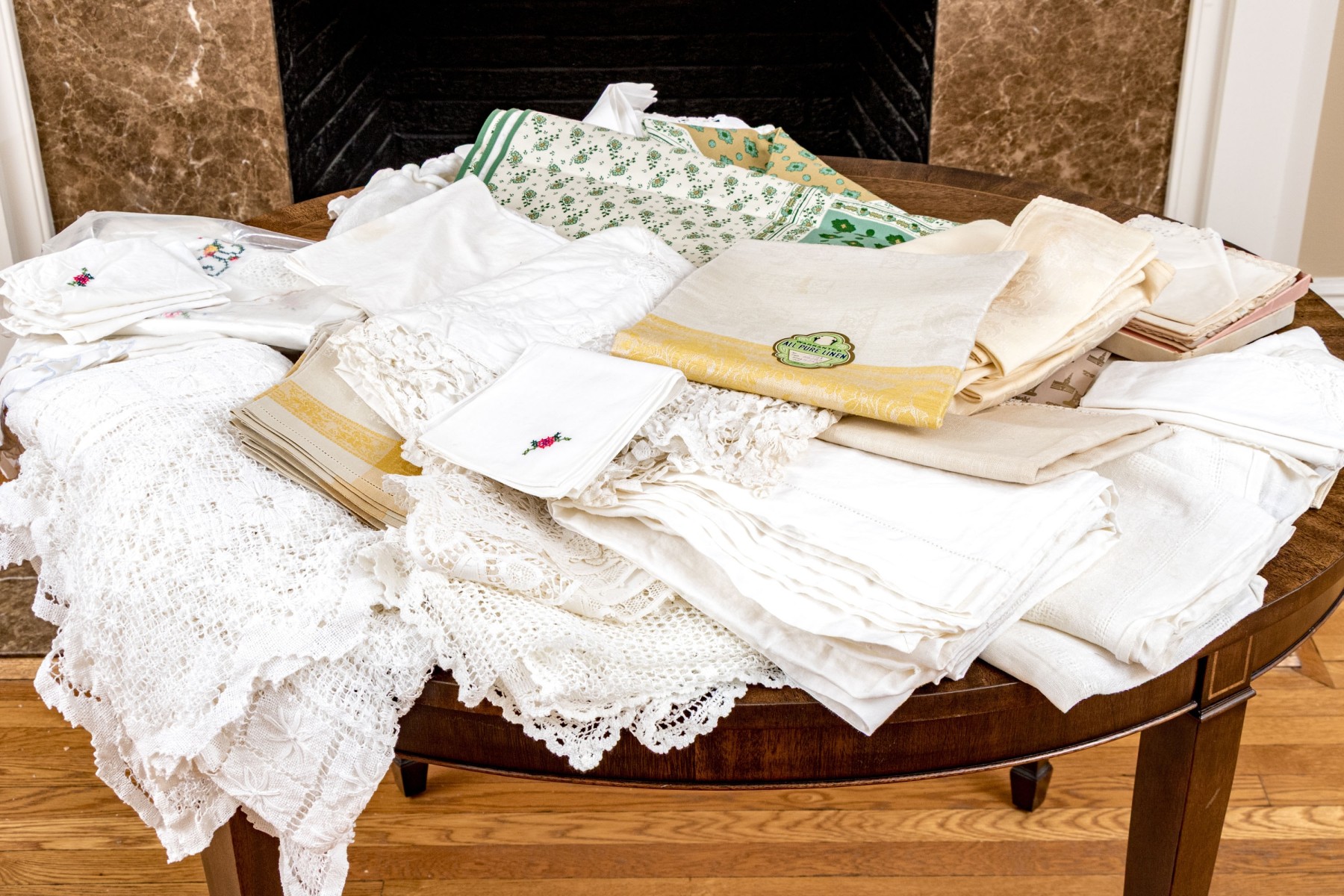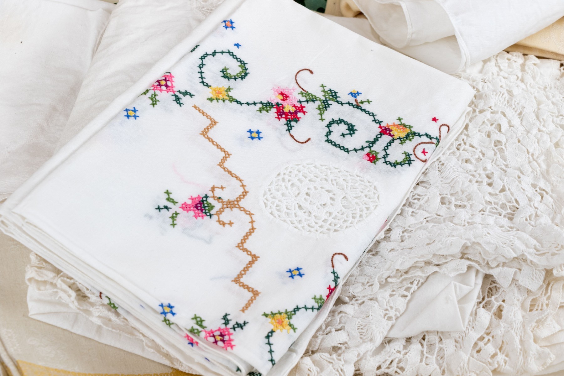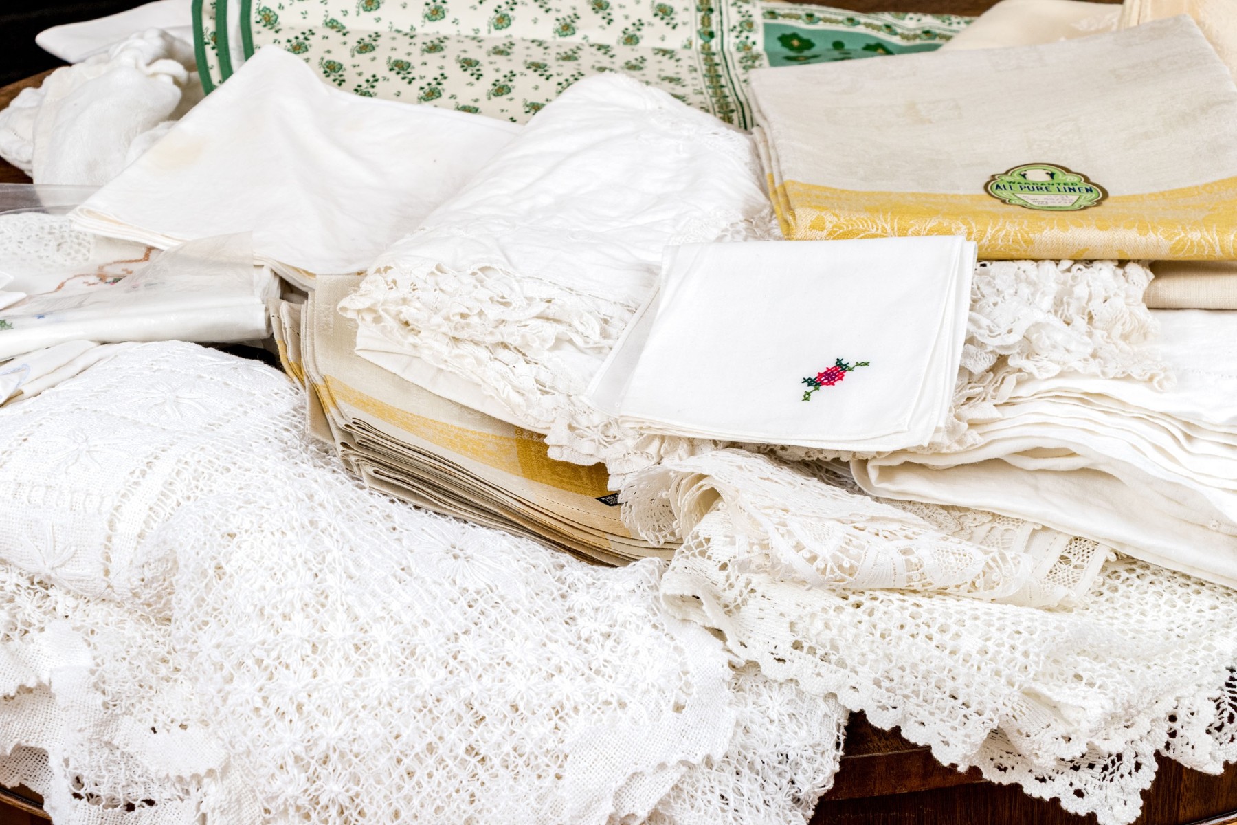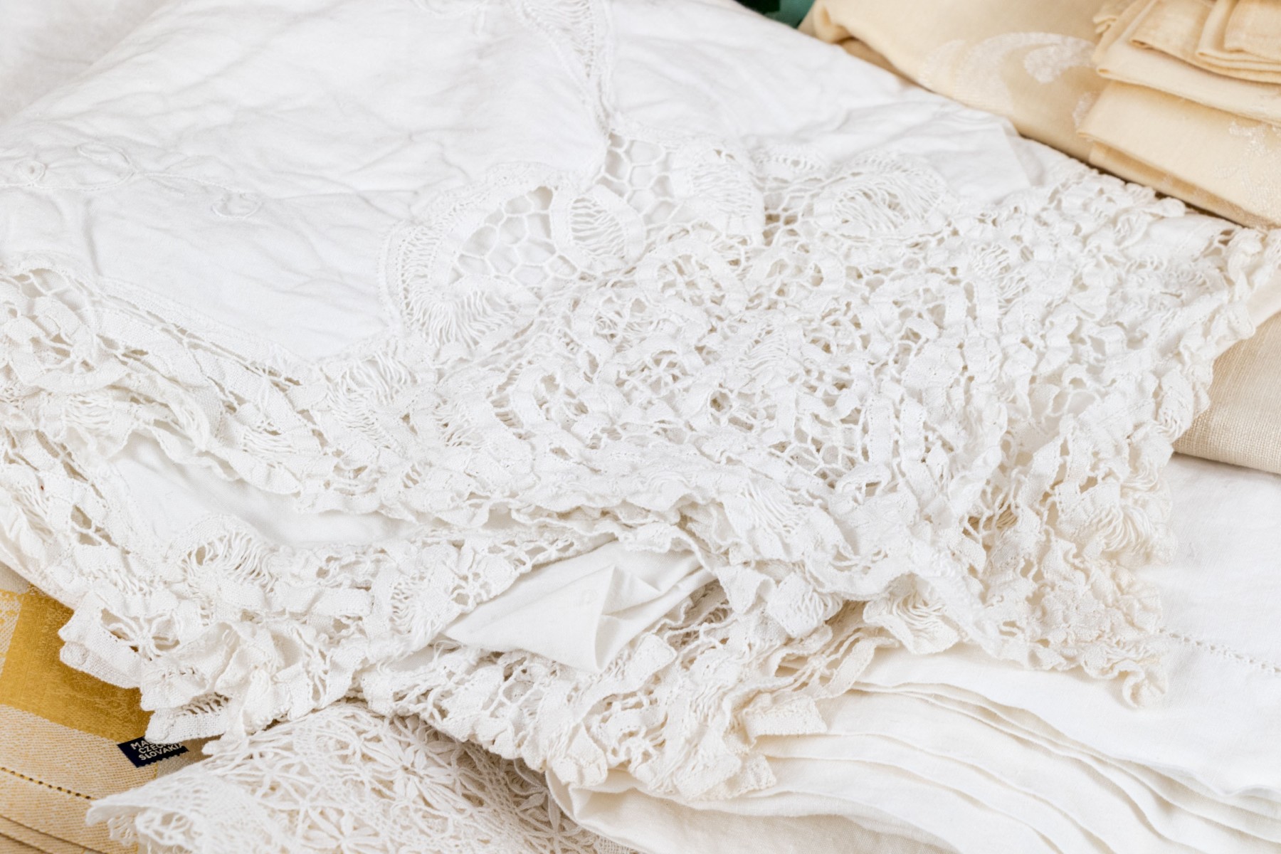 An extensive collection of high quality linens including pieces with lacy designs and vibrant floral patterns.