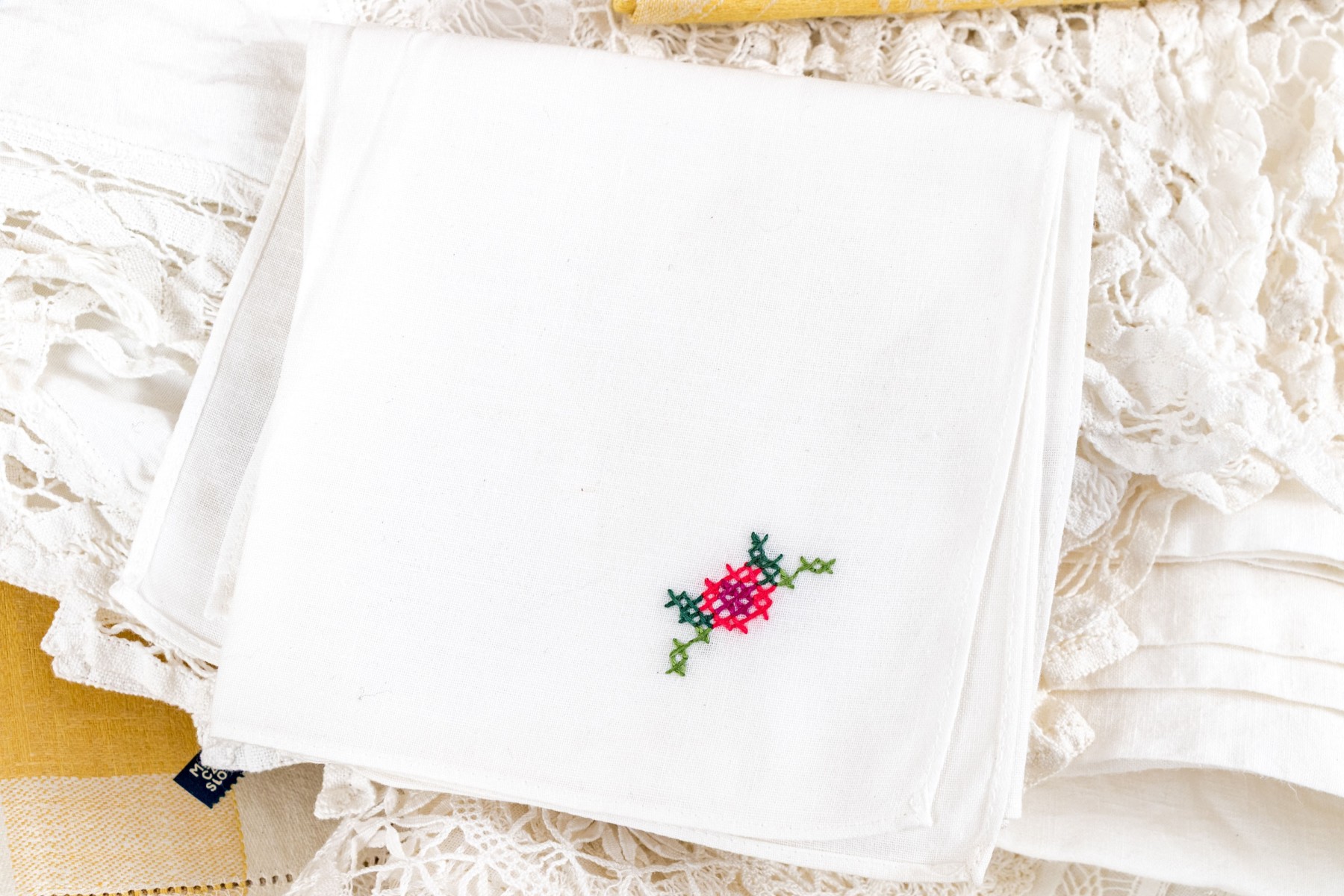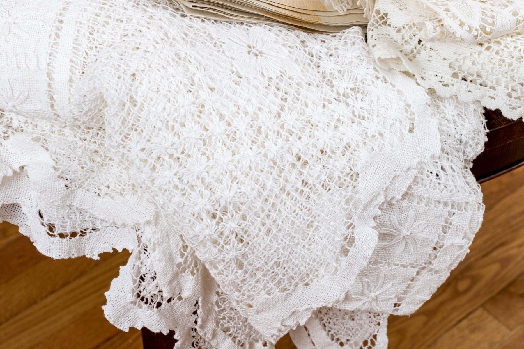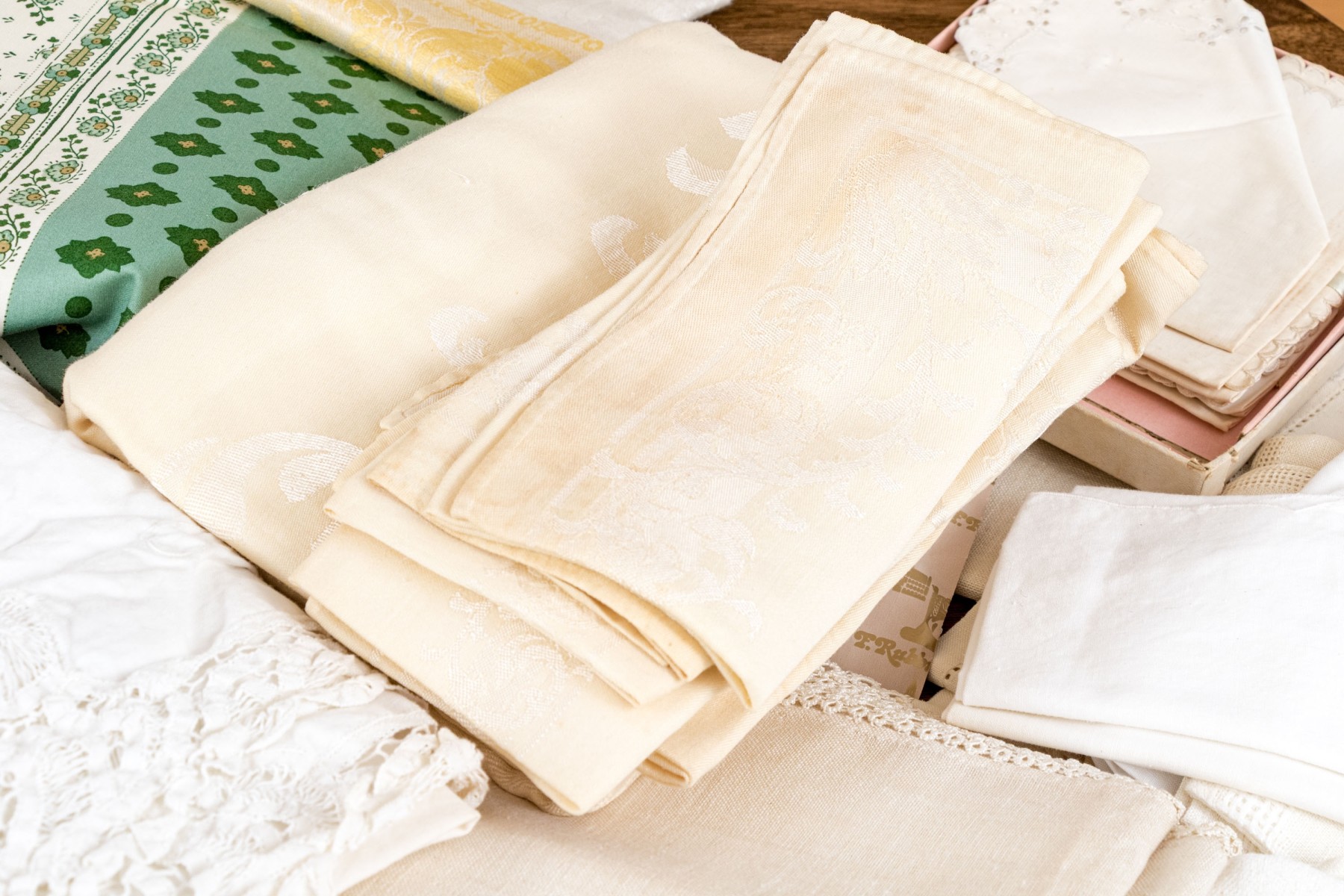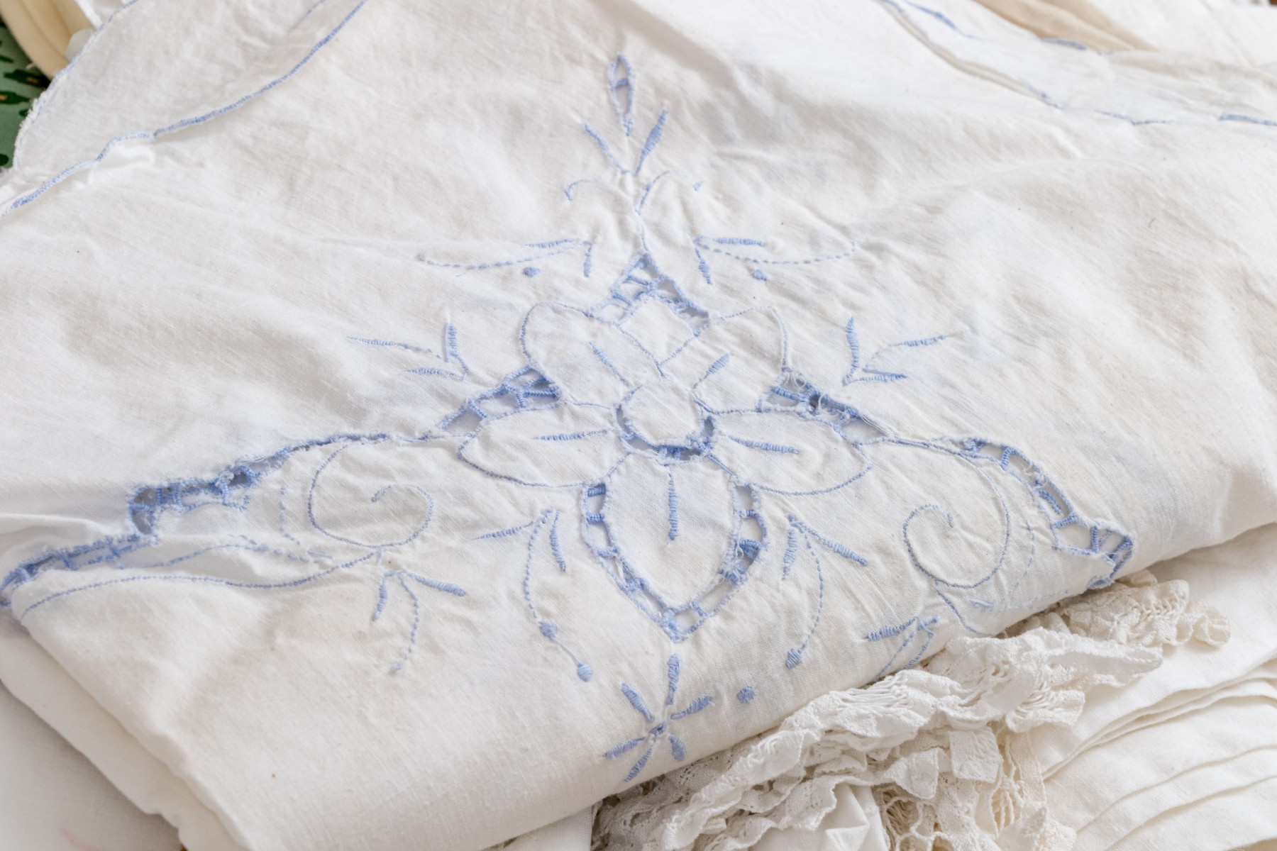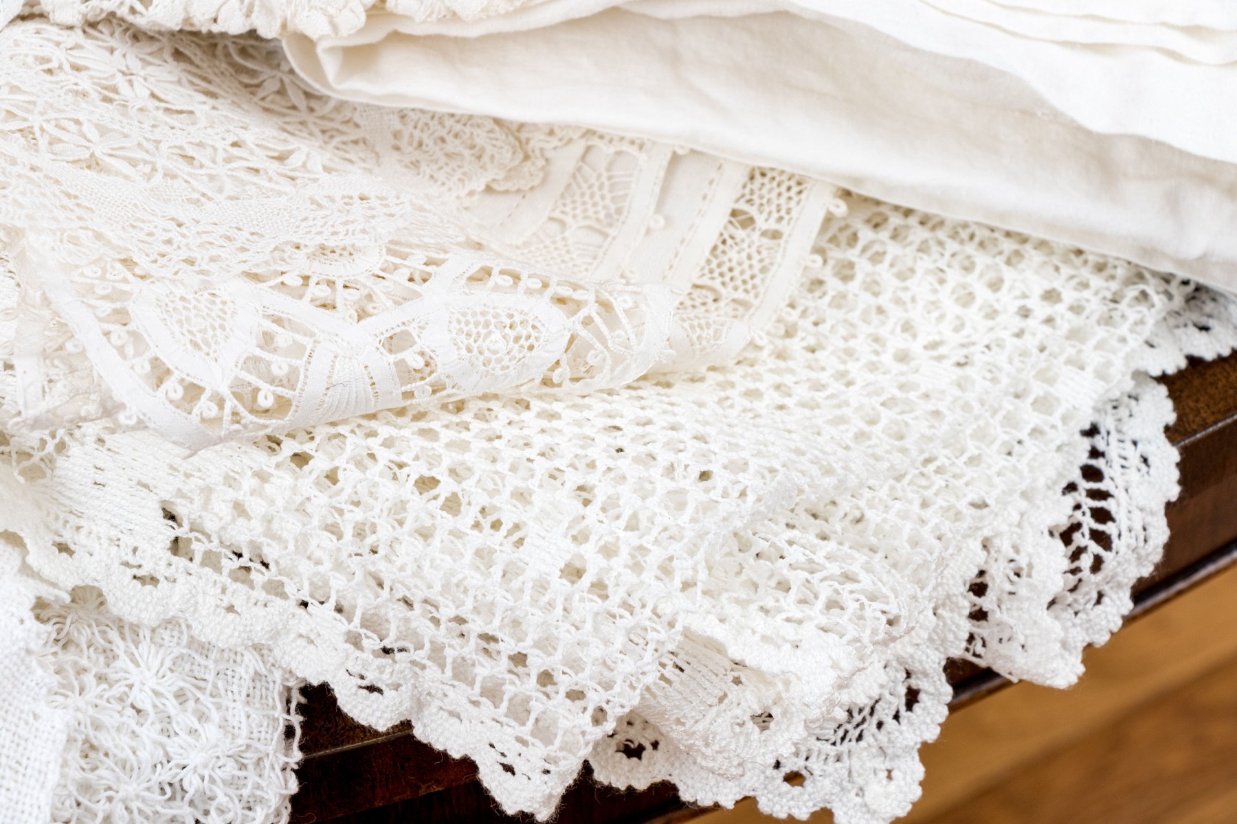 An extensive collection of high quality linens including pieces with lacy designs and vibrant floral patterns.