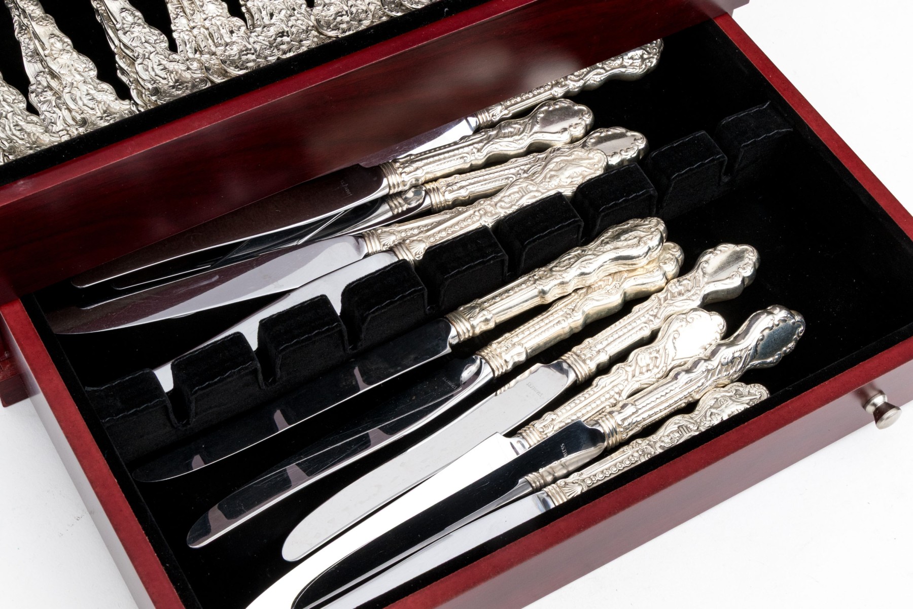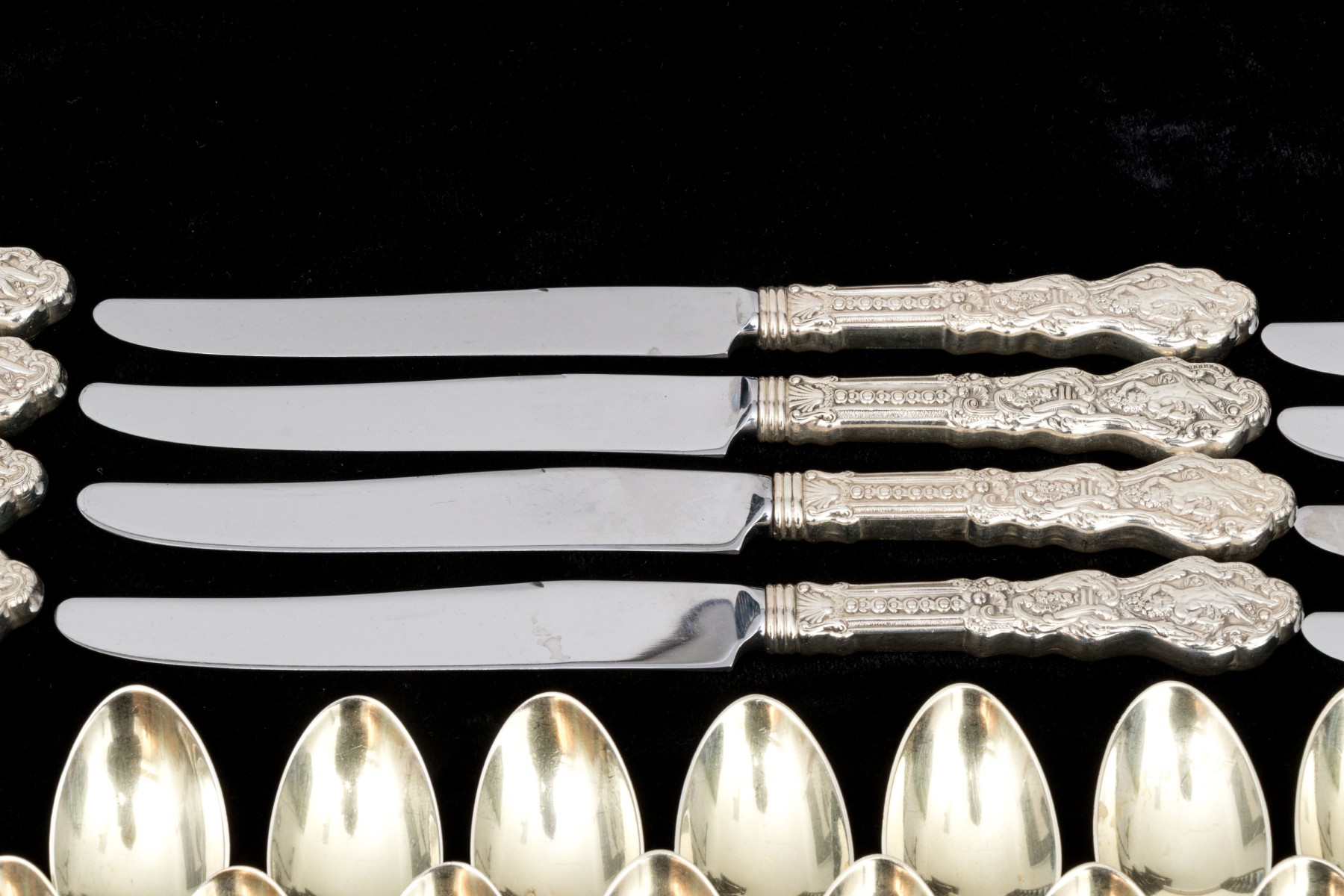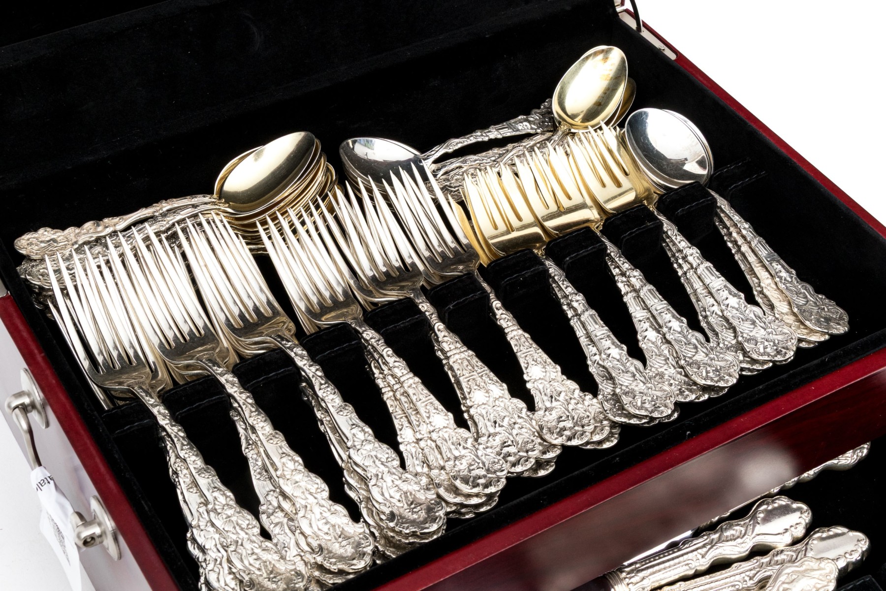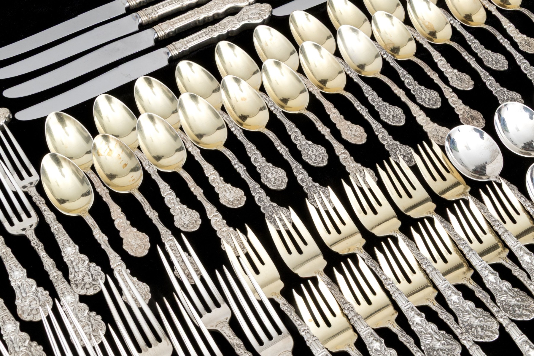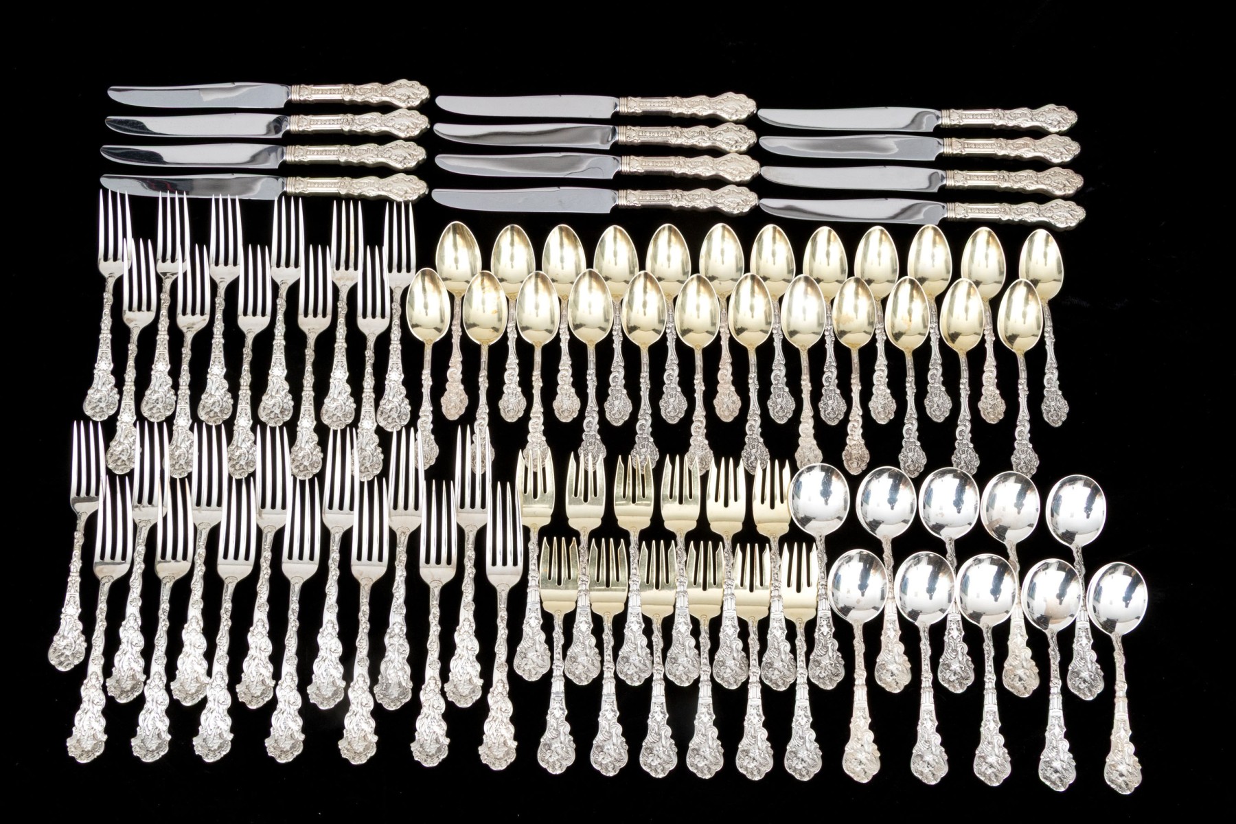 An exquisite set of Gorham "Versailles" sterling silver flatware with multi-motif patterns detailed by figural and foliate designs derived from the palace decorations.