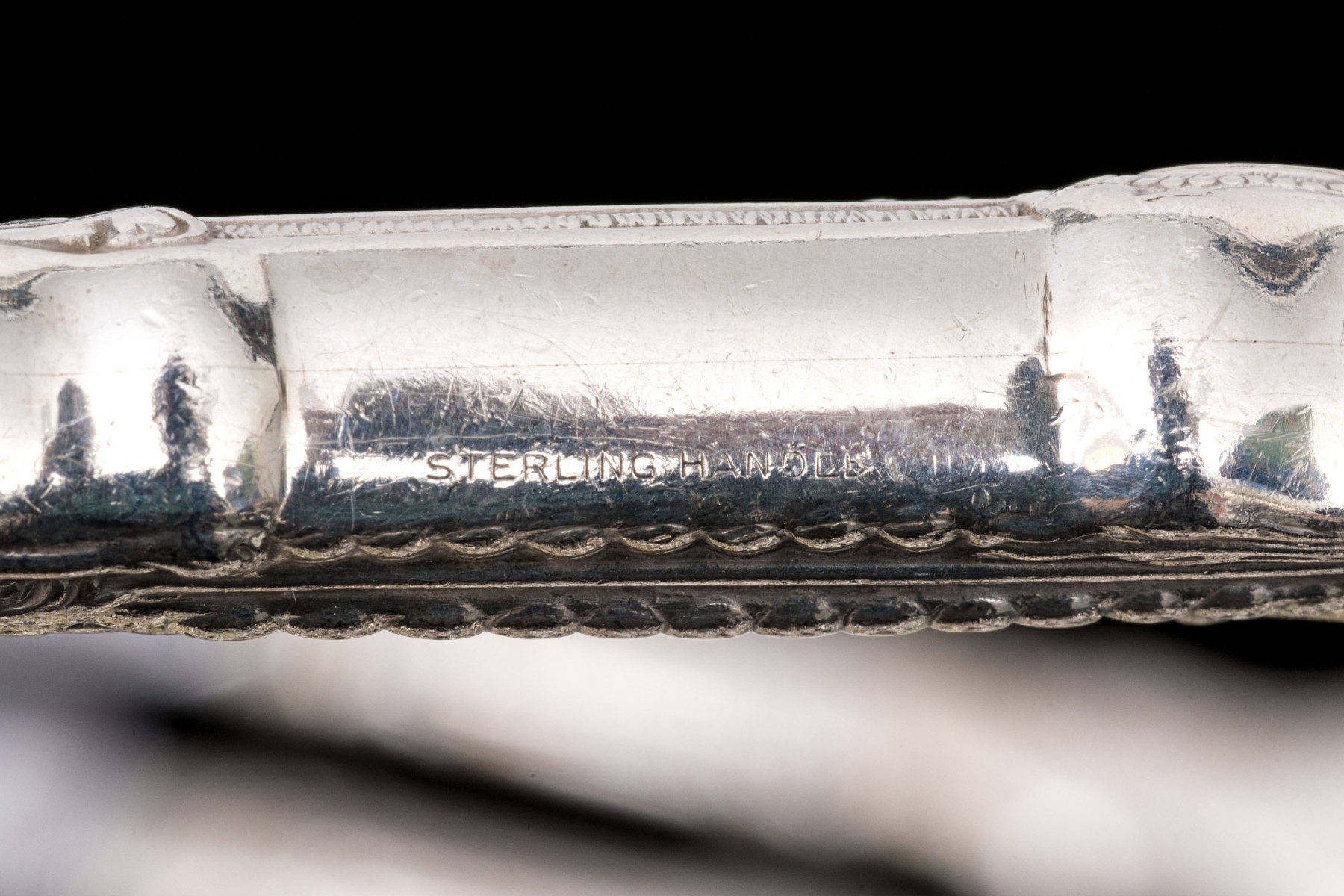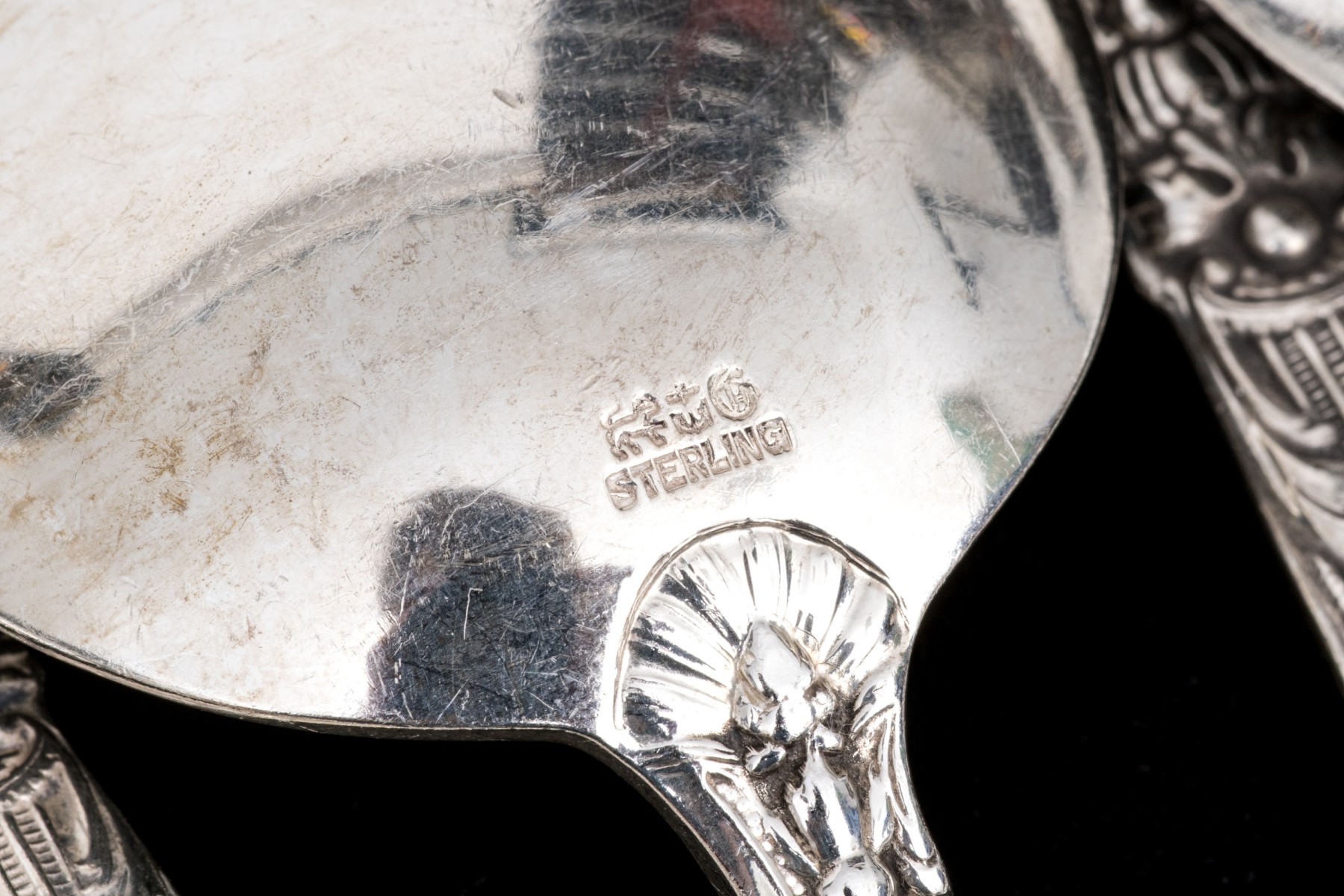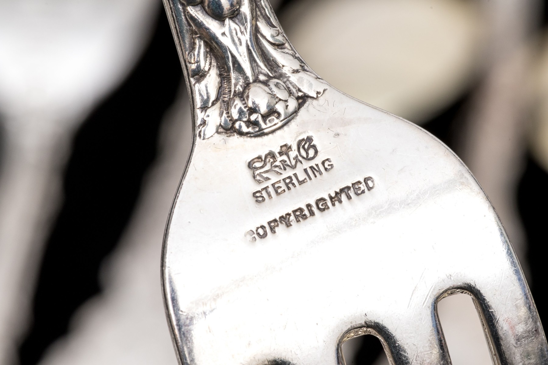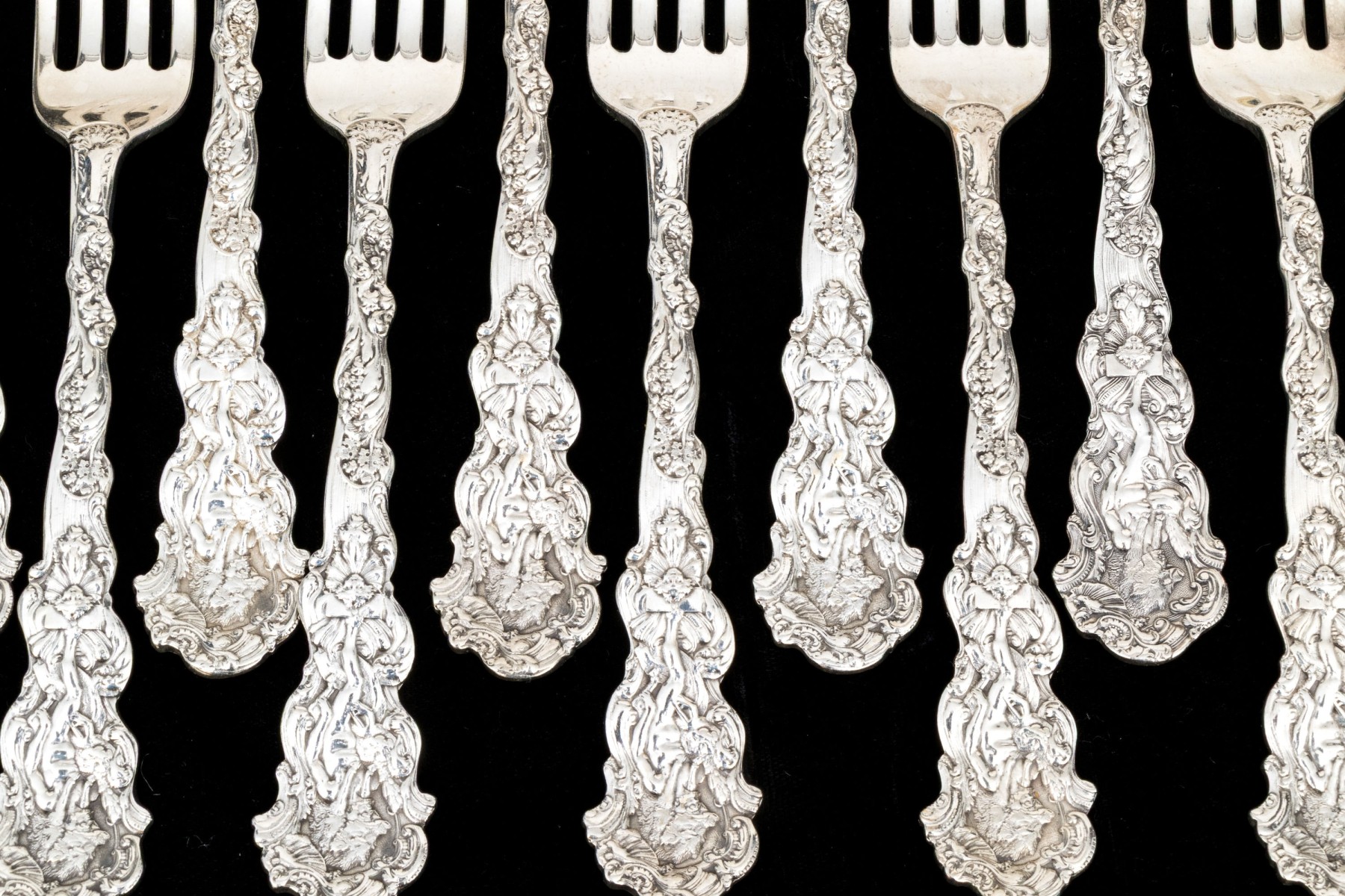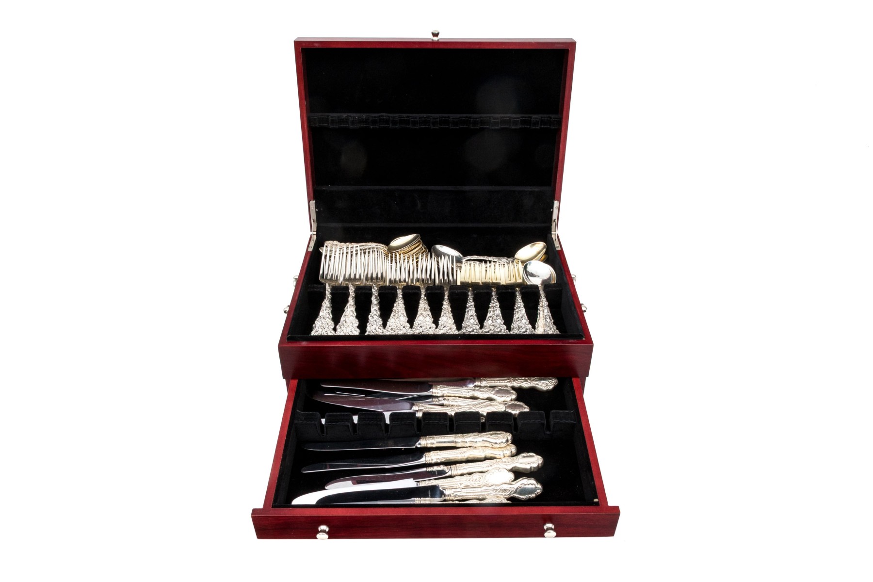 An exquisite set of Gorham "Versailles" sterling silver flatware with multi-motif patterns detailed by figural and foliate designs derived from the palace decorations.