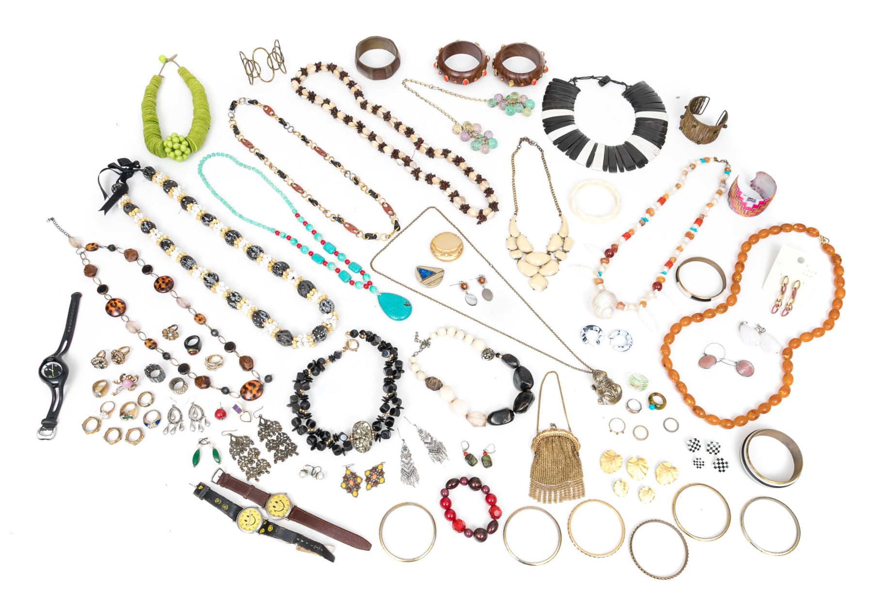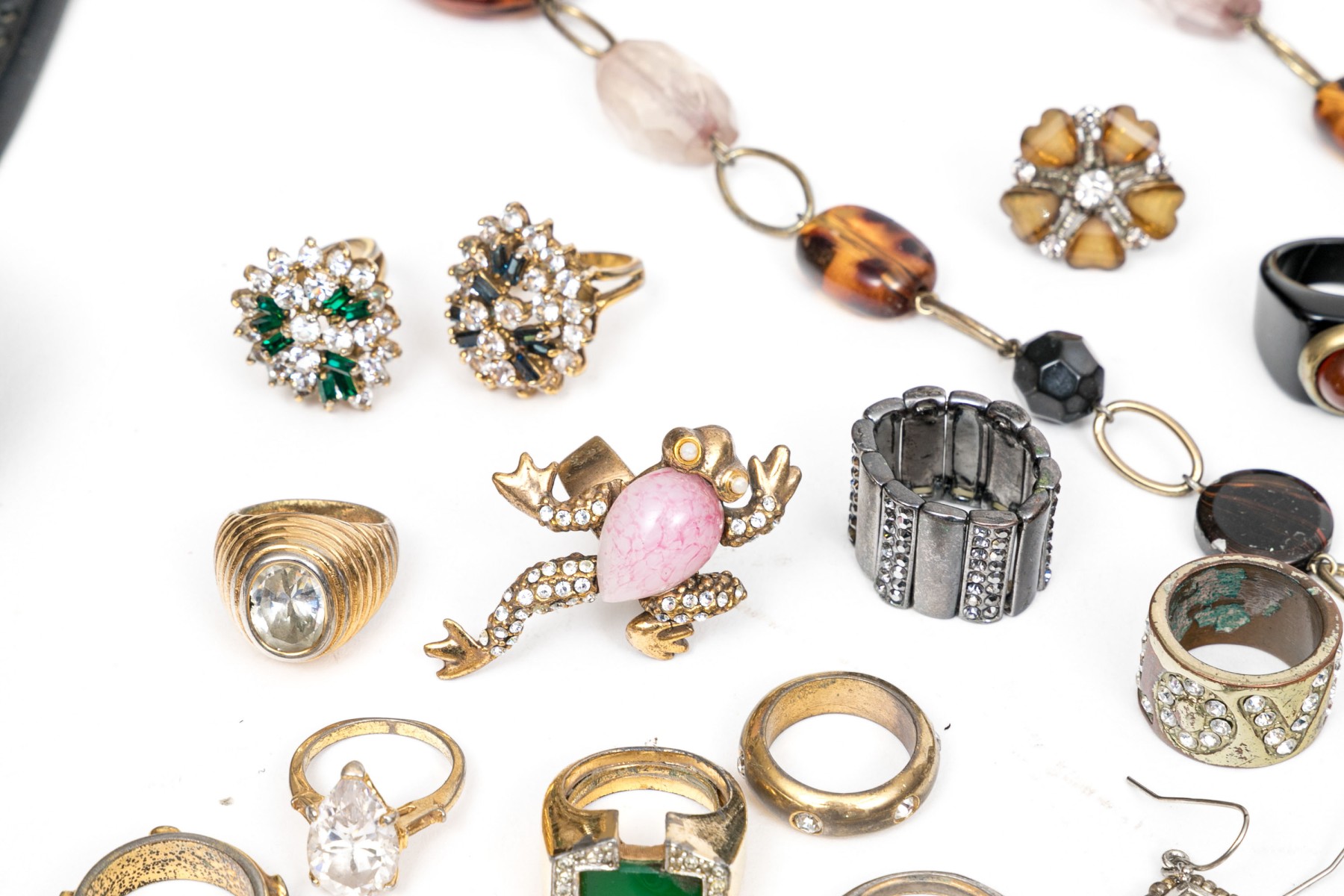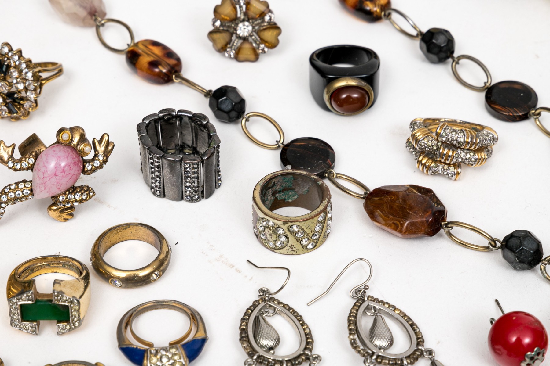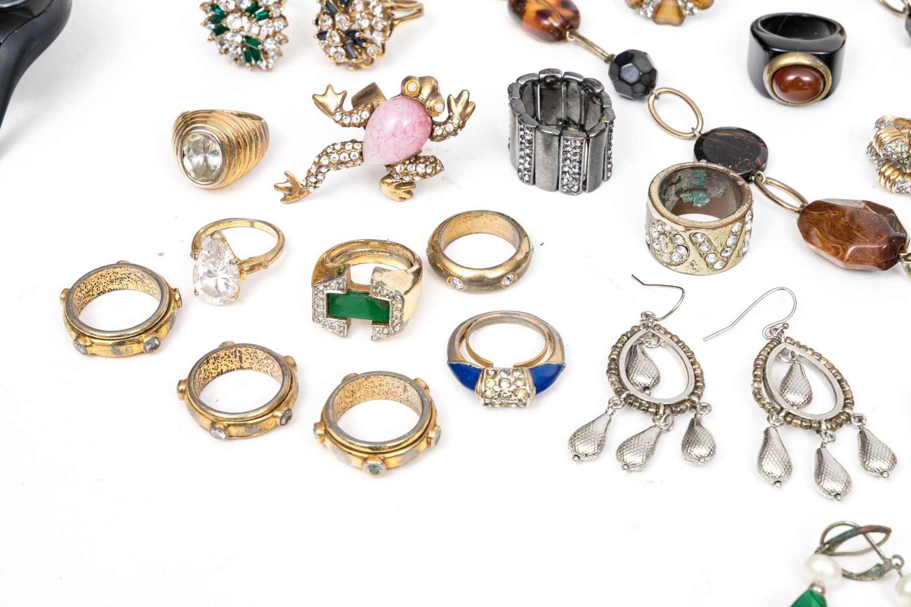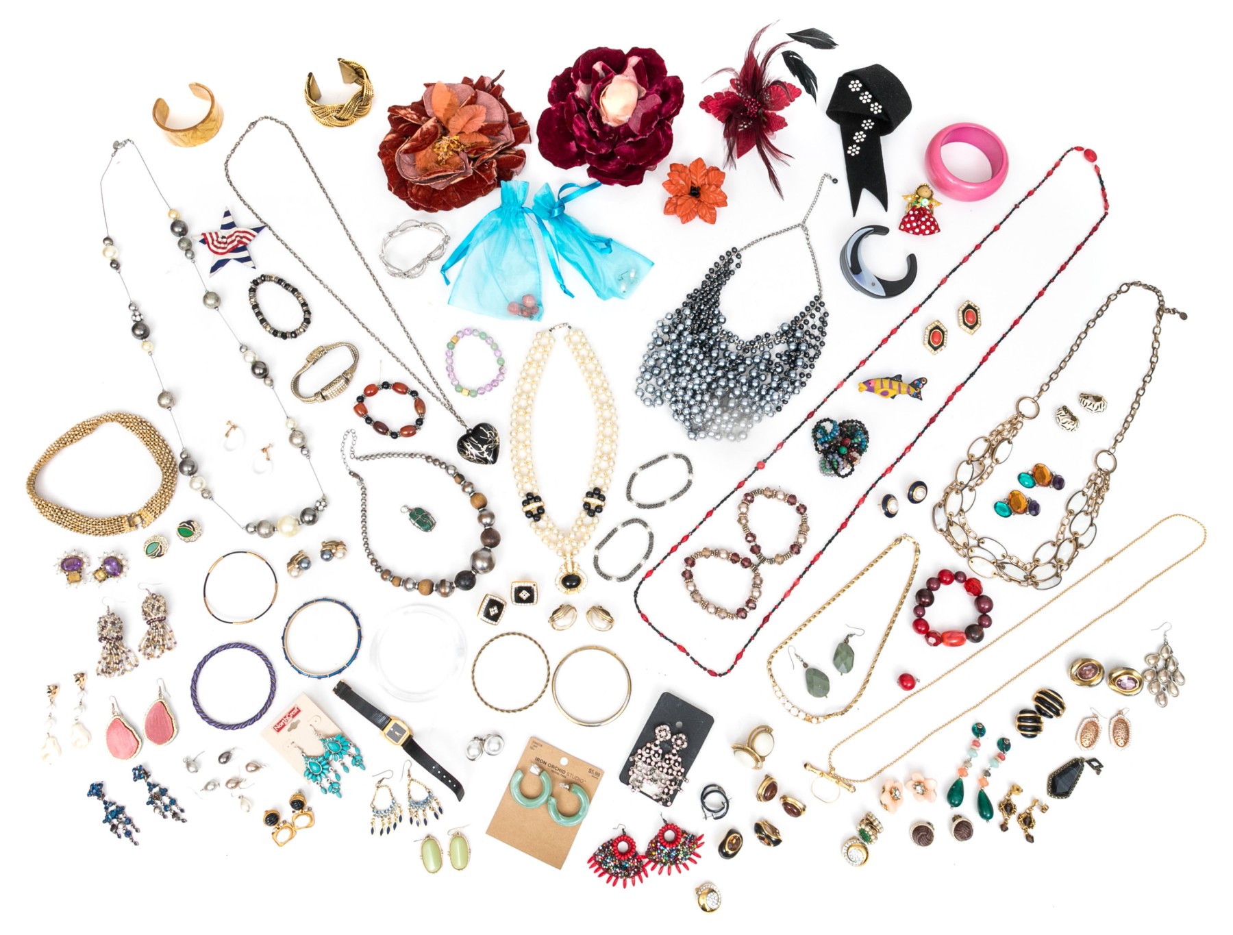 Very large collection of fashion jewelry. Contains bracelets, necklaces, rings, earrings and brooches.