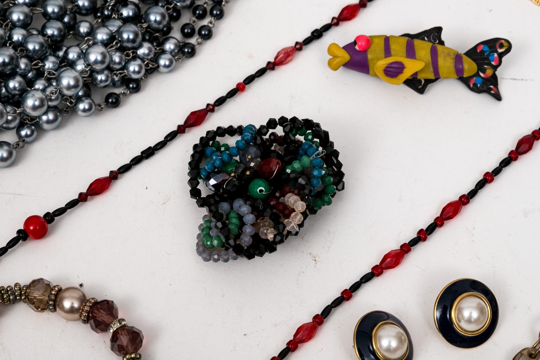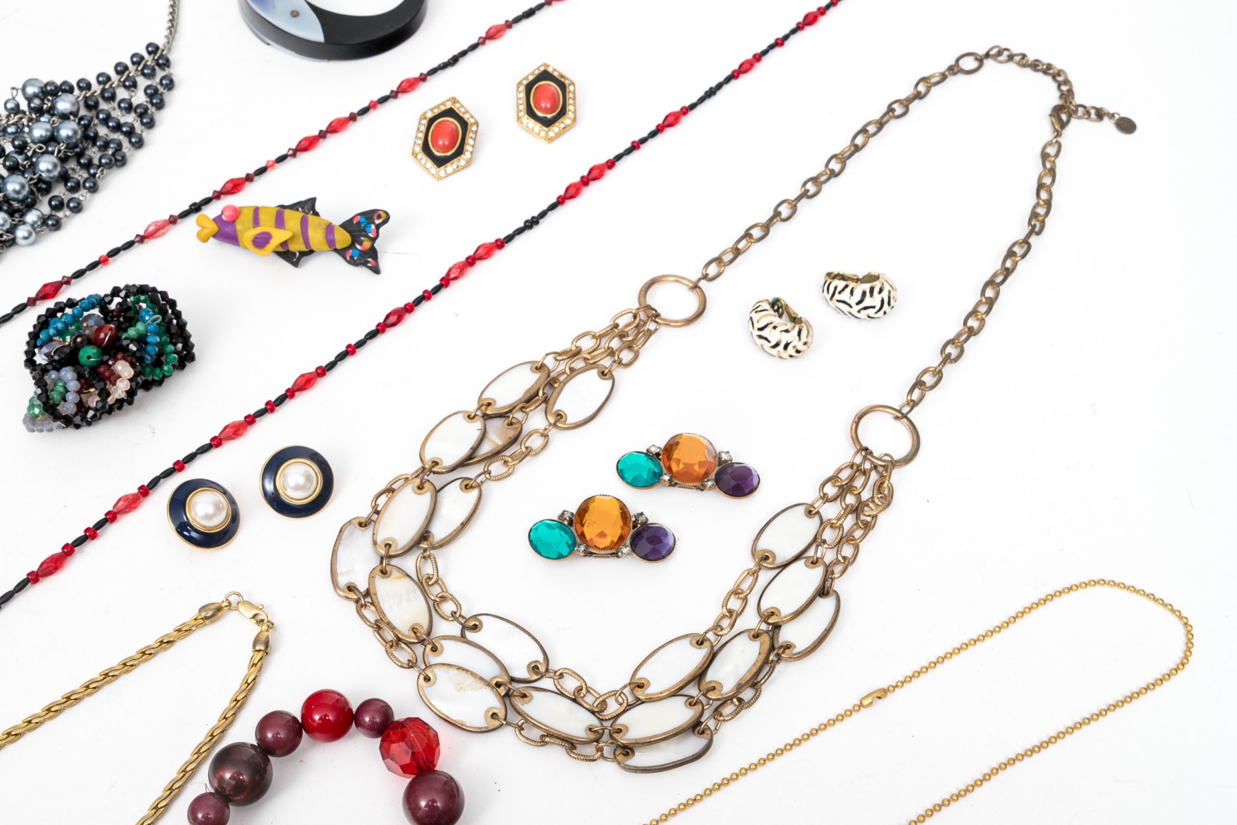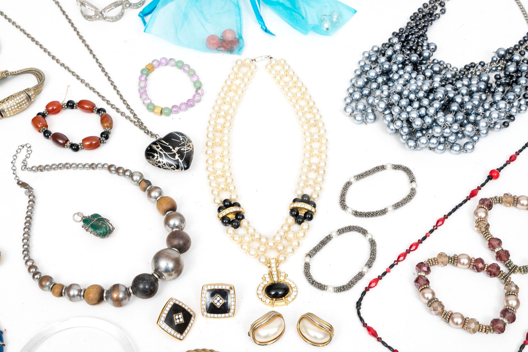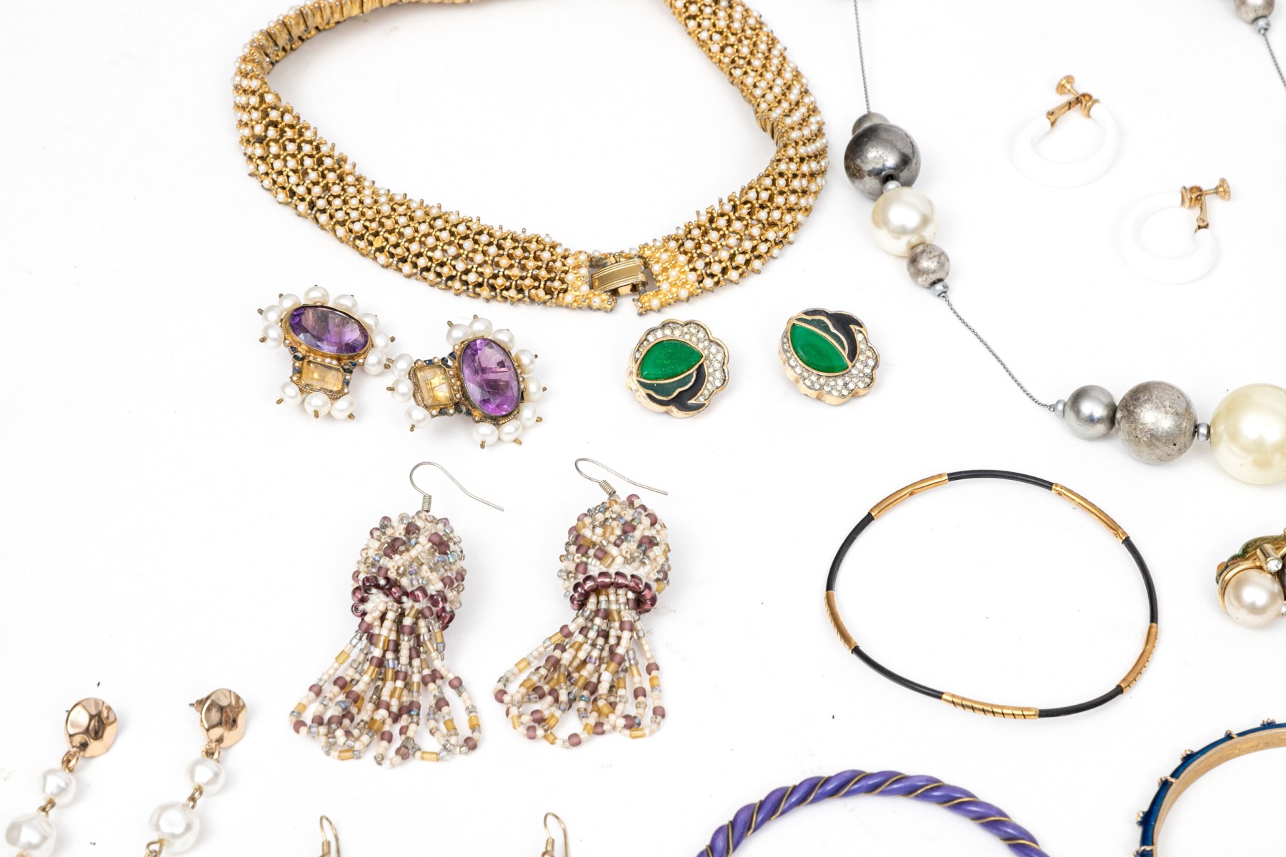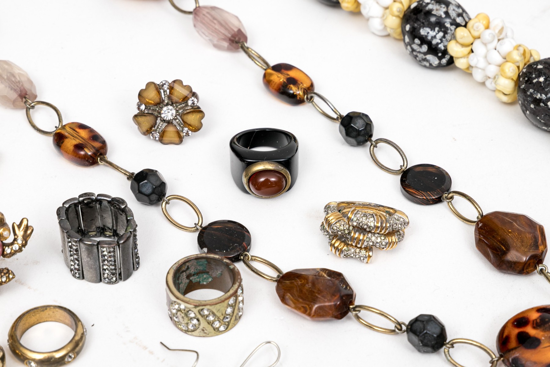 Very large collection of fashion jewelry. Contains bracelets, necklaces, rings, earrings and brooches.