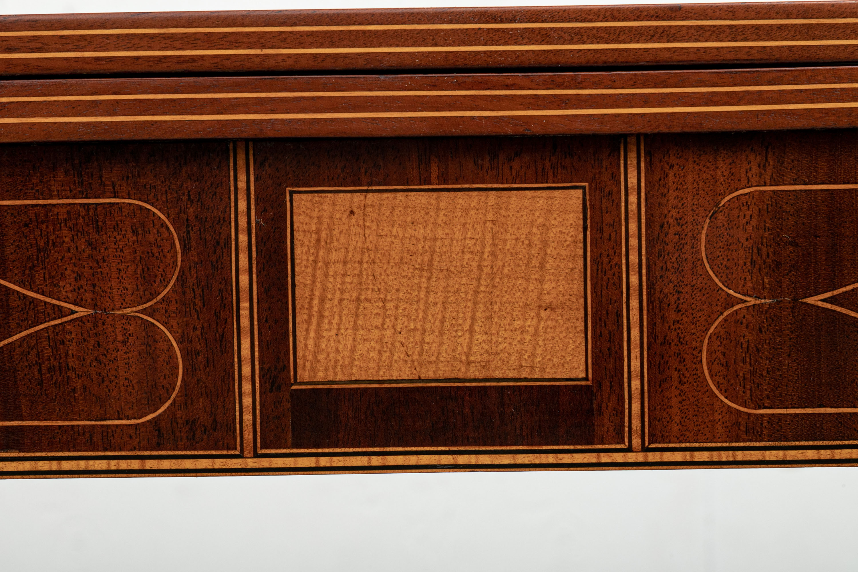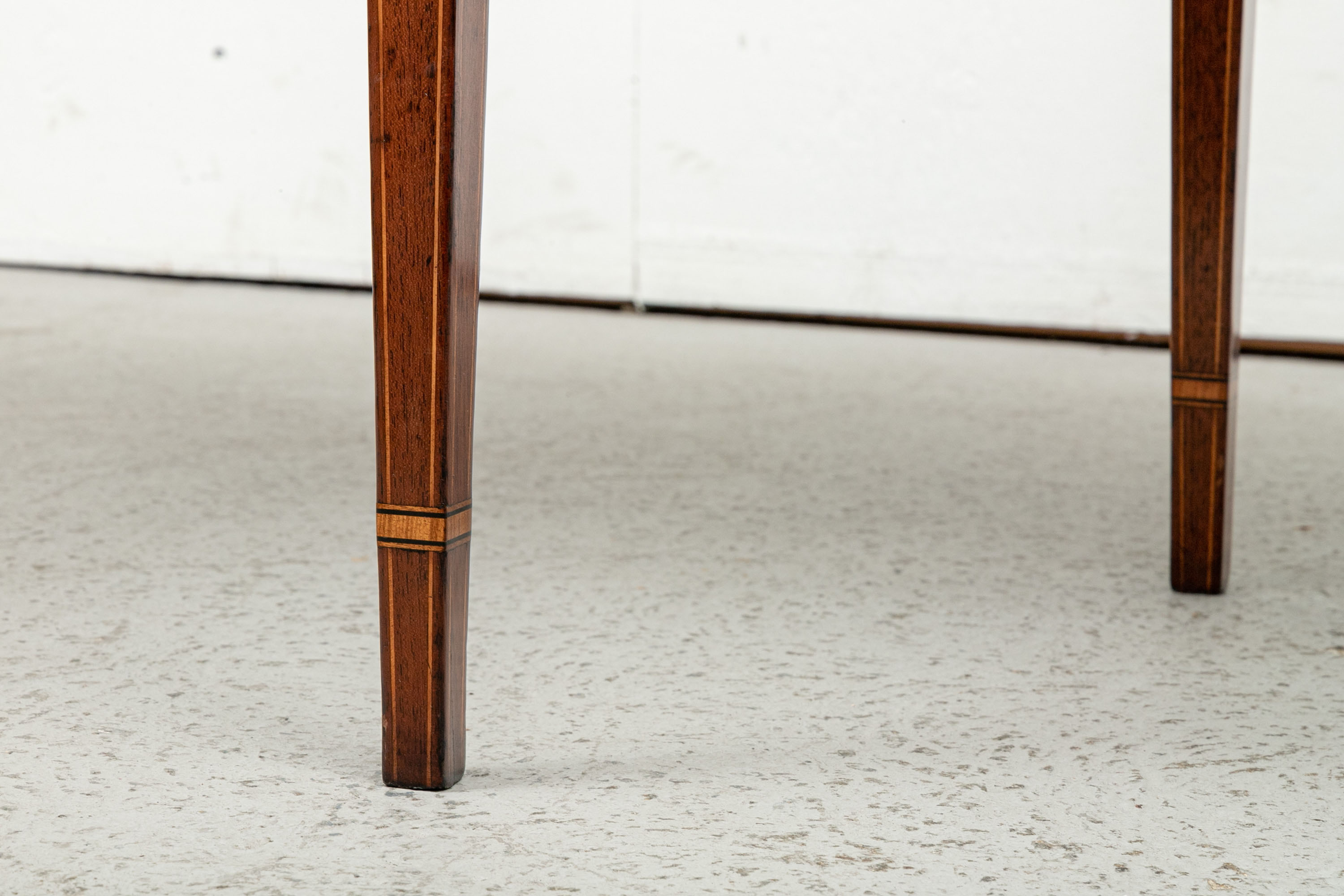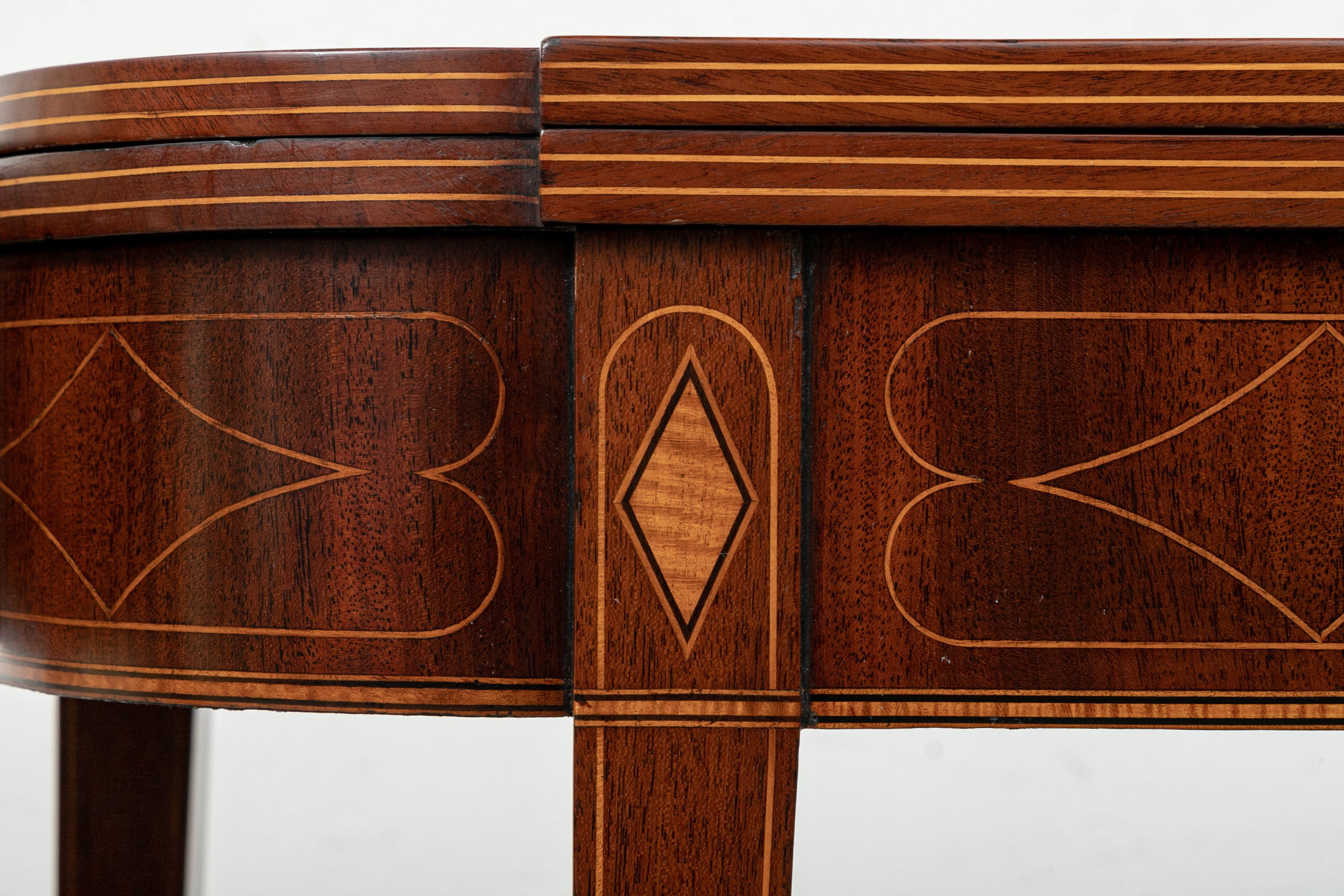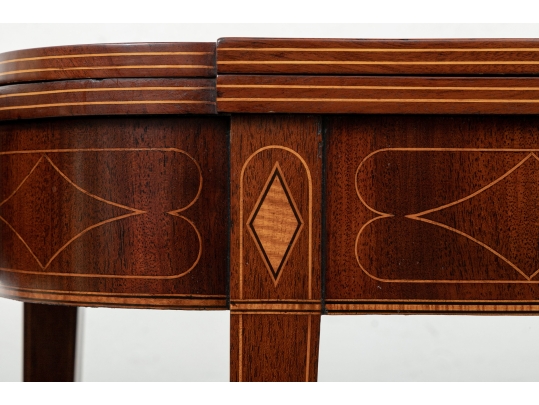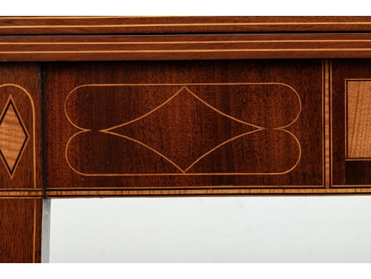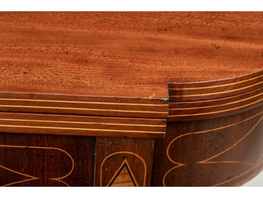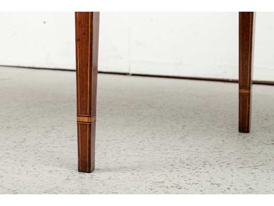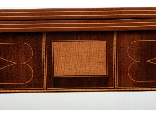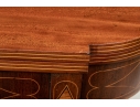 Exquisite construction with D shaped tops and fine string inlays on the apron panels and Curly Maple inlaid panels in the center and diamond shapes on the tops of the legs. Raised on square tapering legs with string inlays.