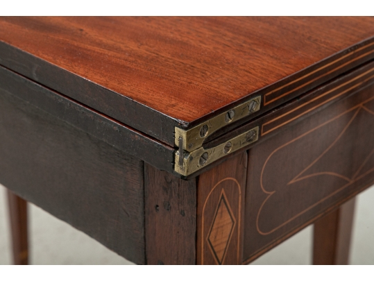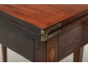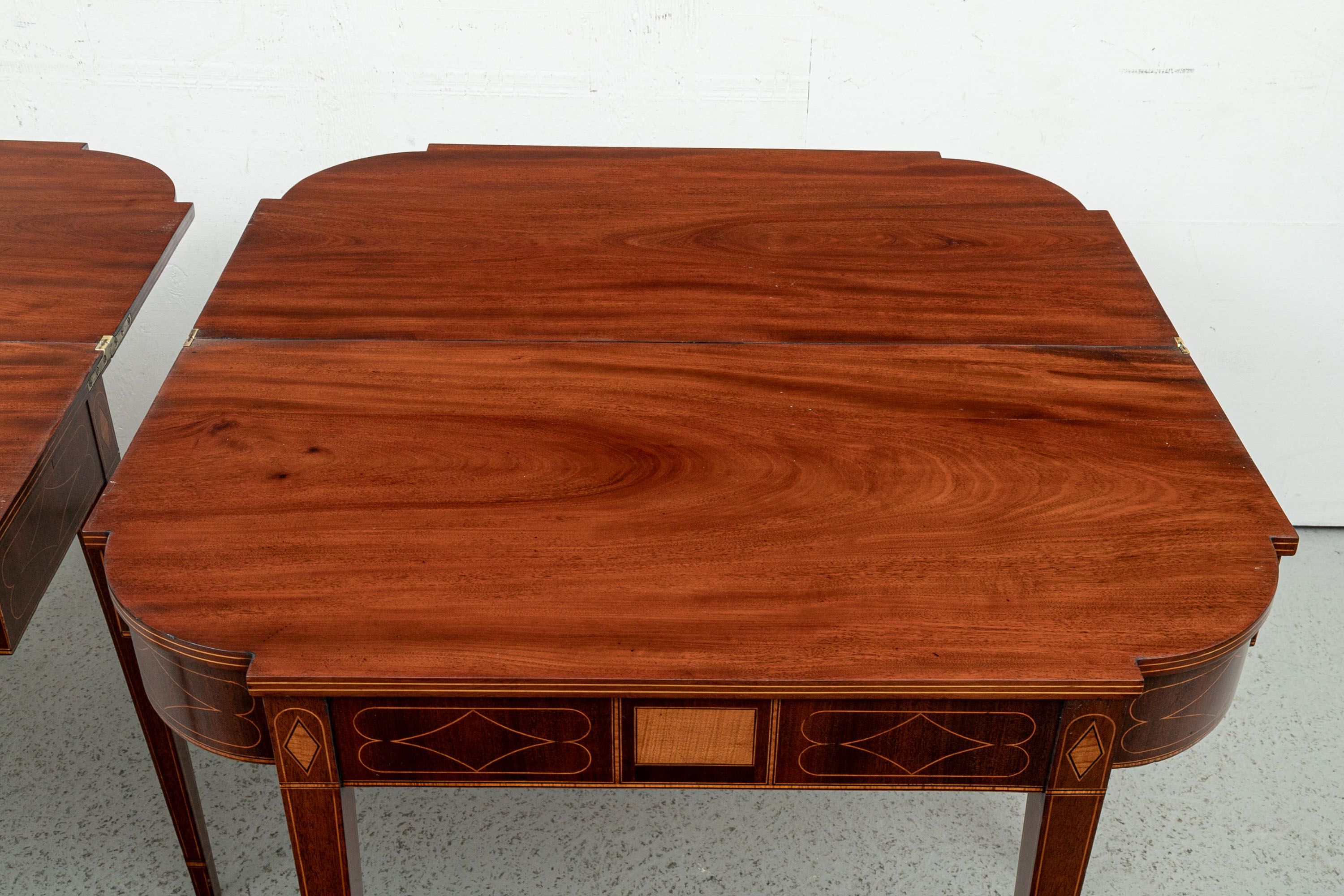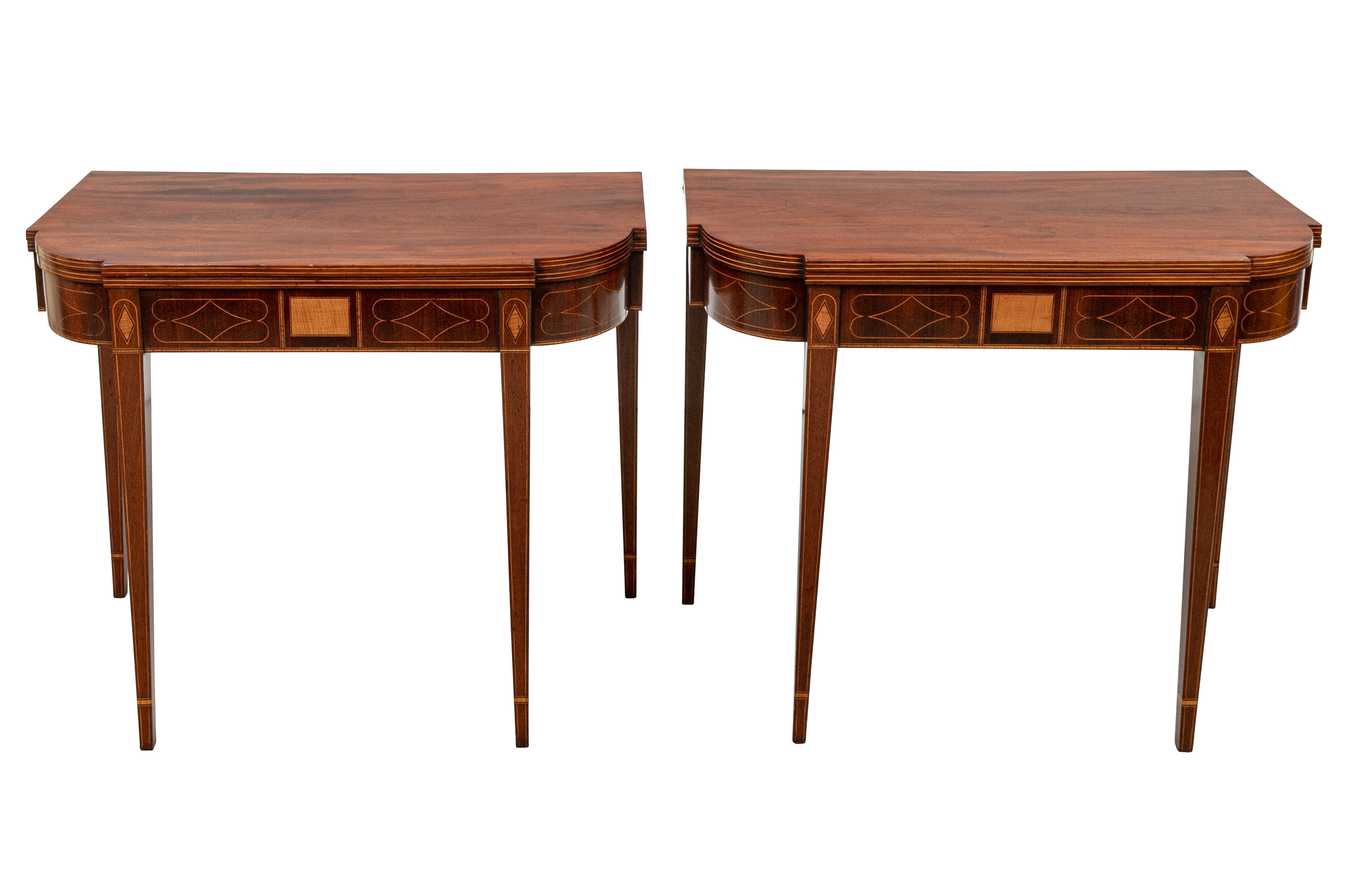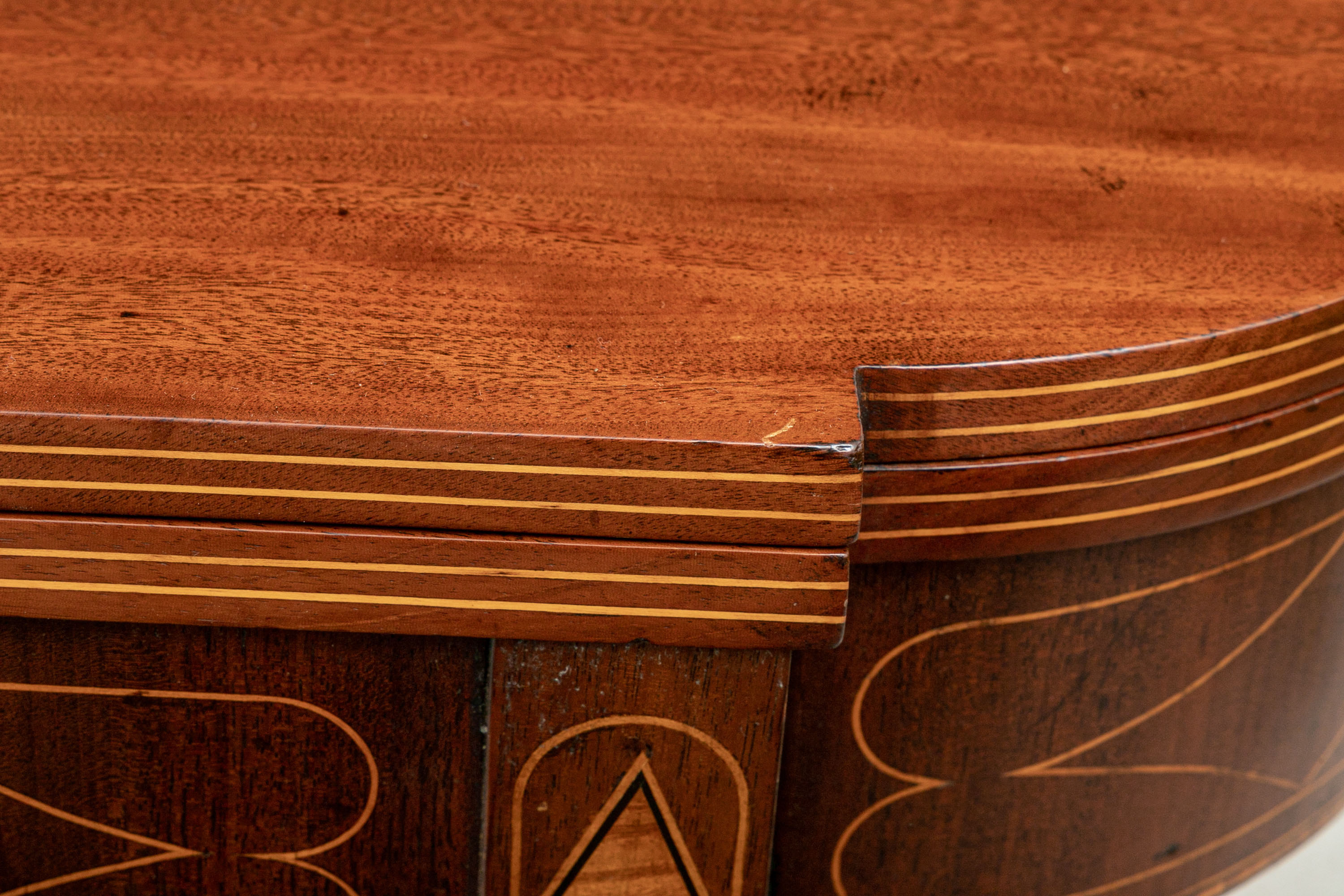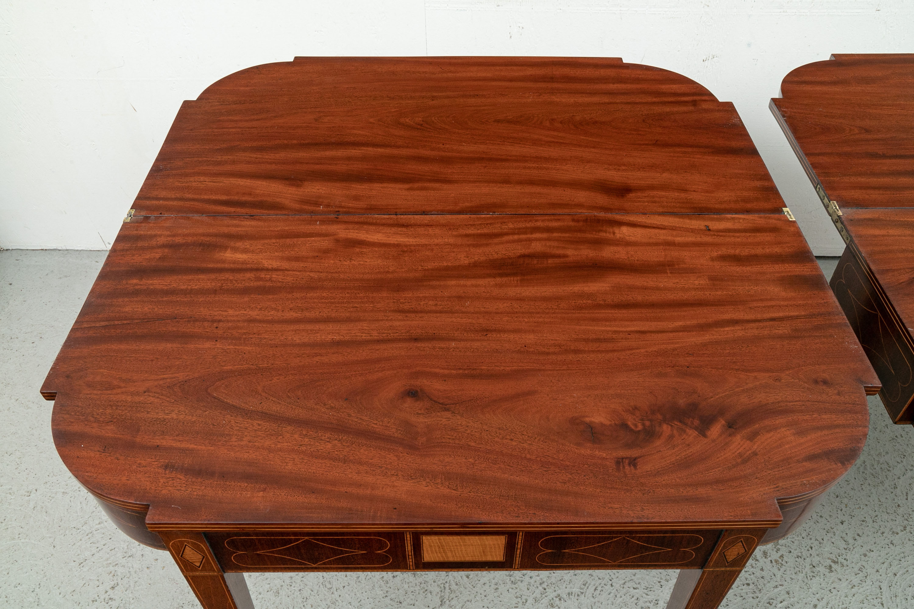 Exquisite construction with D shaped tops and fine string inlays on the apron panels and Curly Maple inlaid panels in the center and diamond shapes on the tops of the legs. Raised on square tapering legs with string inlays.
