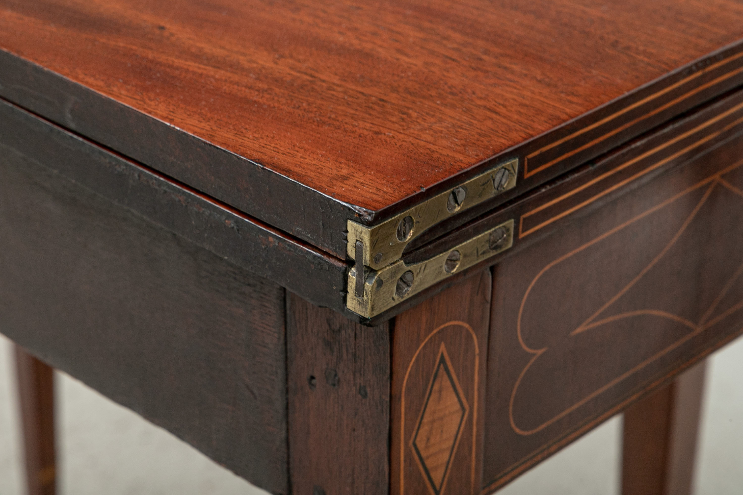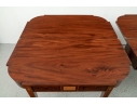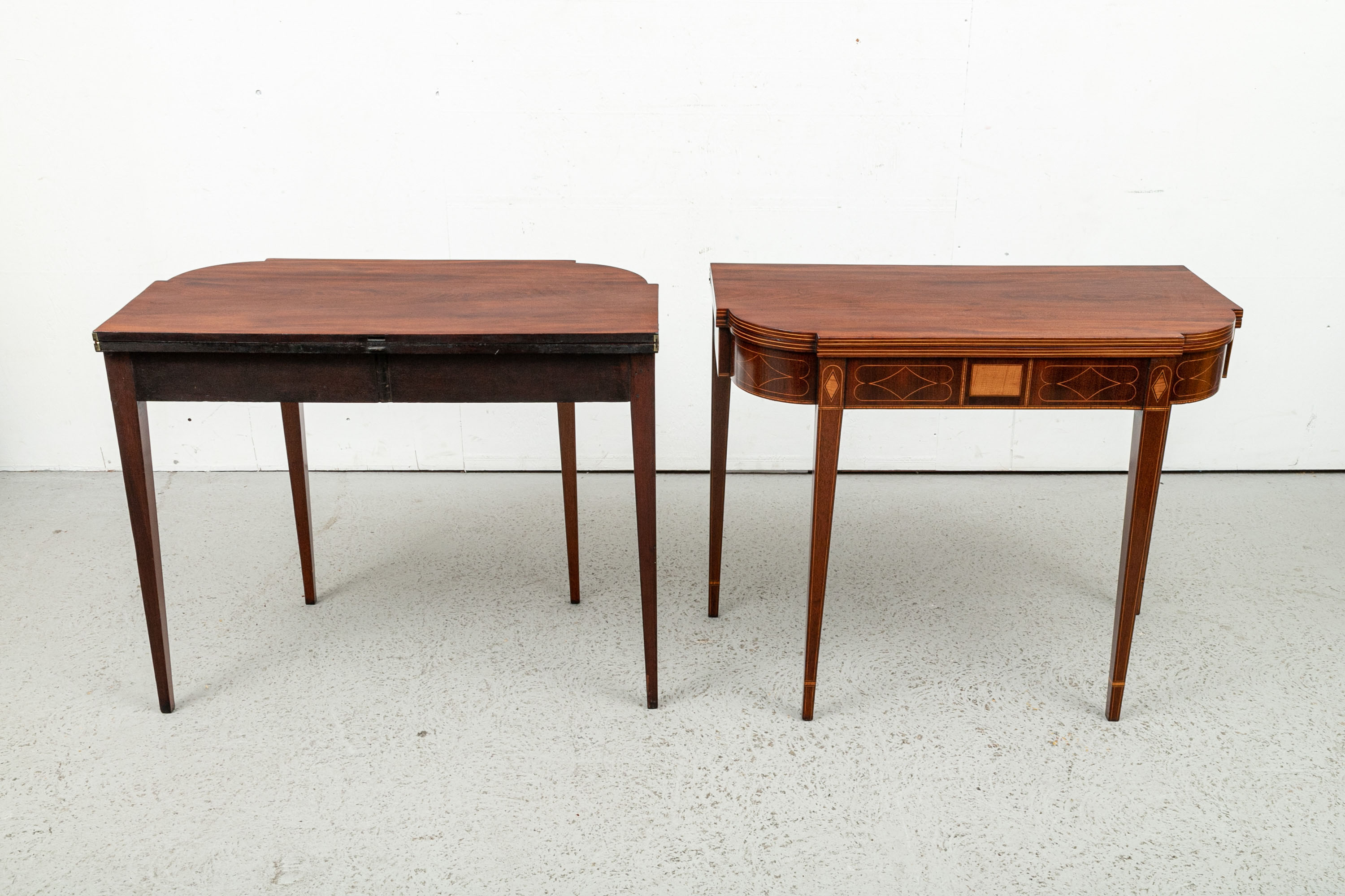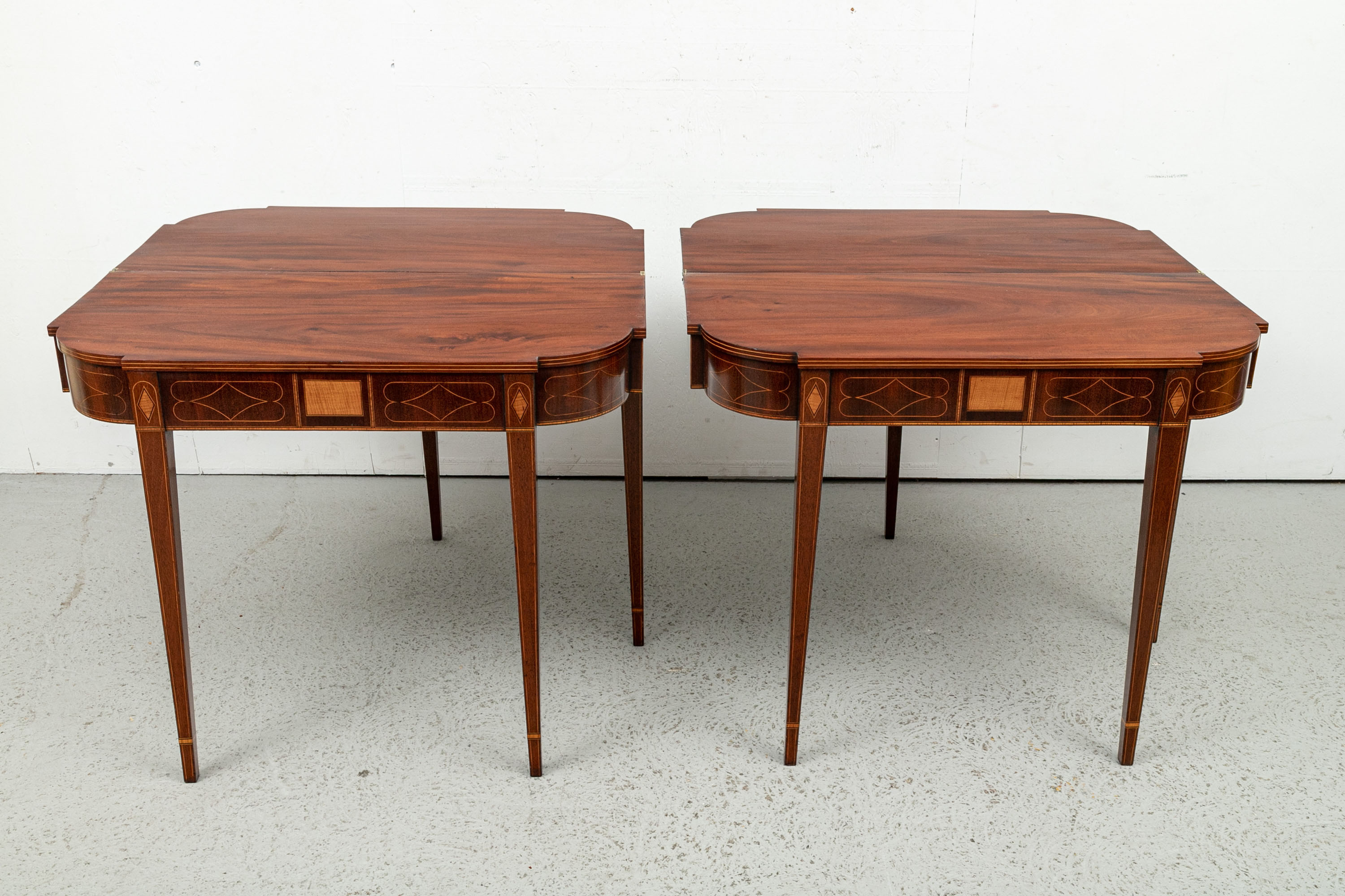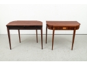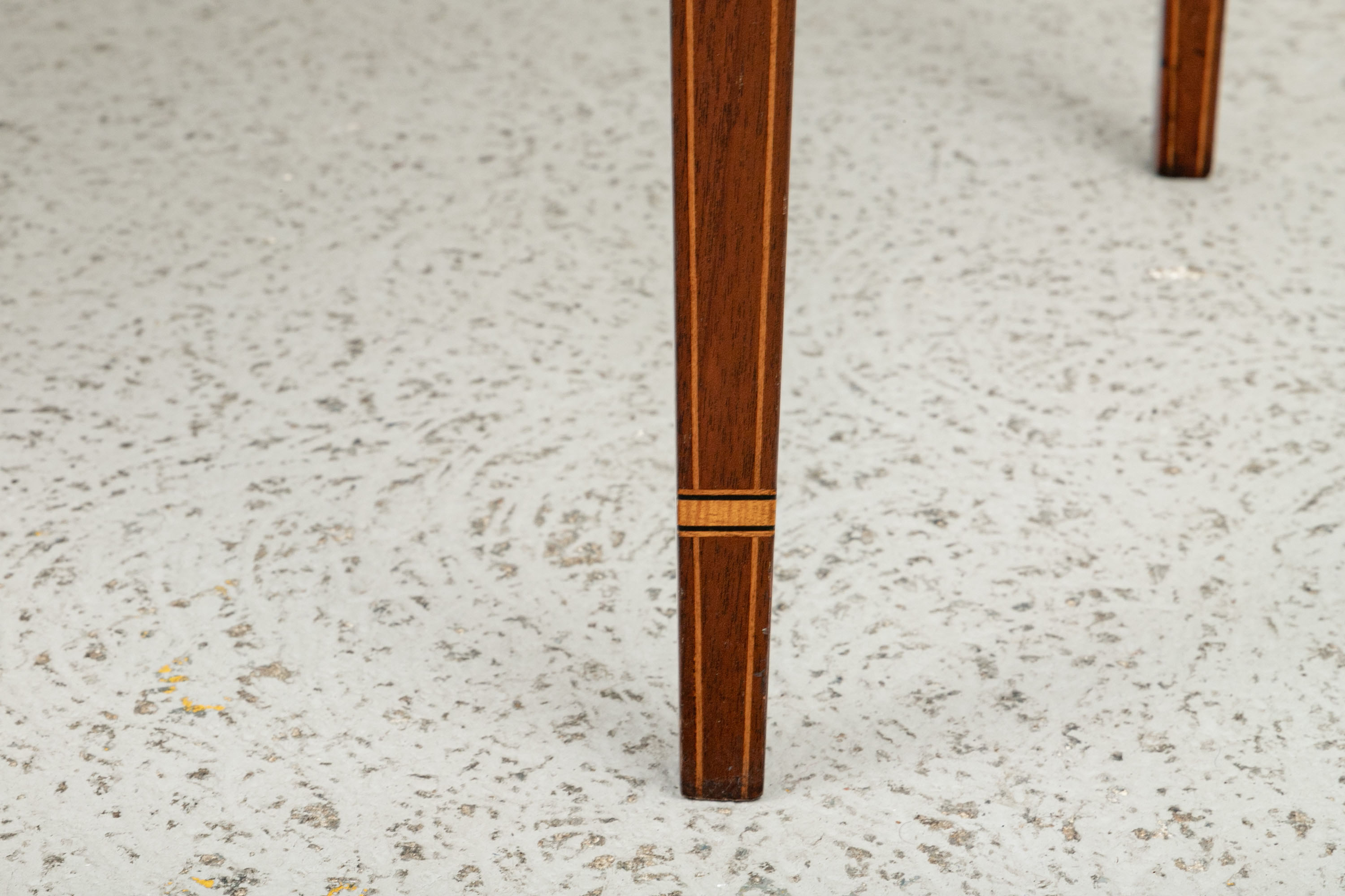 Exquisite construction with D shaped tops and fine string inlays on the apron panels and Curly Maple inlaid panels in the center and diamond shapes on the tops of the legs. Raised on square tapering legs with string inlays.