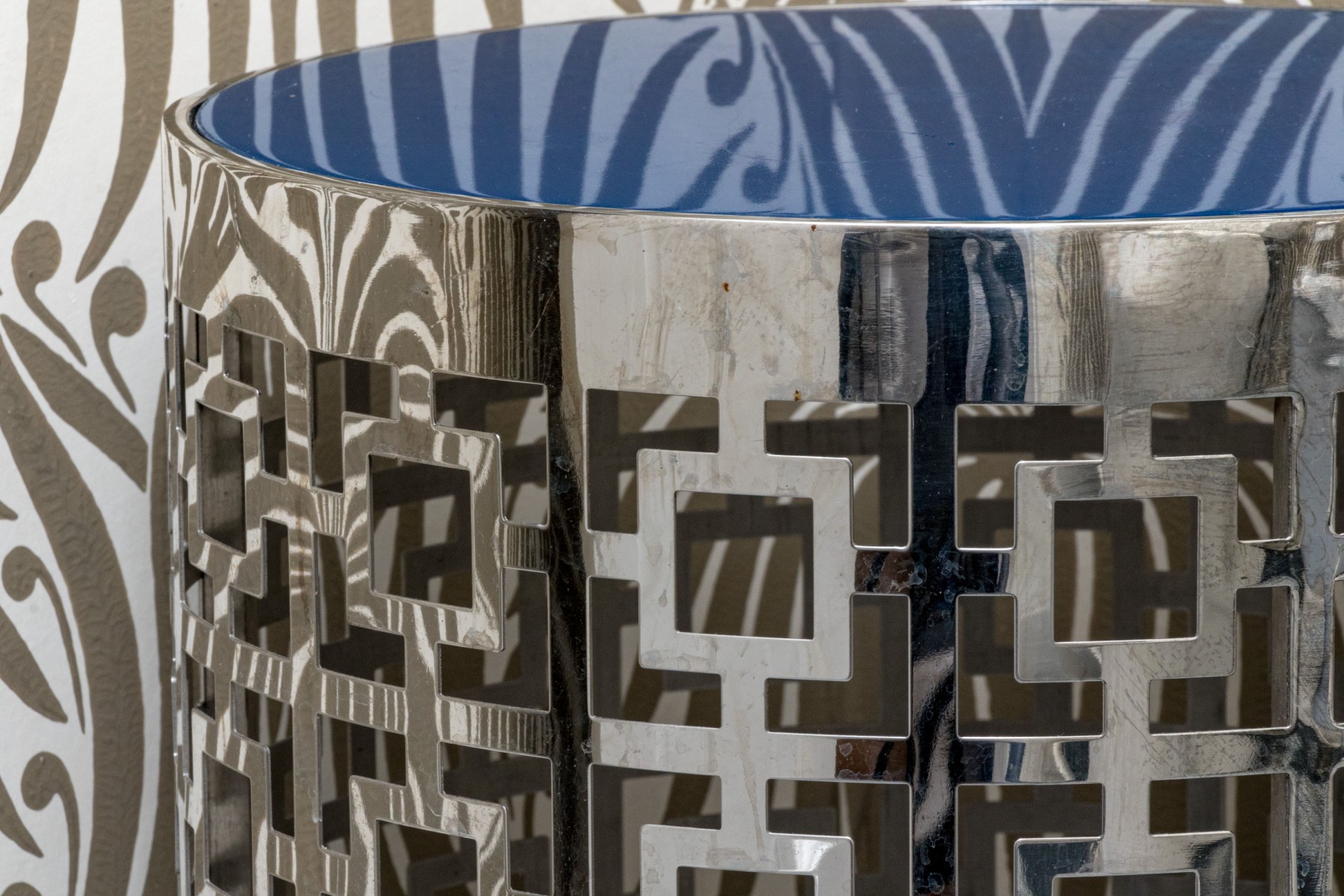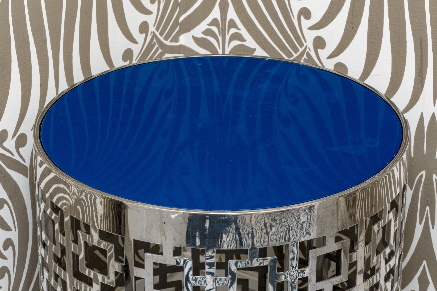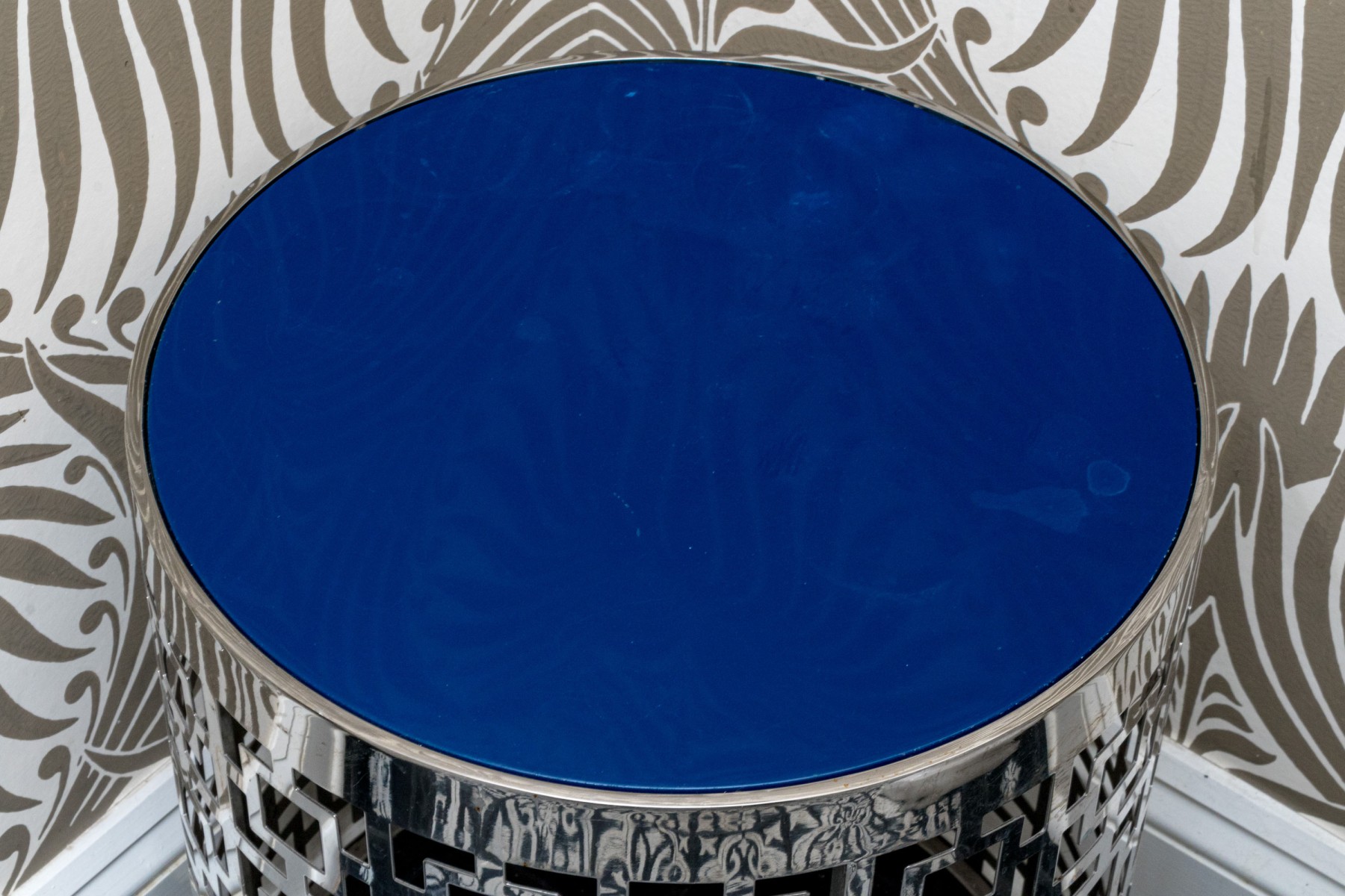 The eye-popping Jonathan Adler "Nixon" accent table has a vibrant cobalt hued inset table top, with a marvelous chrome finished, geometric motif openwork cylindrical body.