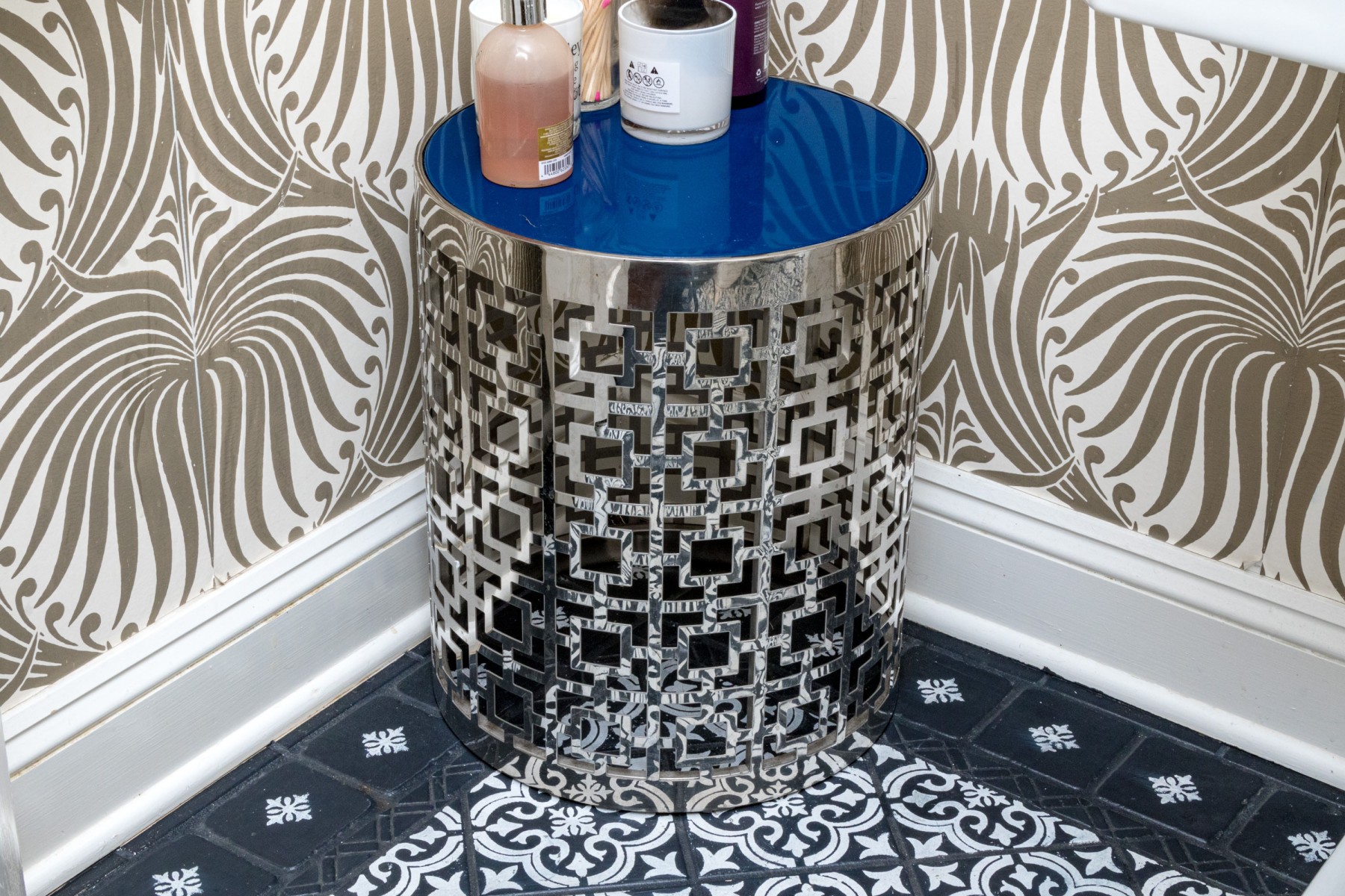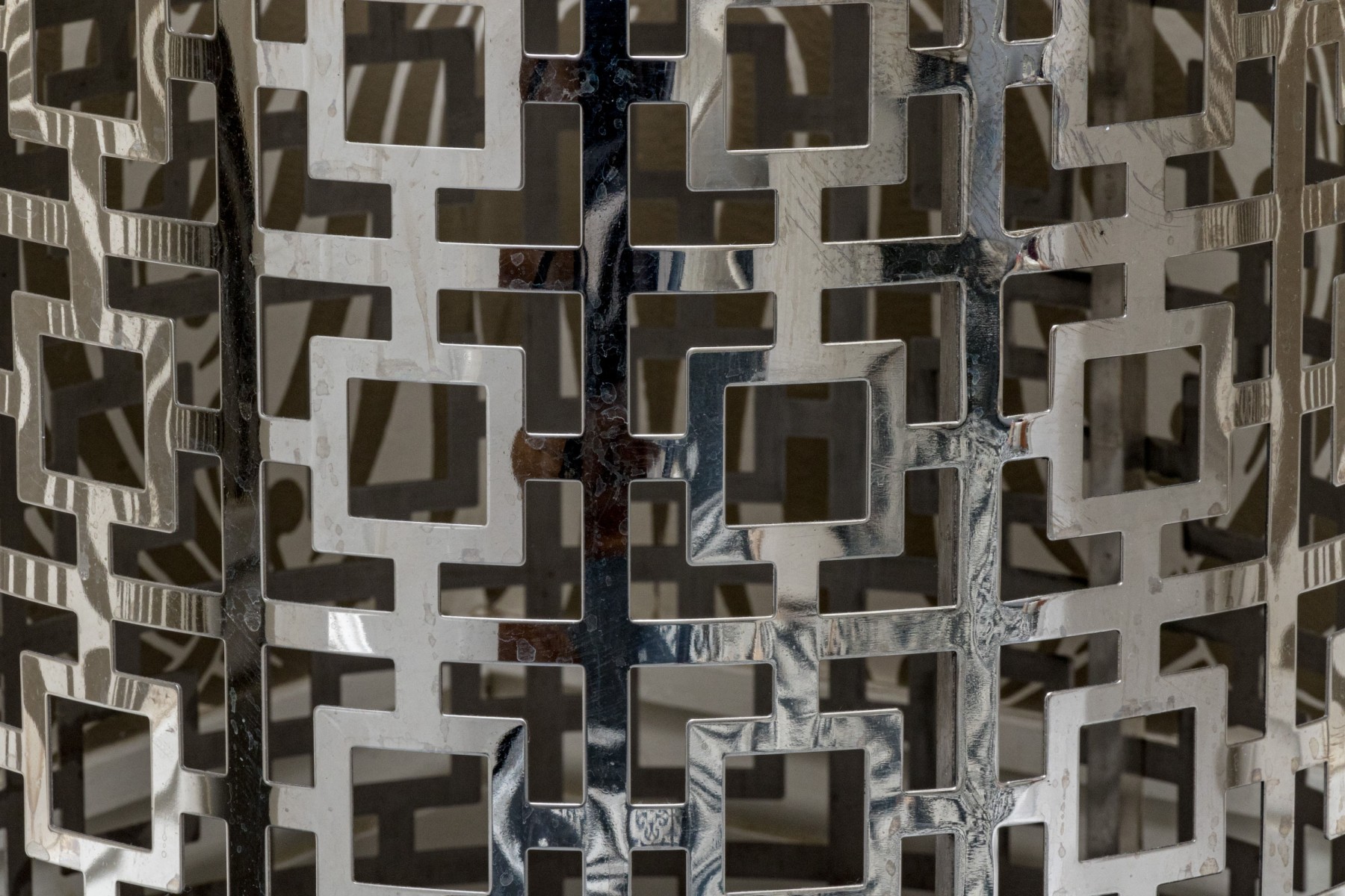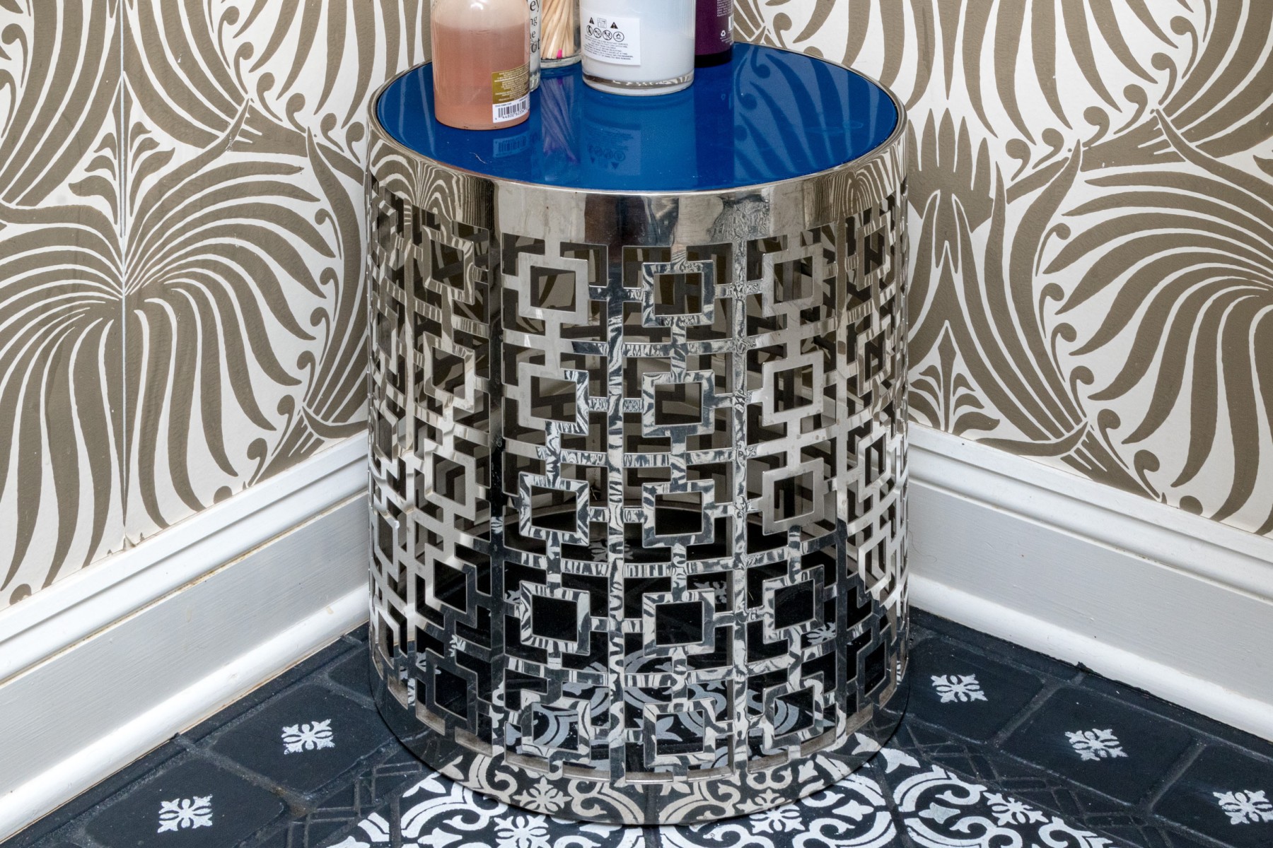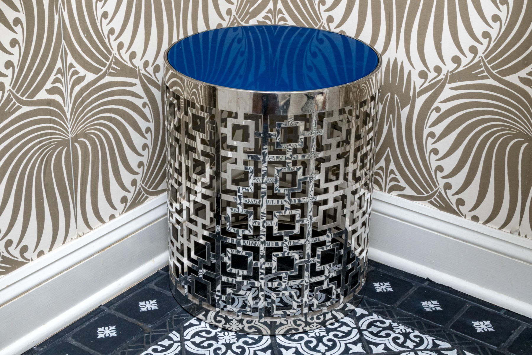 The eye-popping Jonathan Adler "Nixon" accent table has a vibrant cobalt hued inset table top, with a marvelous chrome finished, geometric motif openwork cylindrical body.