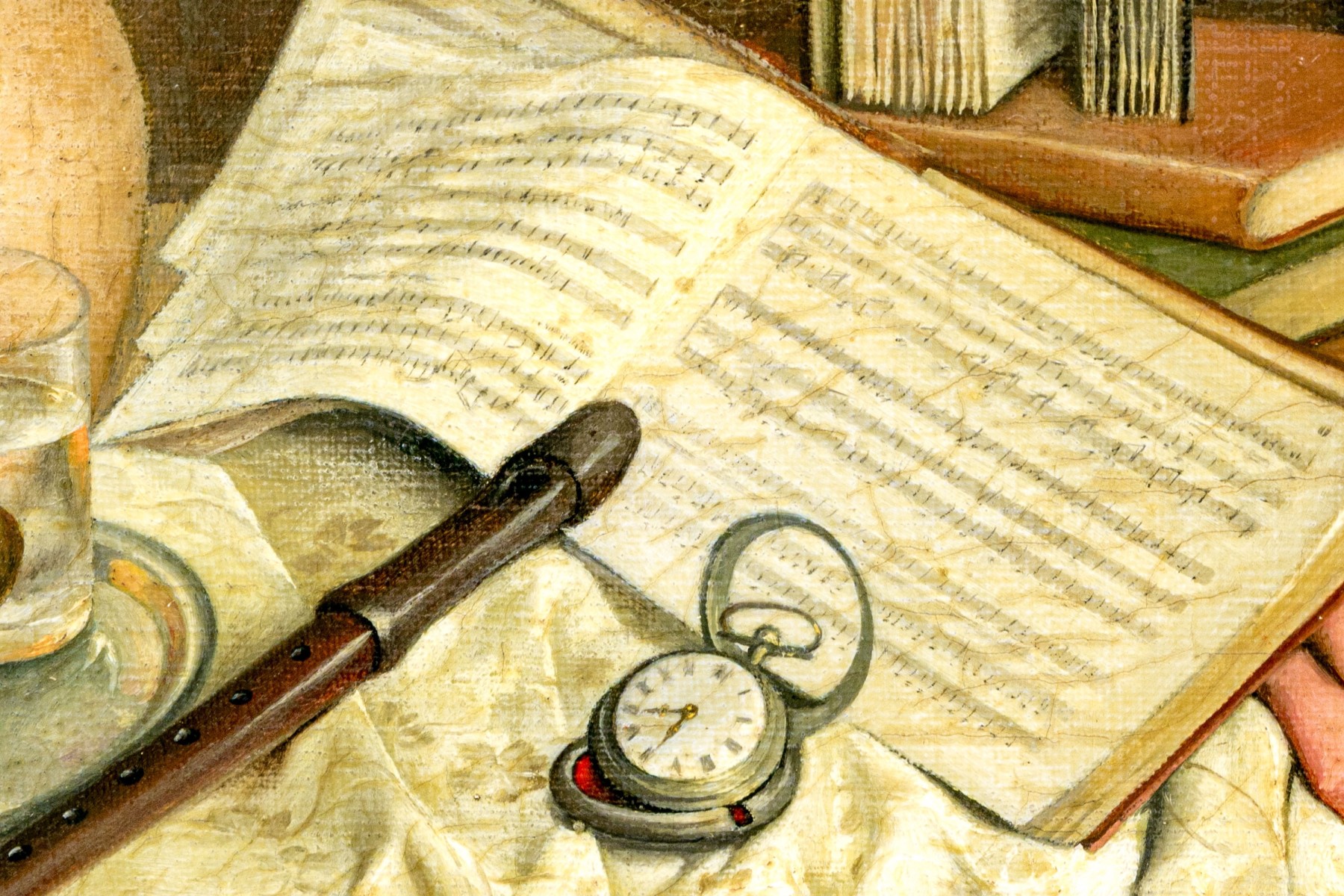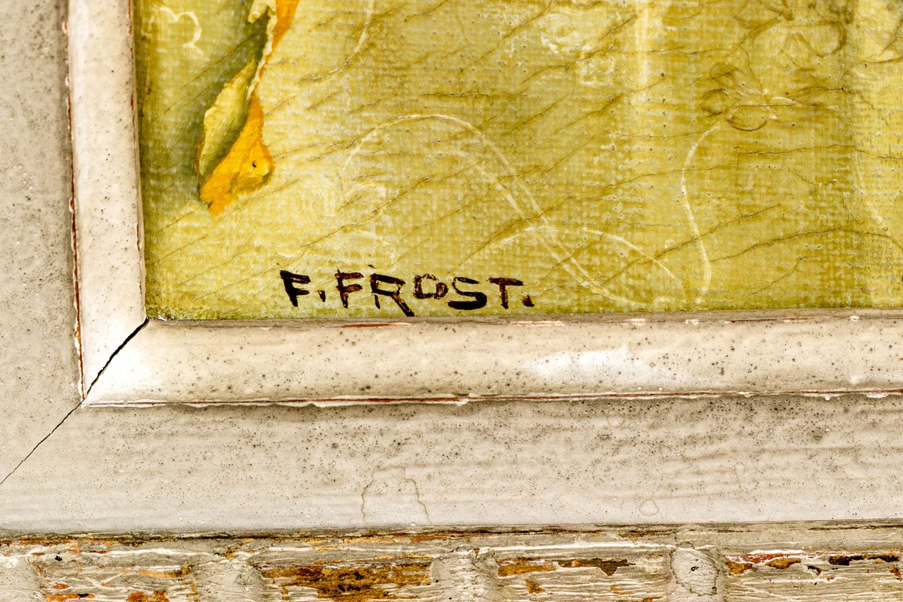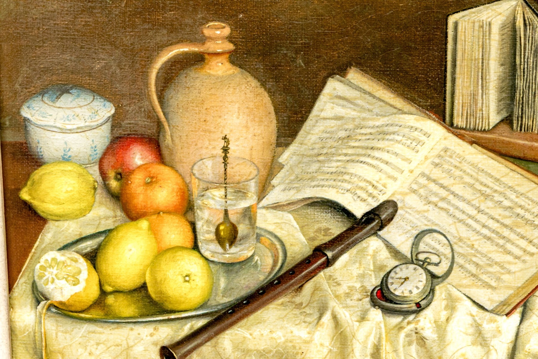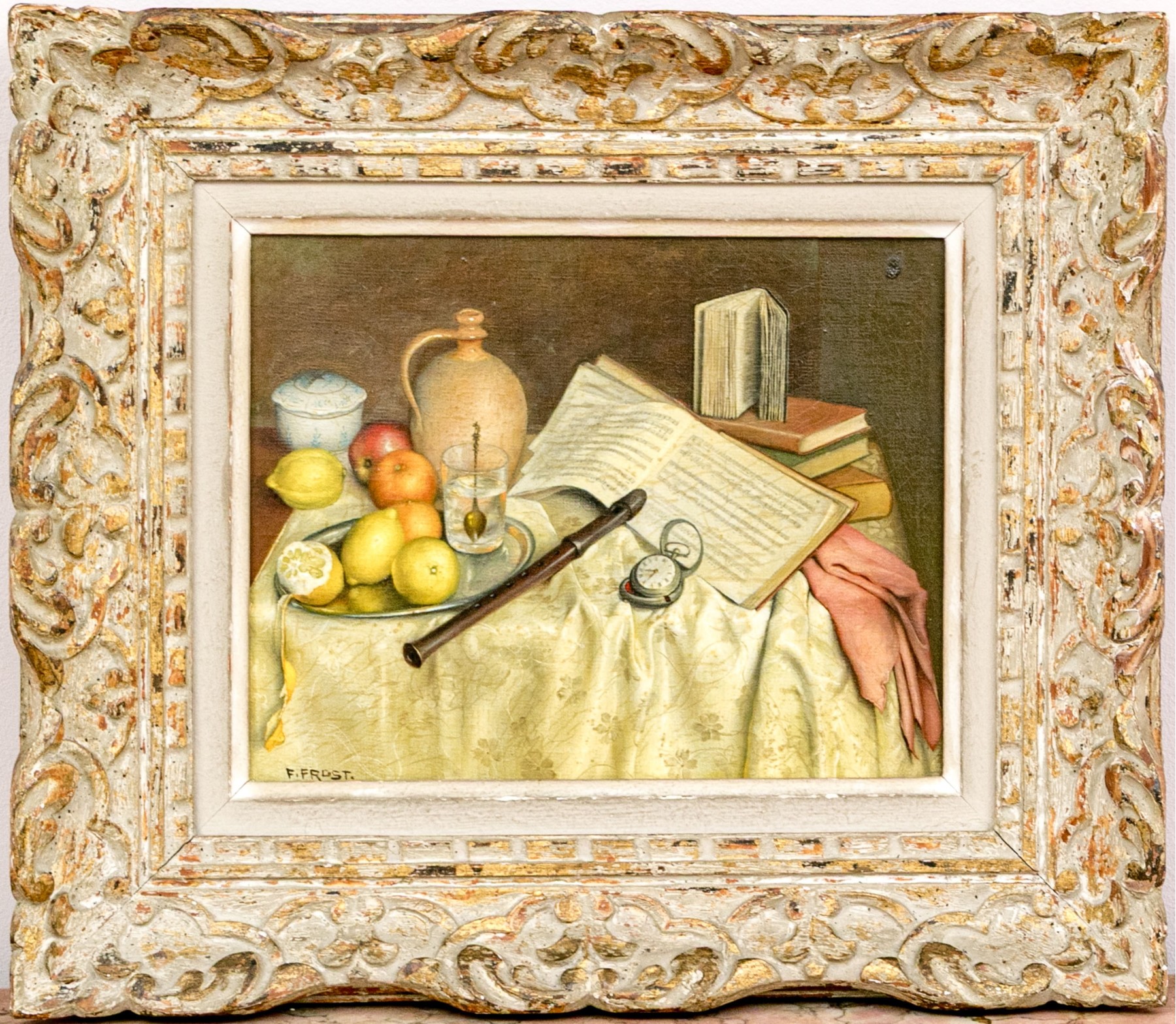A delightful oil painting on canvas depicting table draped in fine silk fabric set with a stack of books, a musical score with a clarinet and a pocket watch. At the sides is a jug and a tray with a glass for refreshment and fruits. One of the artist's dense and unusual still lifes on brown ground. Signed F. Frost lower left.