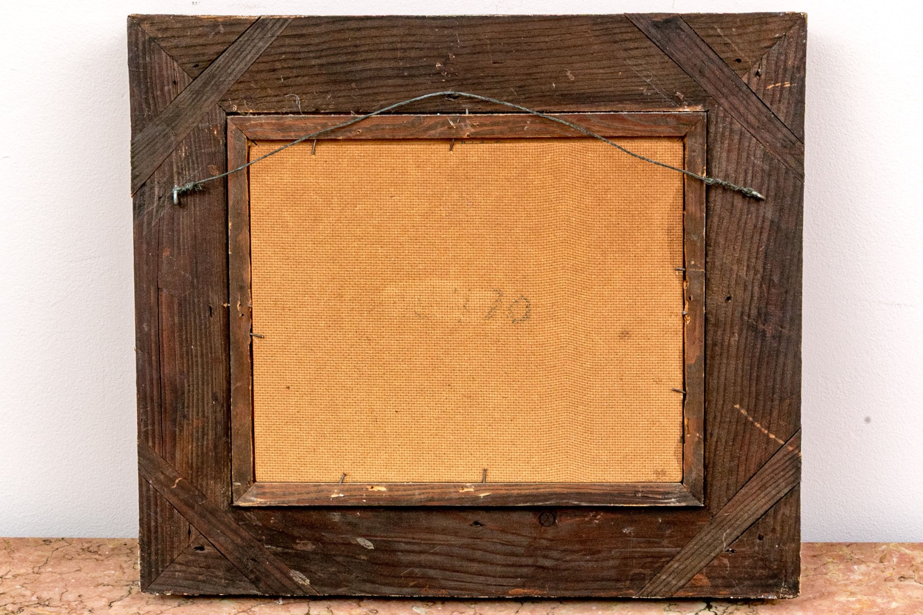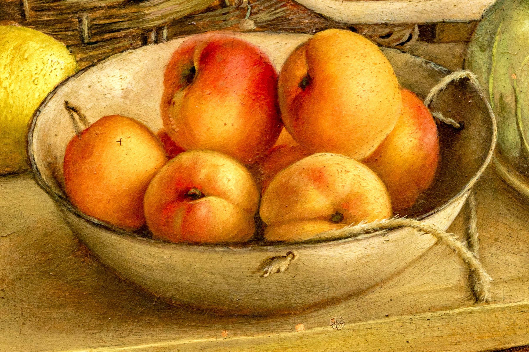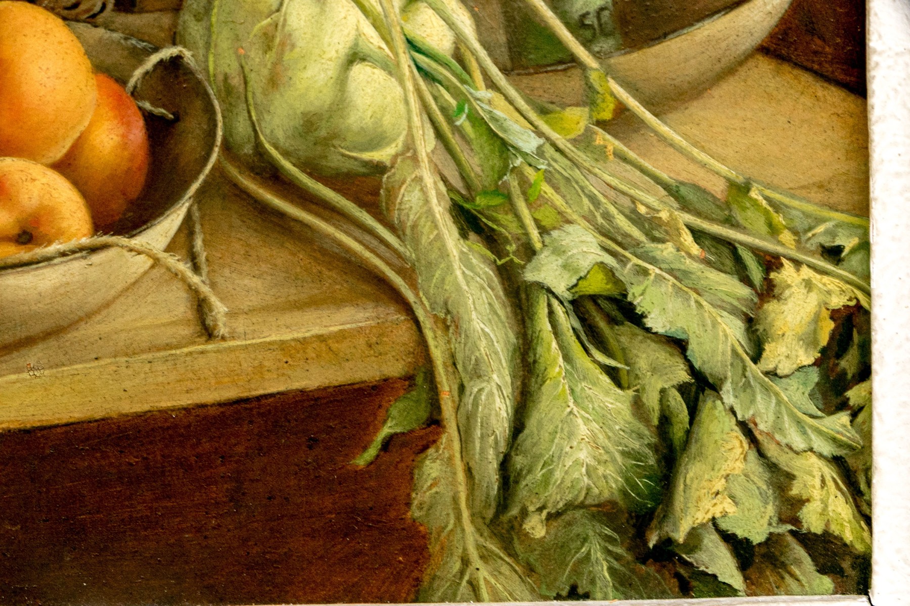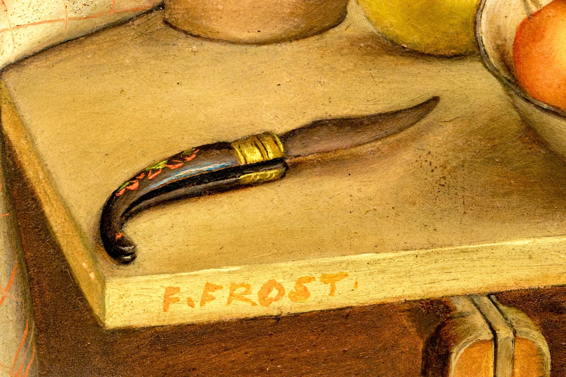 A nicely rendered oil painting on masonite board depicting a country table set with a jug, a lemon and fresh cabbage. Along with a basket and a bowl of peaches and a paring knife. Patterned kitchen cloths frame the scene. Signed F. Frost on the lower left table edge.