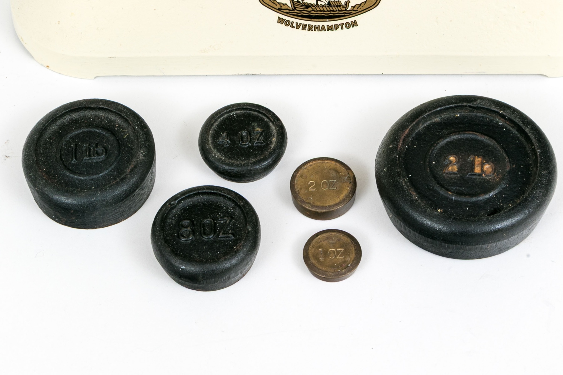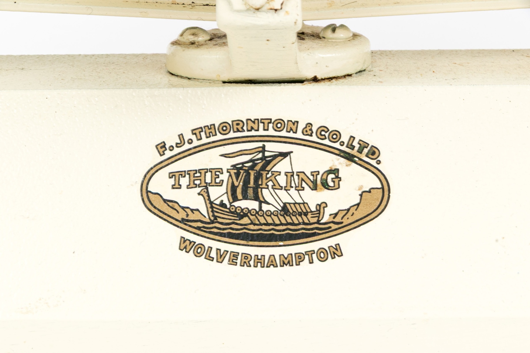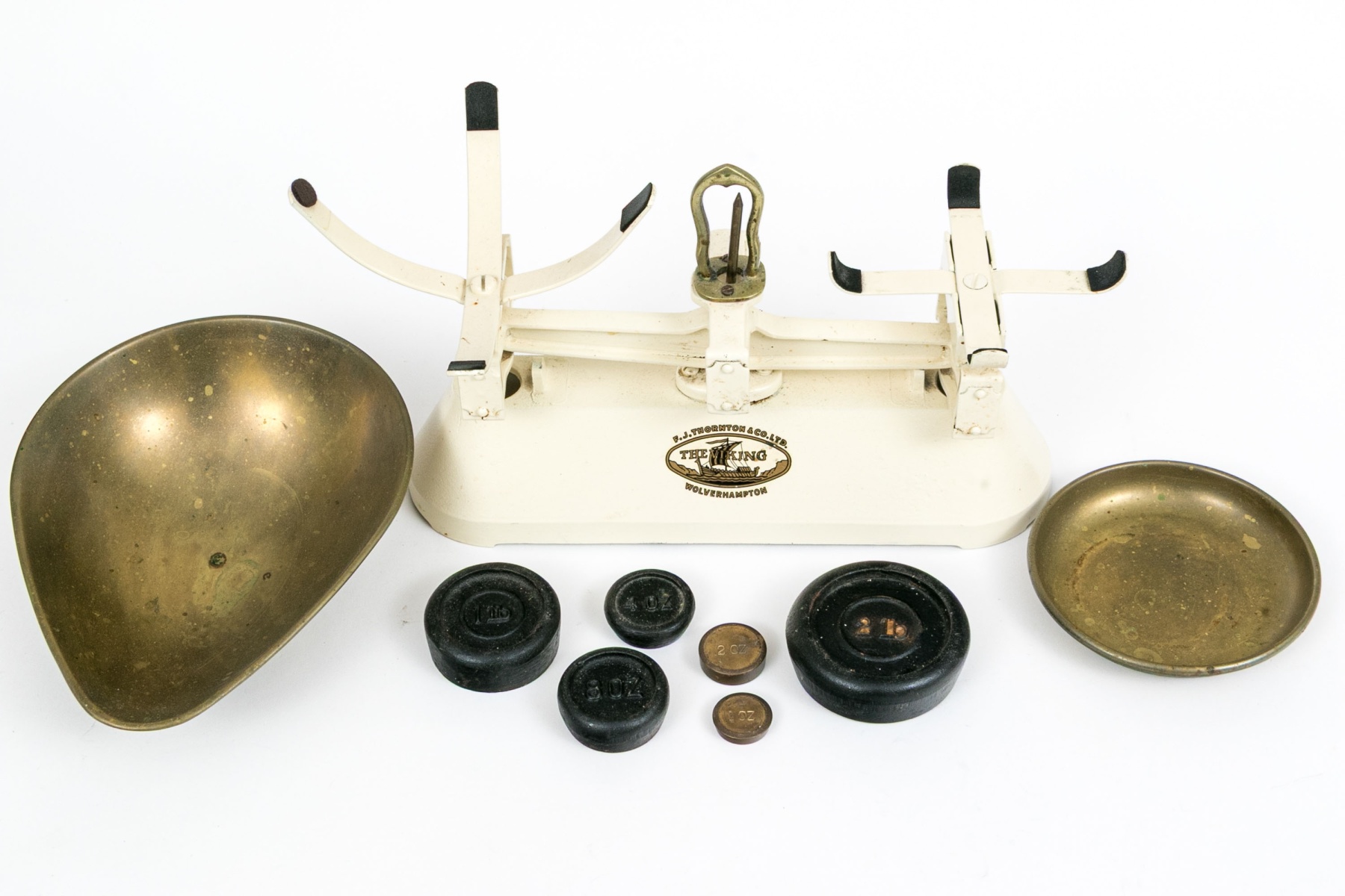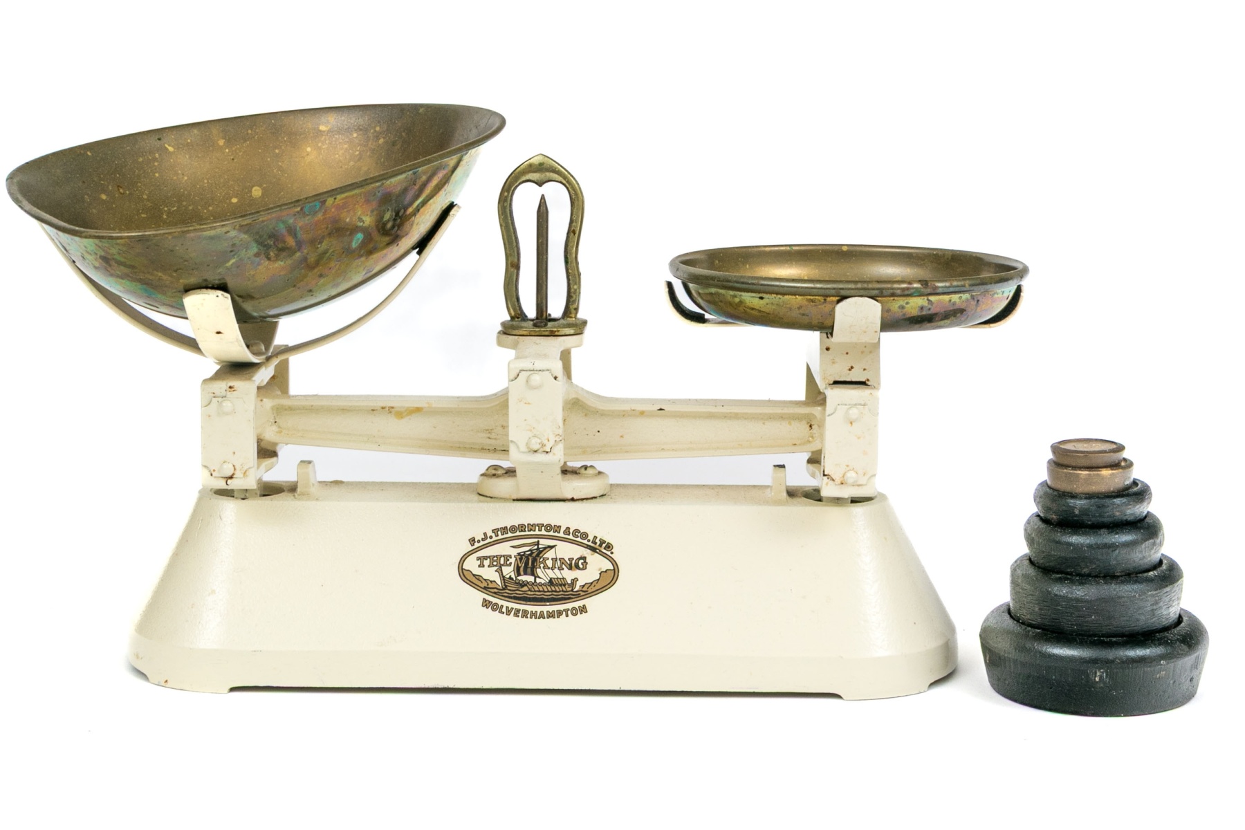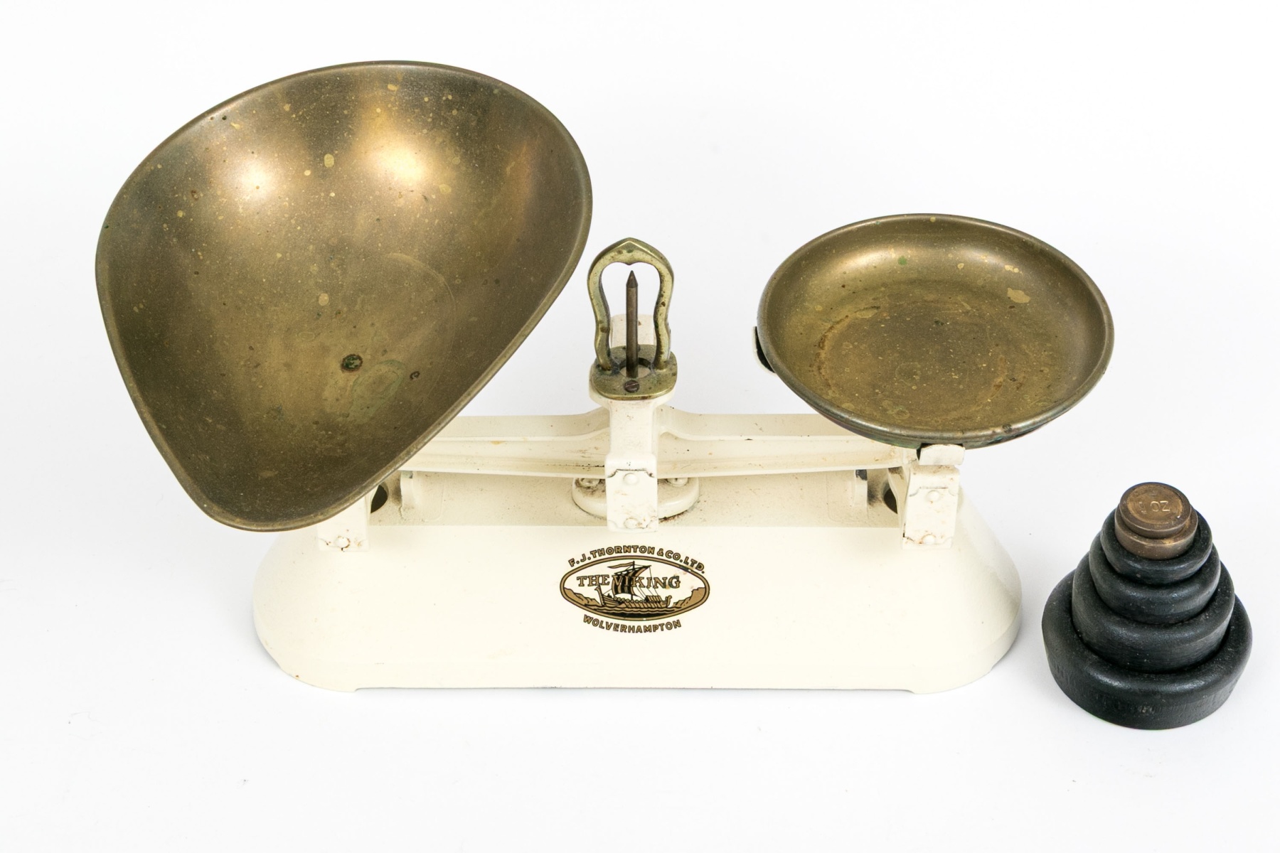 A charming vintage F.J. Thornton "The Viking" kitchen balance cale featuring brass pans and a cream-white finished cast iron base, accompanied by a set of graduating weights.