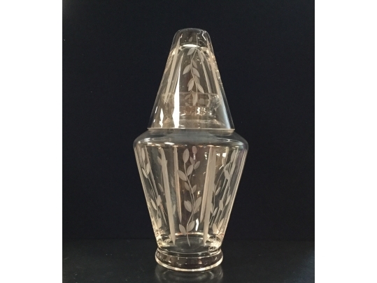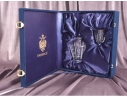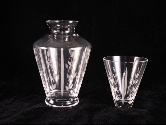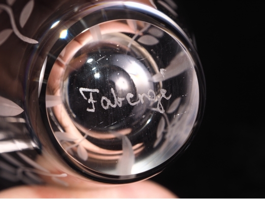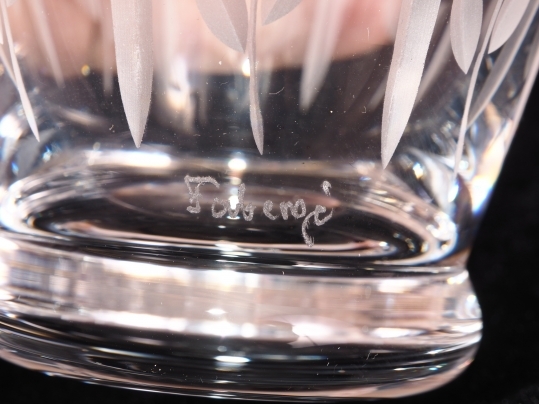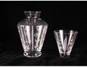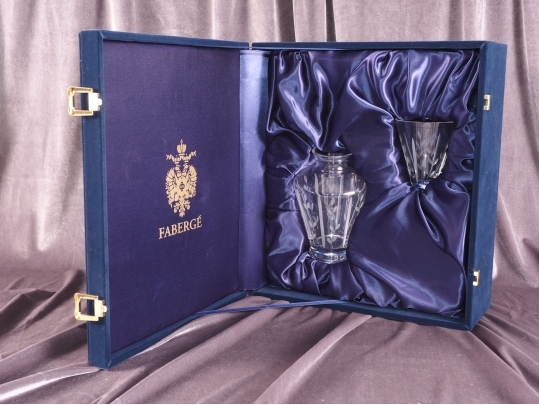 A beautiful hand cut and frosted carafe set from Faberge in the Anatole pattern. This set comes in the original Faberge navy velvet presentation box. Cup is hand etched with Faberge on bottom while the carafe is signed along the base.