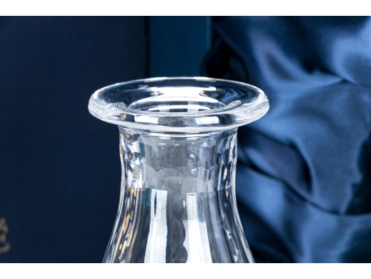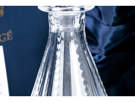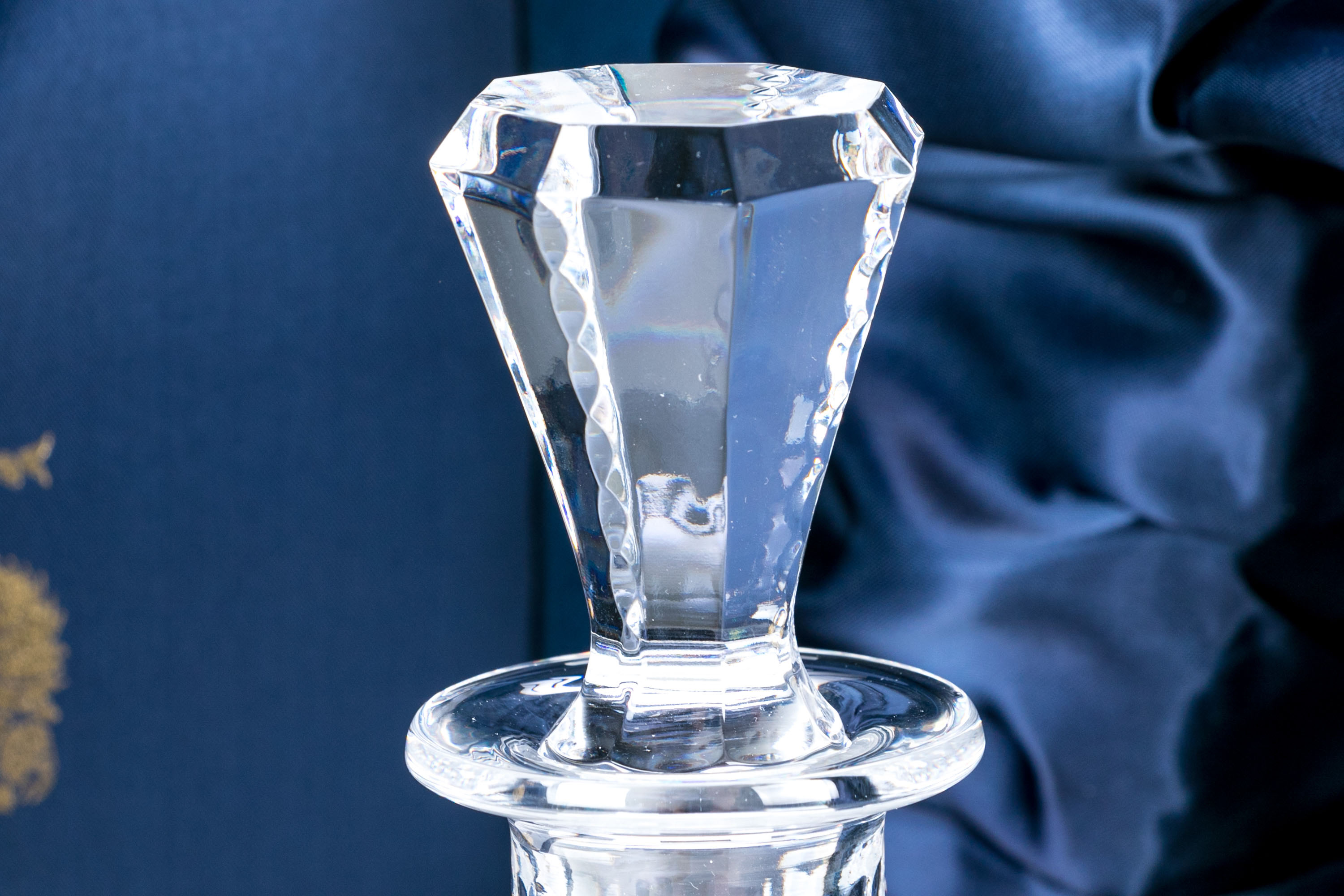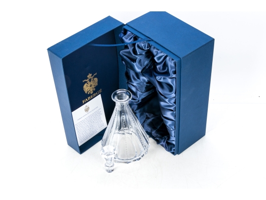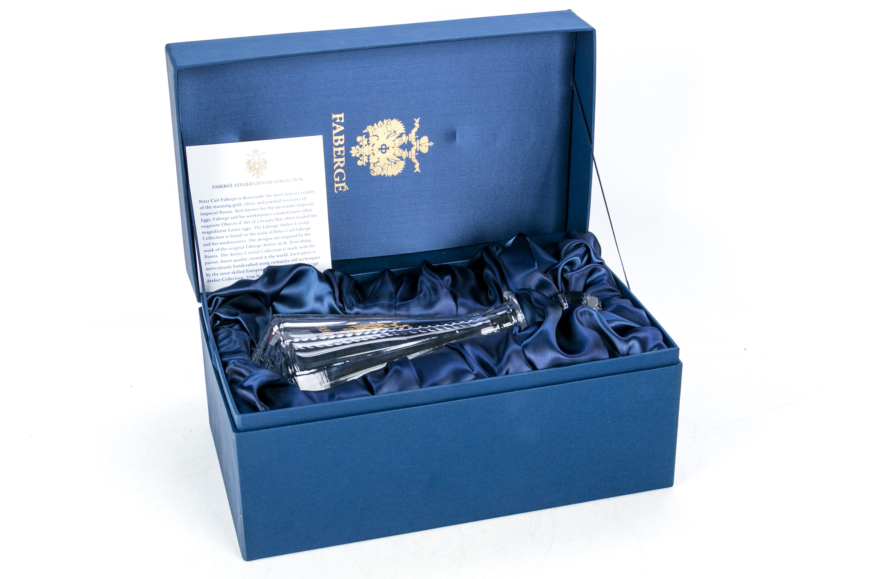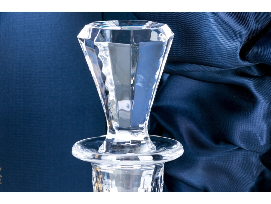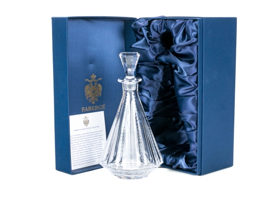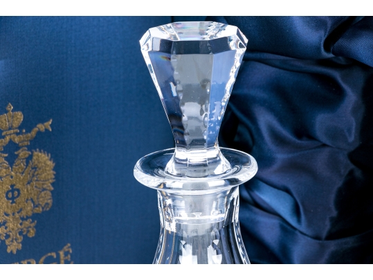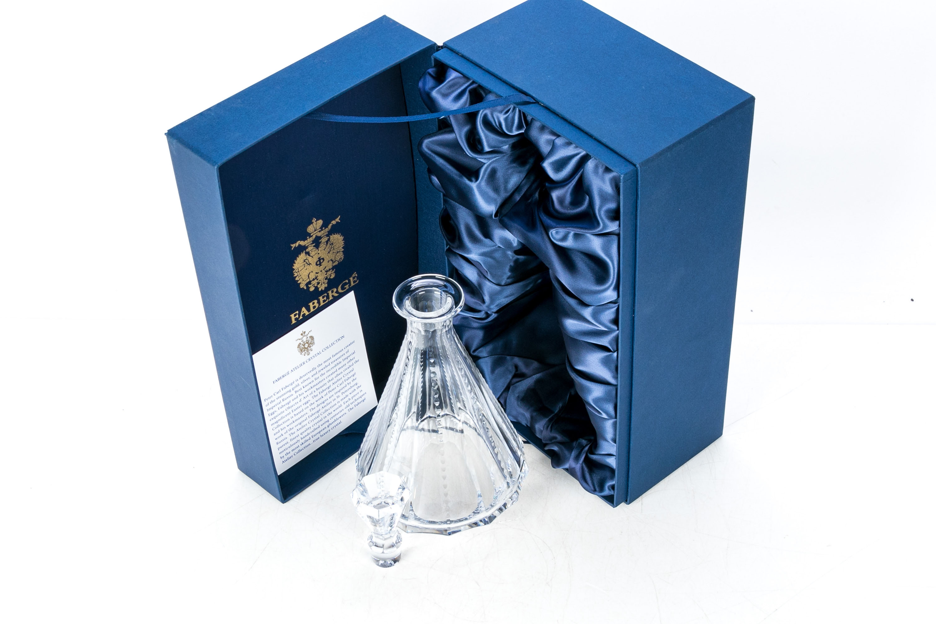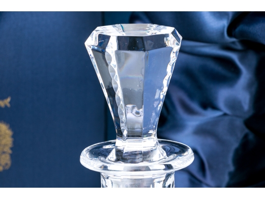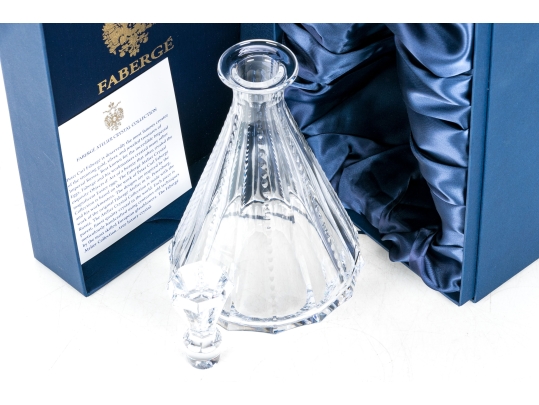 Faberge Balzac decanter from the Imperial Collection, style #559-20, clear cut crystal, pyramidal form with narrow neck becoming bulbous at the body, alternating faceted vertical motifs with conforming faceted stopper. Etched signature as shown.