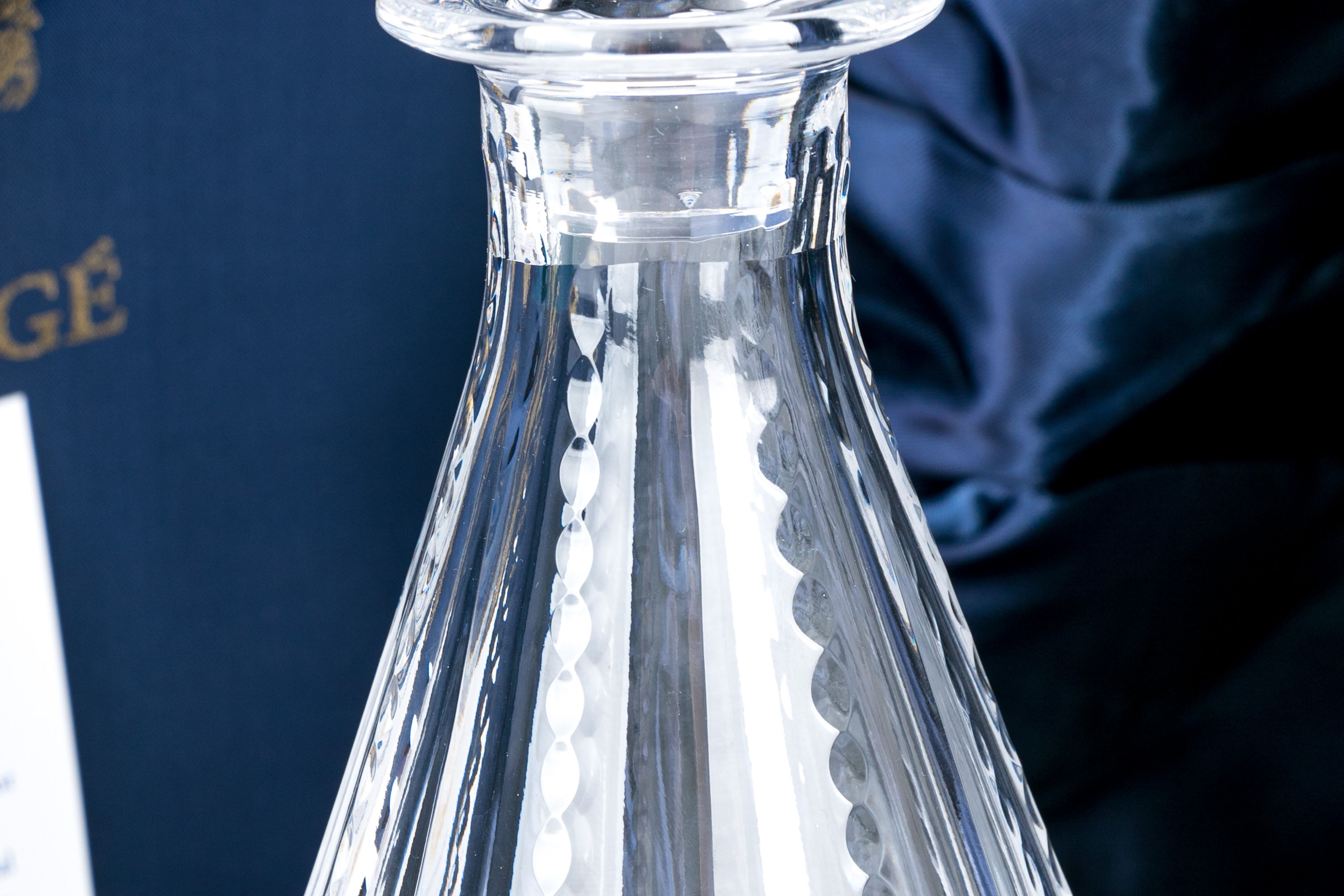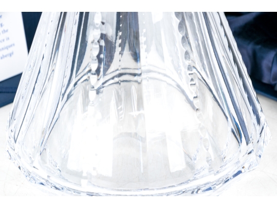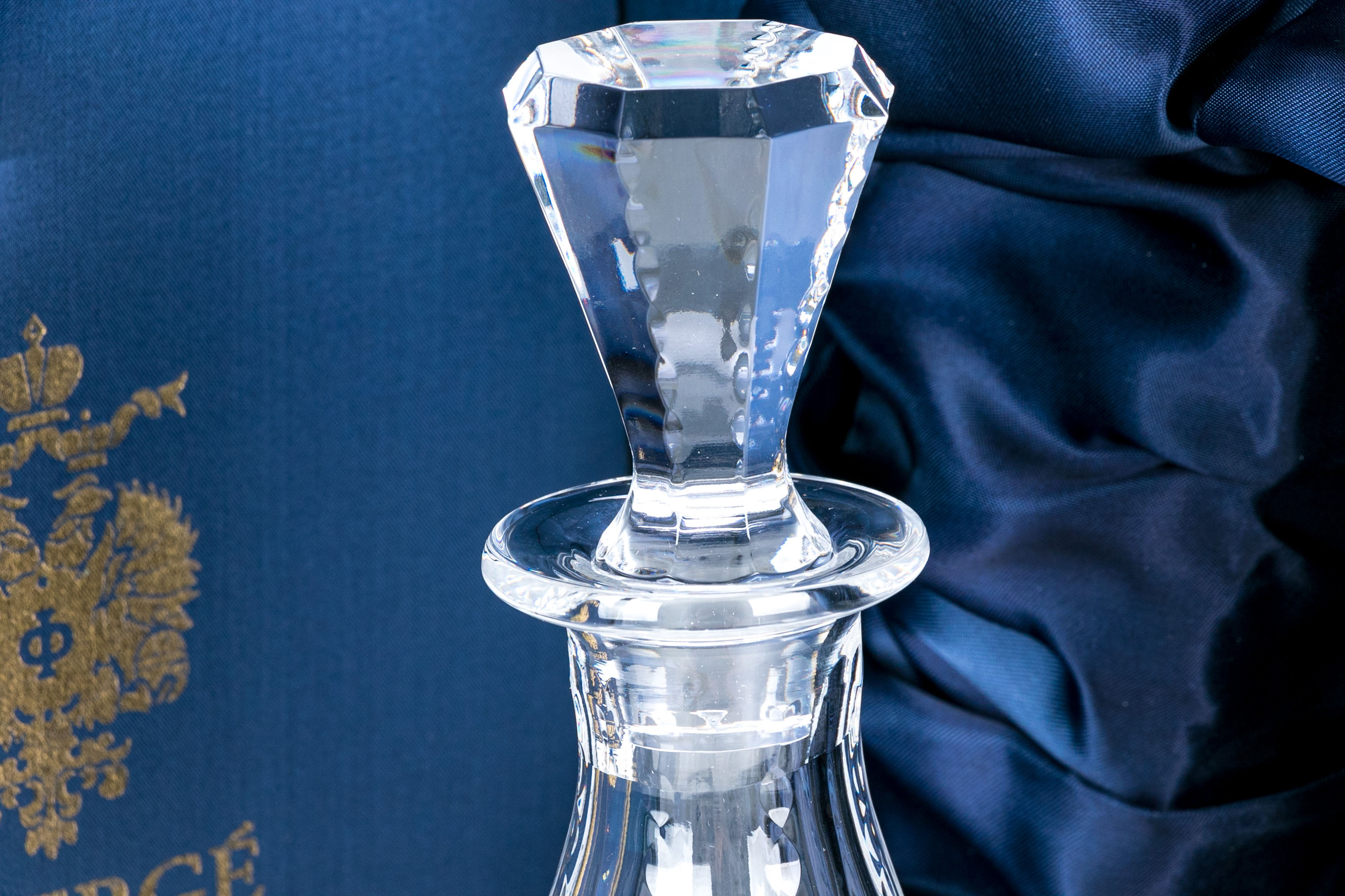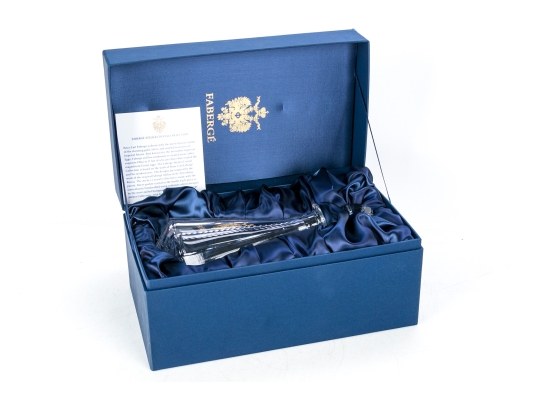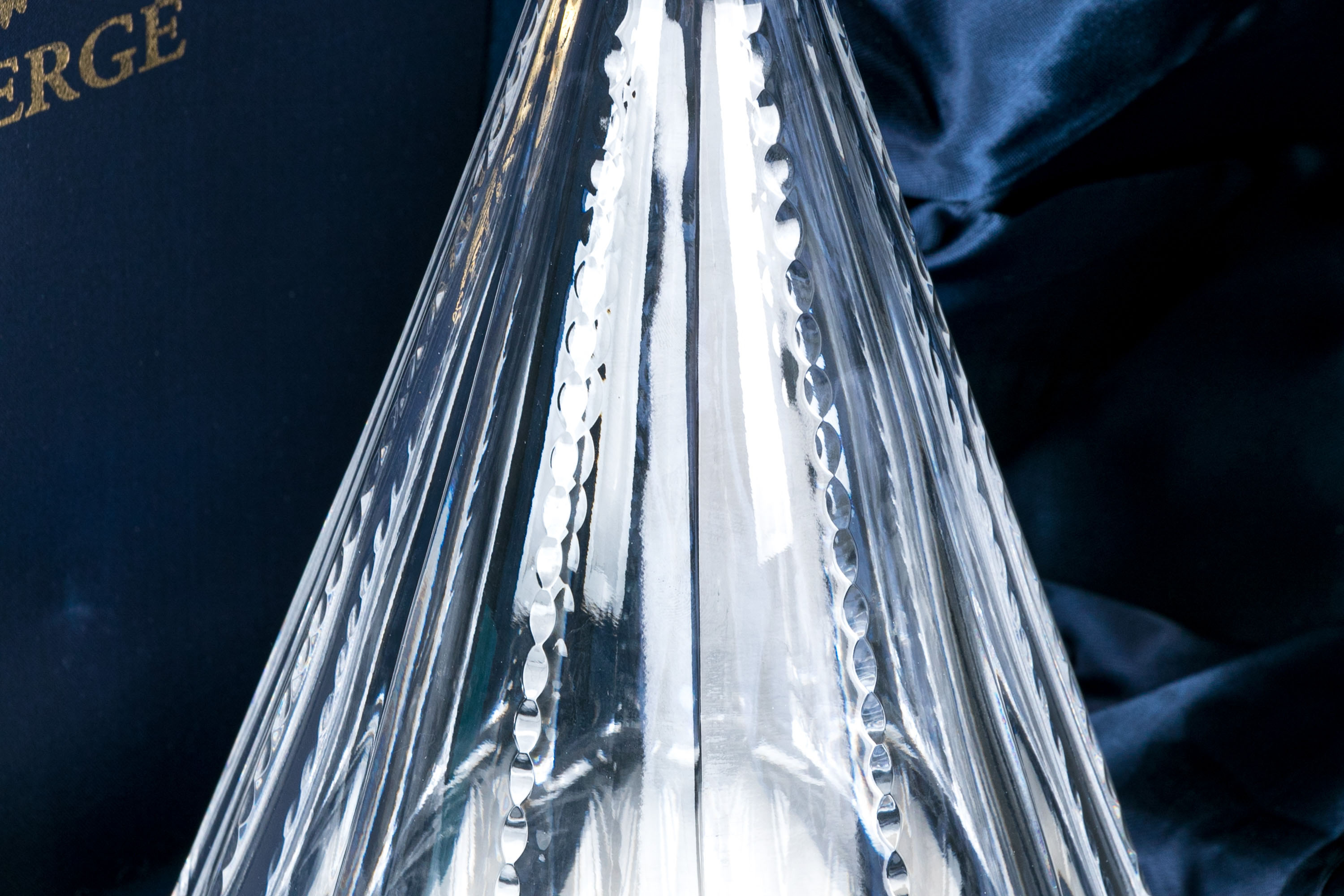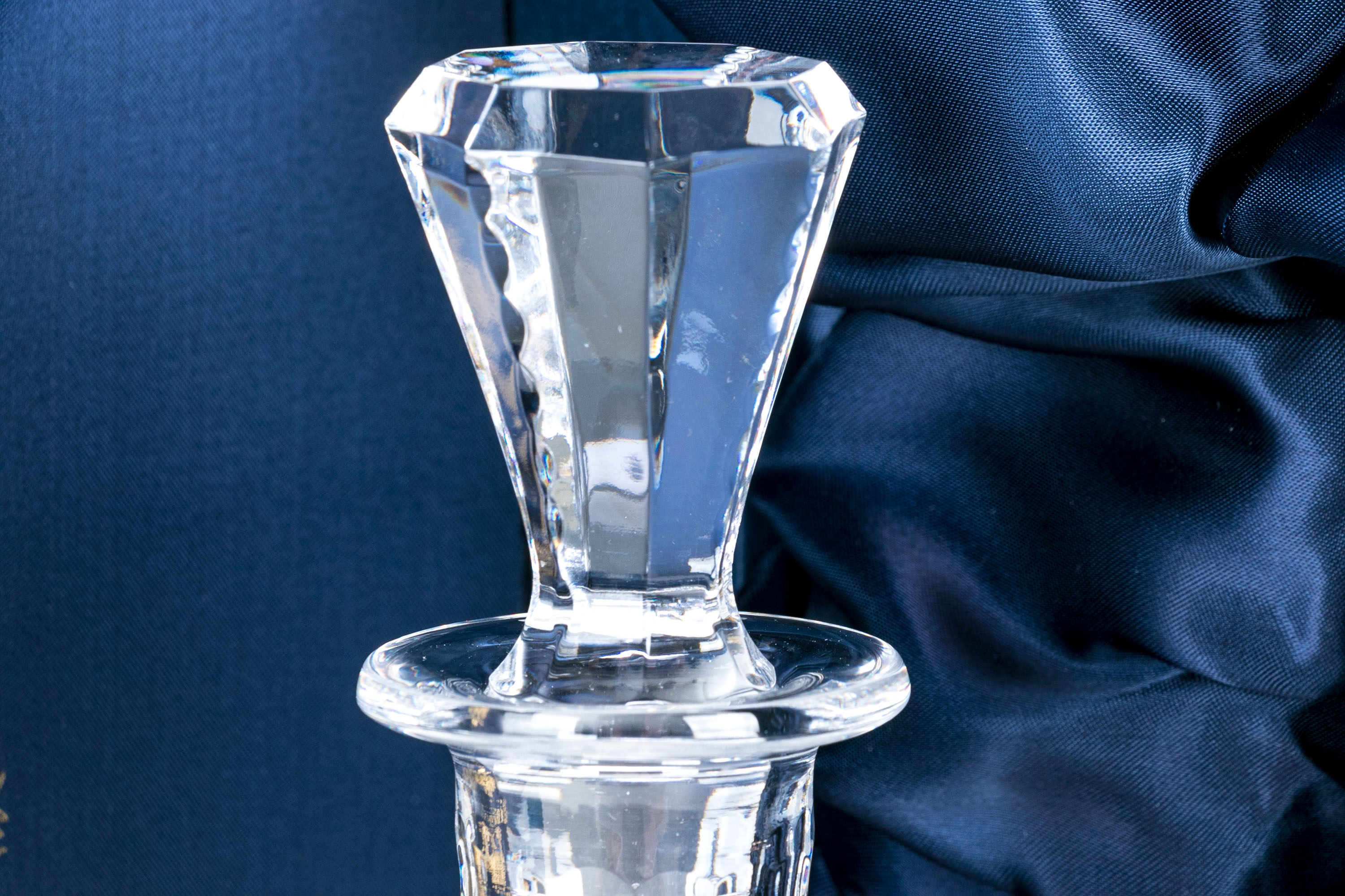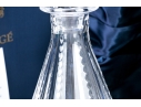Faberge Balzac decanter from the Imperial Collection, style #559-20, clear cut crystal, pyramidal form with narrow neck becoming bulbous at the body, alternating faceted vertical motifs with conforming faceted stopper. Etched signature as shown.