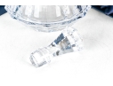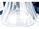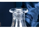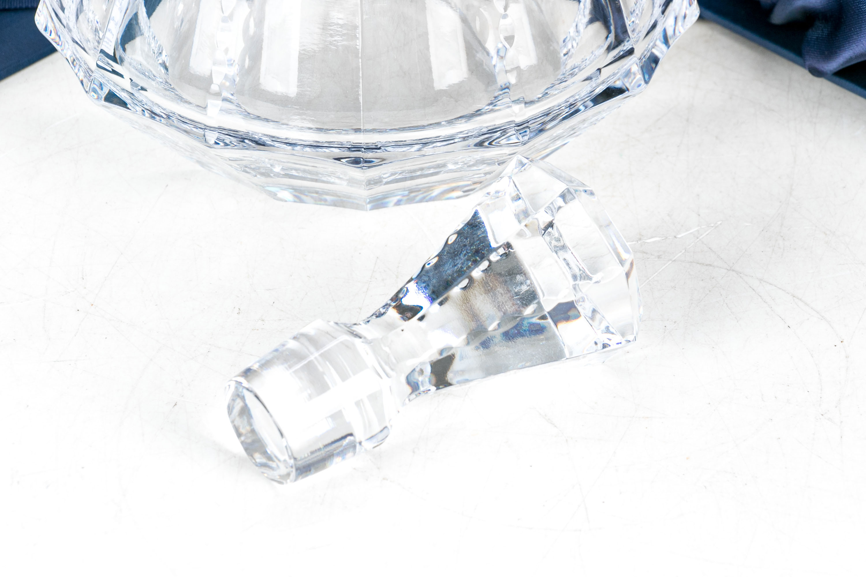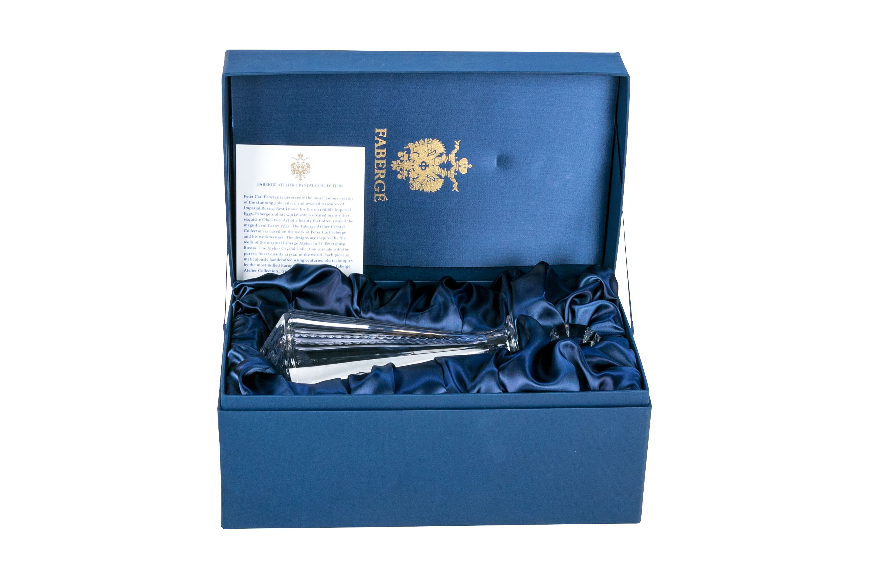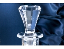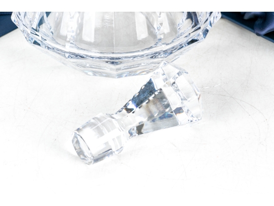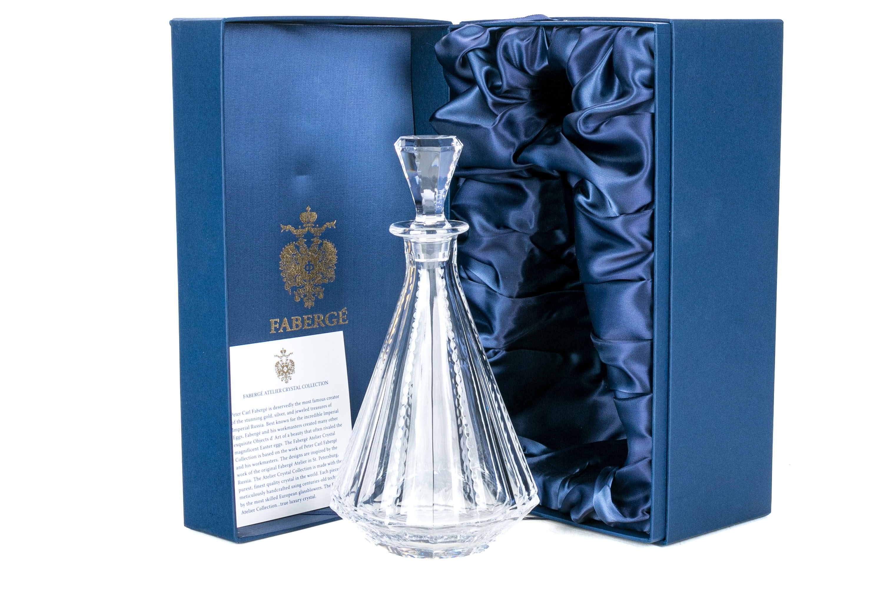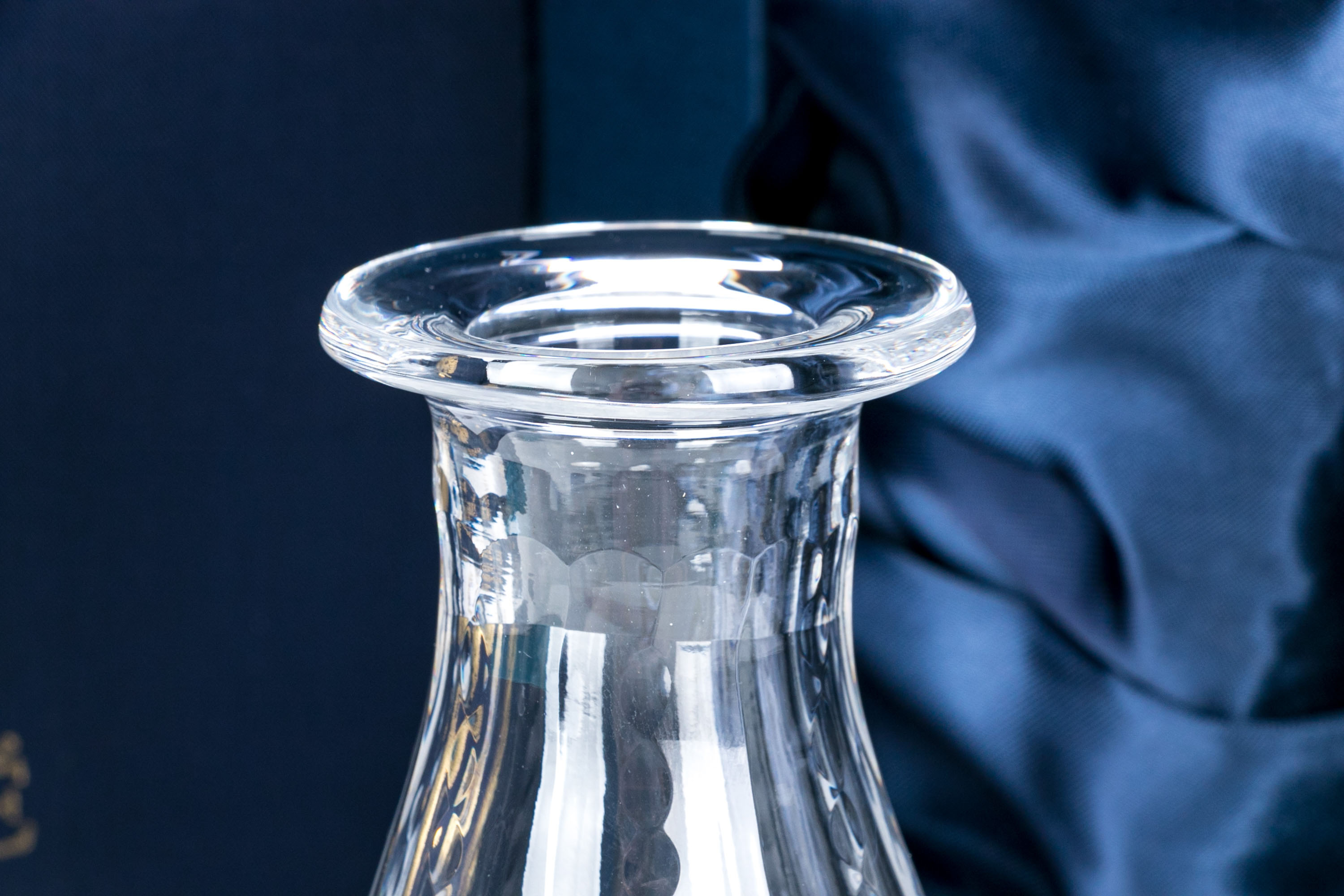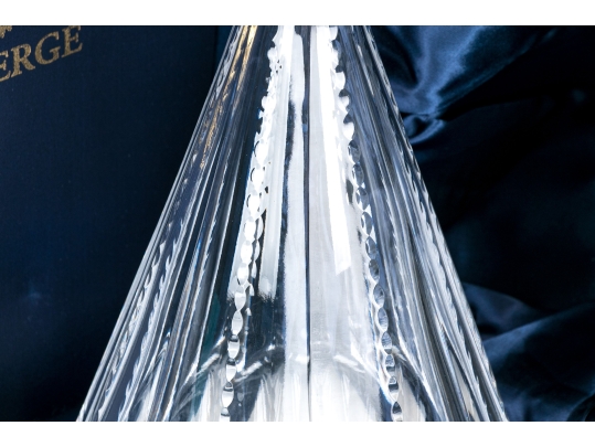Faberge Balzac decanter from the Imperial Collection, style #559-20, clear cut crystal, pyramidal form with narrow neck becoming bulbous at the body, alternating faceted vertical motifs with conforming faceted stopper. Etched signature as shown.