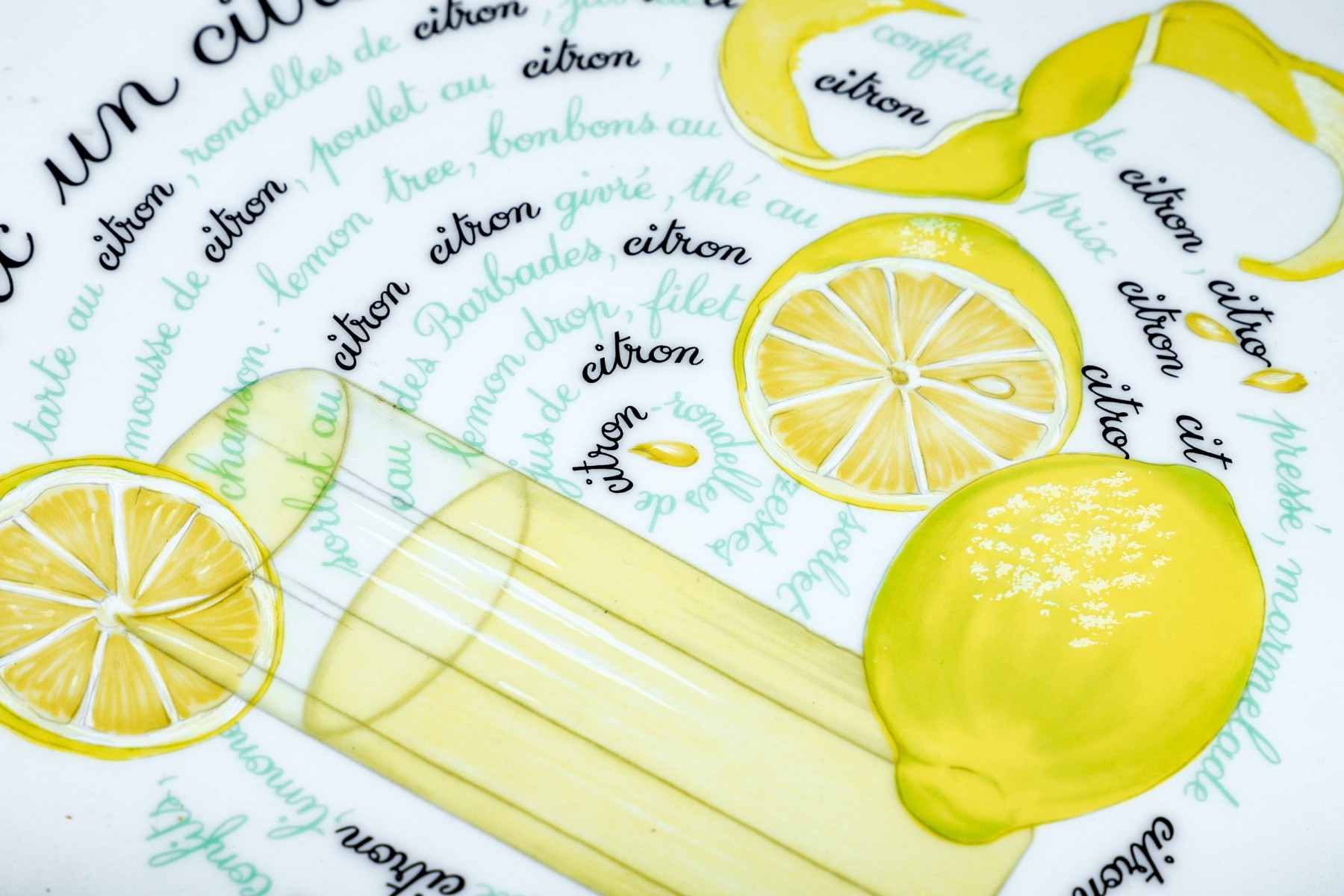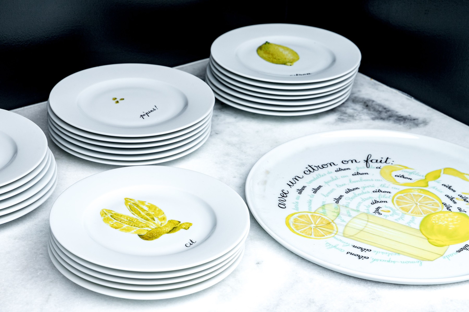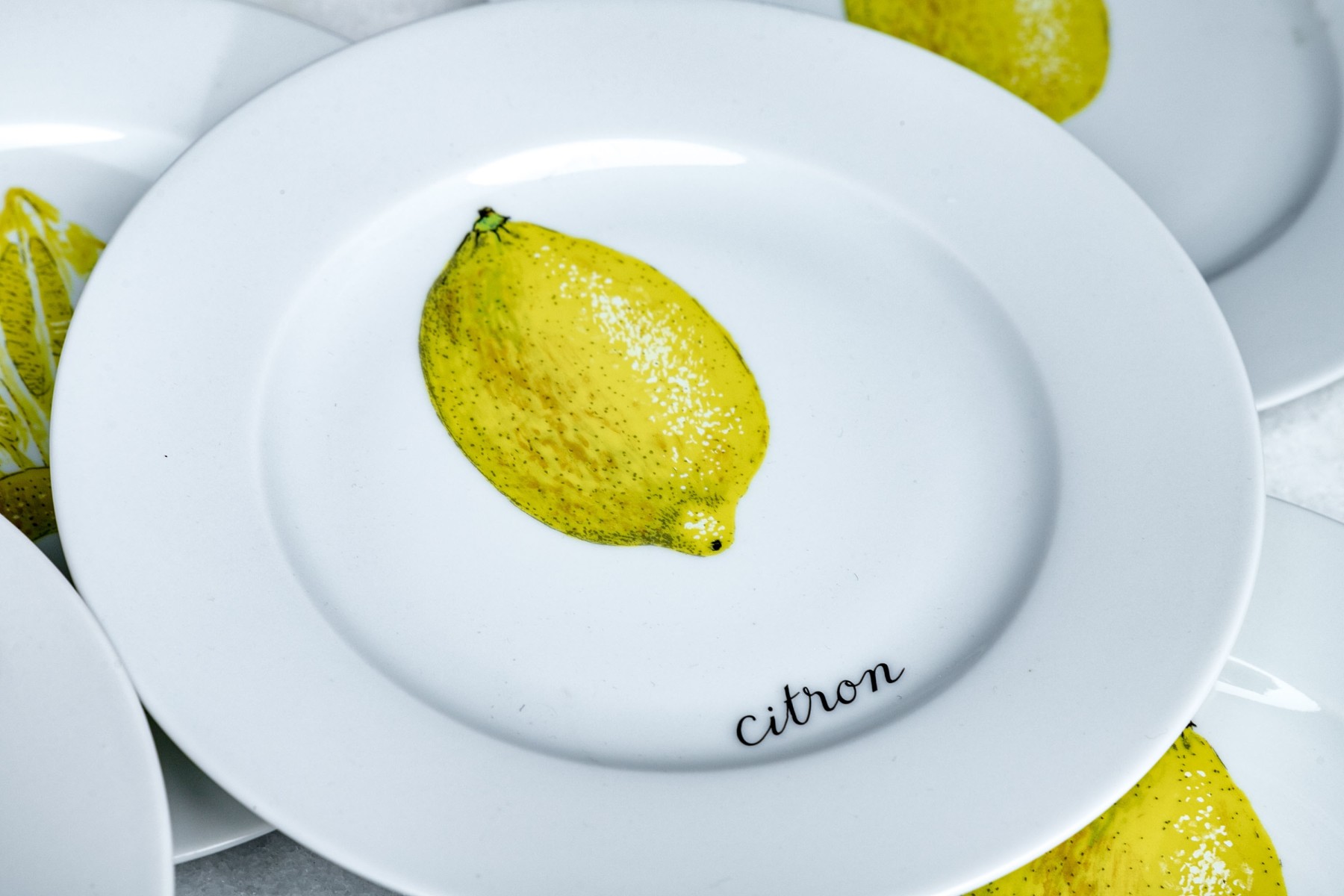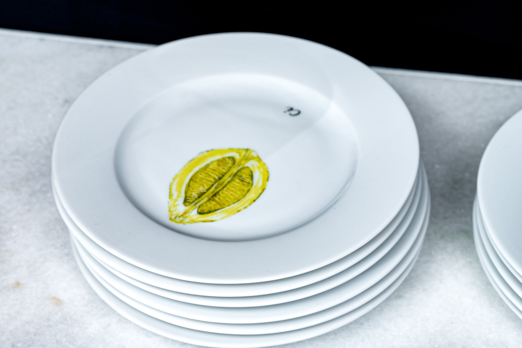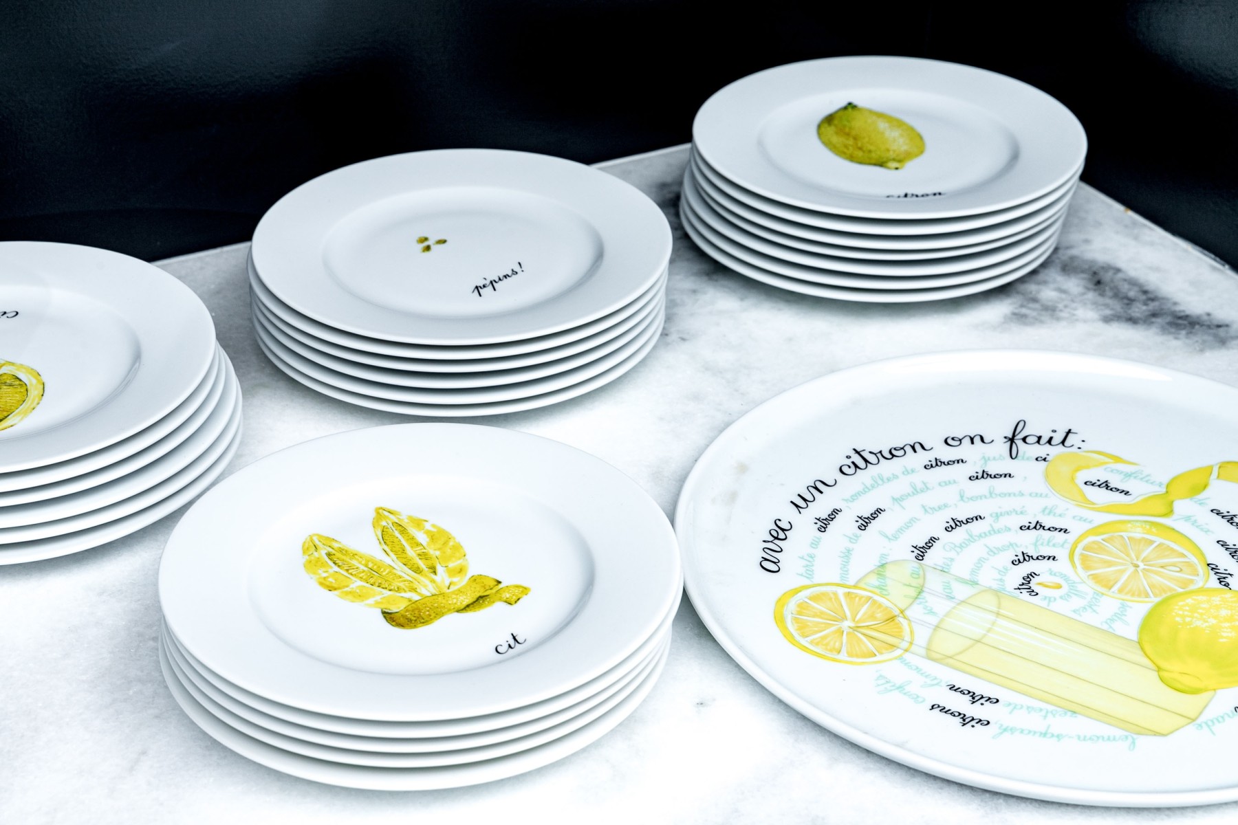 Comprised of 24 bread and butter dishes: 7 1/4" Dia, together with a larger serving platter: 11 3/4" Dia. All wonderfully decorated with citron lemons.