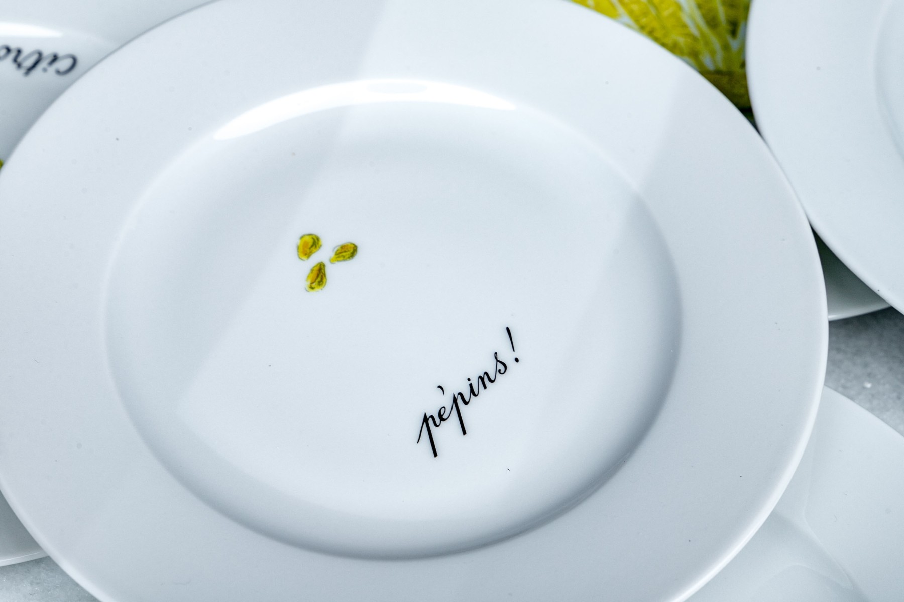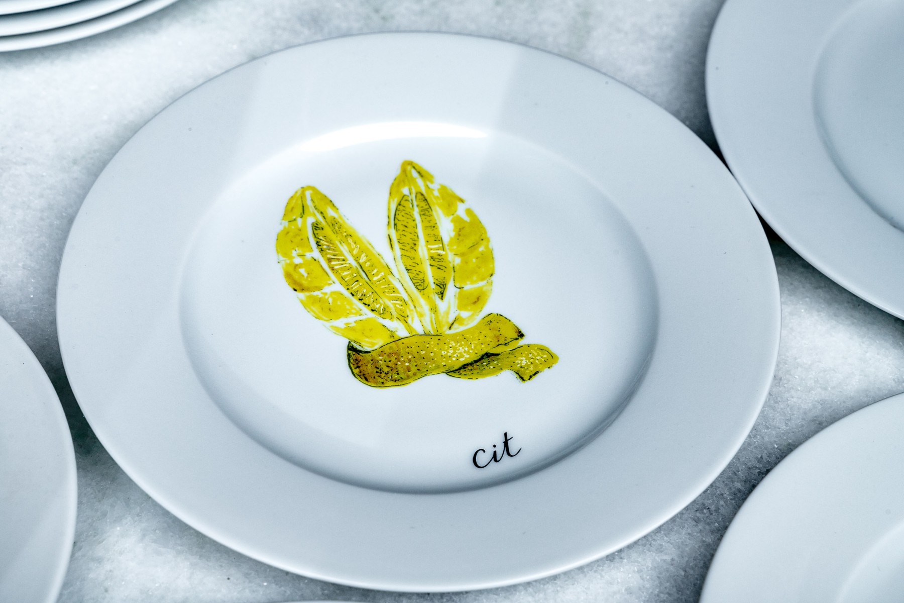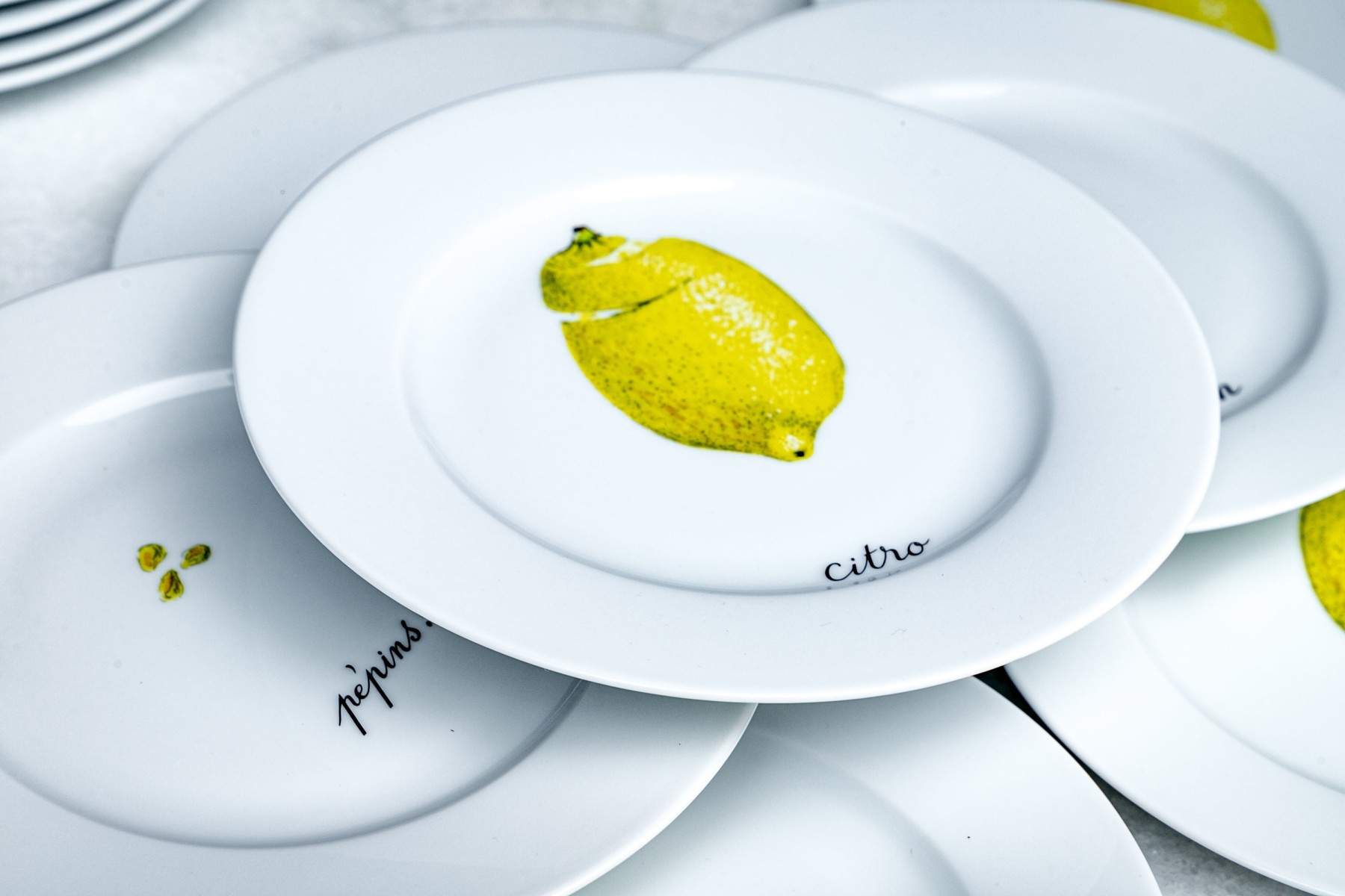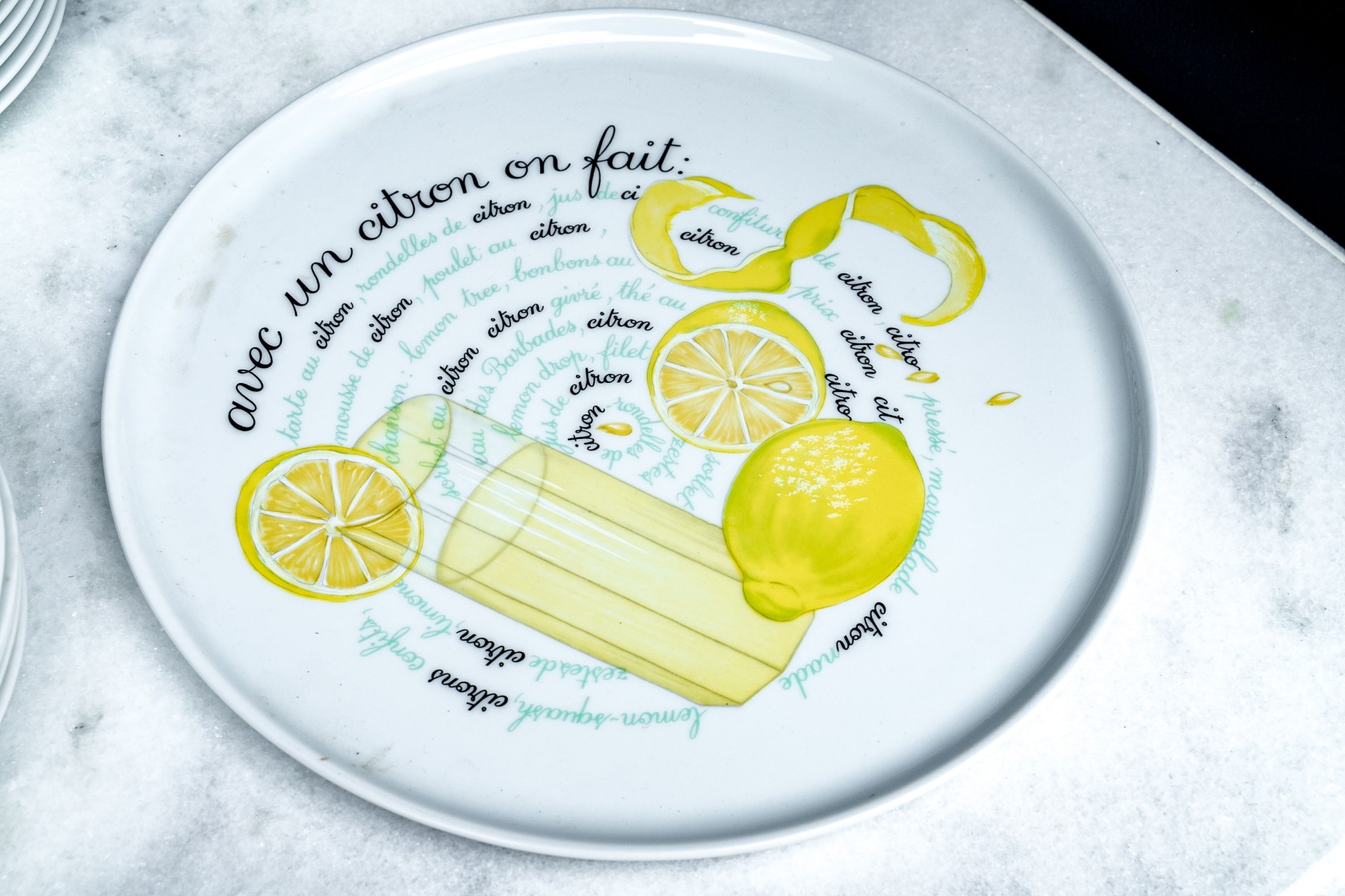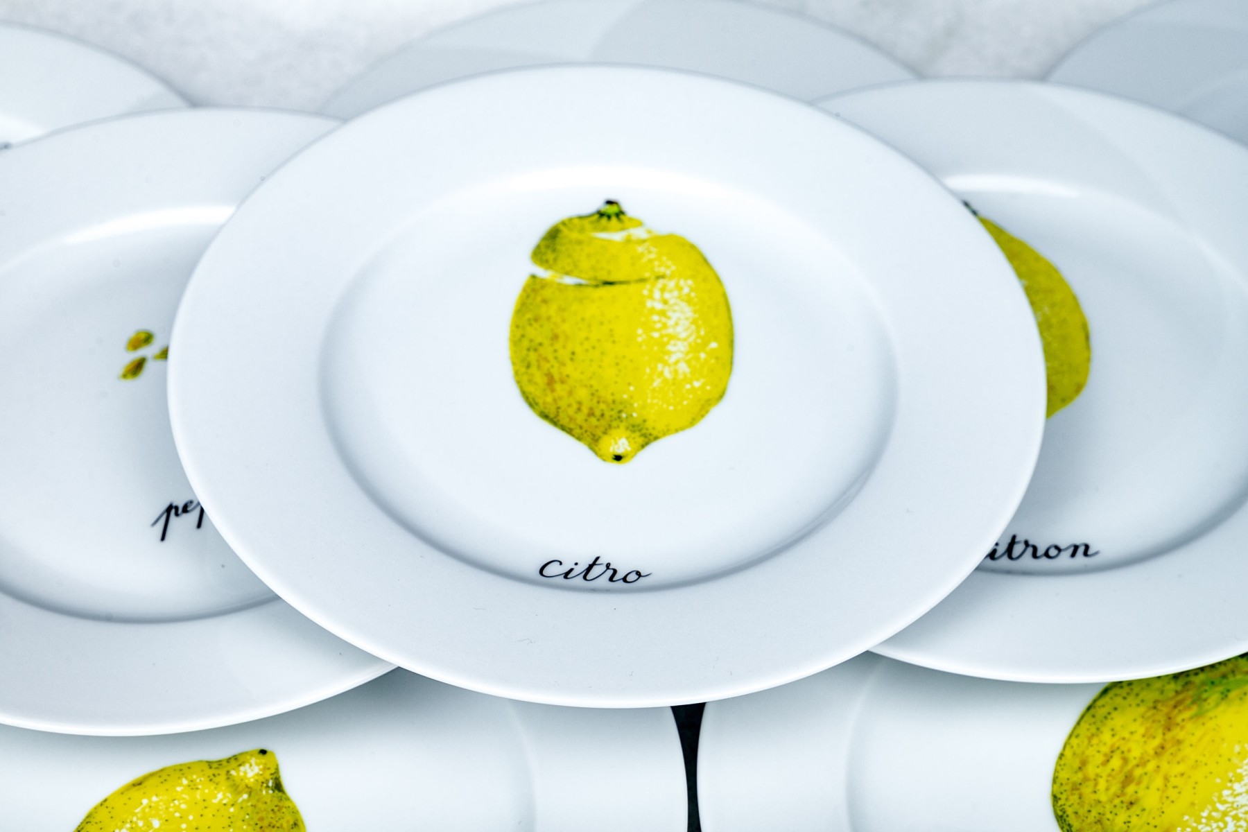 Comprised of 24 bread and butter dishes: 7 1/4" Dia, together with a larger serving platter: 11 3/4" Dia. All wonderfully decorated with citron lemons.