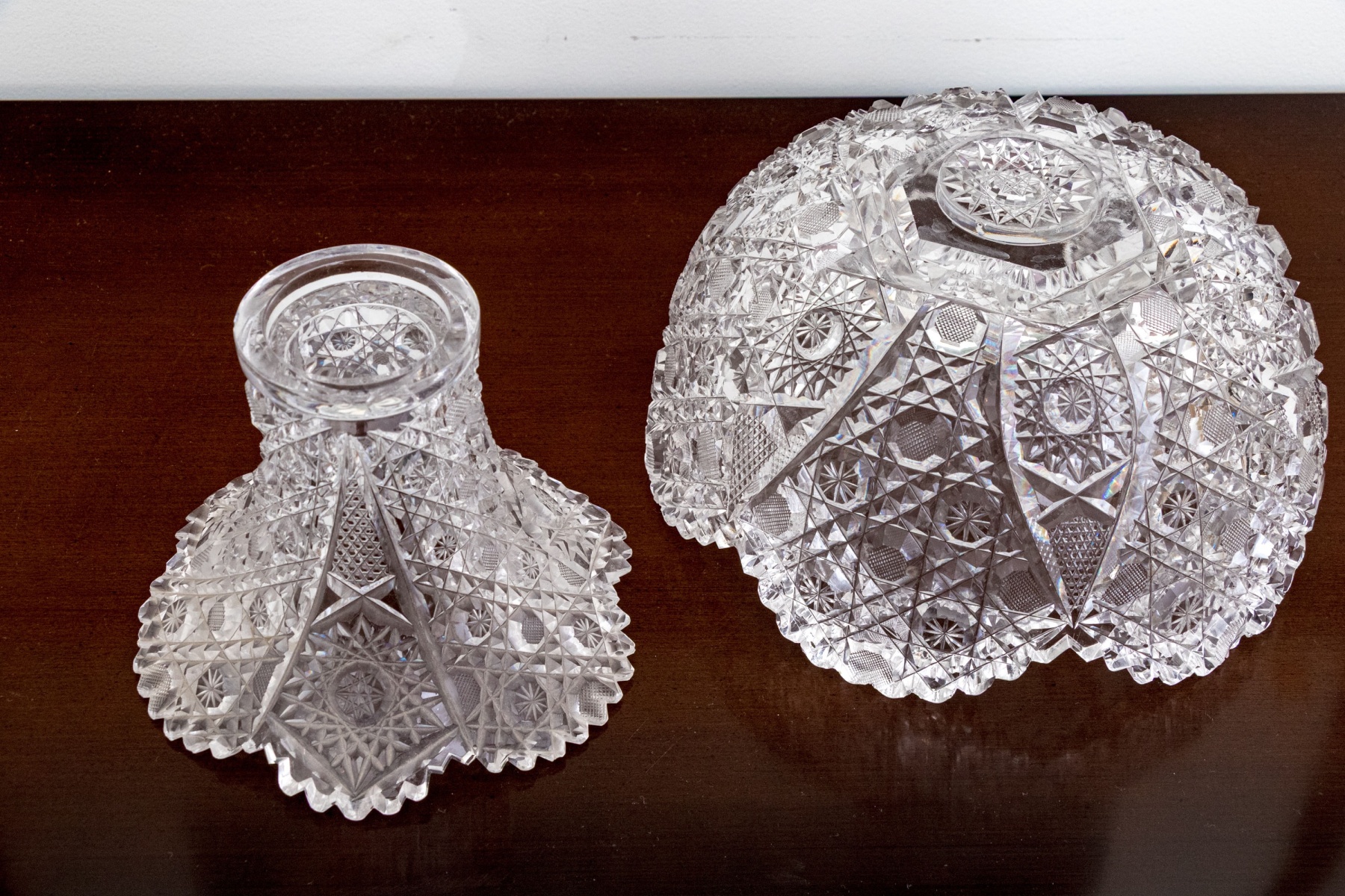 A stunning American brilliant cut crystal compote bowl in two sections with a base, and large incredibly decorative bowl with scalloped and sawtooth trim.