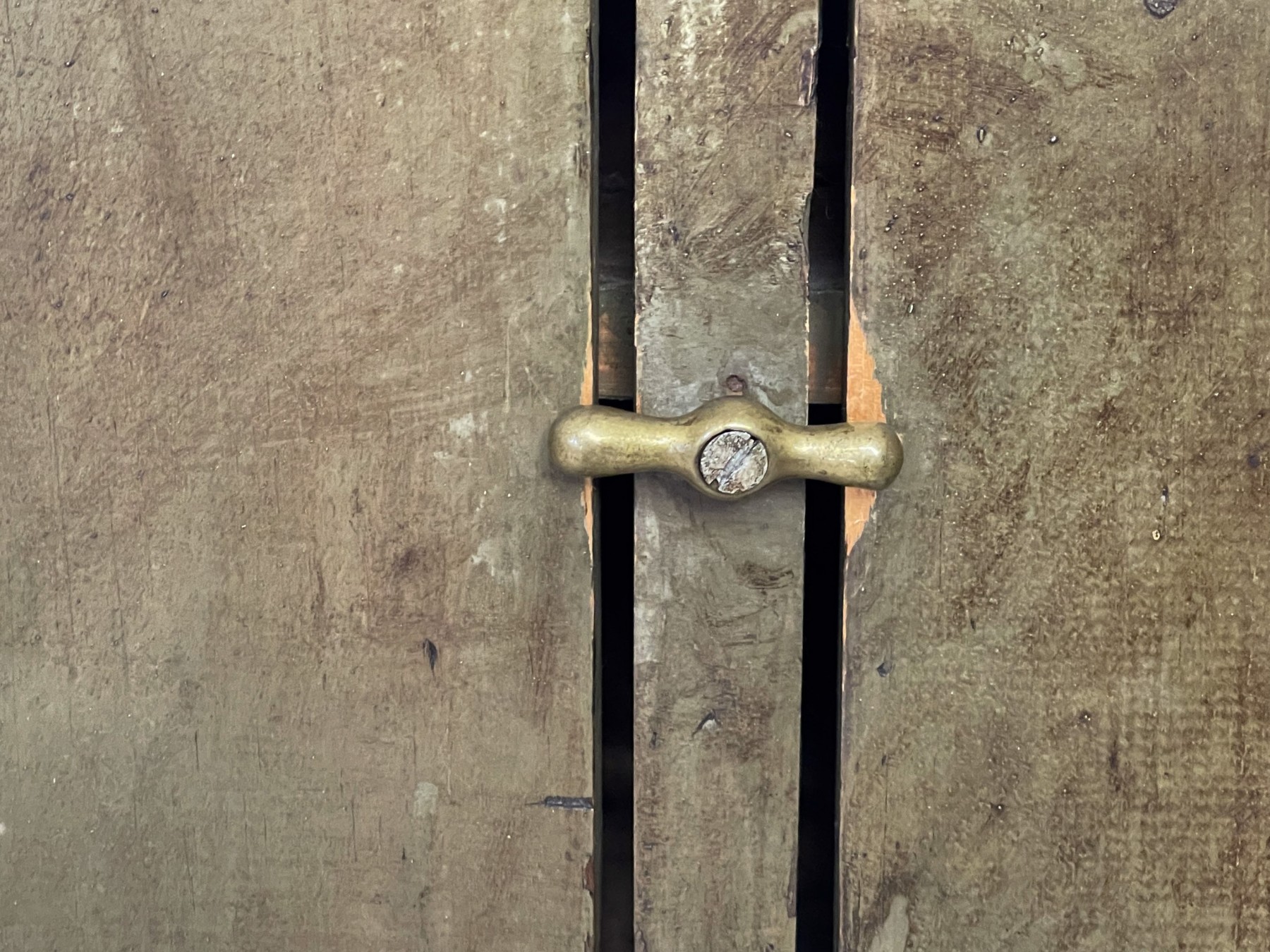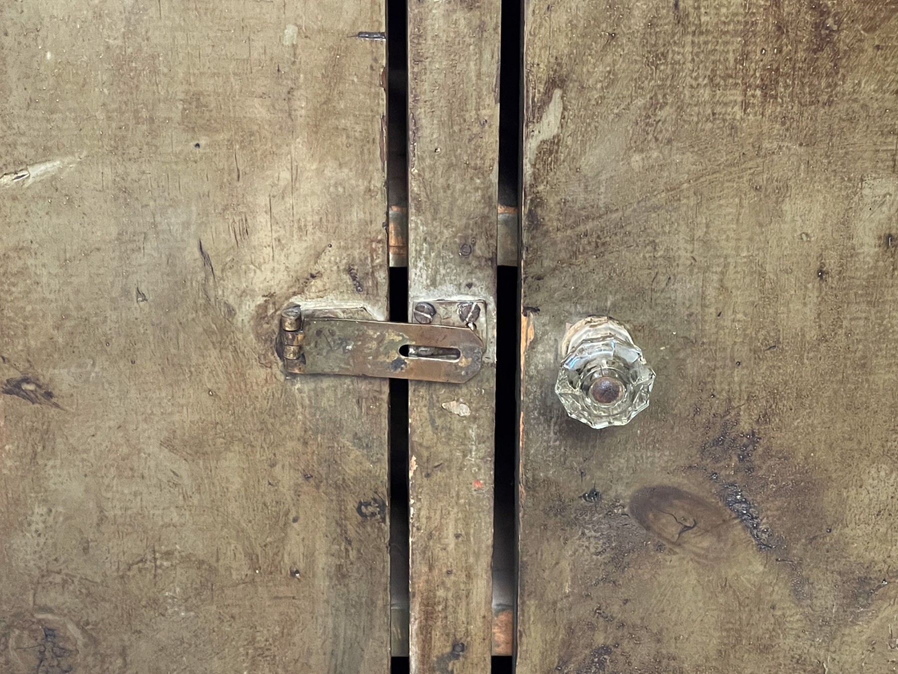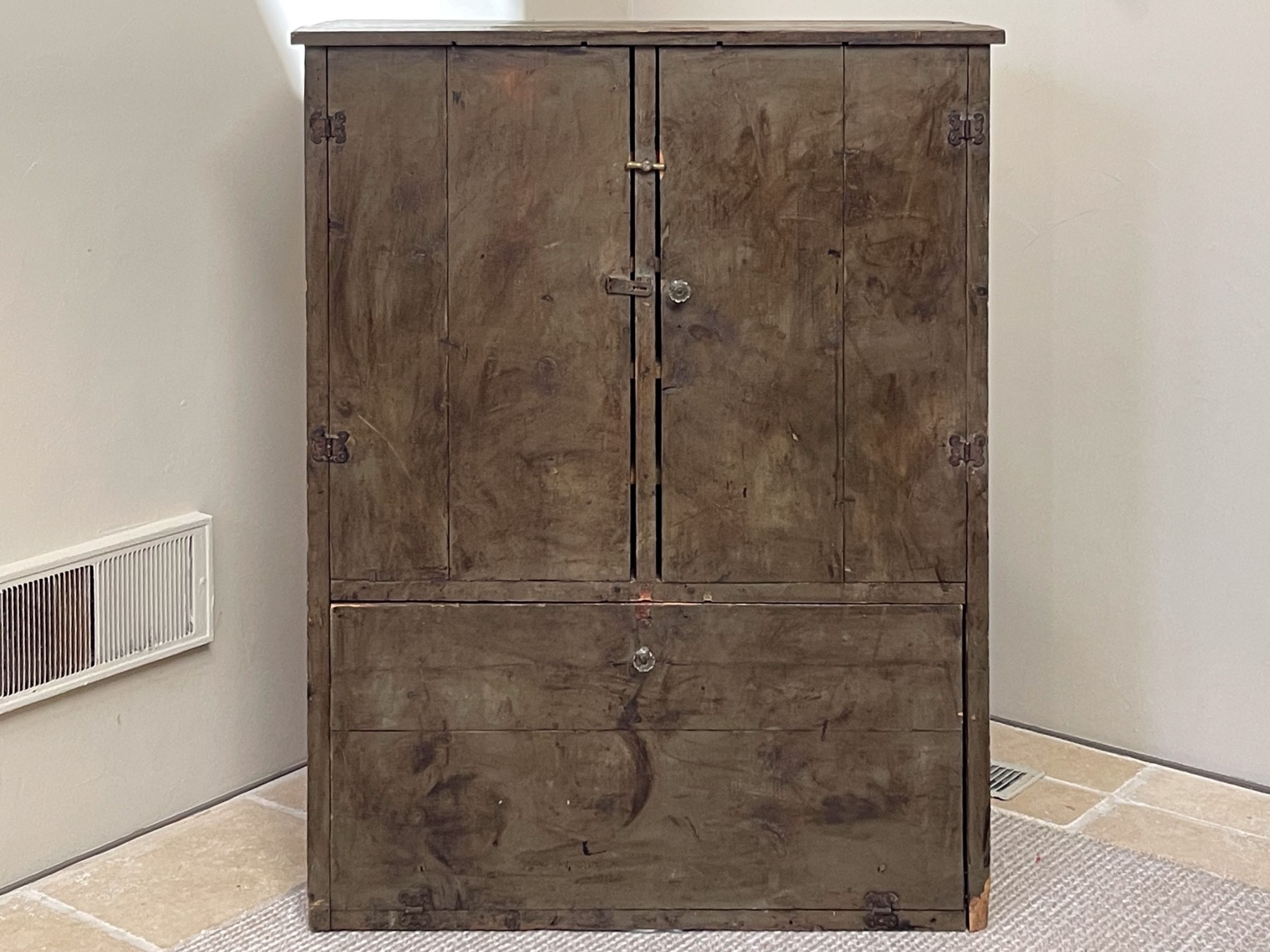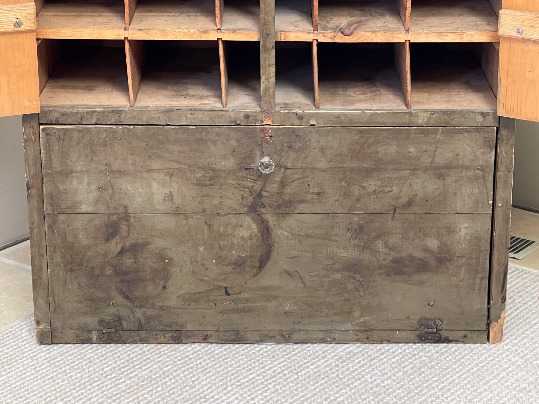 A unique apothecary chest having a single lower hinged door, with double doors to the top that open up to a plethora of shelving spaces.
