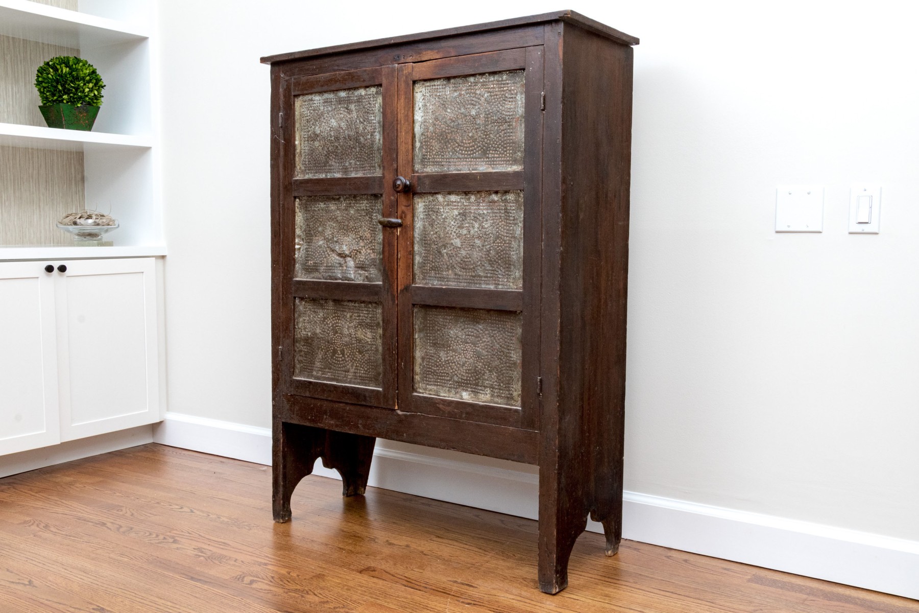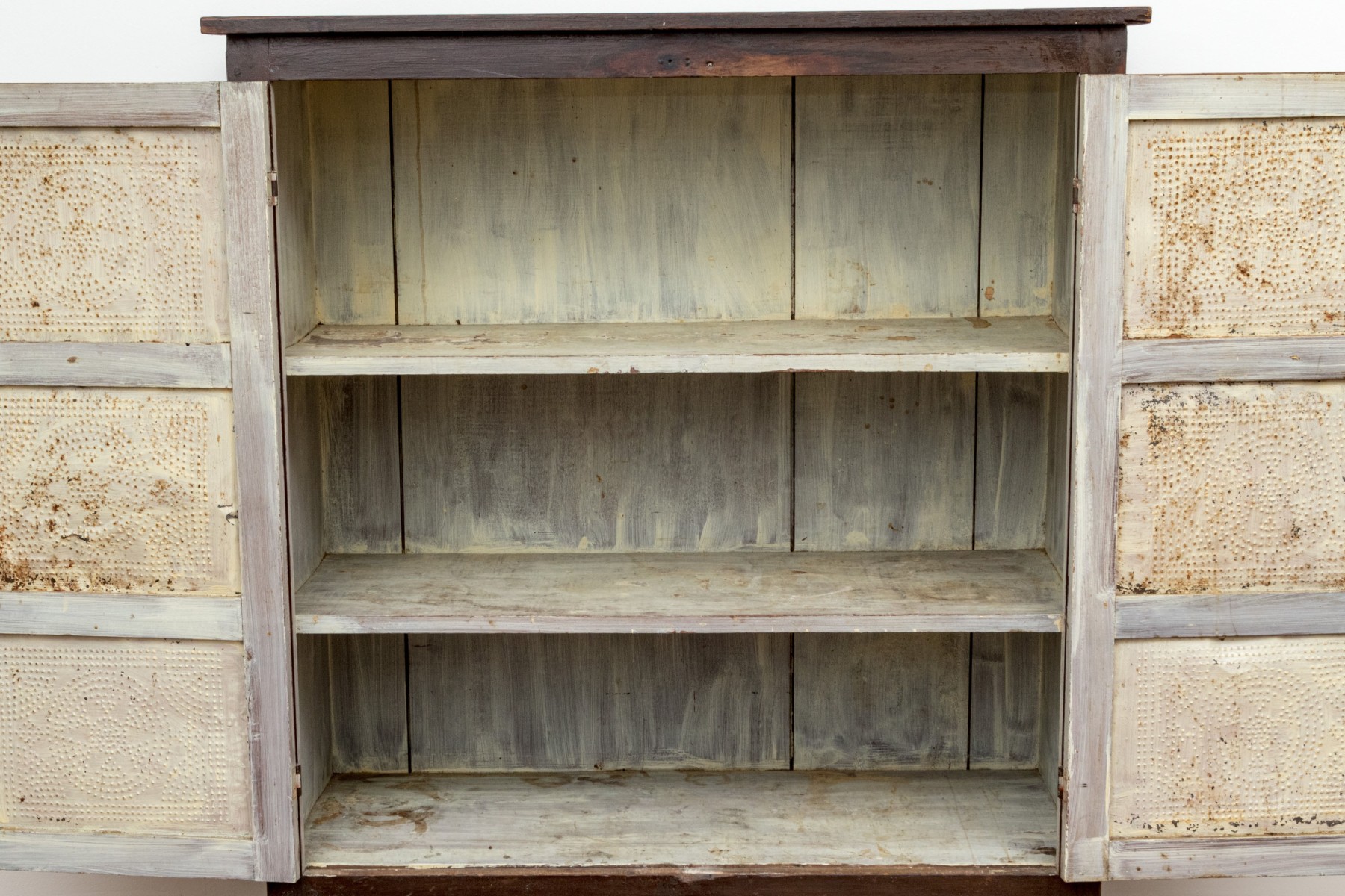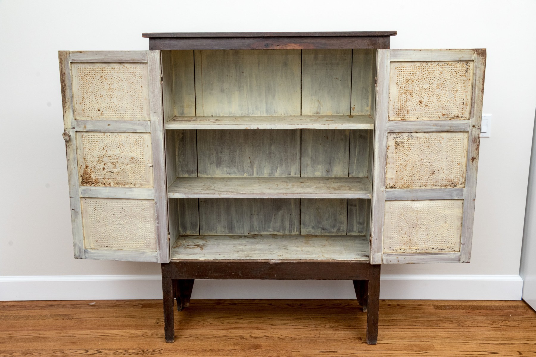 A fabulous and nicely aged farmhouse pie safe cabinet with a dark brown finished wood frame and double doors detailed with metal panels decorated with punched designs incorporating concentric circles and stippled borders. The doors open to a spacious, shelved interior with a cream whitewashed finish.