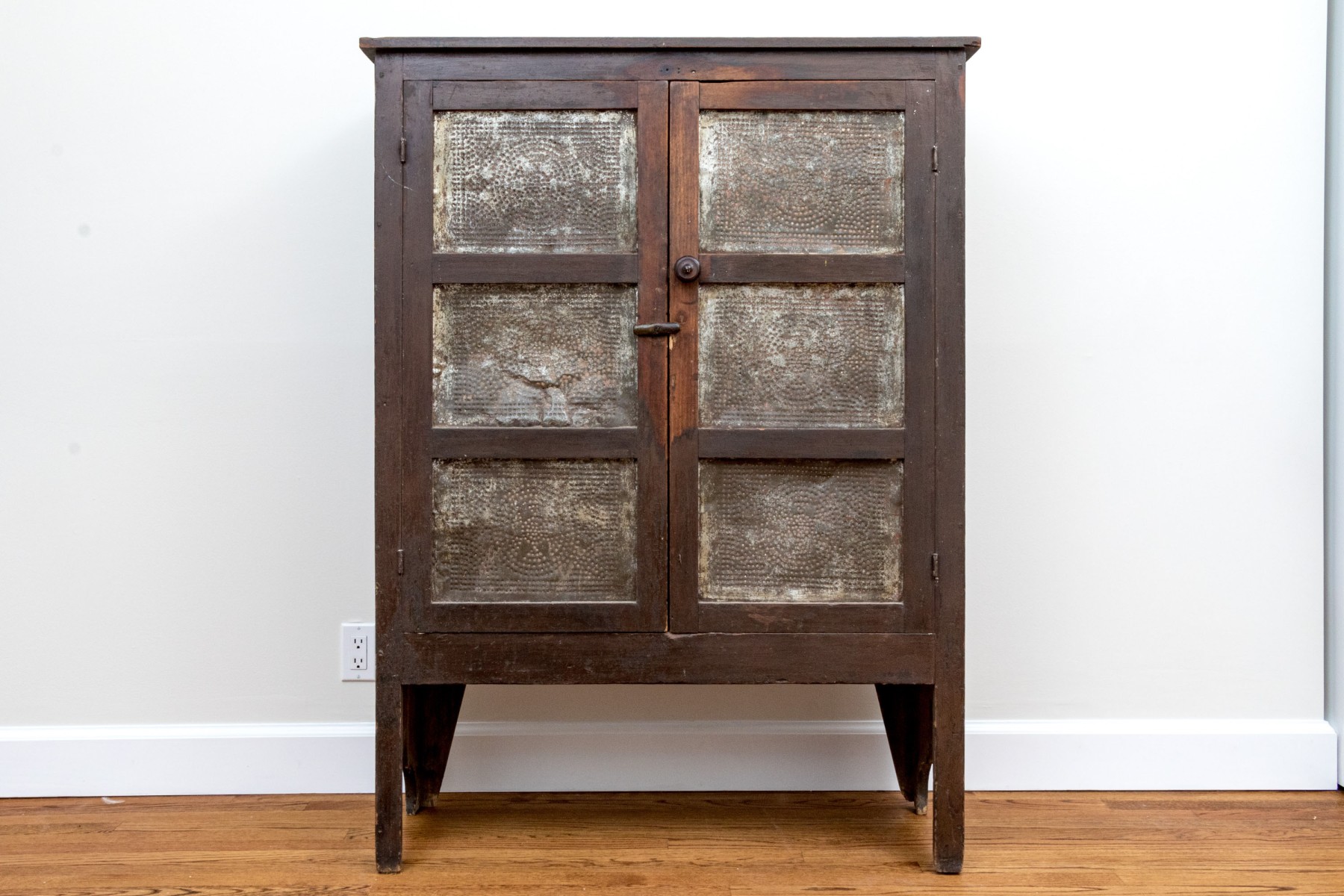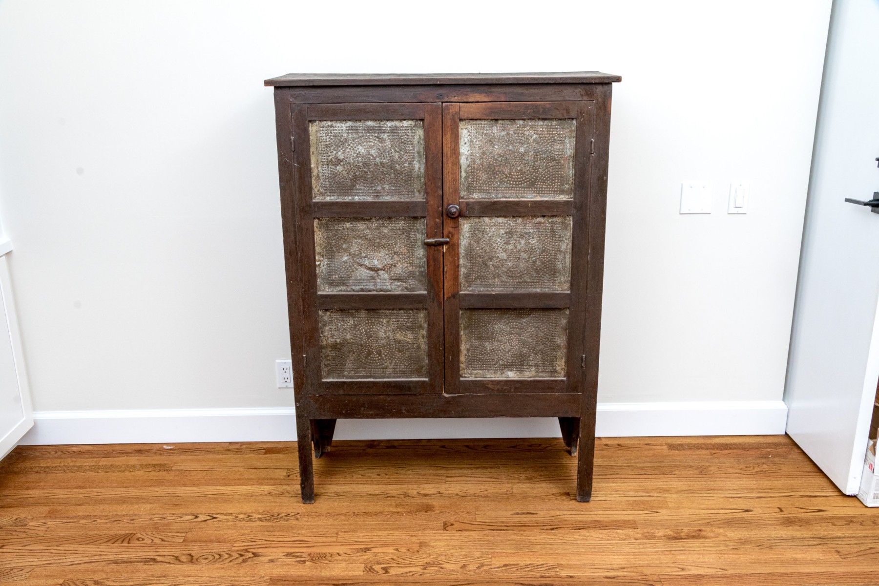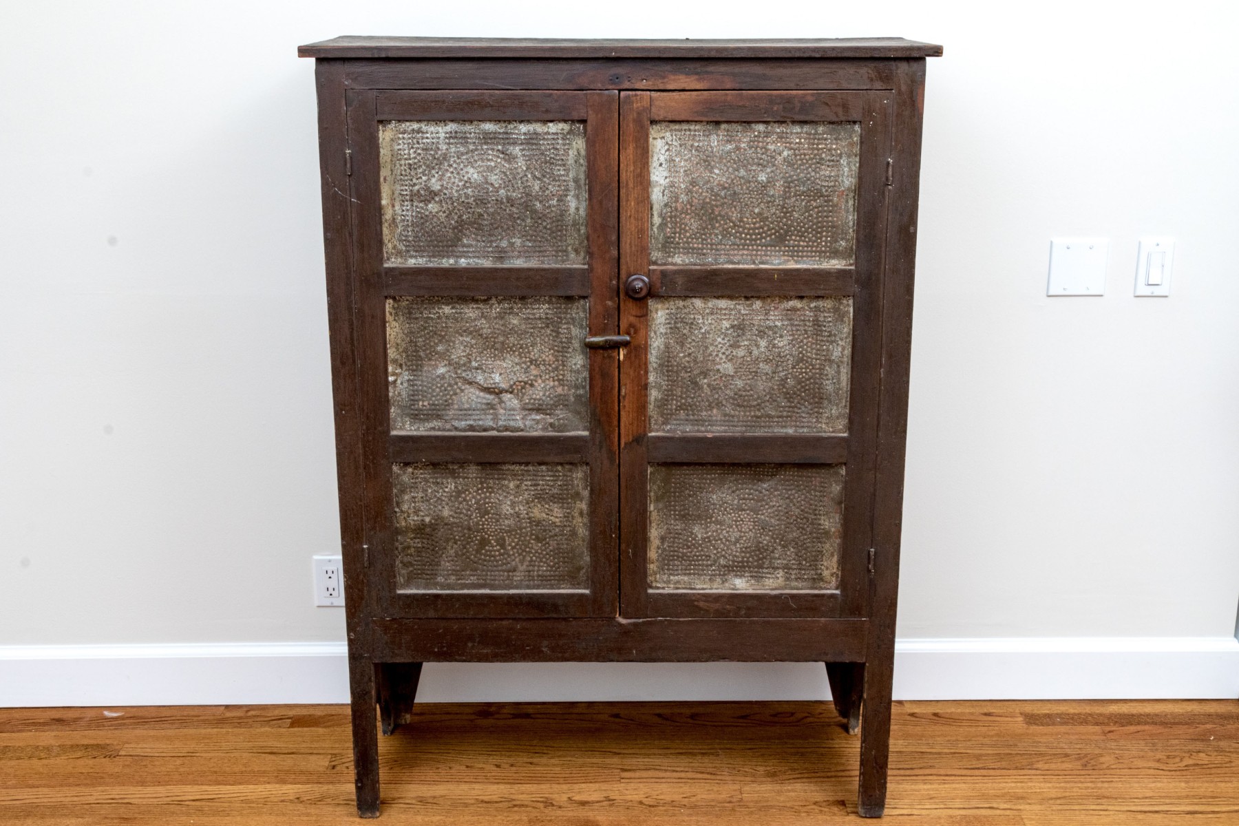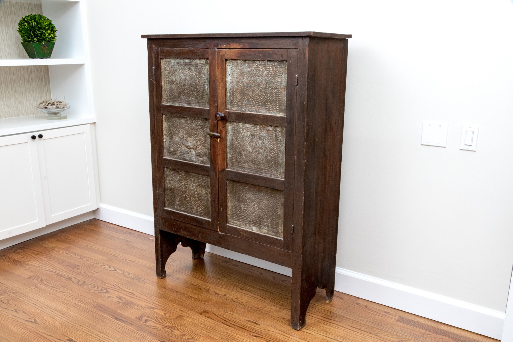 A fabulous and nicely aged farmhouse pie safe cabinet with a dark brown finished wood frame and double doors detailed with metal panels decorated with punched designs incorporating concentric circles and stippled borders. The doors open to a spacious, shelved interior with a cream whitewashed finish.