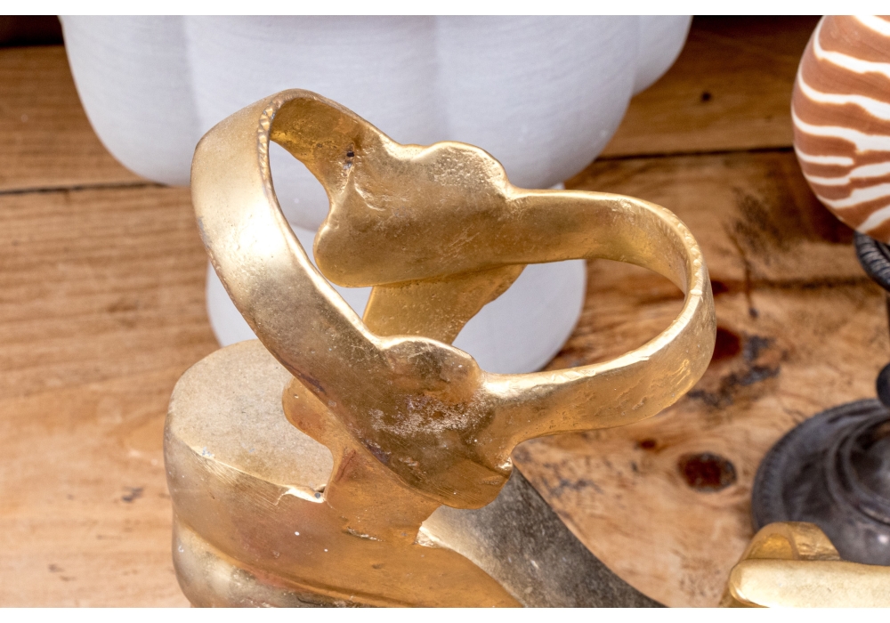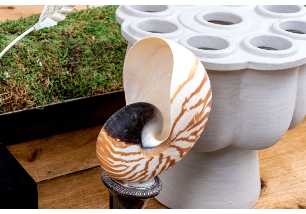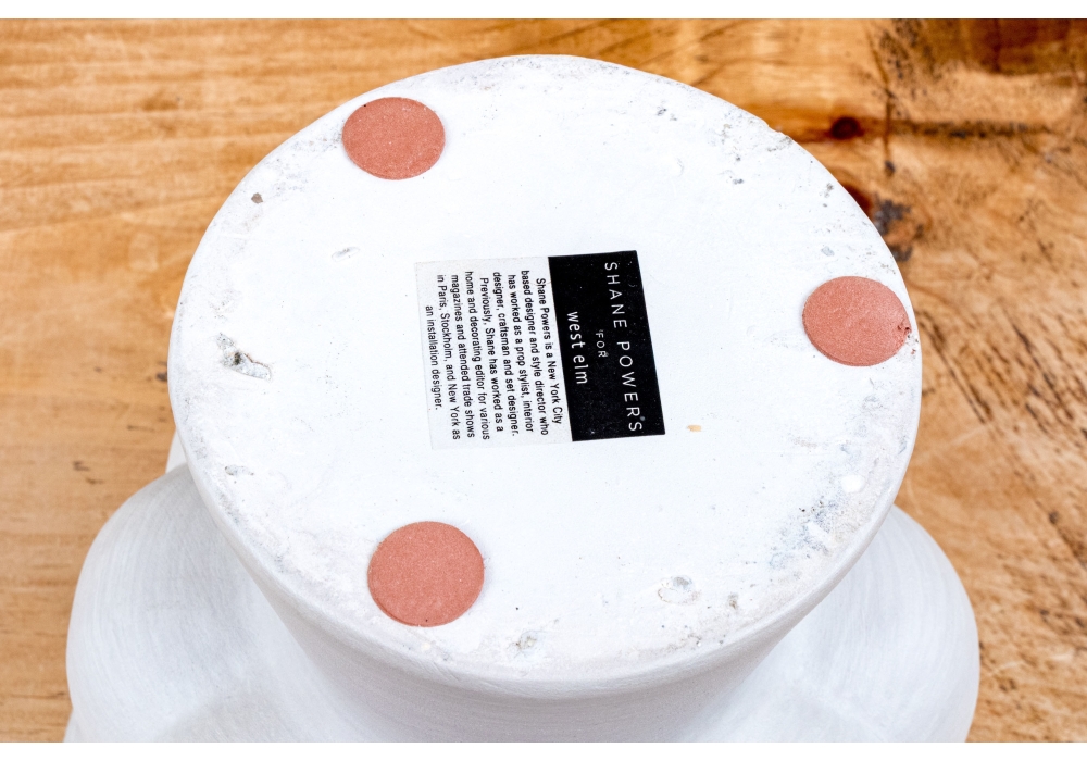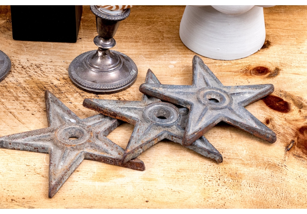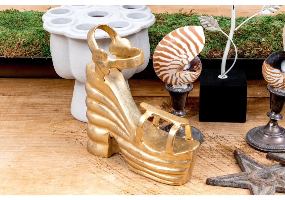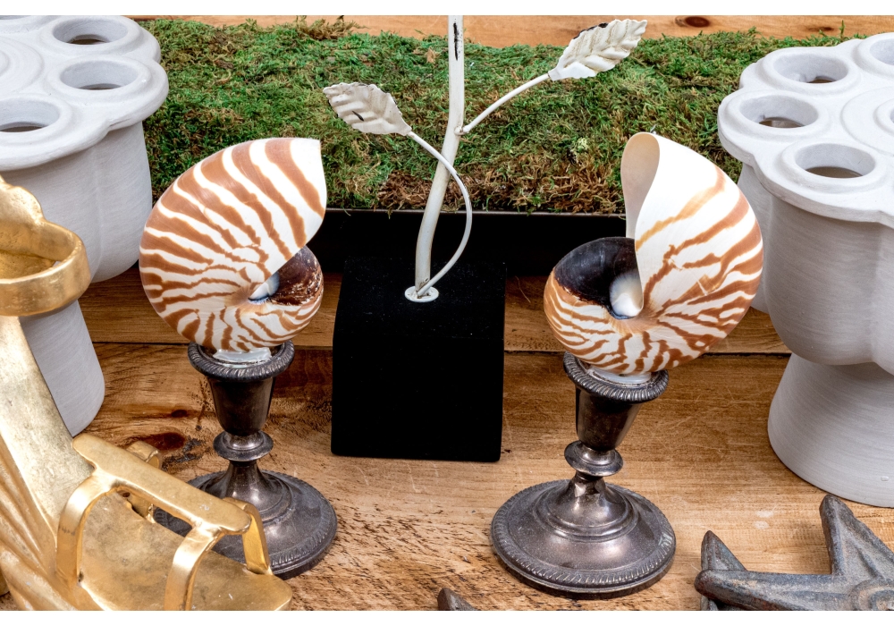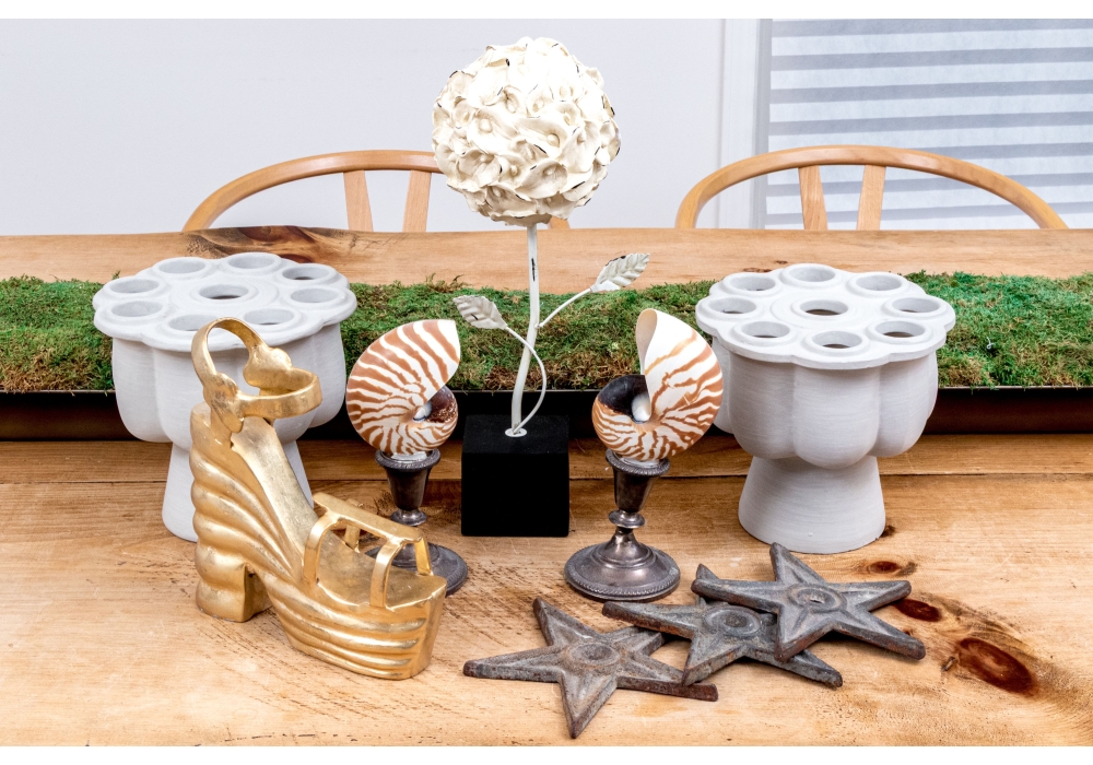 An excellent variety of tabletop decor, including a pair of Shane Powers for West Elm ceramic or cast stone lotus seed pod form flower frog vases, an Entrada Collection Inc. white tole hydrangea form topiary figure on a black base, a Nima Oberoi Lunares gilt metal bookend in the form of a high heel sandal, a pair of Fisher weighted sterling candlesticks mounted with nautilus shells, and a collection of three cast iron star form washers.