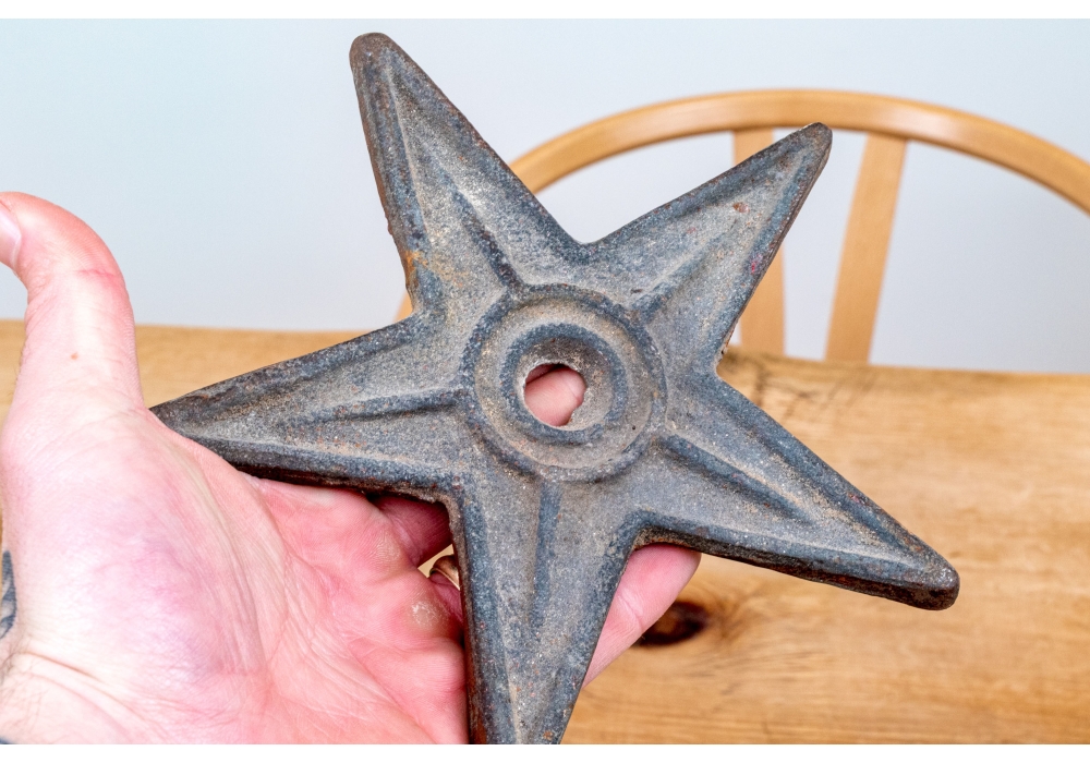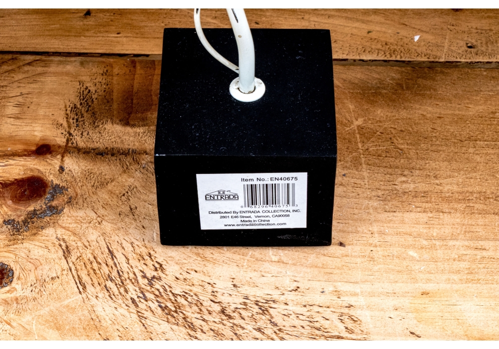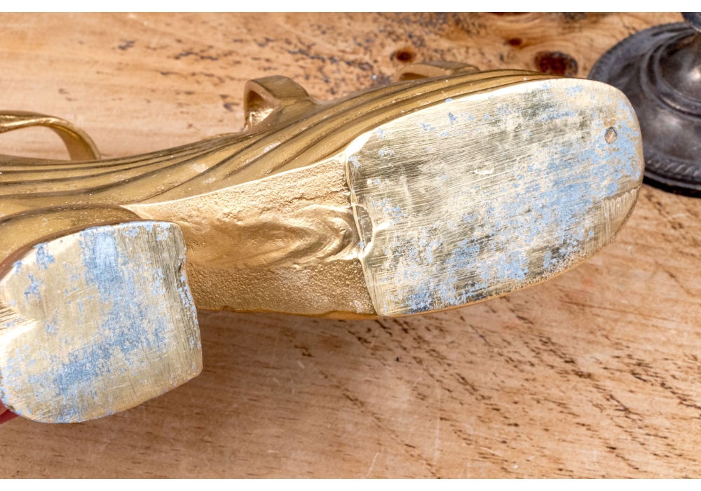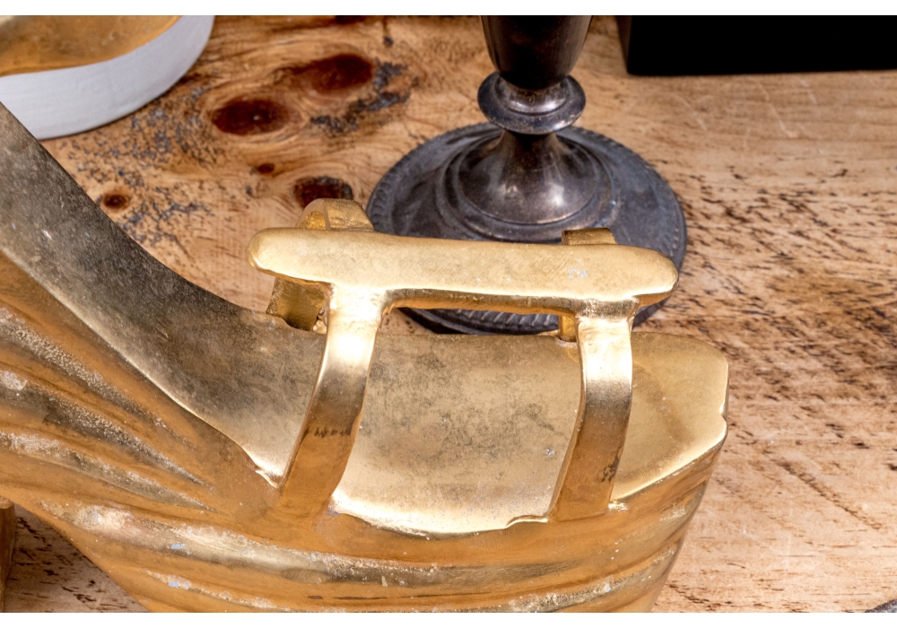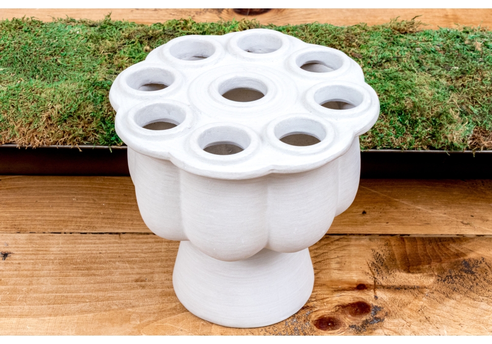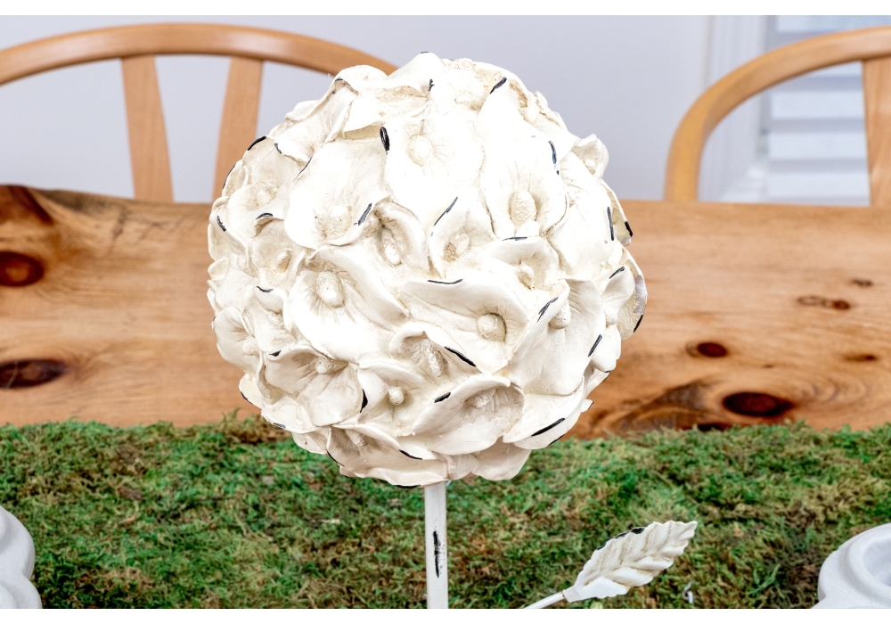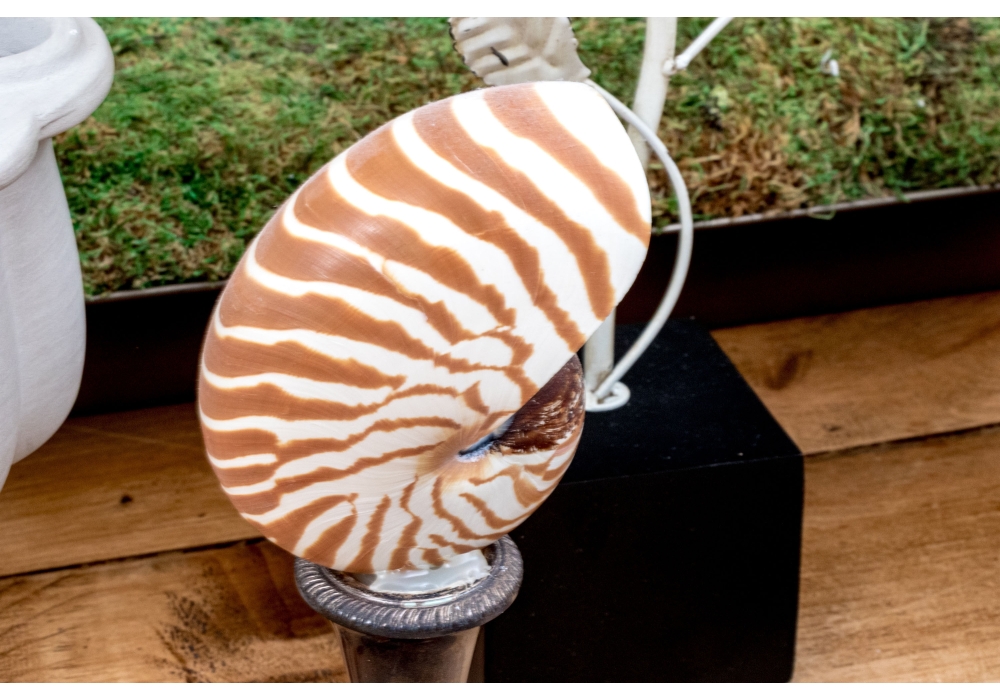 An excellent variety of tabletop decor, including a pair of Shane Powers for West Elm ceramic or cast stone lotus seed pod form flower frog vases, an Entrada Collection Inc. white tole hydrangea form topiary figure on a black base, a Nima Oberoi Lunares gilt metal bookend in the form of a high heel sandal, a pair of Fisher weighted sterling candlesticks mounted with nautilus shells, and a collection of three cast iron star form washers.