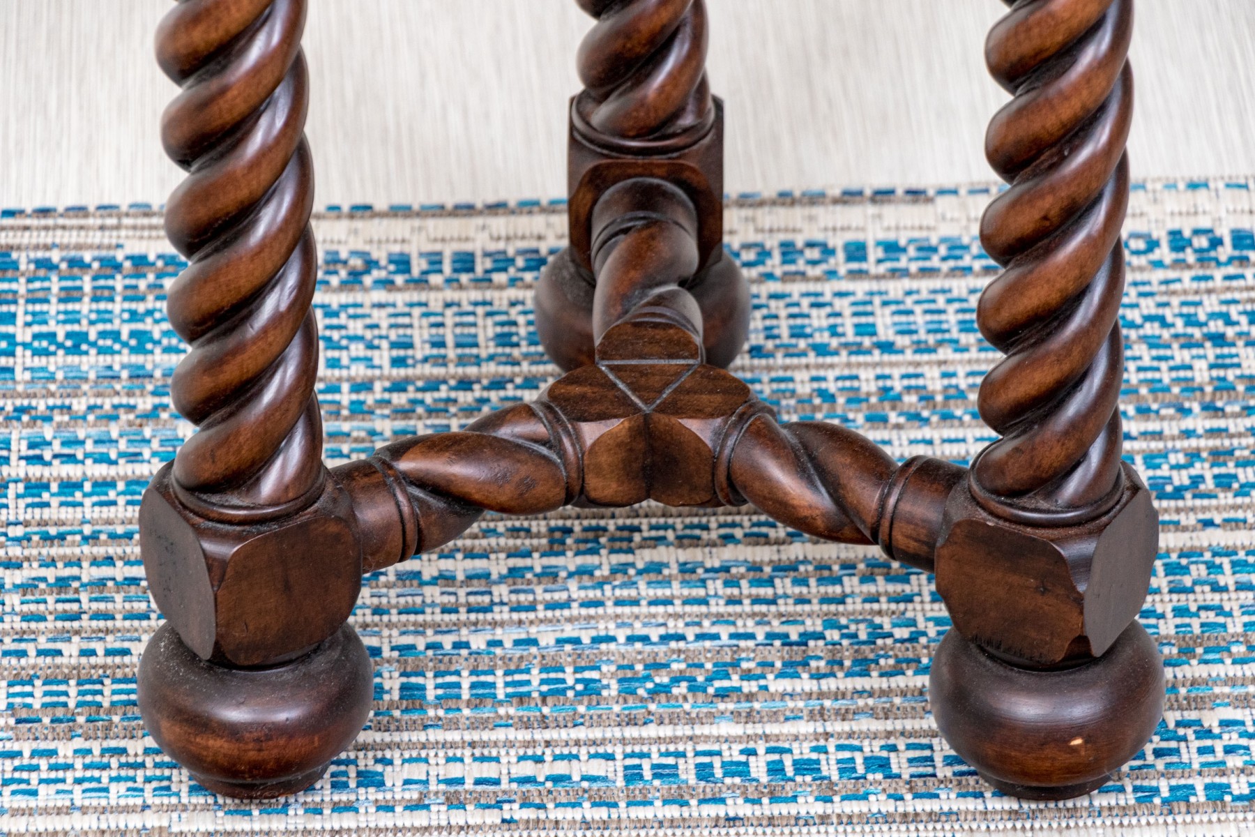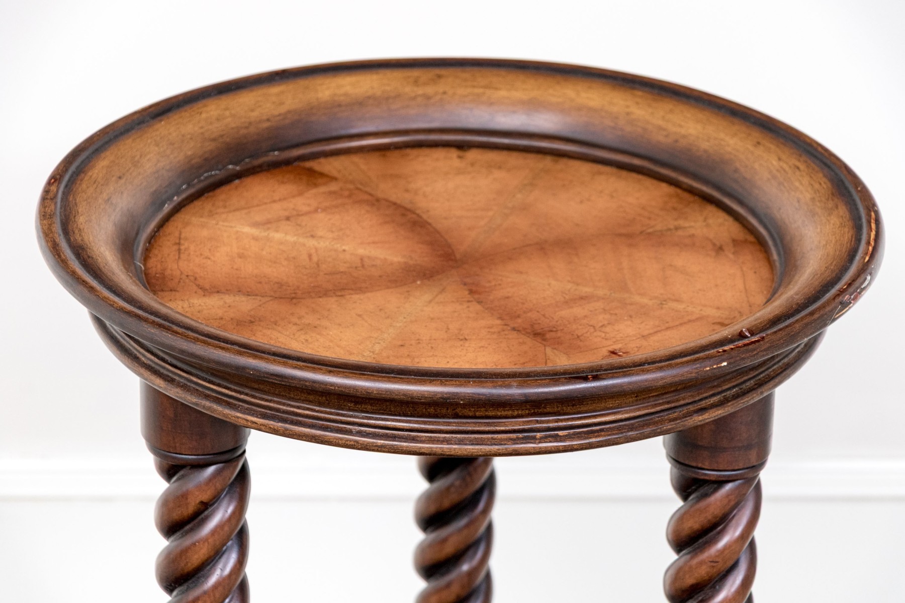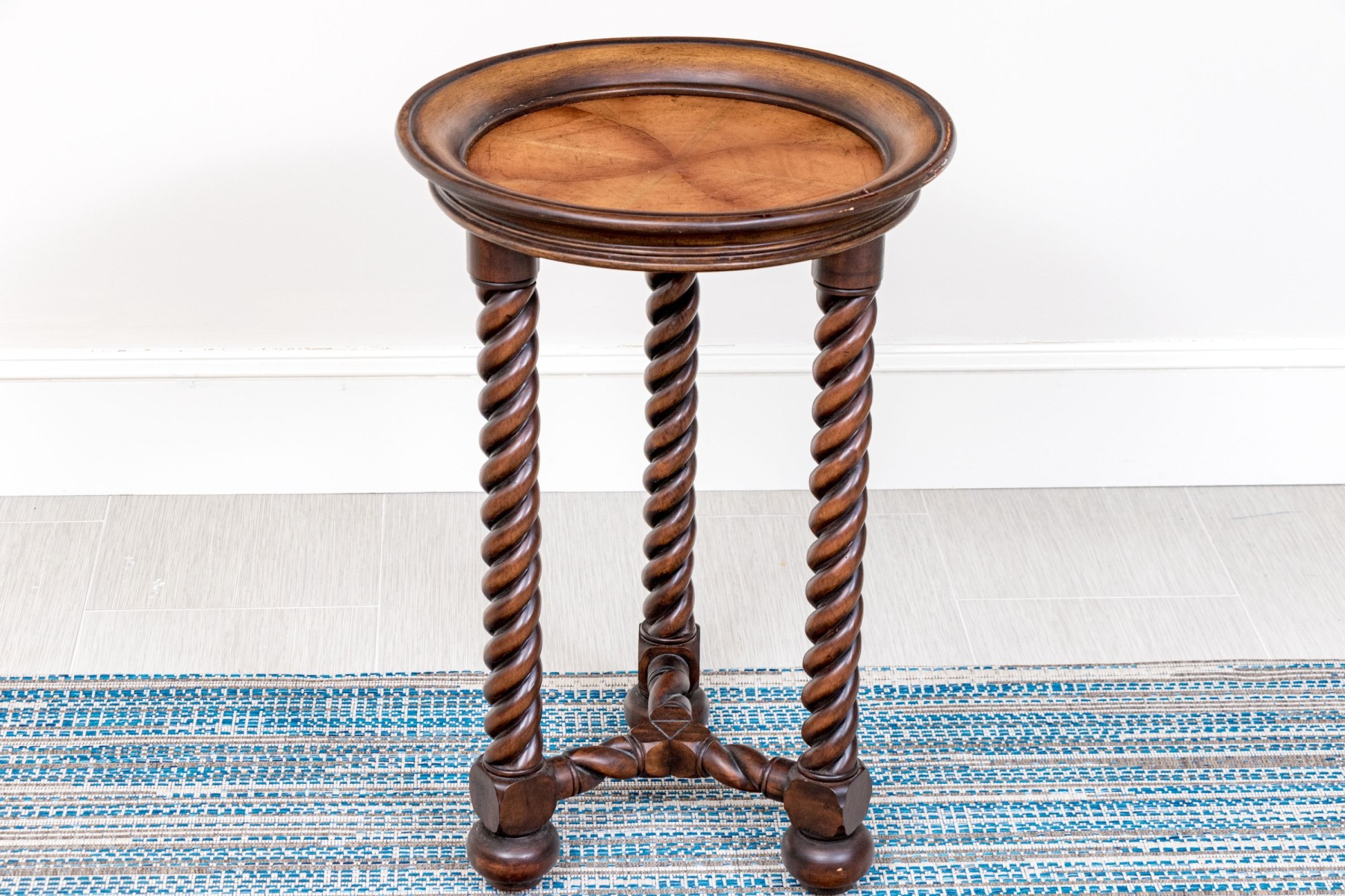 A fabulous end table featuring an affixed circular top with a sloped gallery raised on three excellent barley twist carved legs over bun feet with a Y-form barley twitch stretcher.