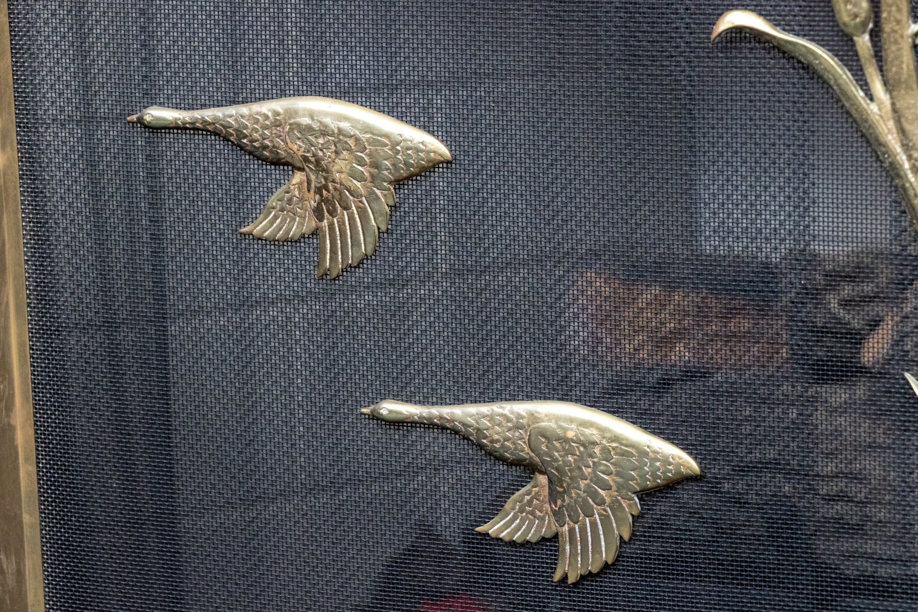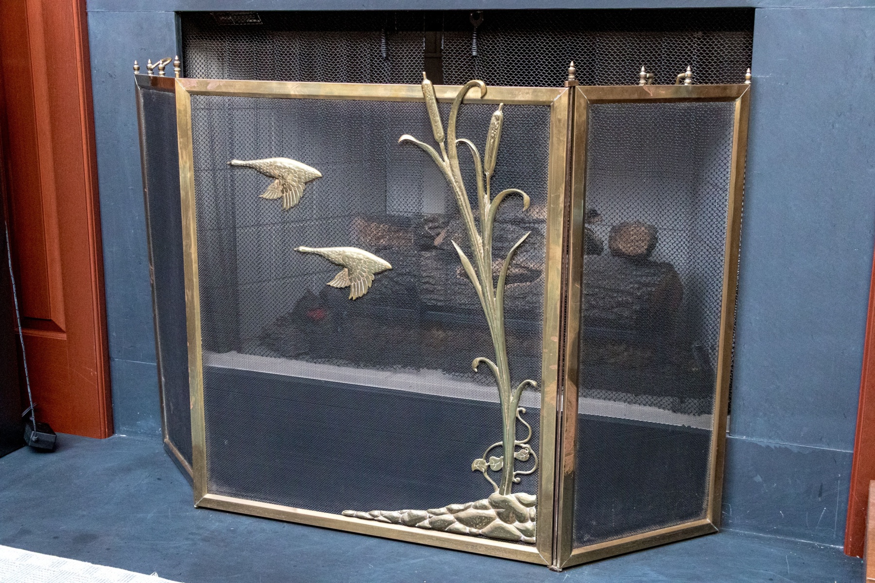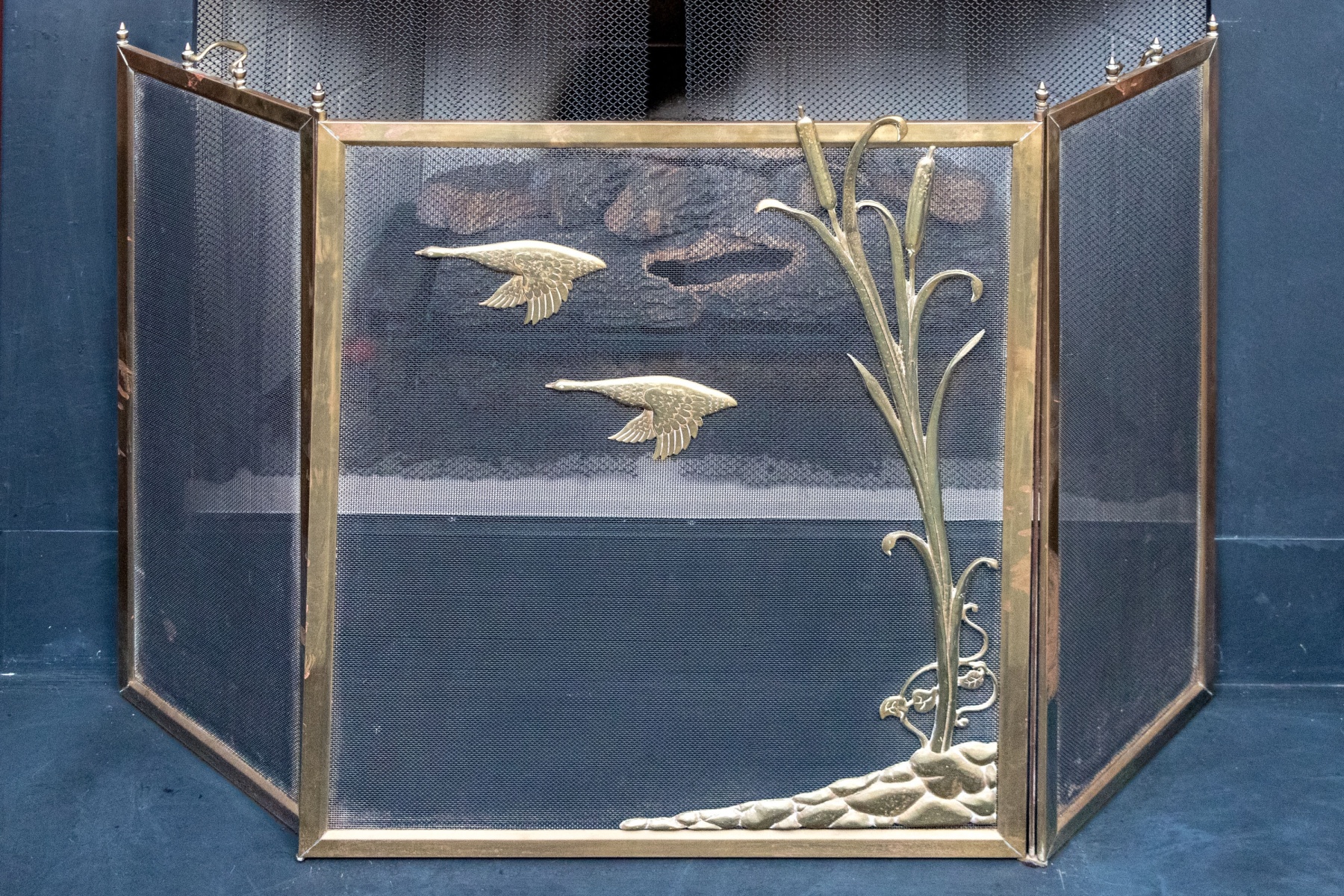 A fantastic fire spark screen featuring three panels with larger central panel having brass frame and decorative overlay with two swans in flight with seat grasses and vegetation. Two finials on either end of each of the tree panels with handles atop the flanking thinner brass framed panels.