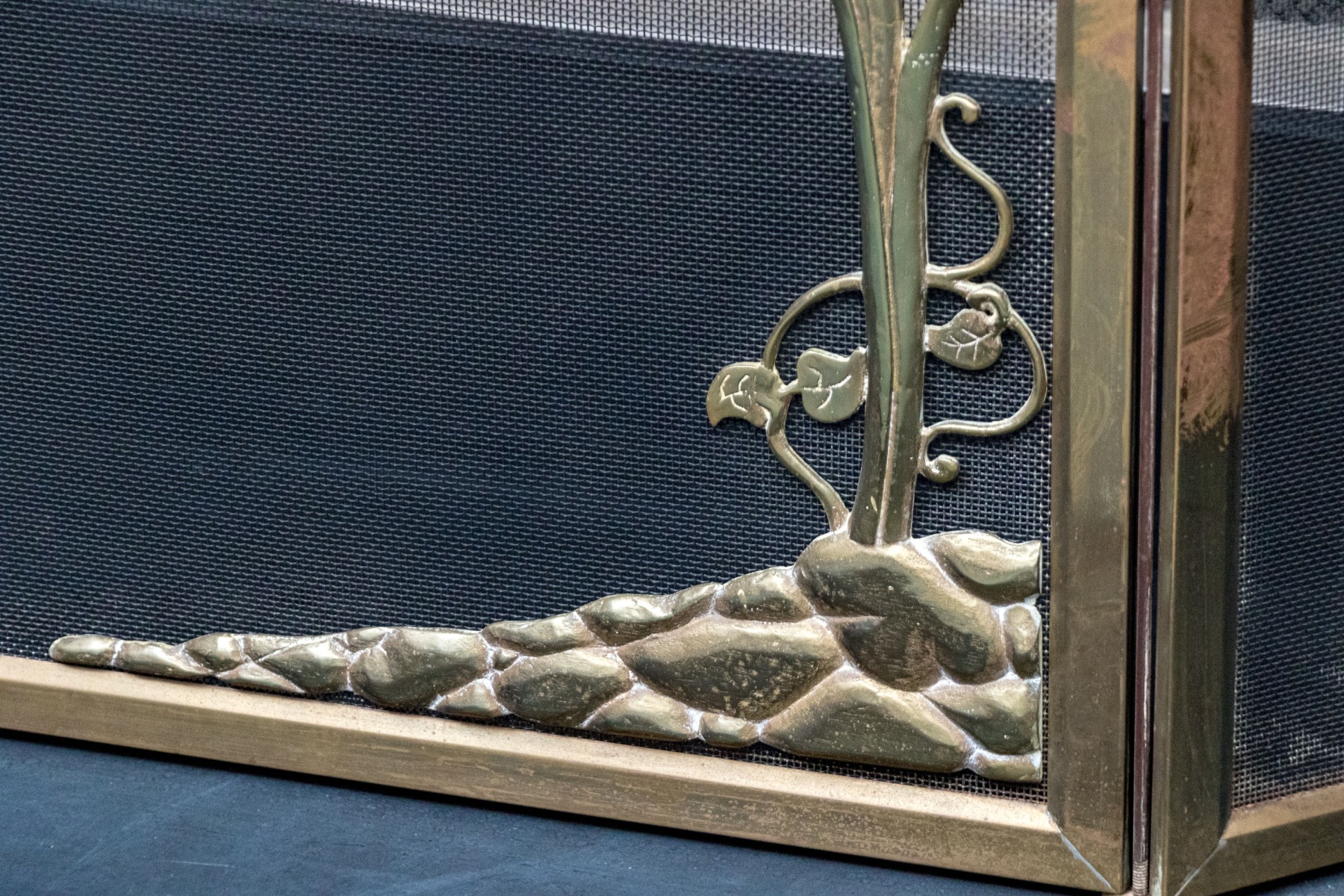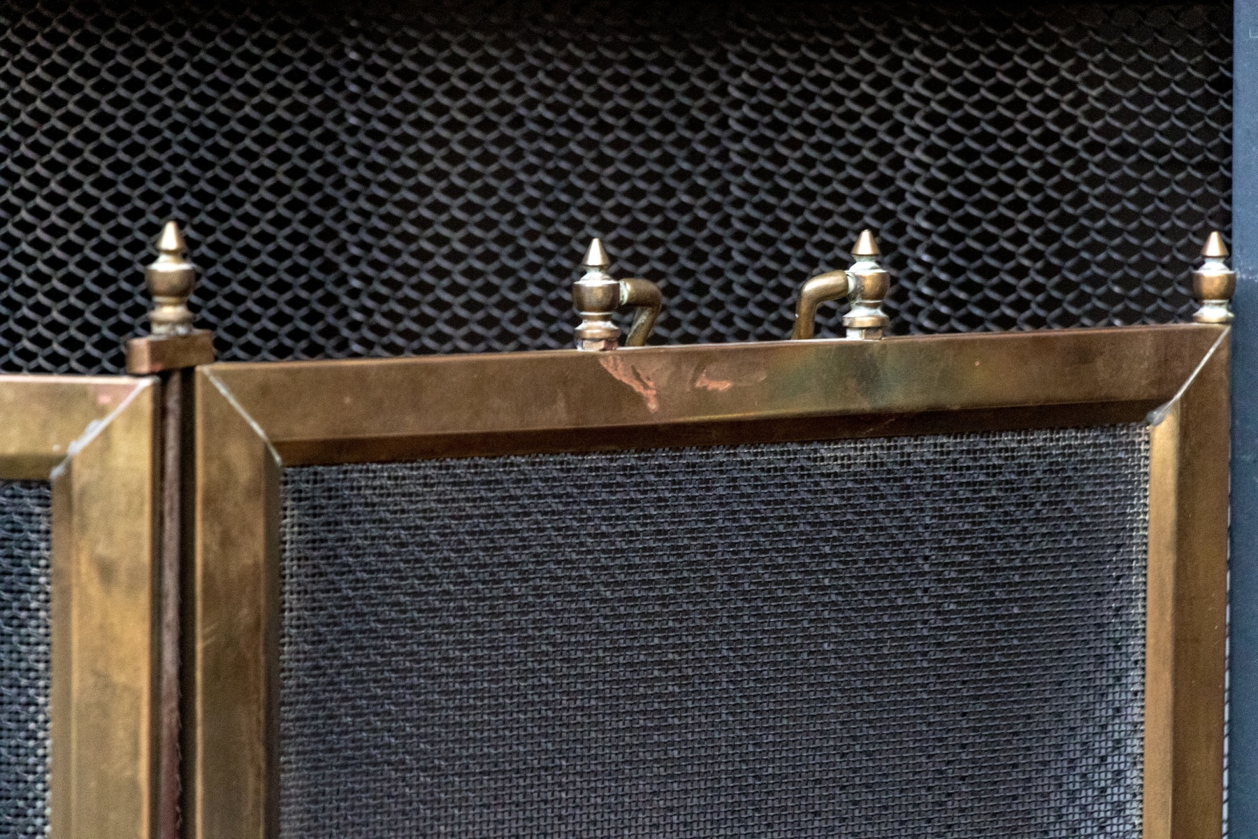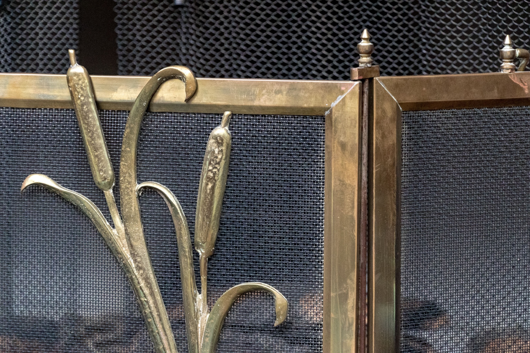 A fantastic fire spark screen featuring three panels with larger central panel having brass frame and decorative overlay with two swans in flight with seat grasses and vegetation. Two finials on either end of each of the tree panels with handles atop the flanking thinner brass framed panels.
