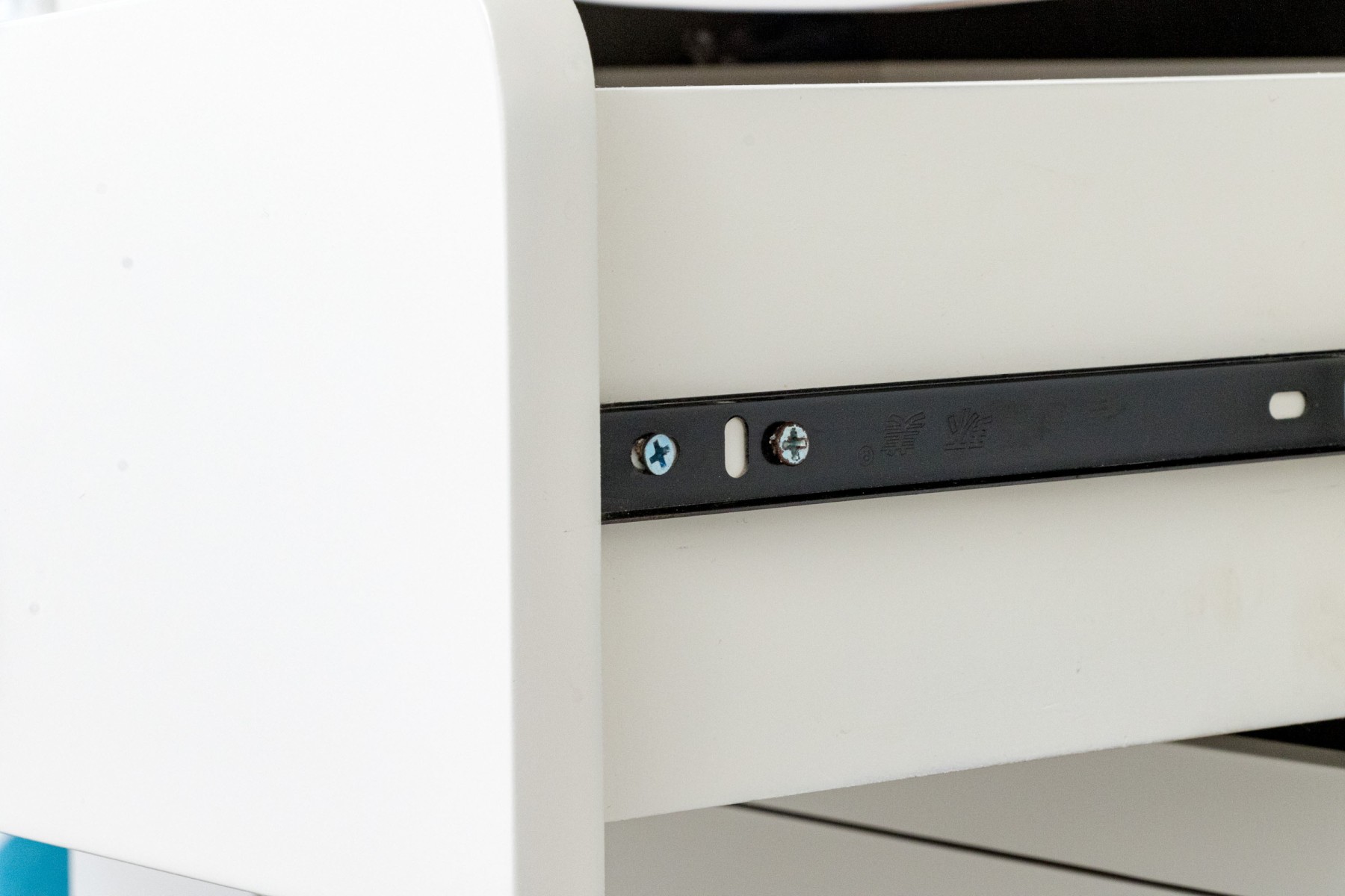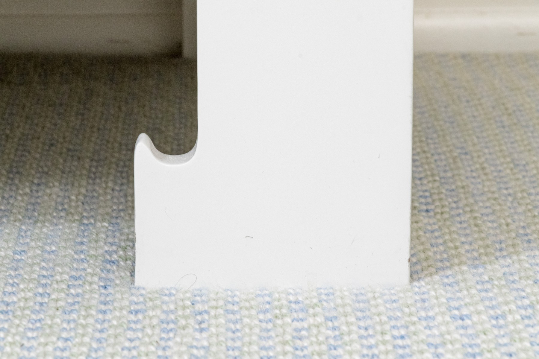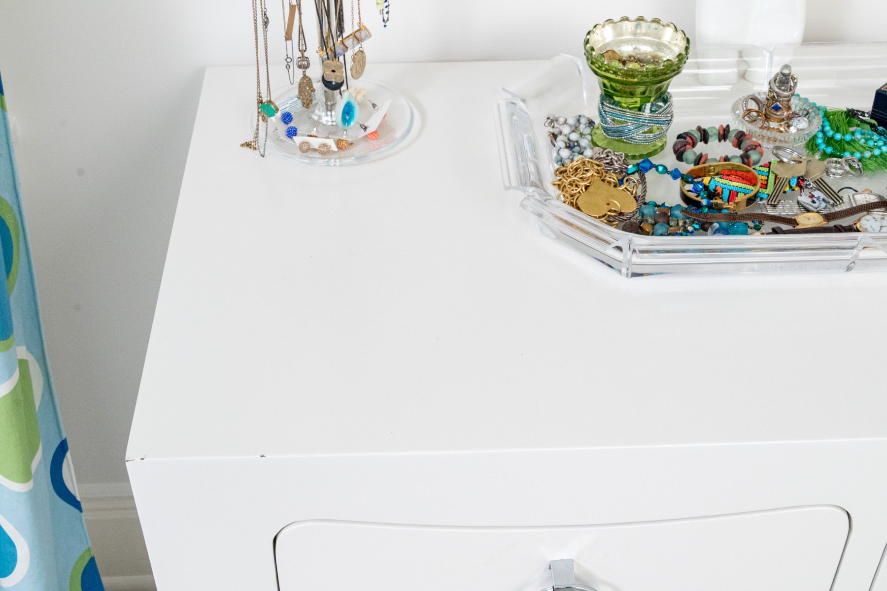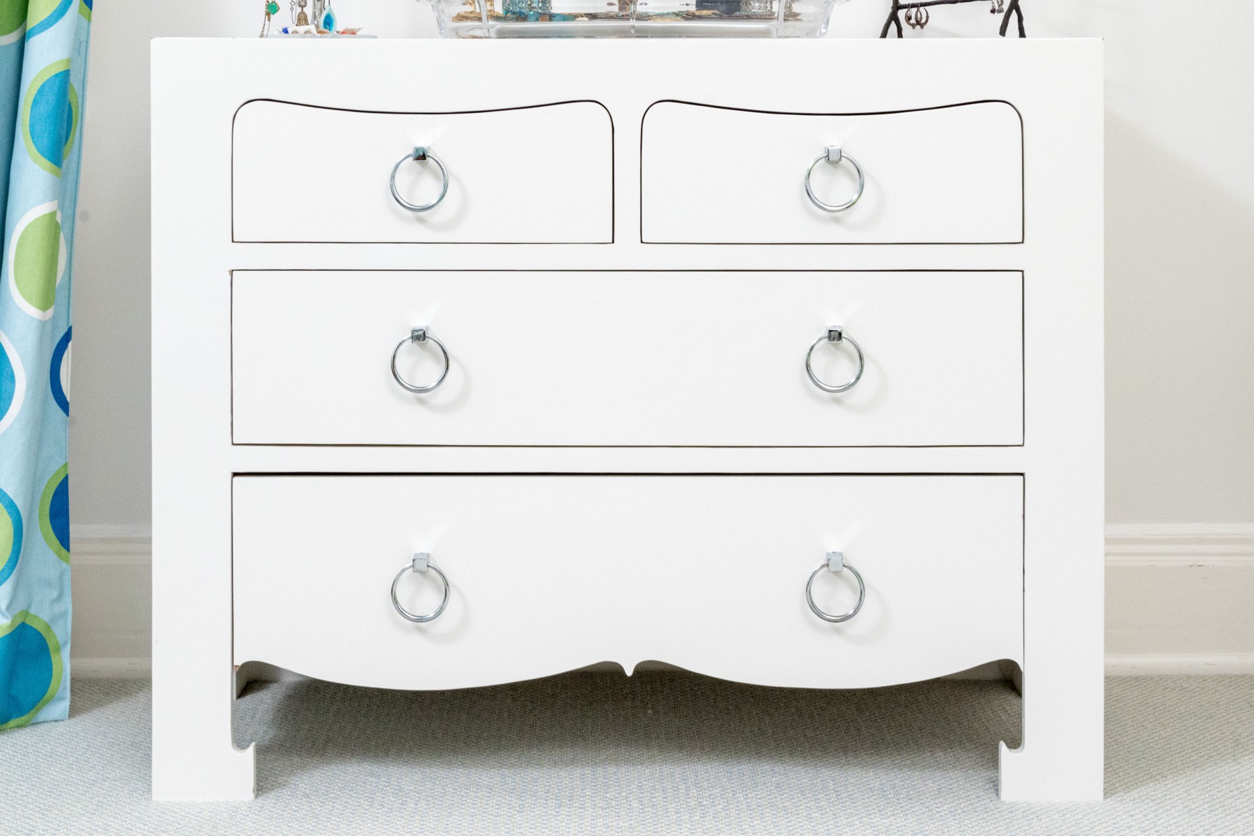 This lovely dresser is comprised of two short drawers over two longer drawers, all with silver pull handles. The dresser has a unique scalloped apron and is raised on legs that curl inward. All of the drawers easily slide out. Does not include items on top of dresser. Purchased for $770.