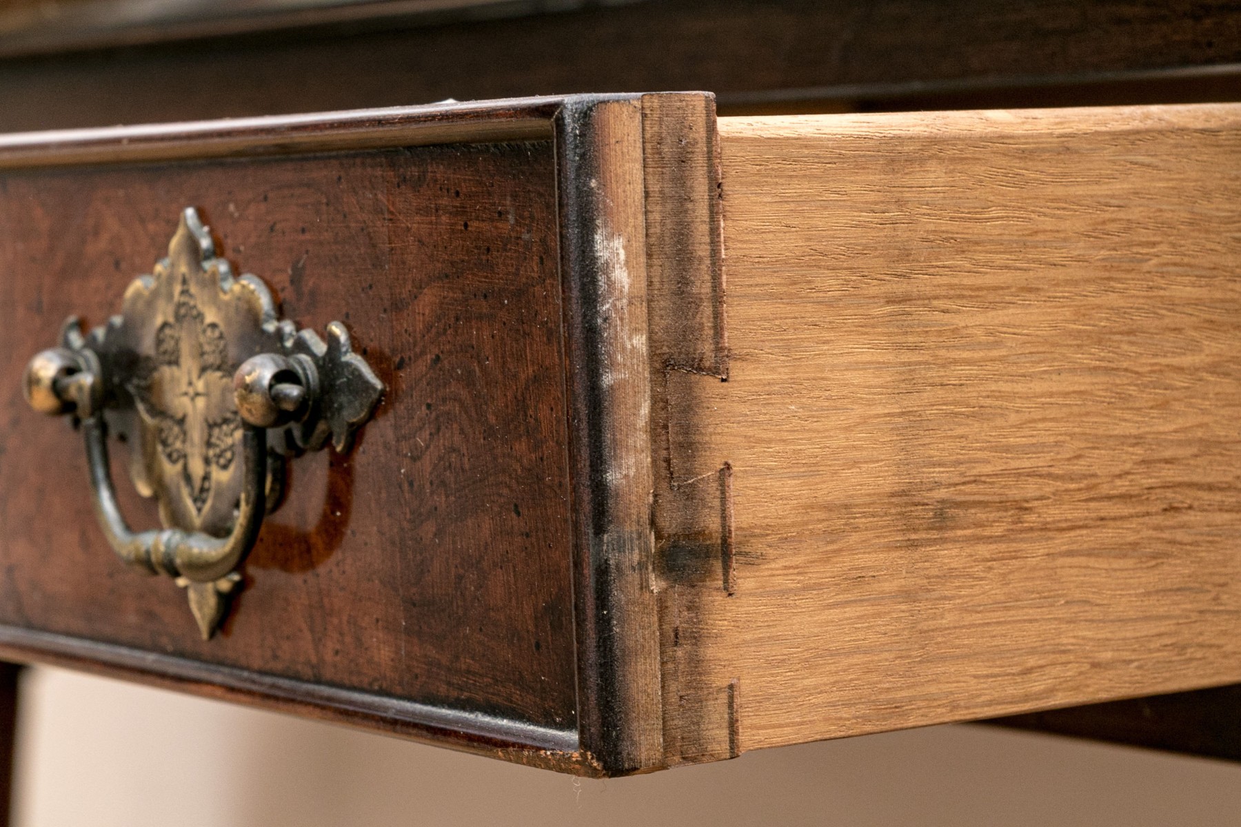 Condition: Nicks to the sides and scratches to the top of the table. Oxidation to the brass hardware. Spotting to the top of the piece. See images as they are part of the condition report.