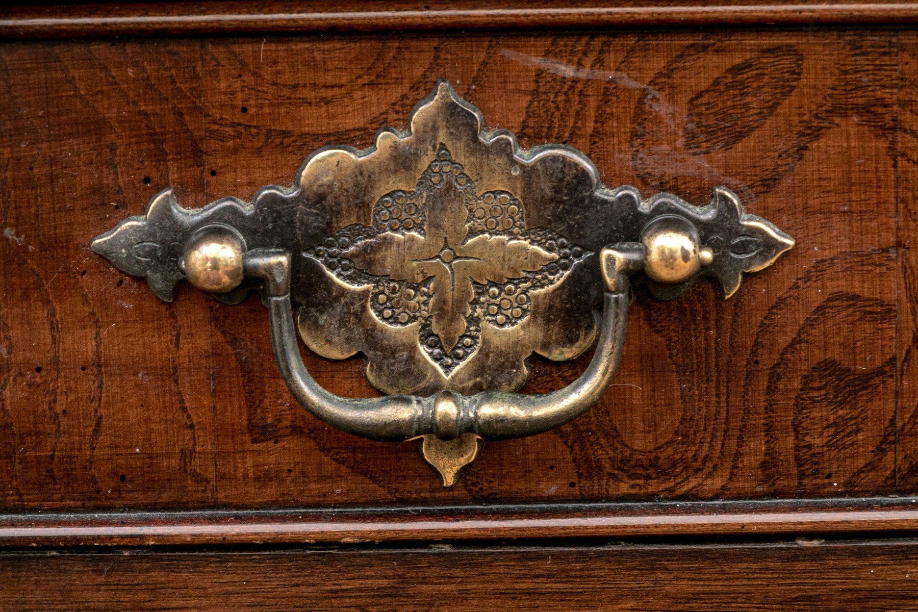 The console in a quatrefoil shape with two short drawers to the front, each having two brass handles and faux escutcheons. The whole raised on cabriole legs.