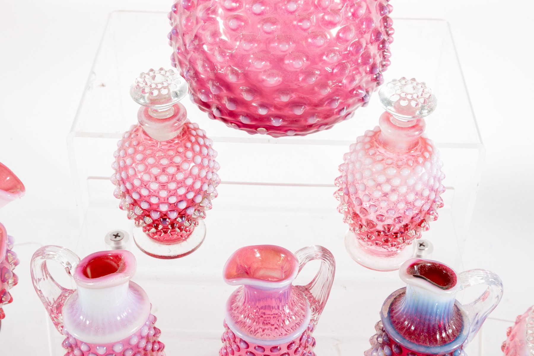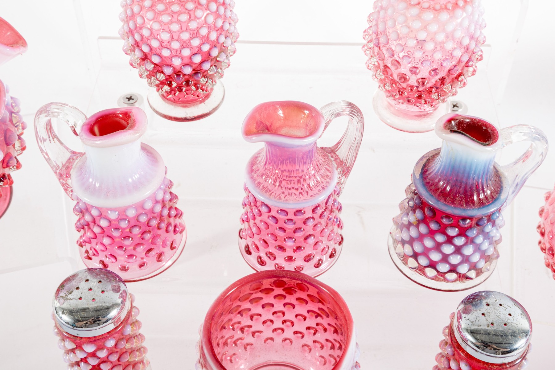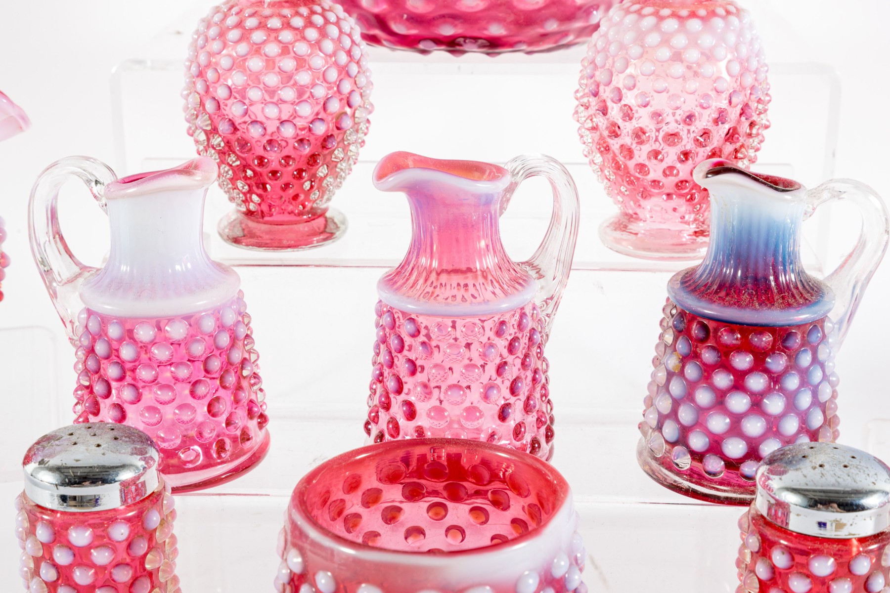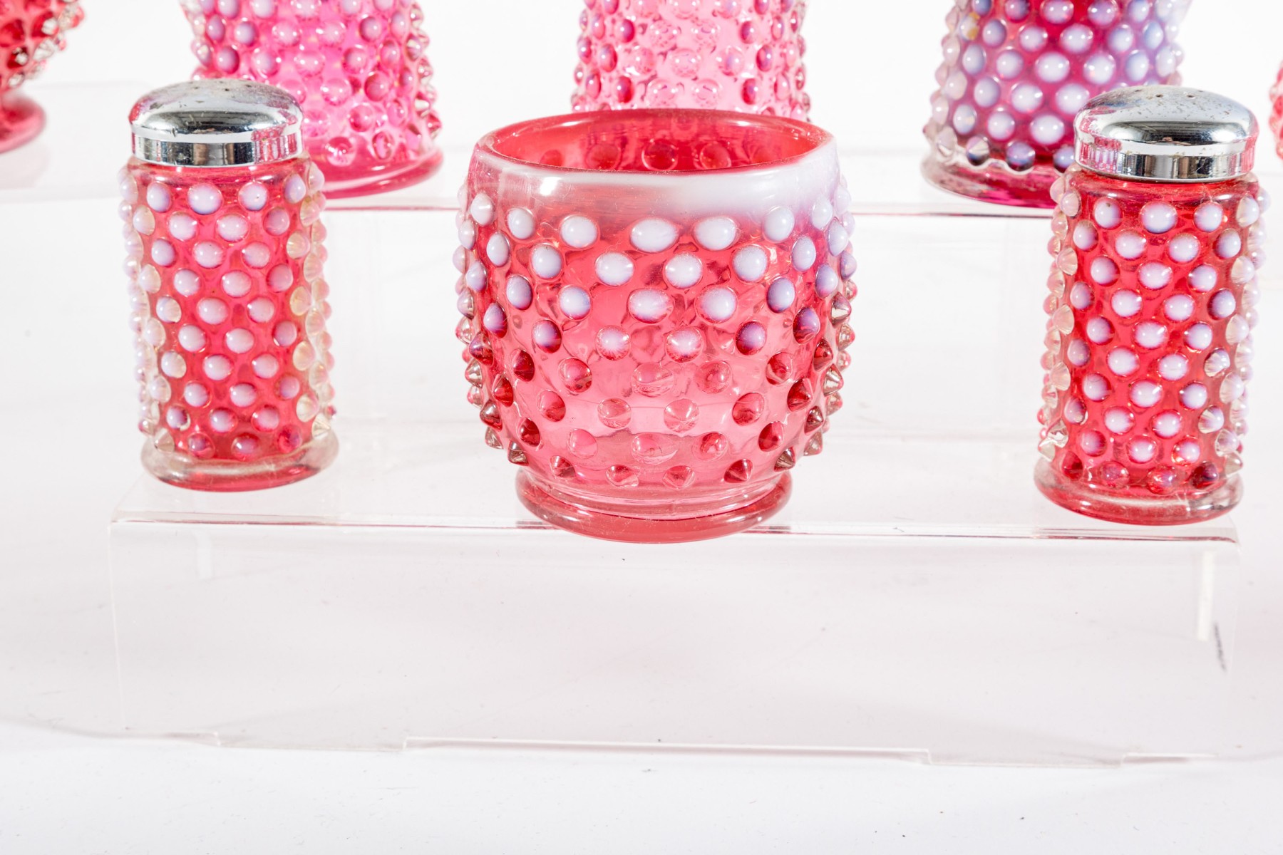 A fabulous assortment of cranberry white hobnail depression glass including vases, decanters, salt and pepper shakers, and perfume bottles.