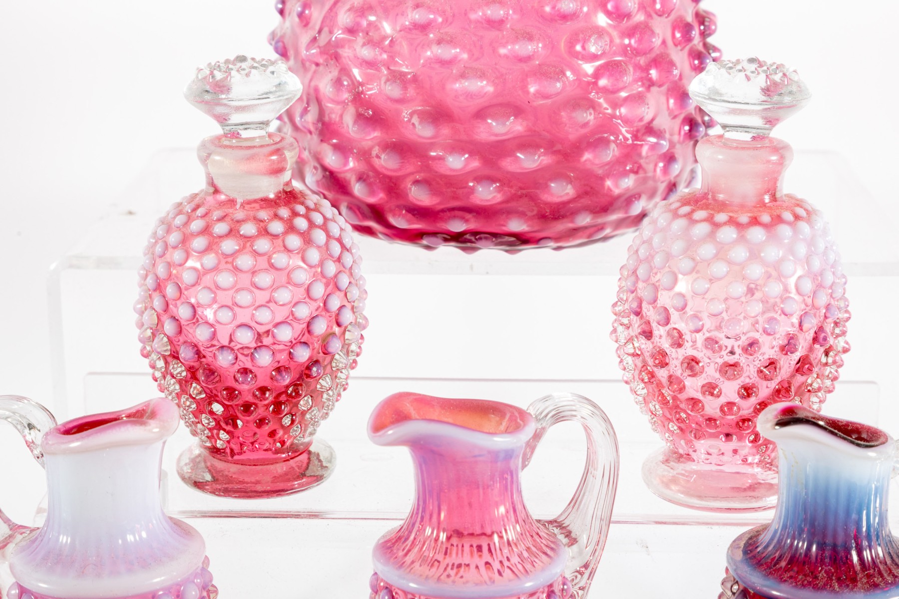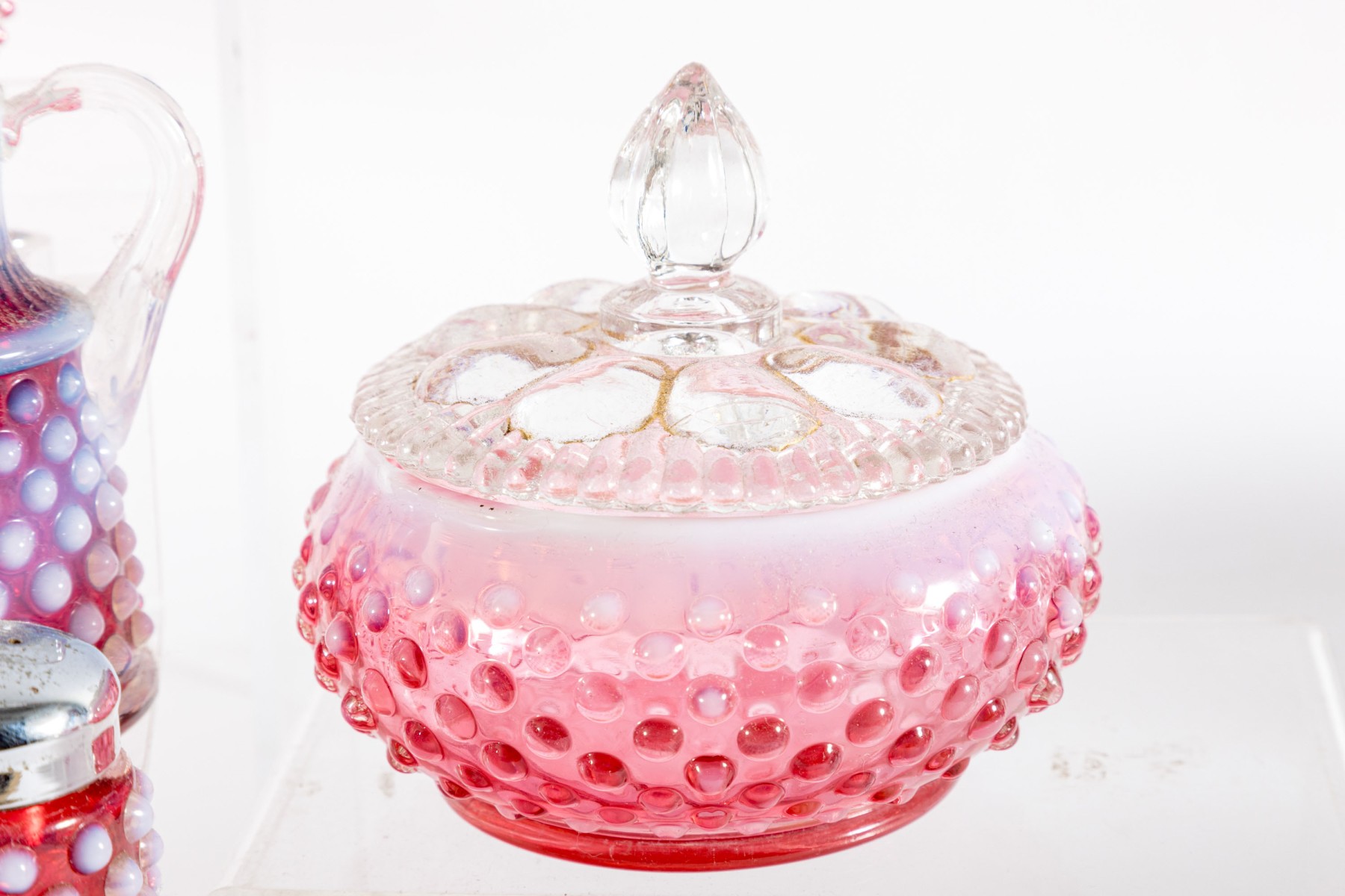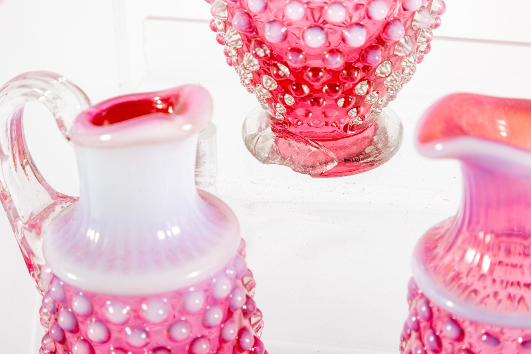 A fabulous assortment of cranberry white hobnail depression glass including vases, decanters, salt and pepper shakers, and perfume bottles.