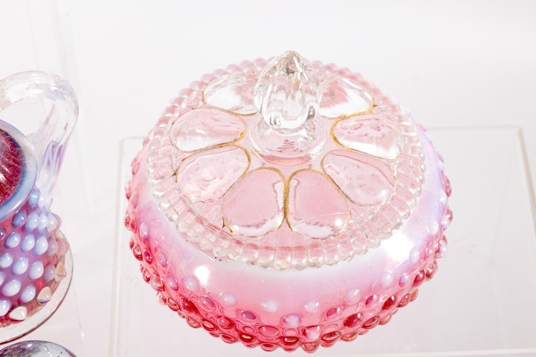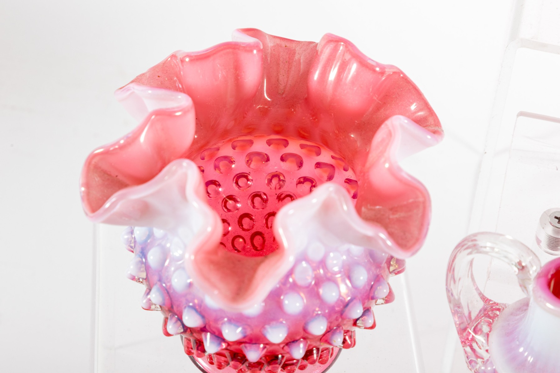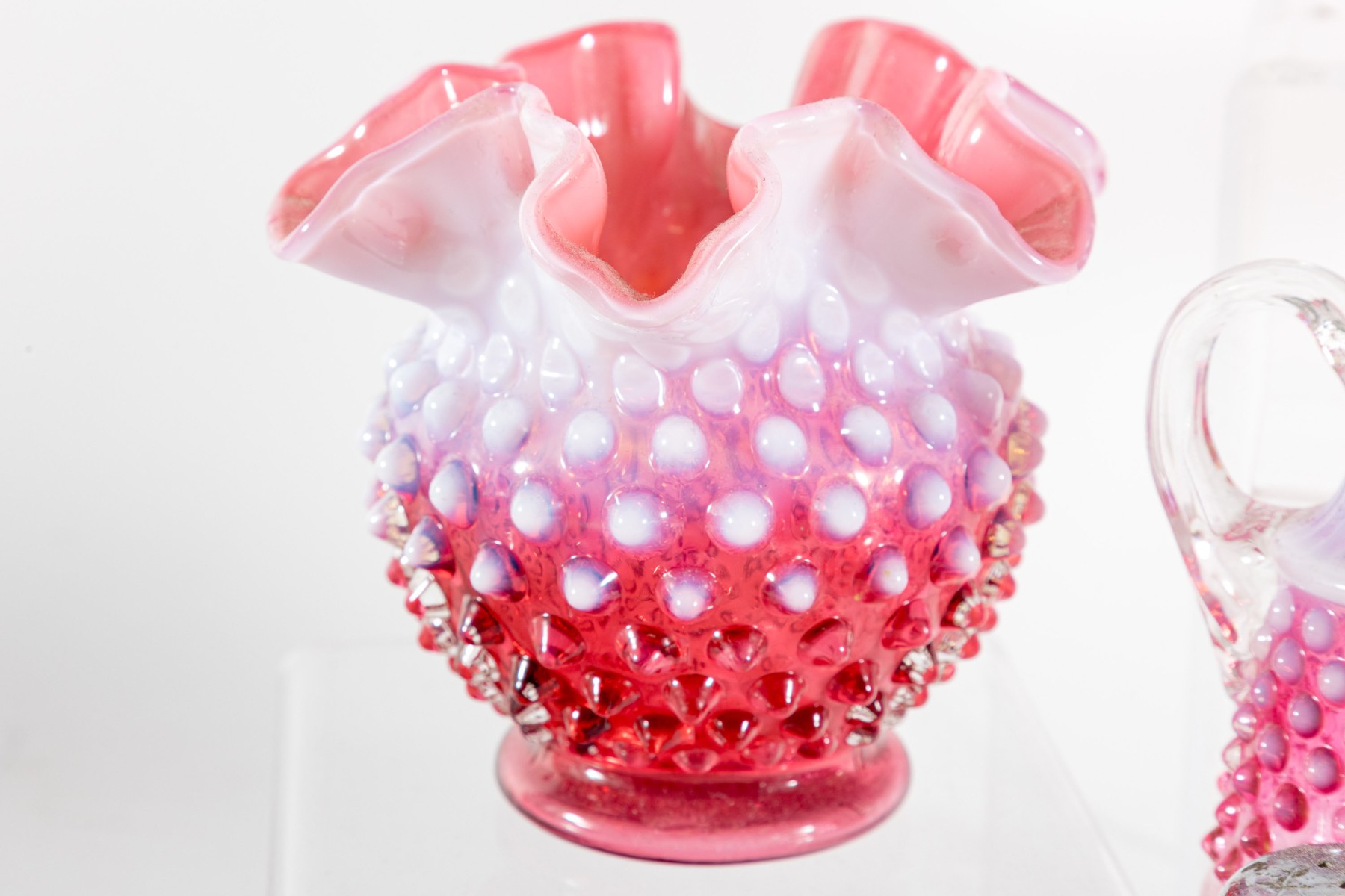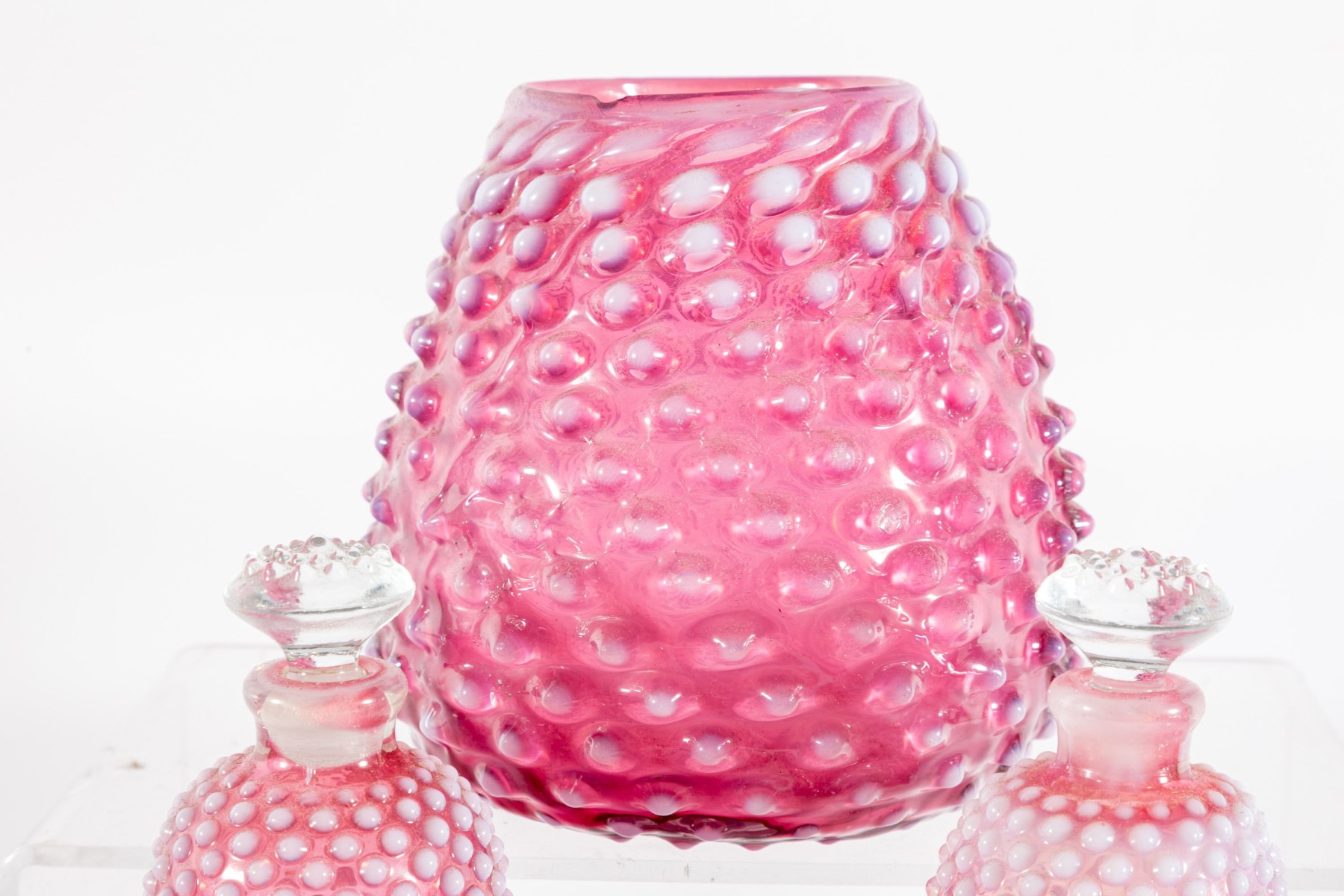 A fabulous assortment of cranberry white hobnail depression glass including vases, decanters, salt and pepper shakers, and perfume bottles.