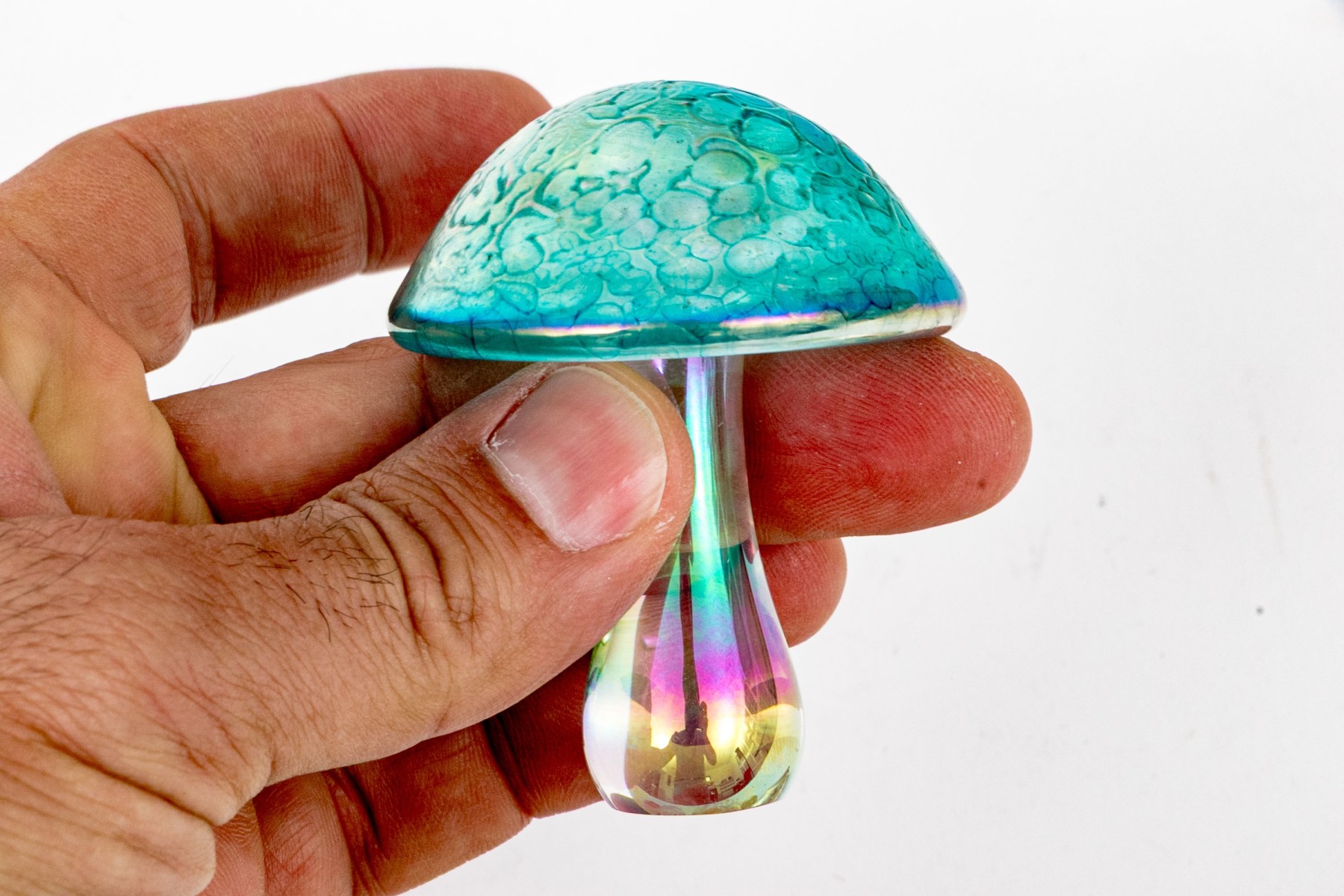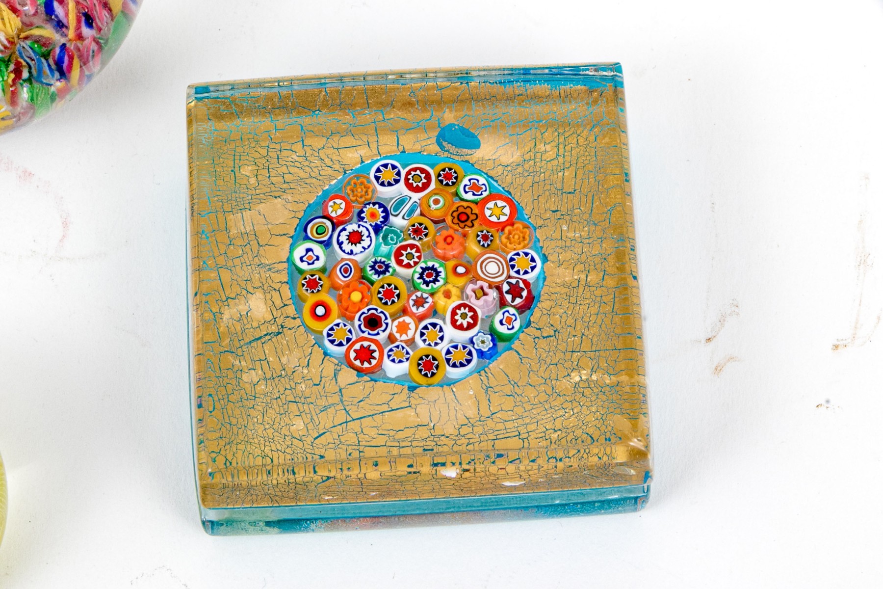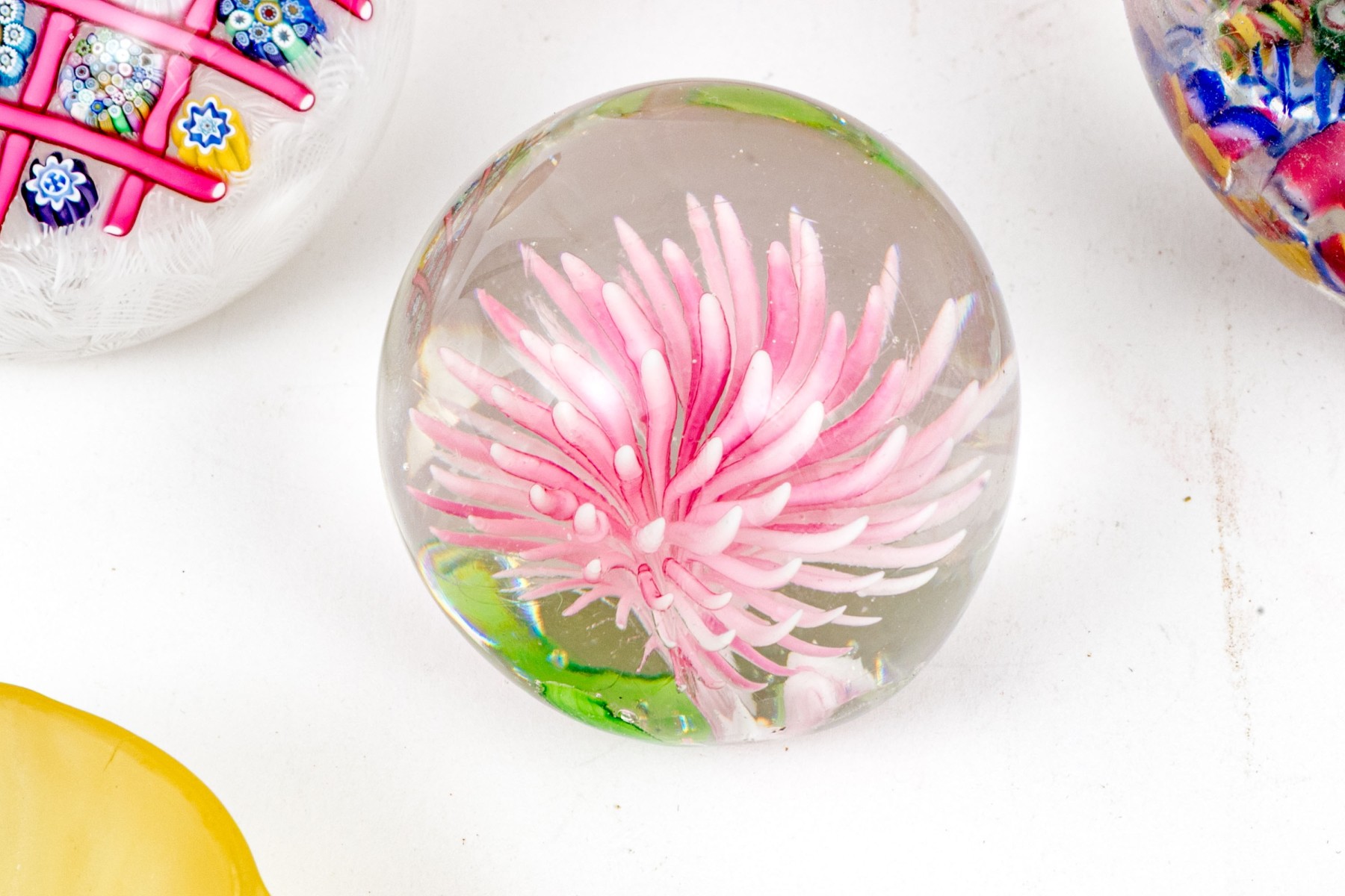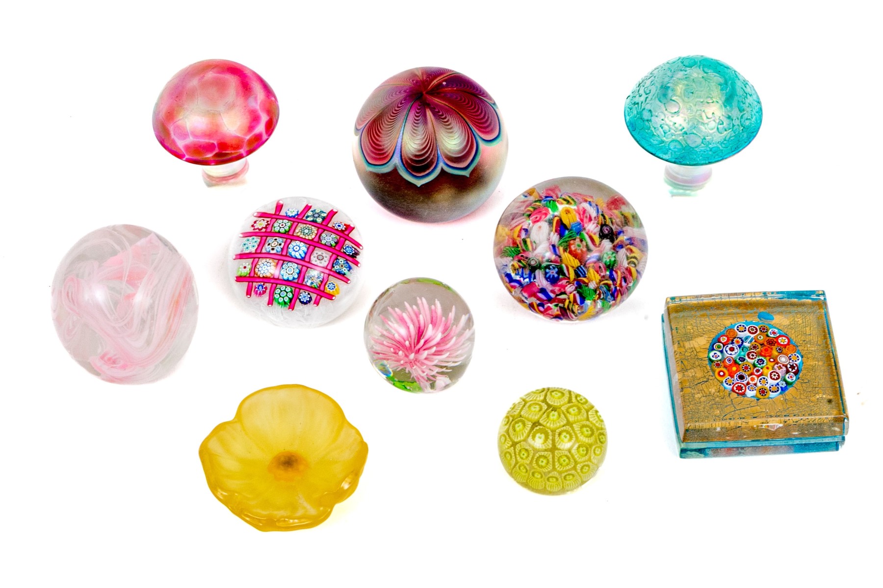 Comprised of two whimsical hand-blown glass mushrooms, a Murano square glass plaque, a Daum signed yellow flower head bowl, paperweights signed by artists underfoot.