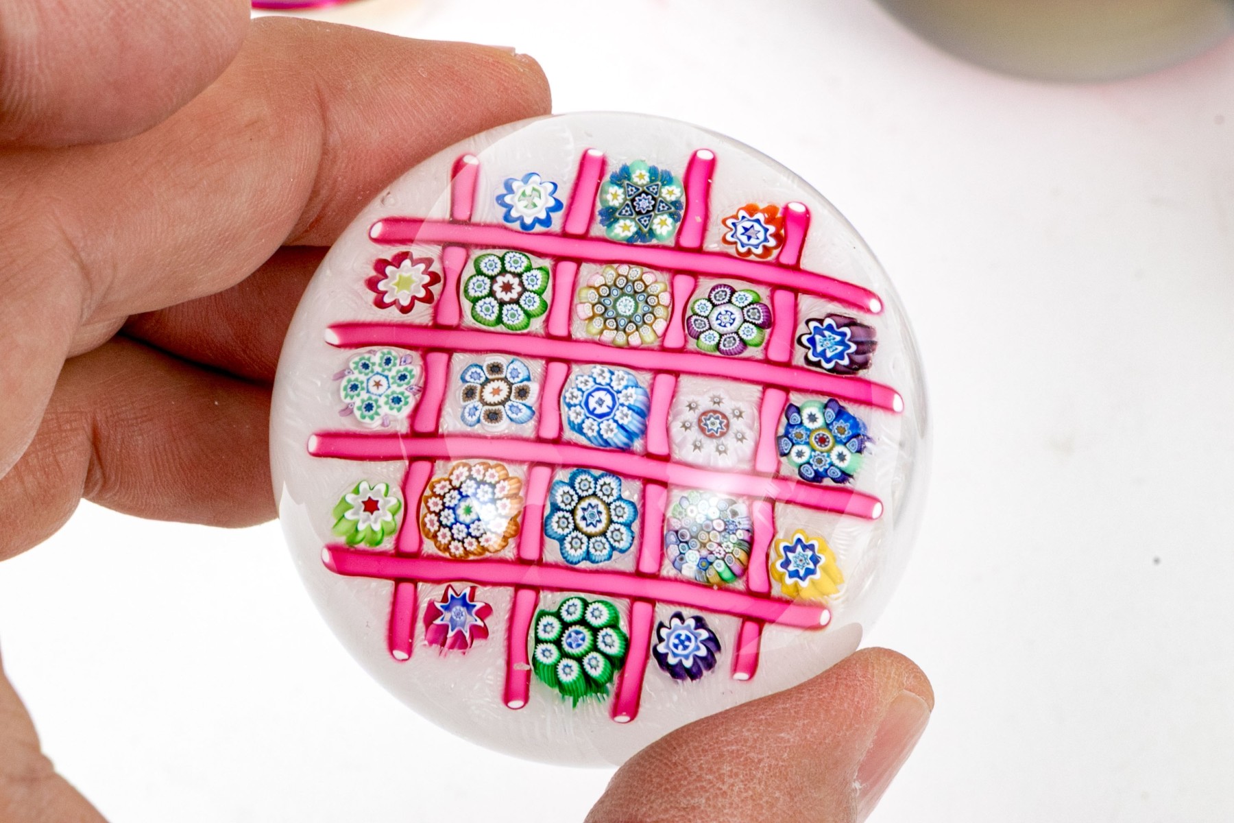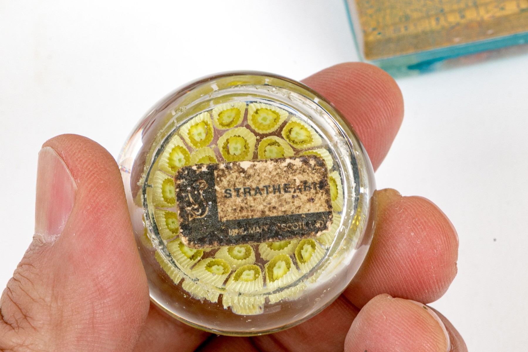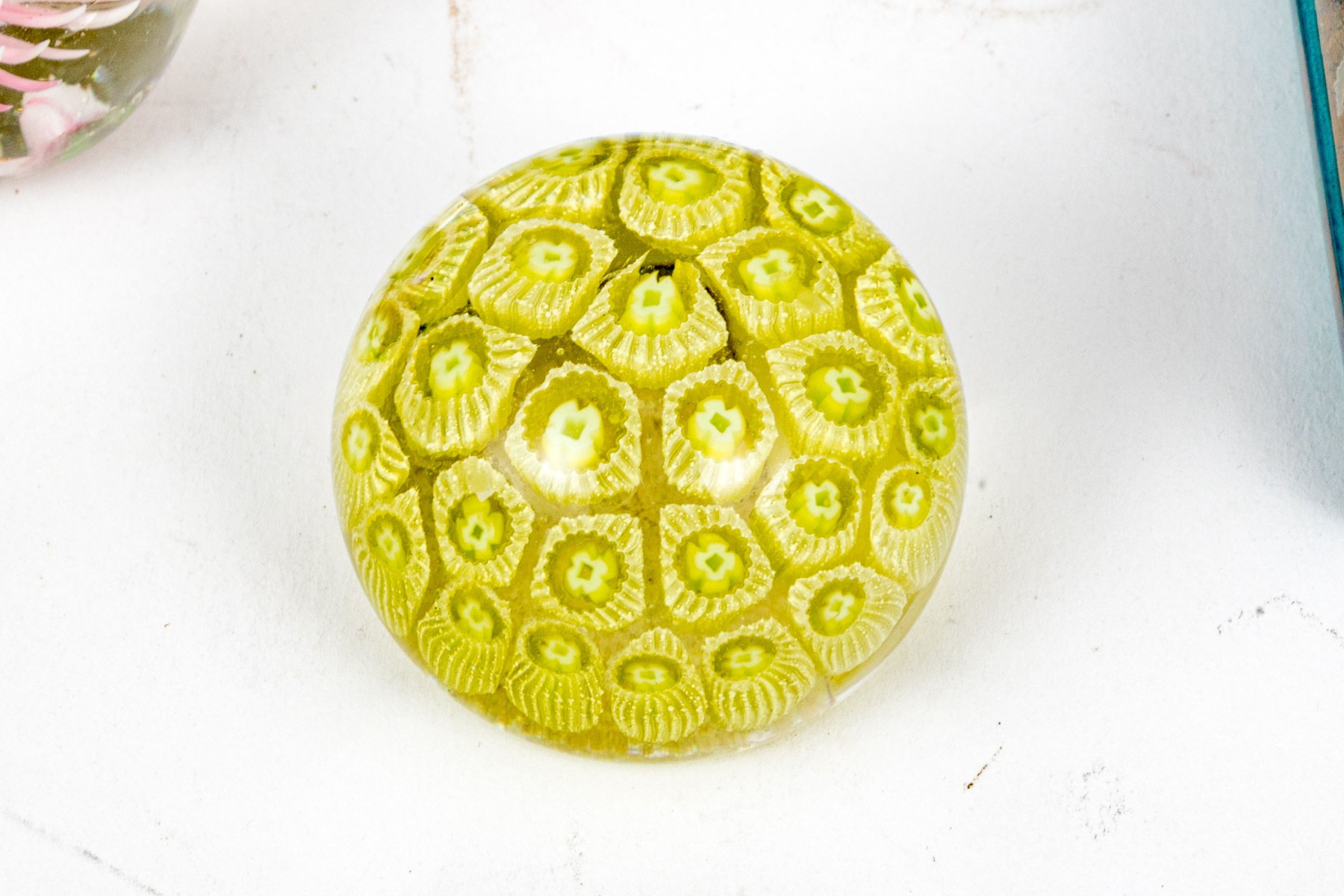 Comprised of two whimsical hand-blown glass mushrooms, a Murano square glass plaque, a Daum signed yellow flower head bowl, paperweights signed by artists underfoot.