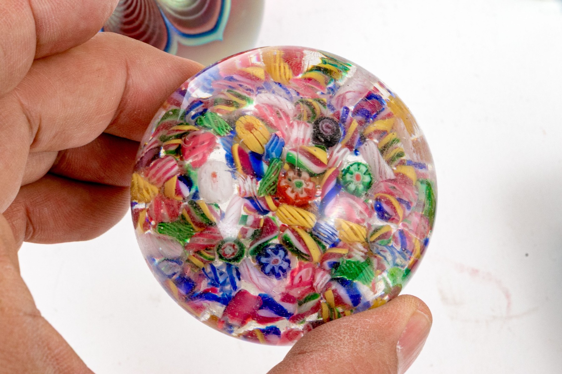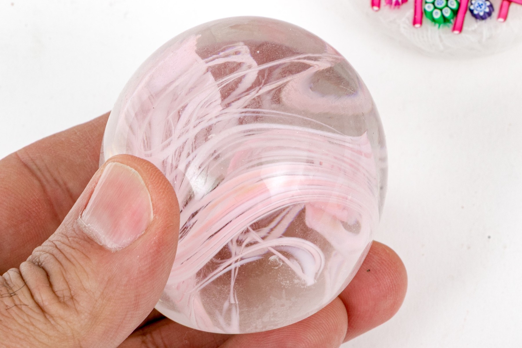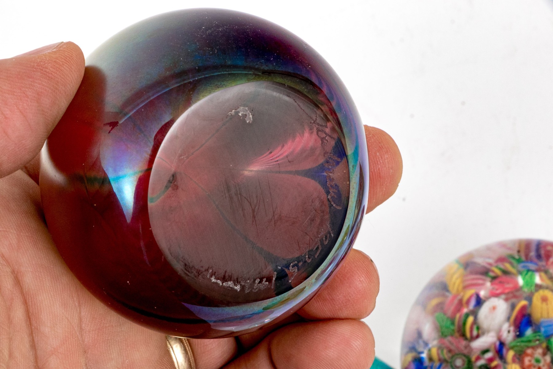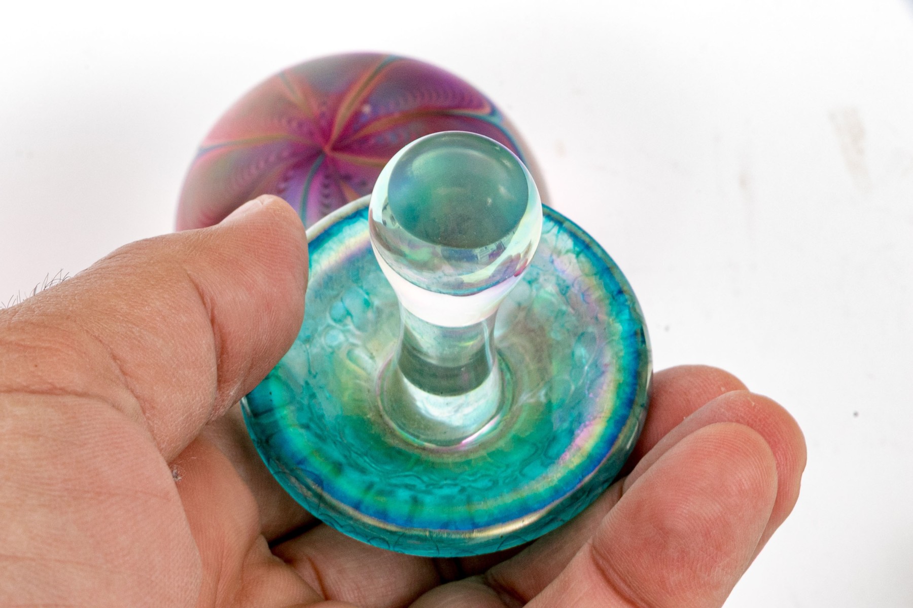 Comprised of two whimsical hand-blown glass mushrooms, a Murano square glass plaque, a Daum signed yellow flower head bowl, paperweights signed by artists underfoot.