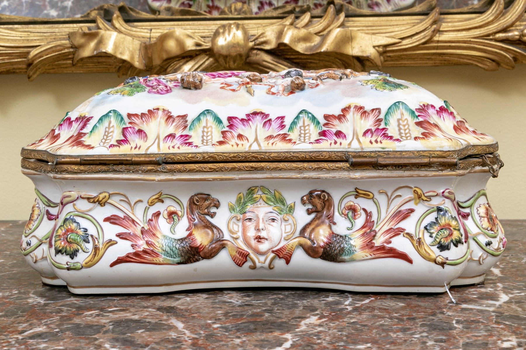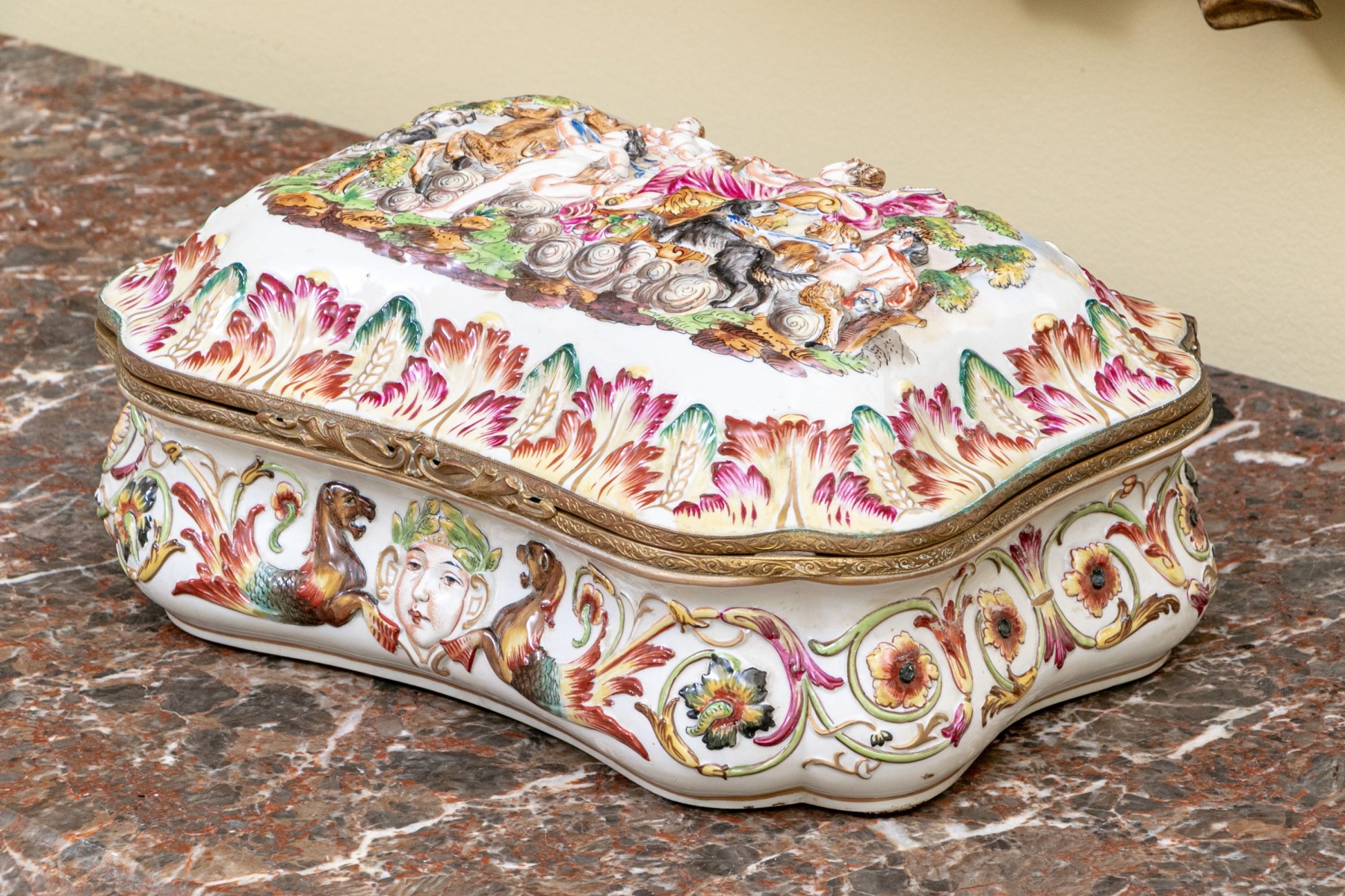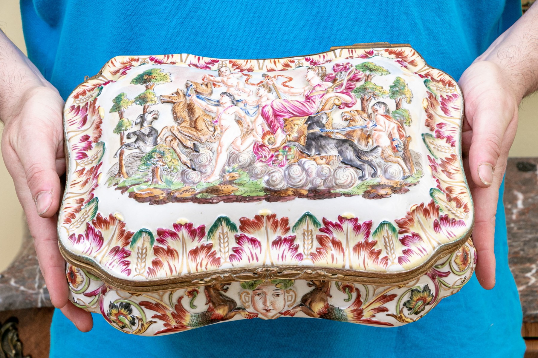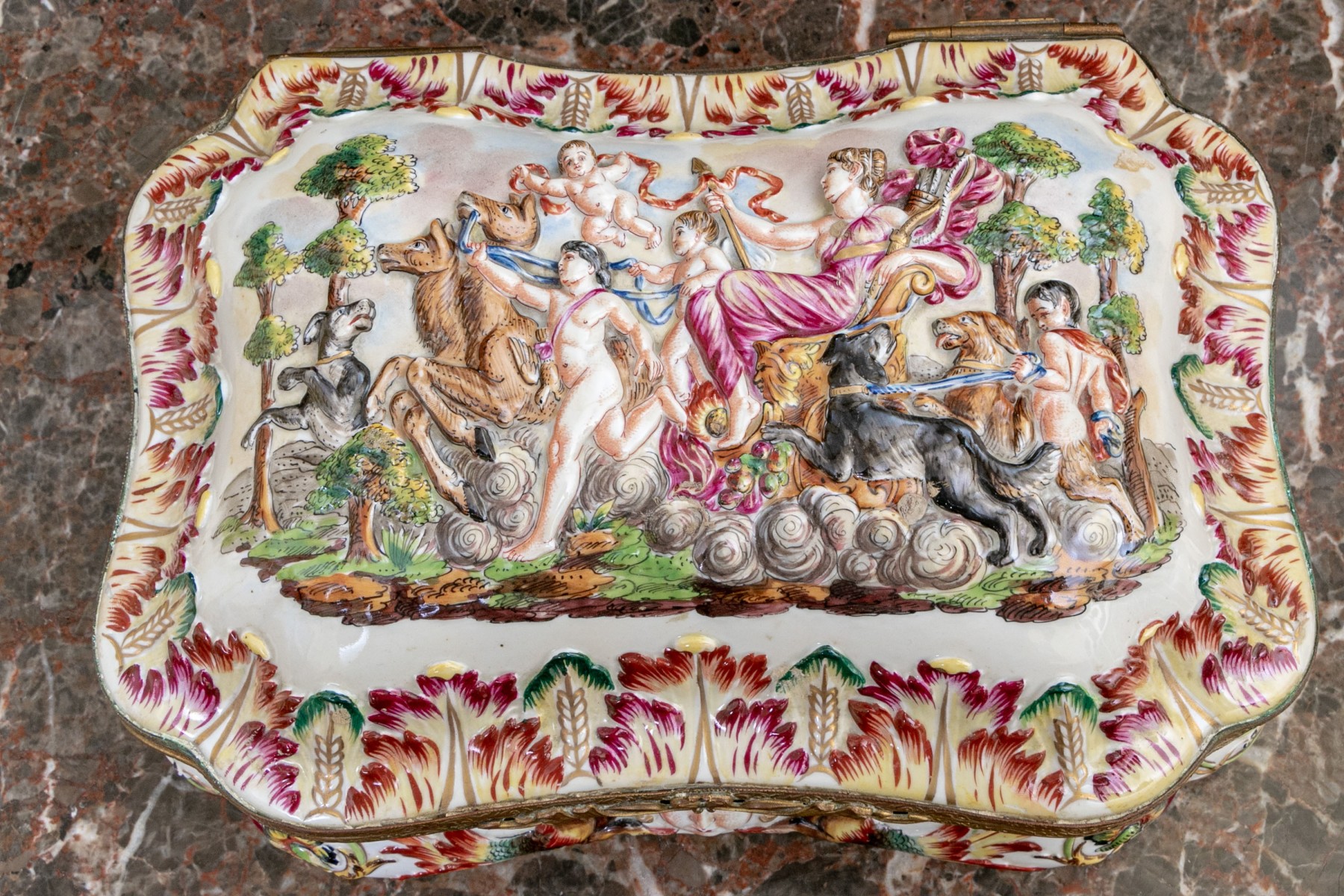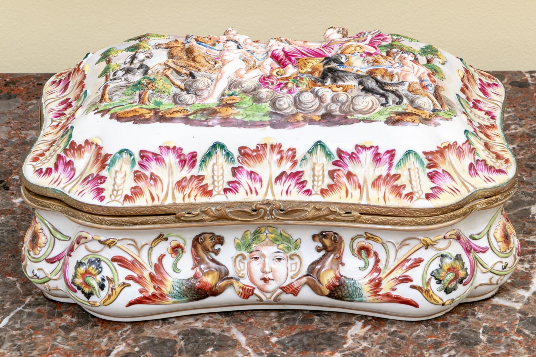 An impressively crafted Crown Naples Capodimonte moulded and polychrome finished box and cover with scalloped corners. The mounted and hinged lid decorated with an intricate, figural scene depicting a Neoclassical genre scene with a figure seated in his robe on a chariot pulled by winged, mythological animals which can be seen pulling off the ground as the cloud swirl displays the air between the ground and the rising chariot. Two nude attendants can be seen on foot, with dogs on leashes while winged putti can be seen flying in the air. The scene takes place in a naturalistically decorated landscape. Below, the trim of the box lid is decorated with moulded and polychrome finished foliate imagery.