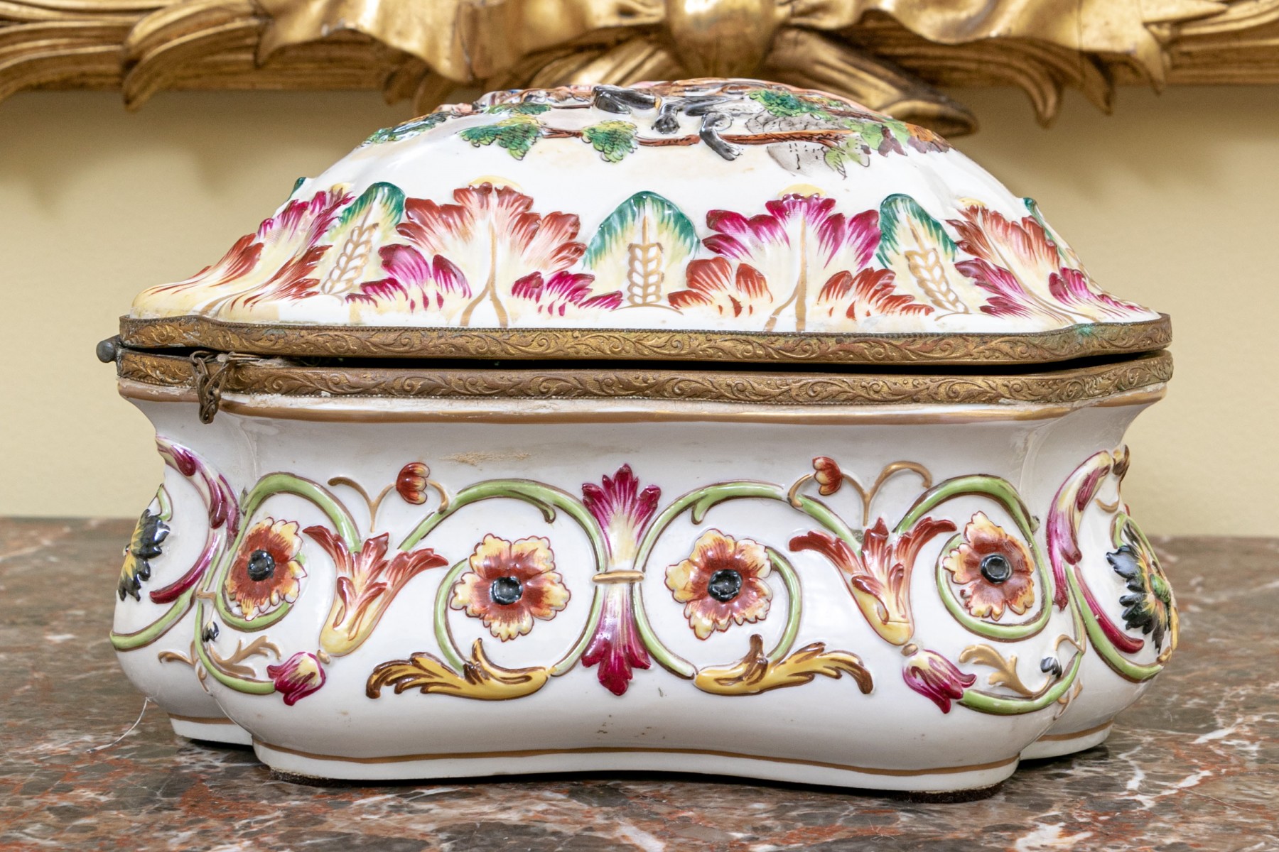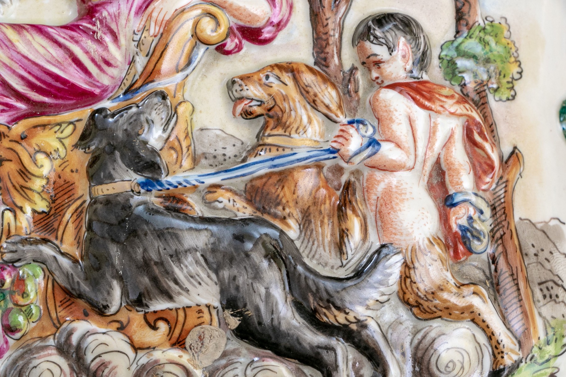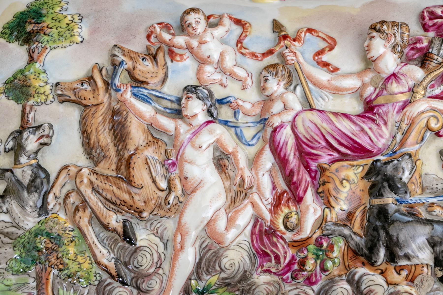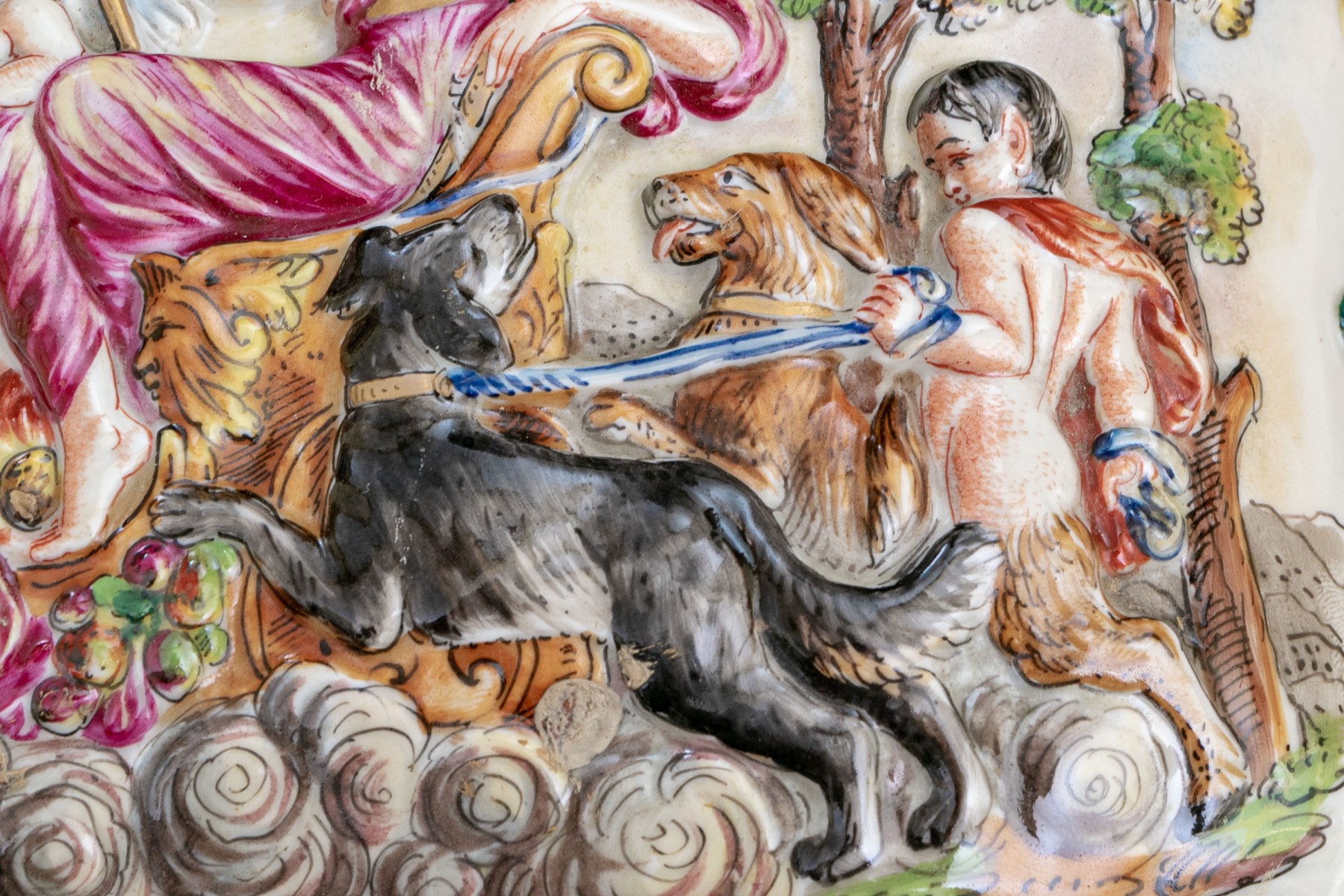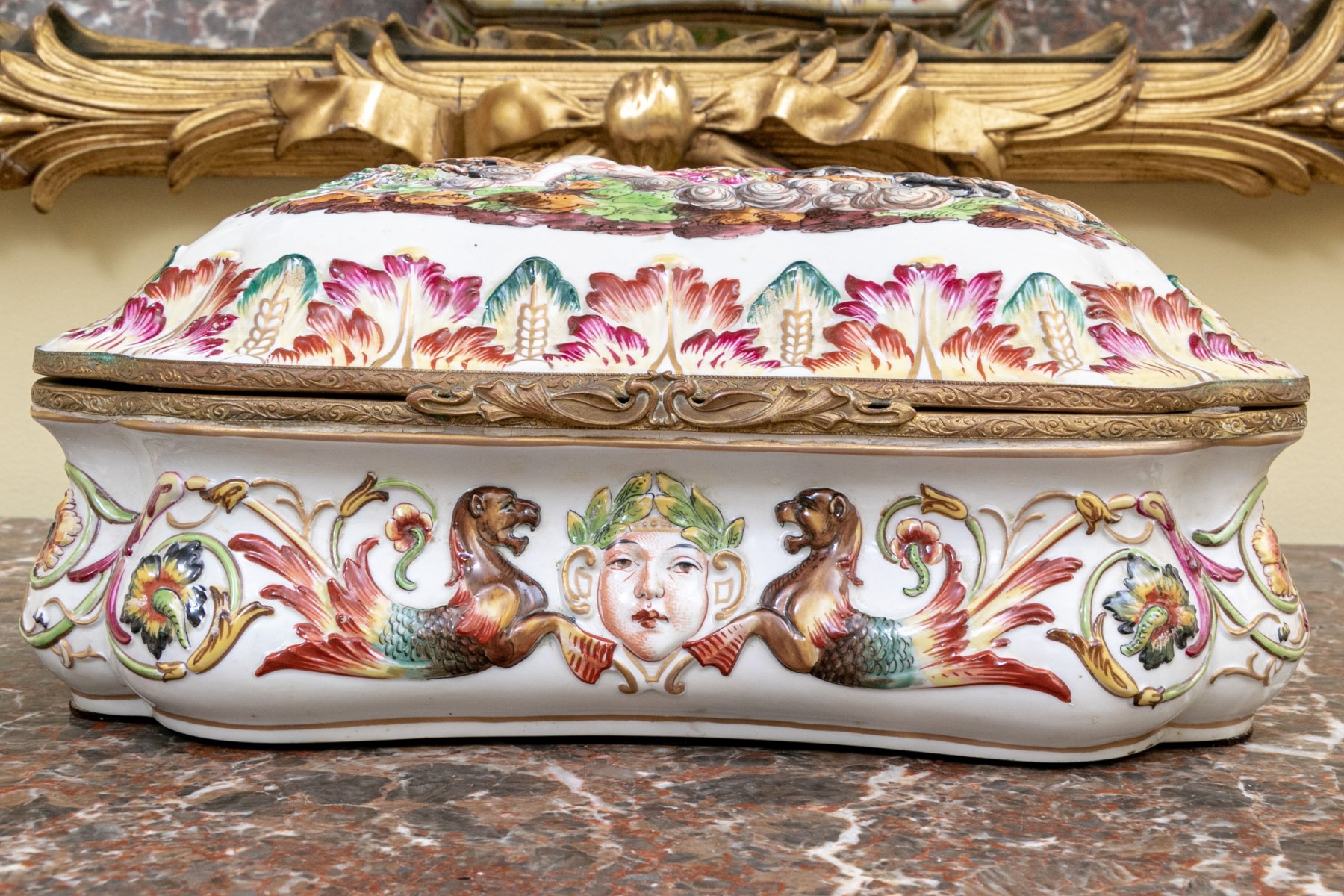 An impressively crafted Crown Naples Capodimonte moulded and polychrome finished box and cover with scalloped corners. The mounted and hinged lid decorated with an intricate, figural scene depicting a Neoclassical genre scene with a figure seated in his robe on a chariot pulled by winged, mythological animals which can be seen pulling off the ground as the cloud swirl displays the air between the ground and the rising chariot. Two nude attendants can be seen on foot, with dogs on leashes while winged putti can be seen flying in the air. The scene takes place in a naturalistically decorated landscape. Below, the trim of the box lid is decorated with moulded and polychrome finished foliate imagery.