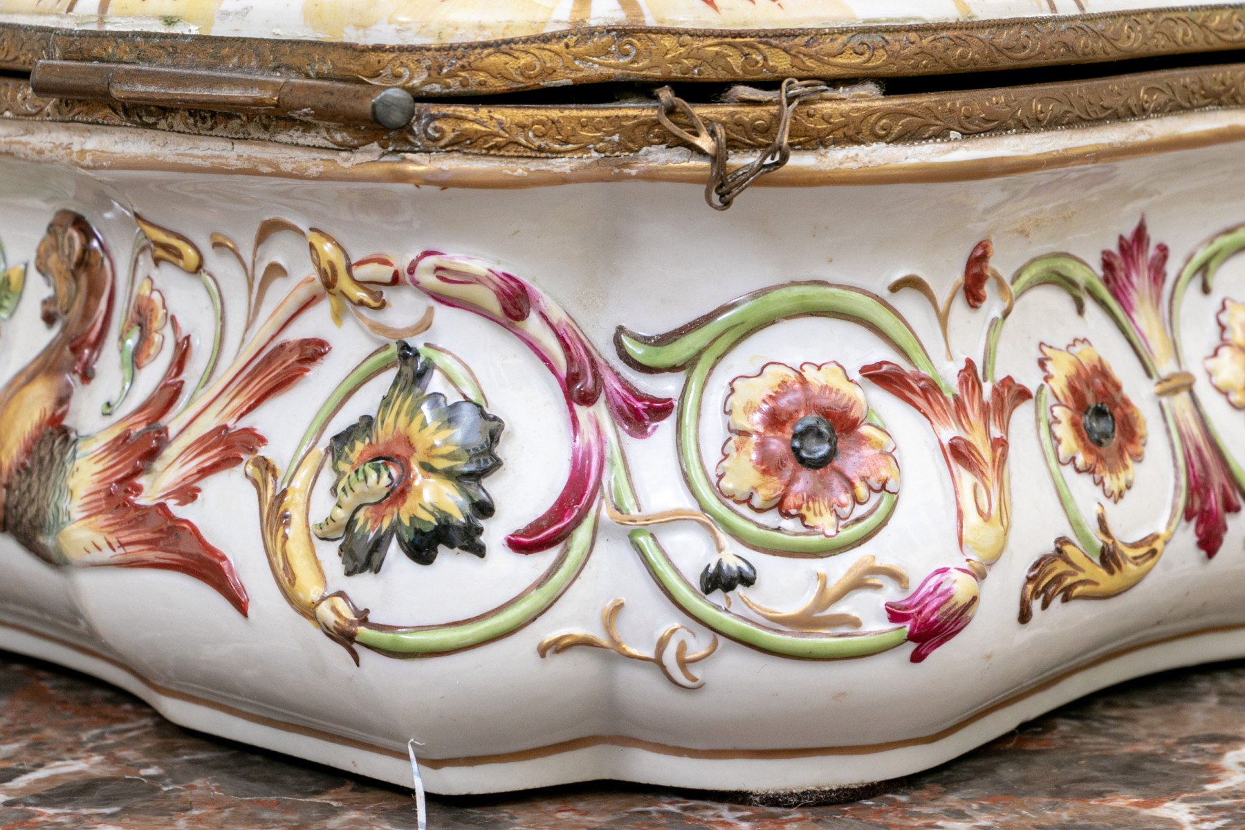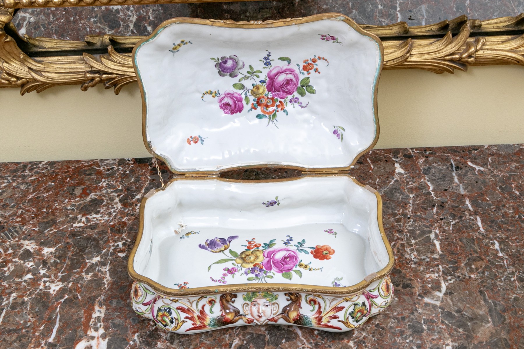 Condition: There is wear to the polychrome finished decoration with minute nics and chips and losses to the finish. There is wear to the mounting with oxidization evident around the trim. Some surface scuffs and wear, all commensurate with age and some handling but despite wear the hinged casket presents well overall.